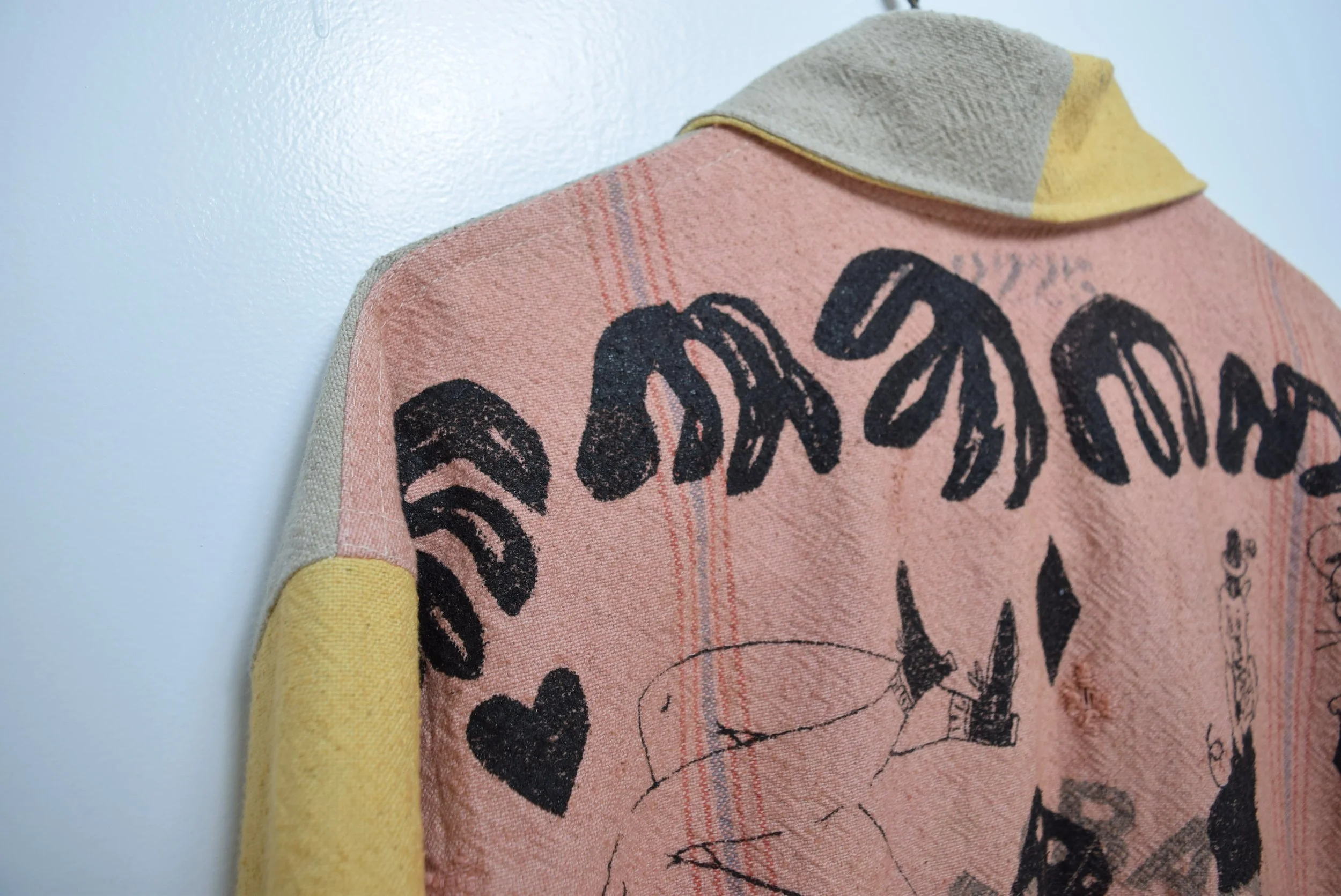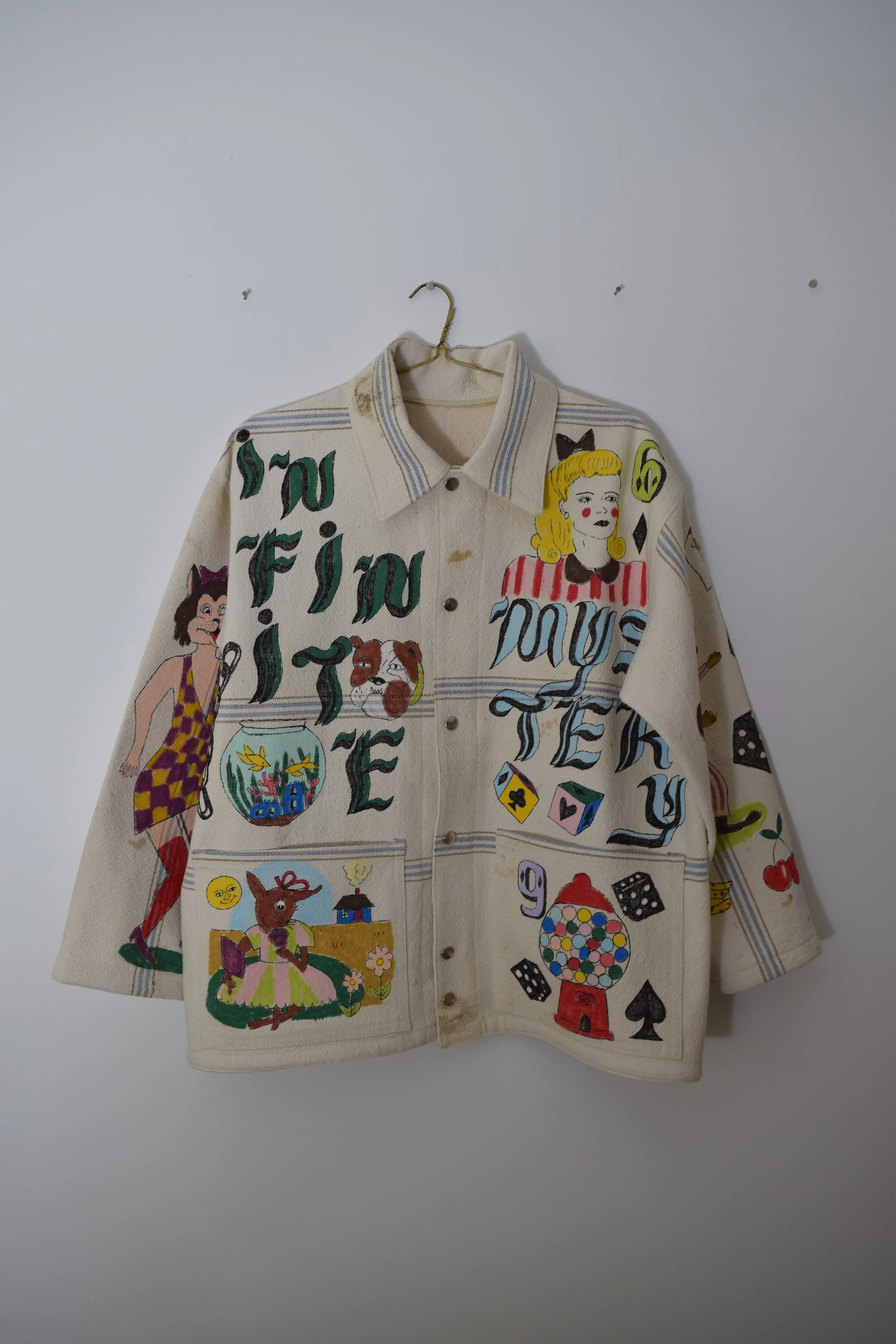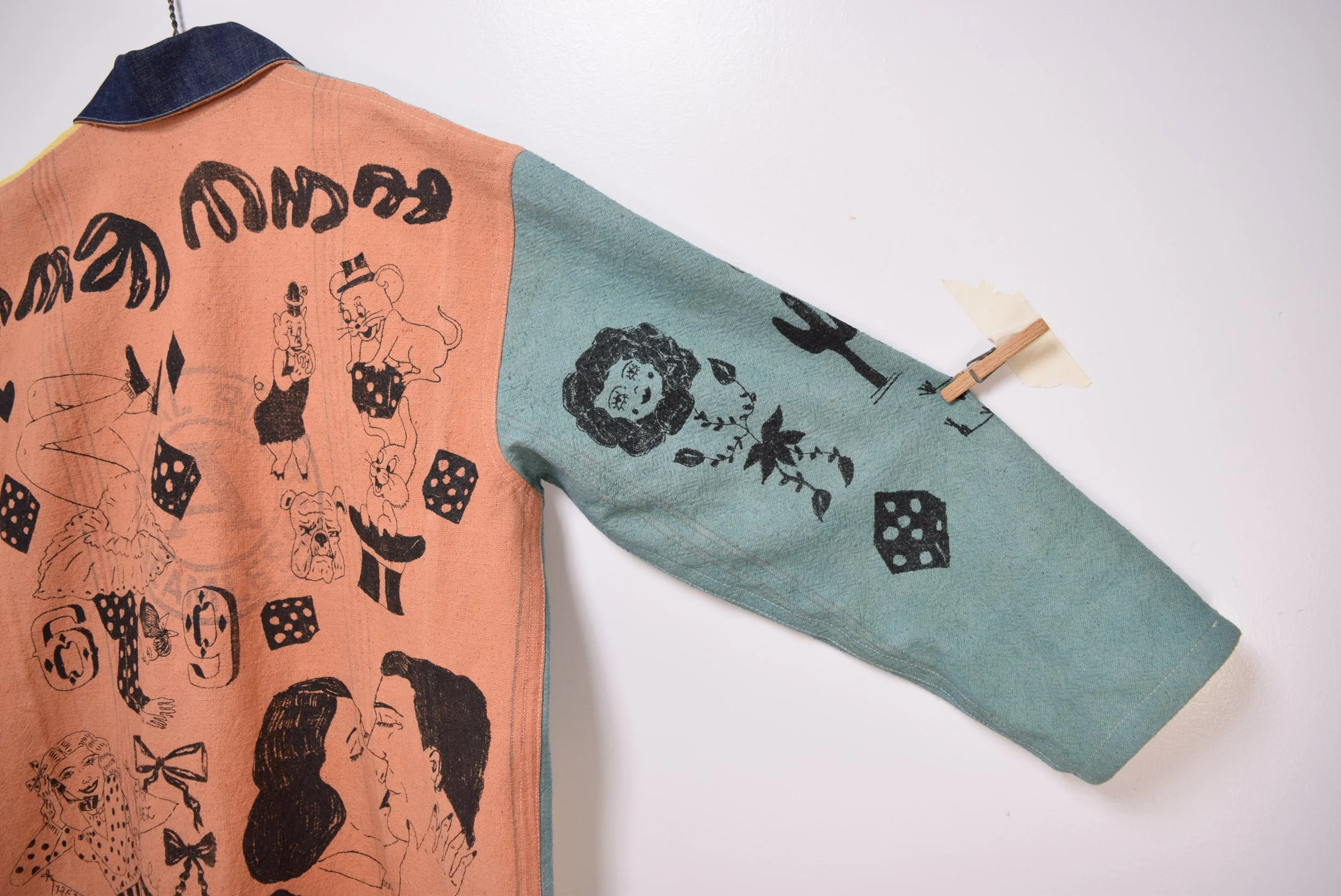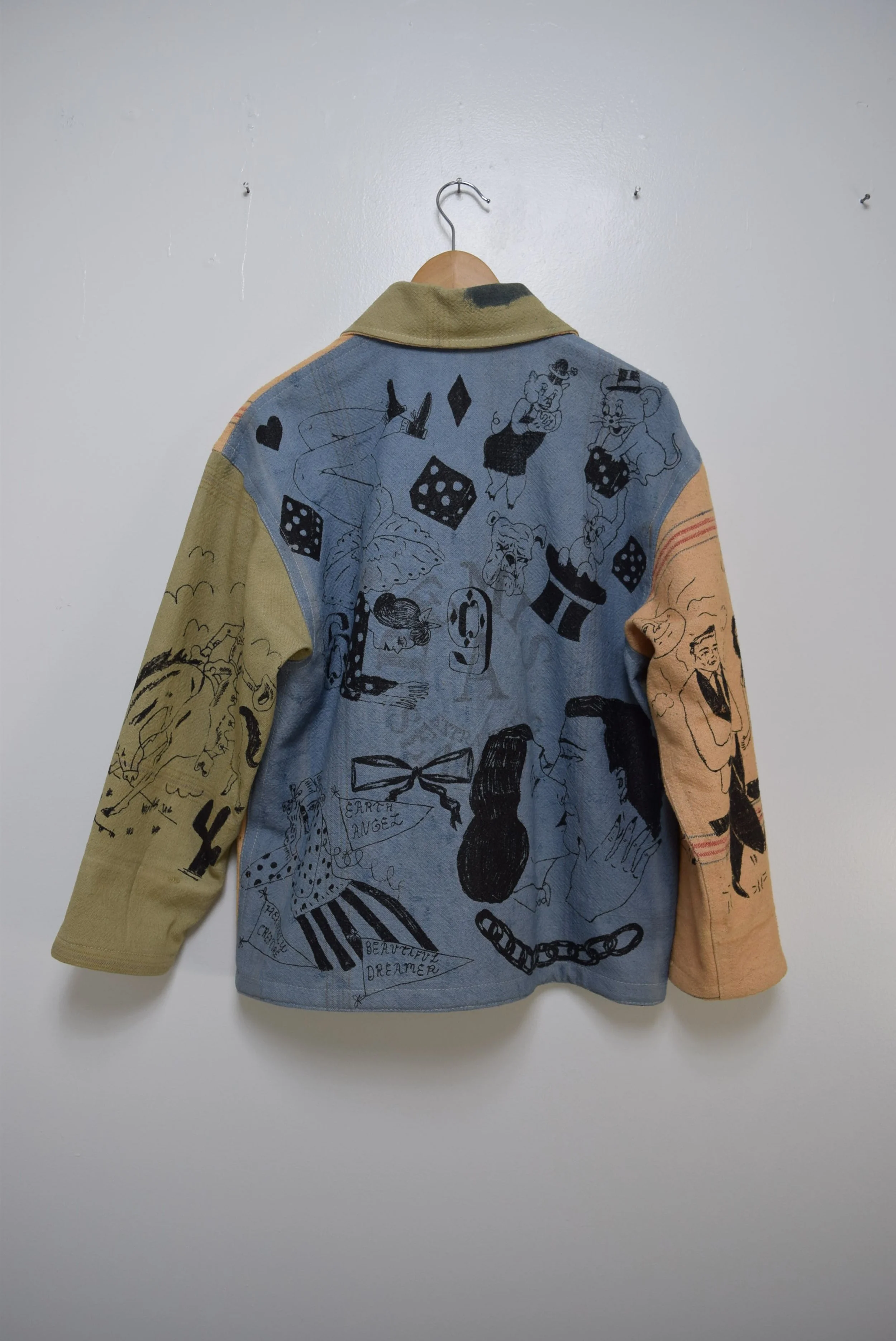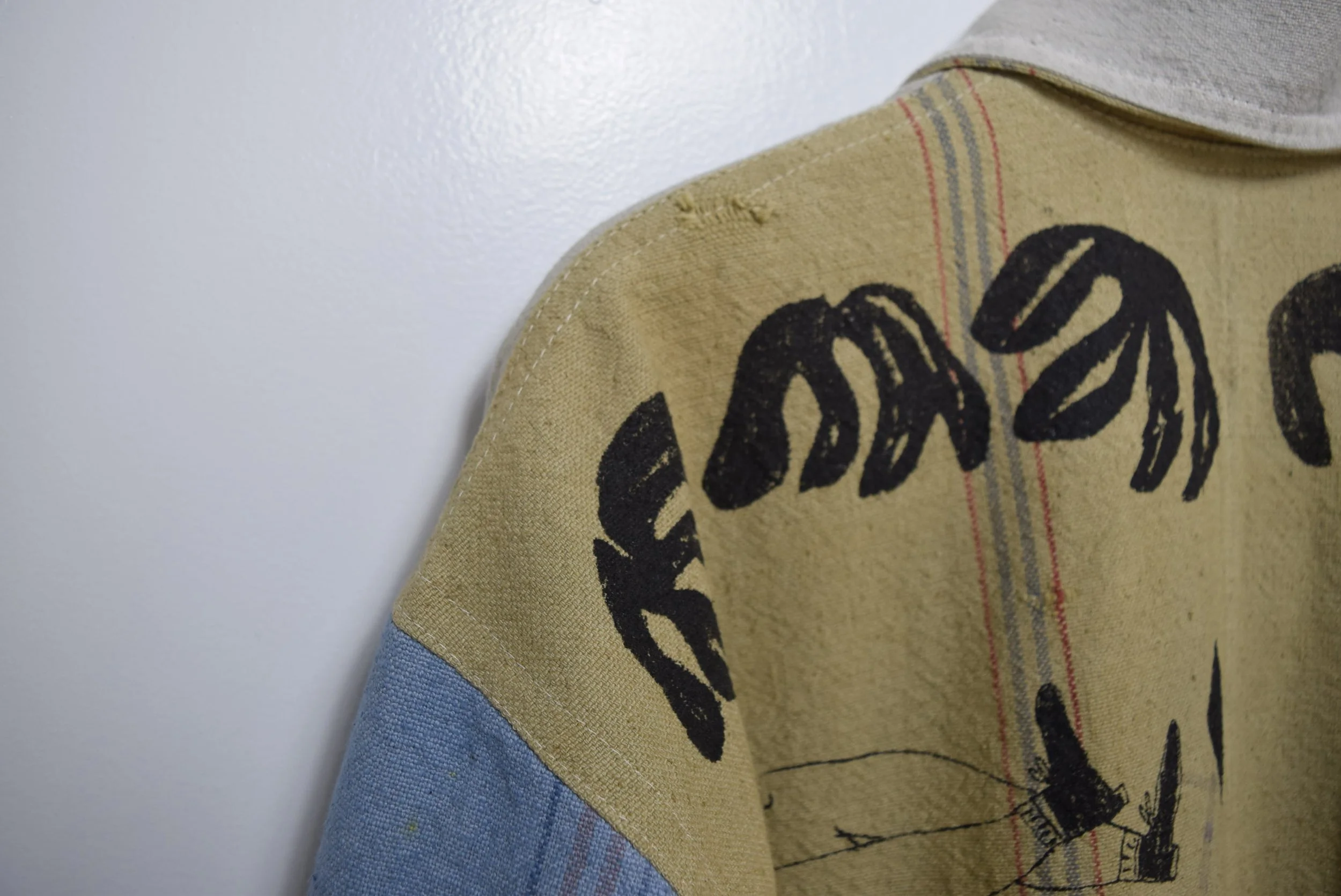 "Infinite Mystery" hand drawn cotton feedsack chore coat Size Medium