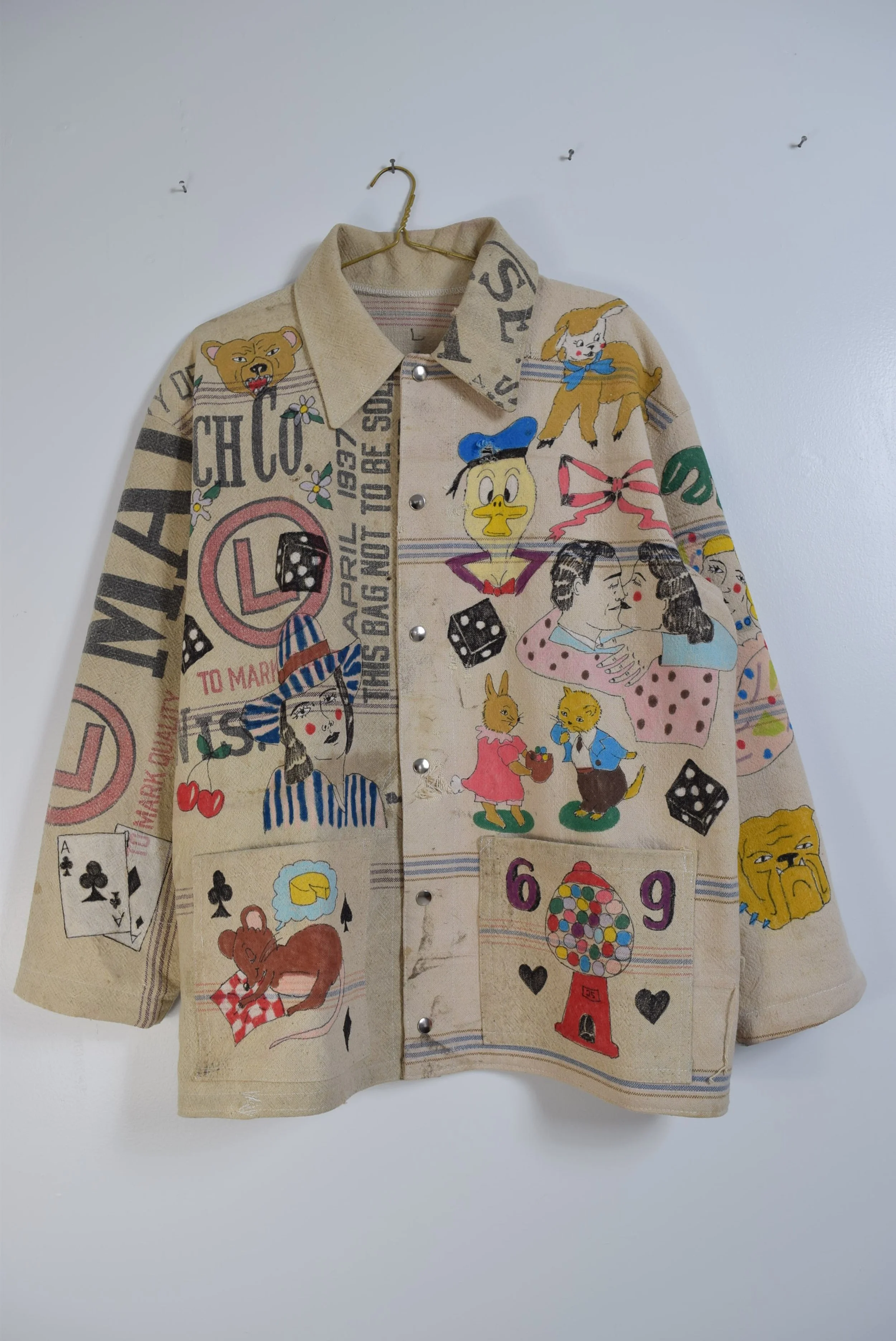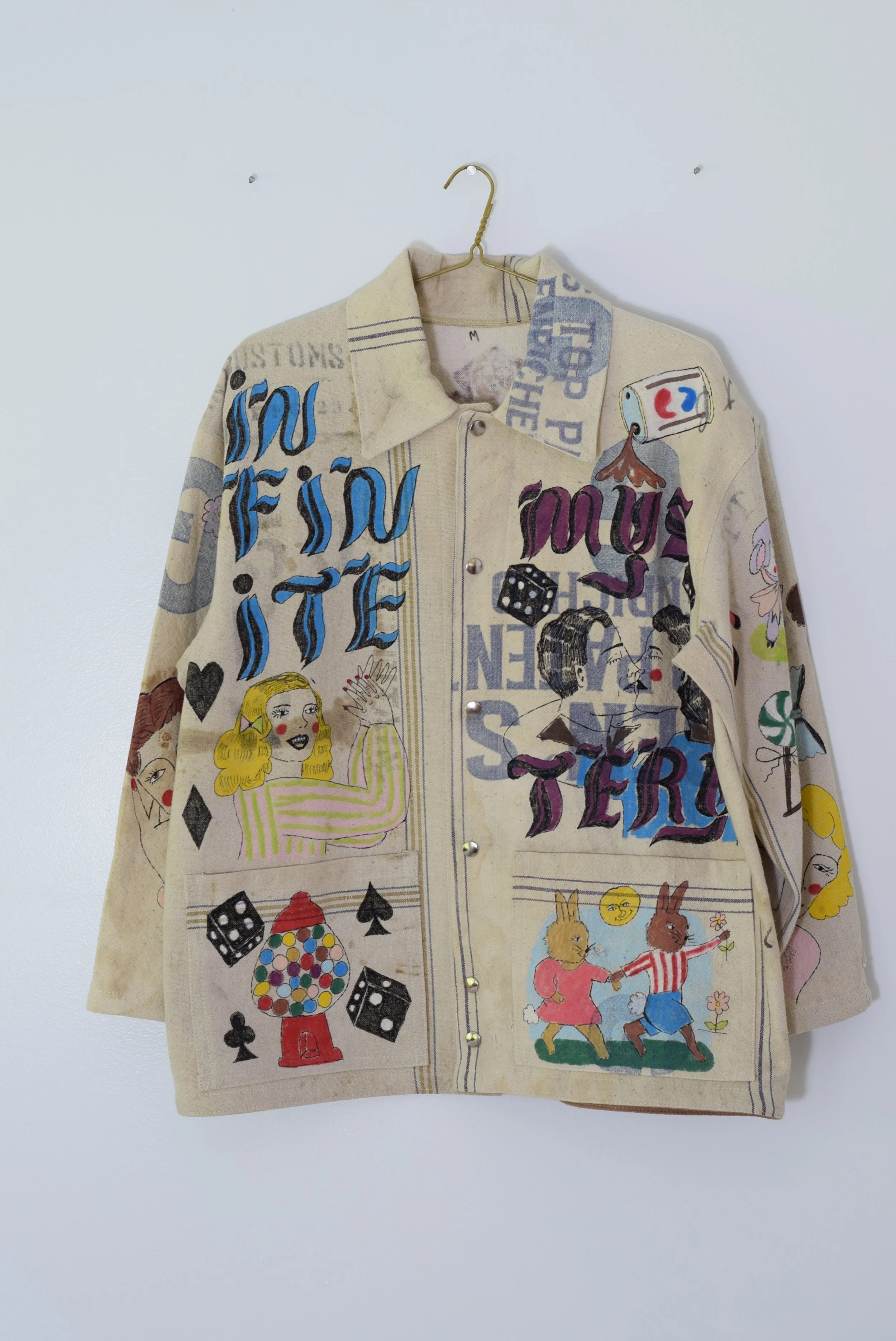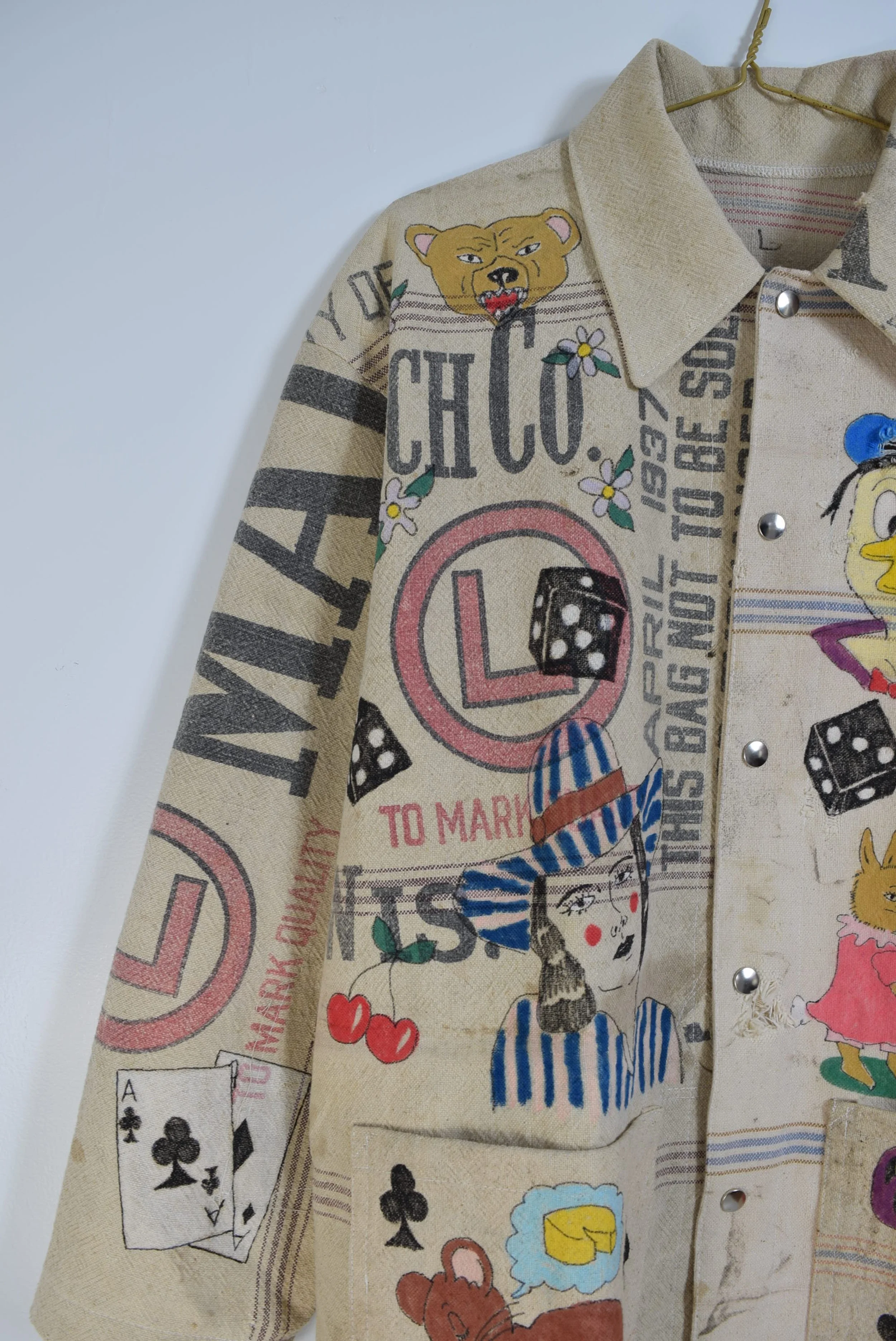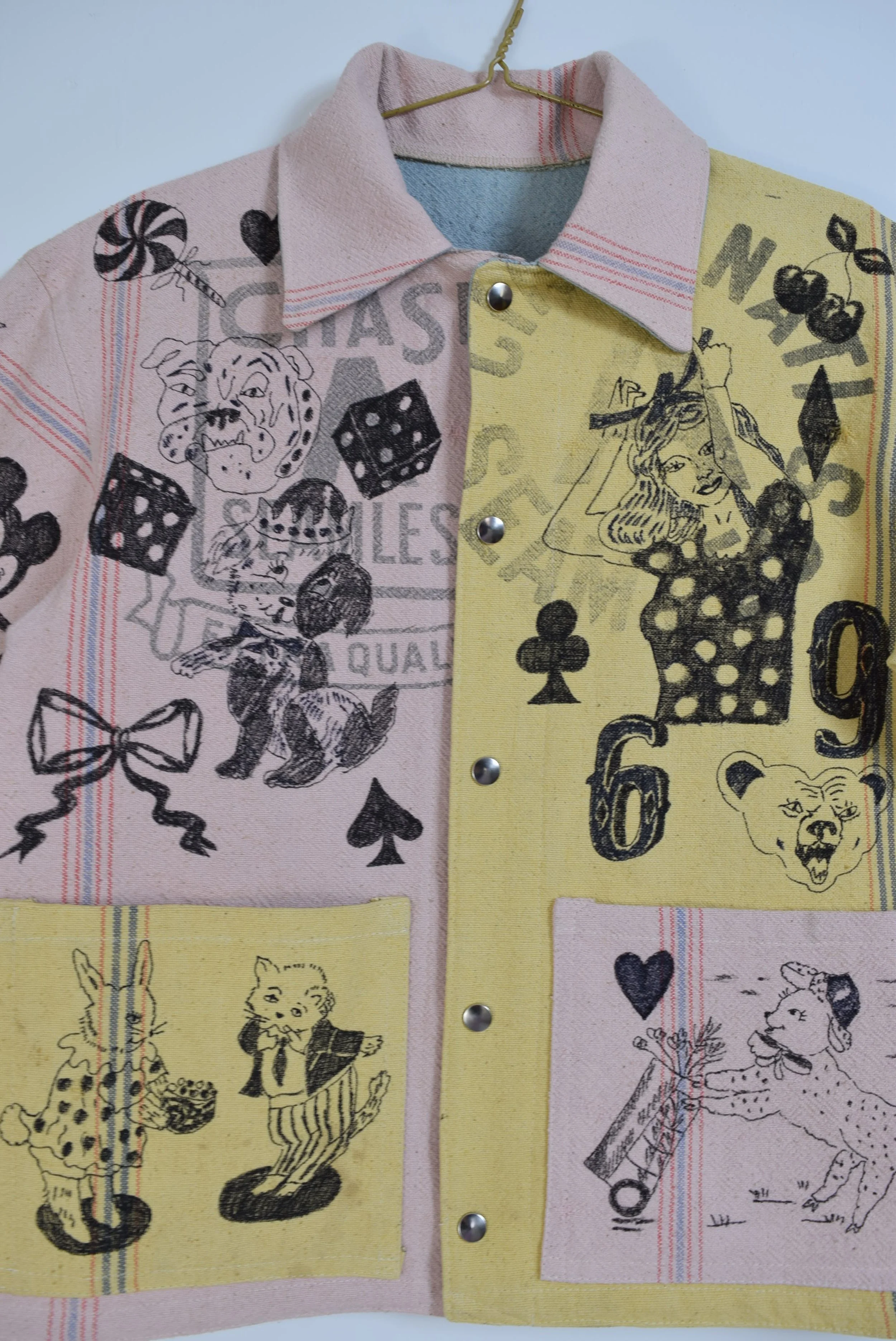 "Infinite Mystery" hand drawn cotton feedsack chore coat Size Medium