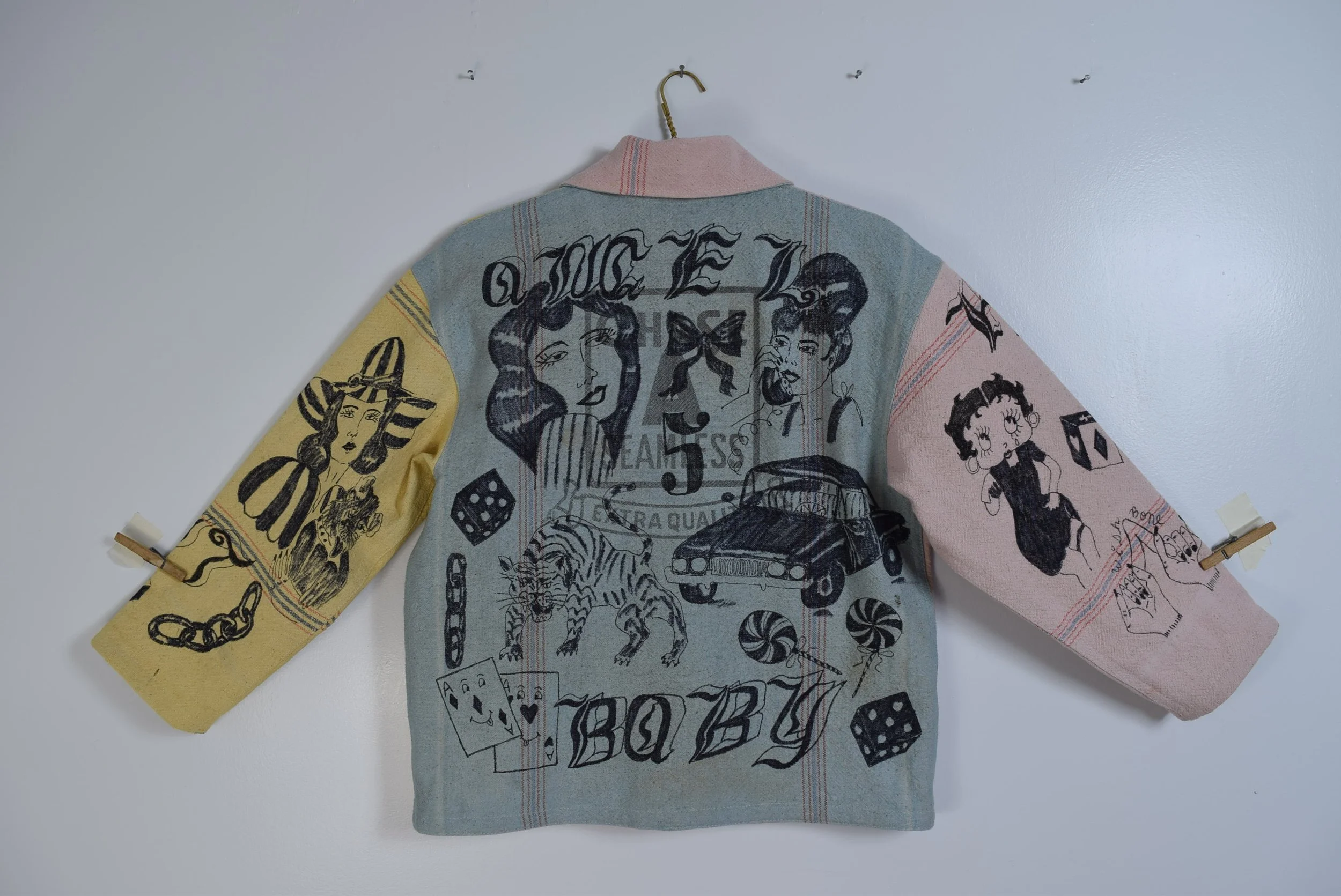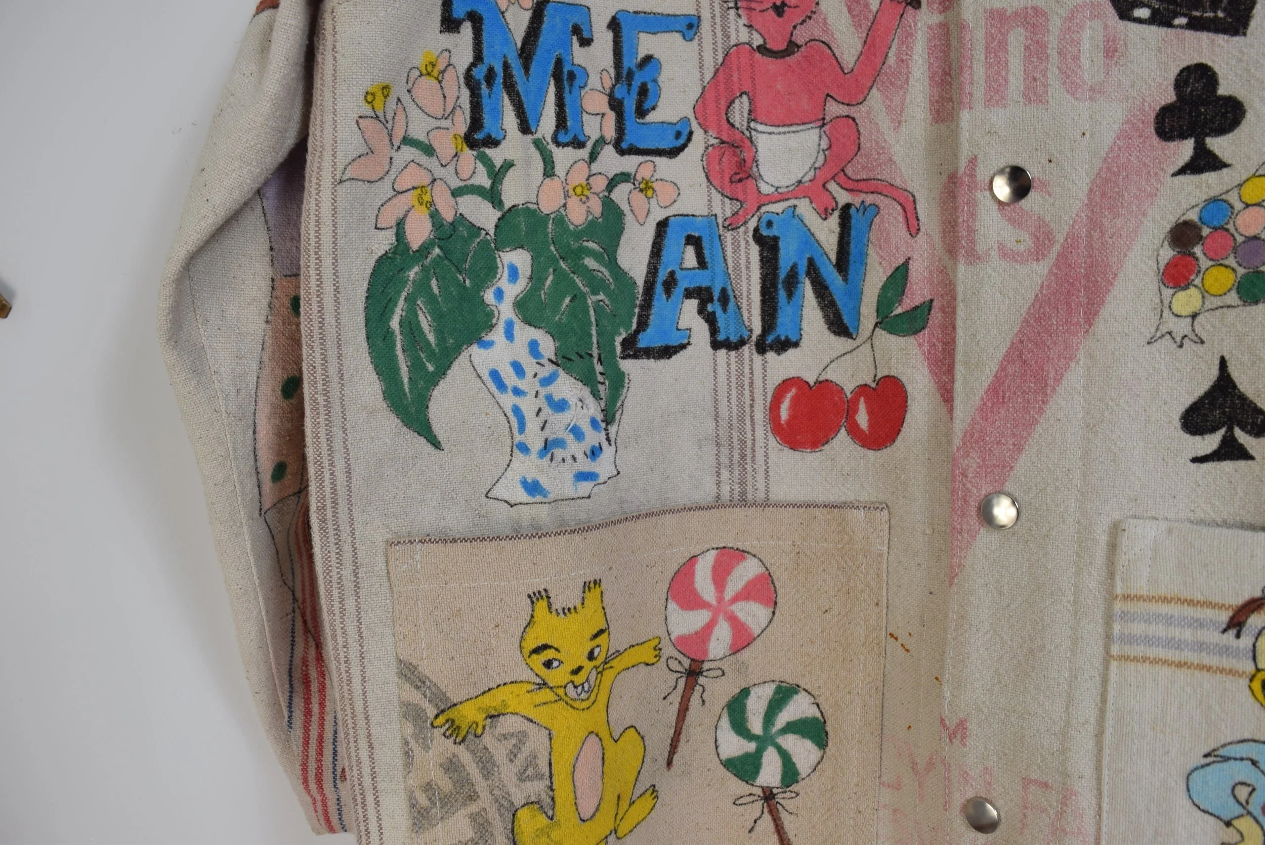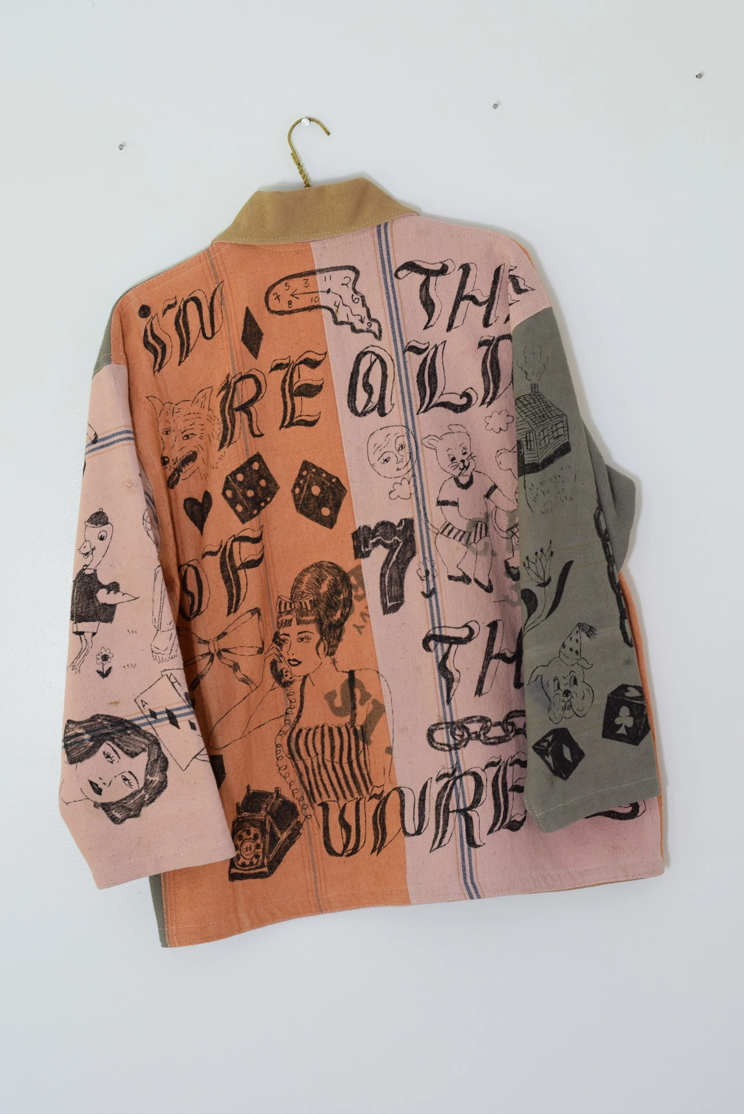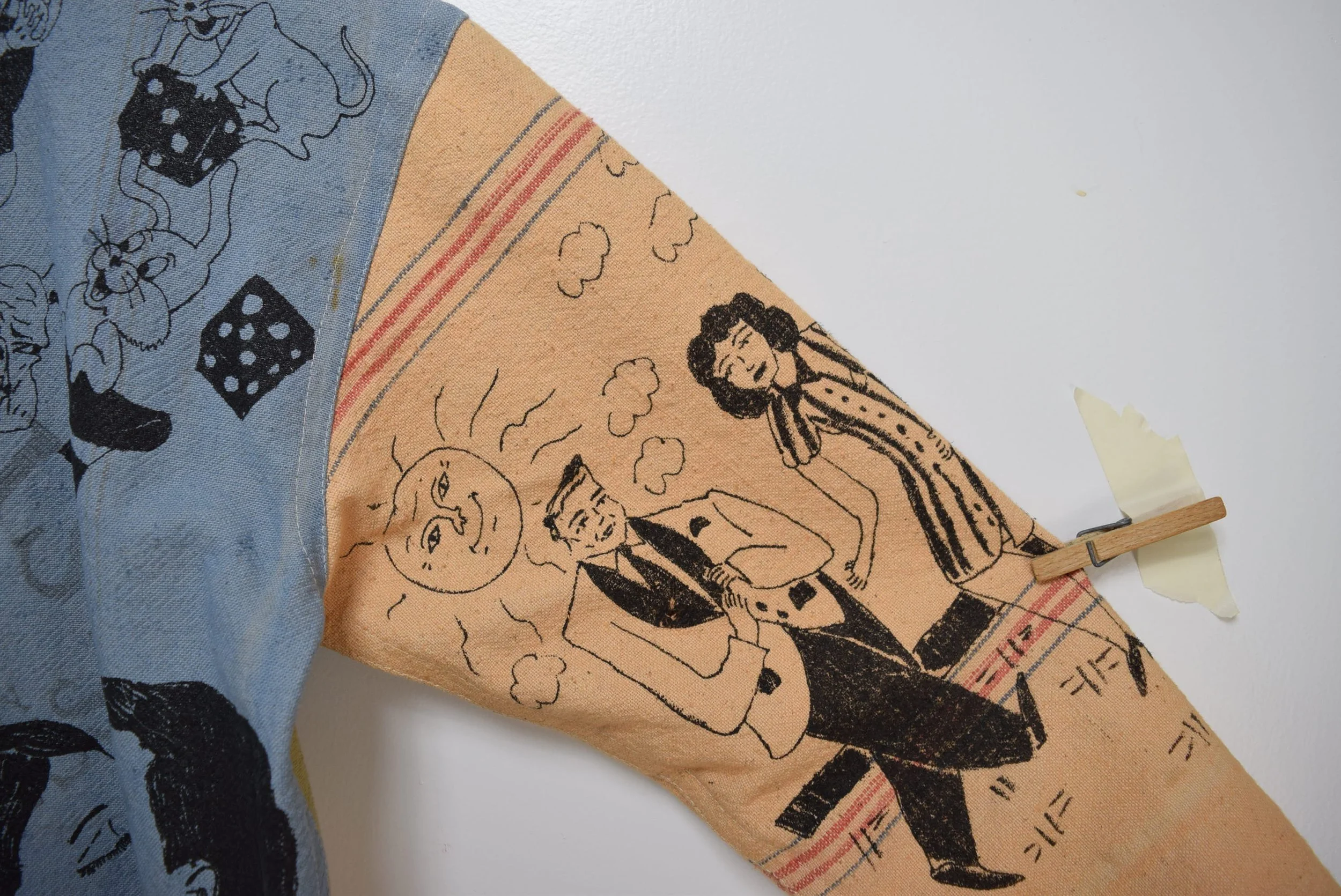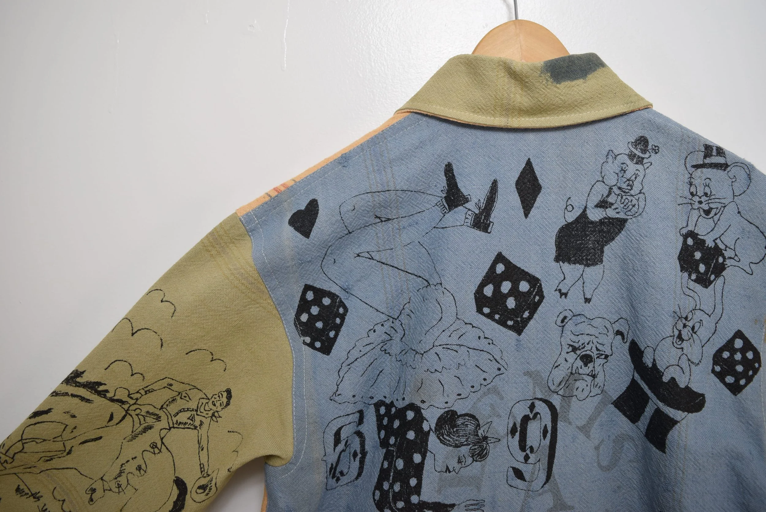 "Infinite Mystery" hand drawn cotton feedsack chore coat Size Medium
