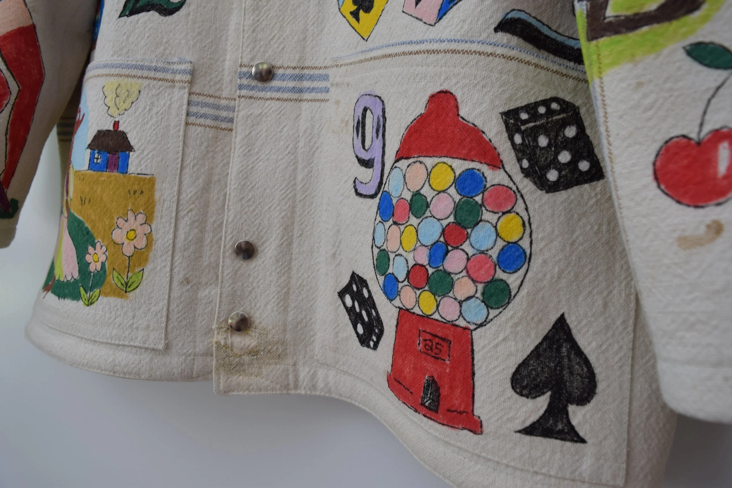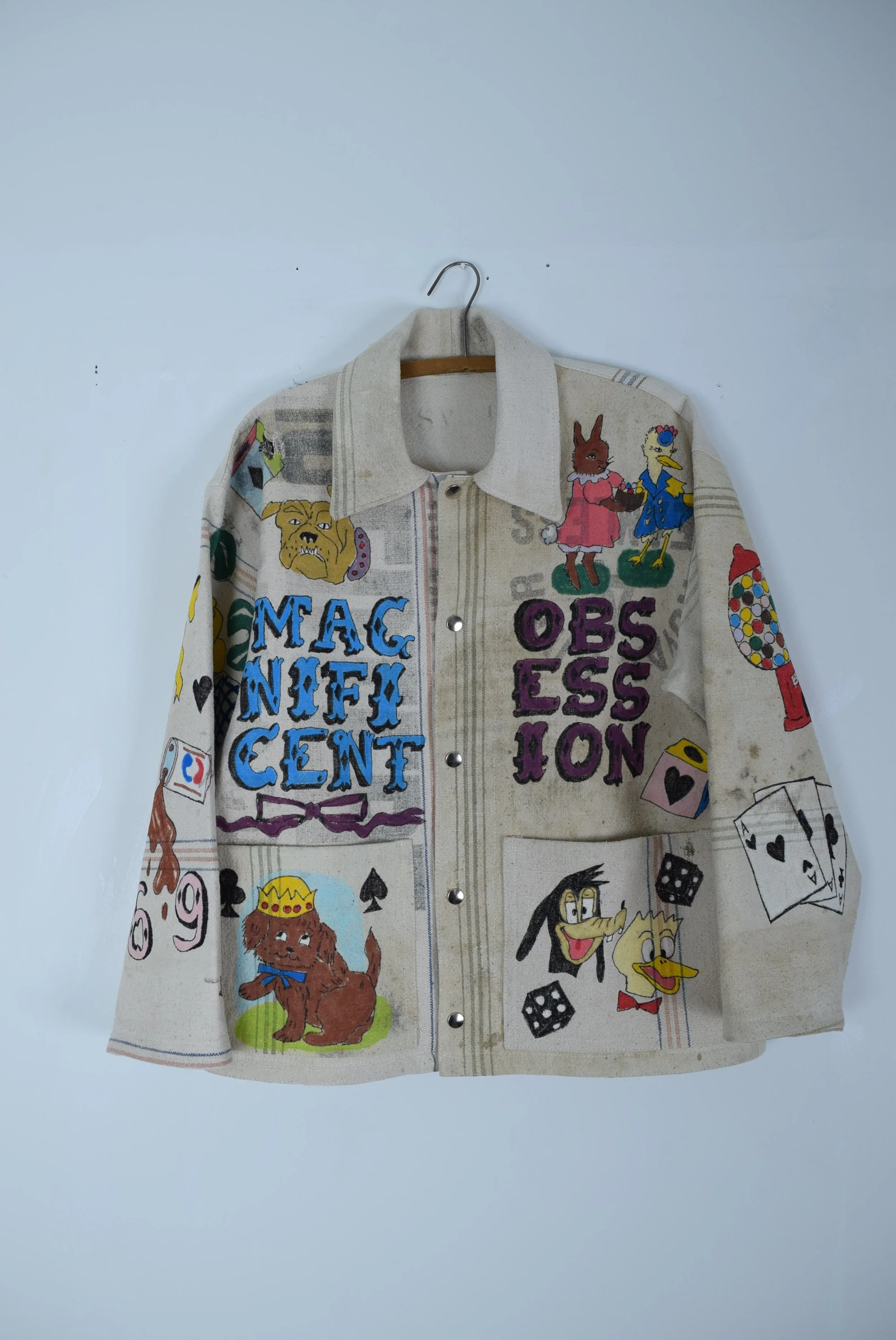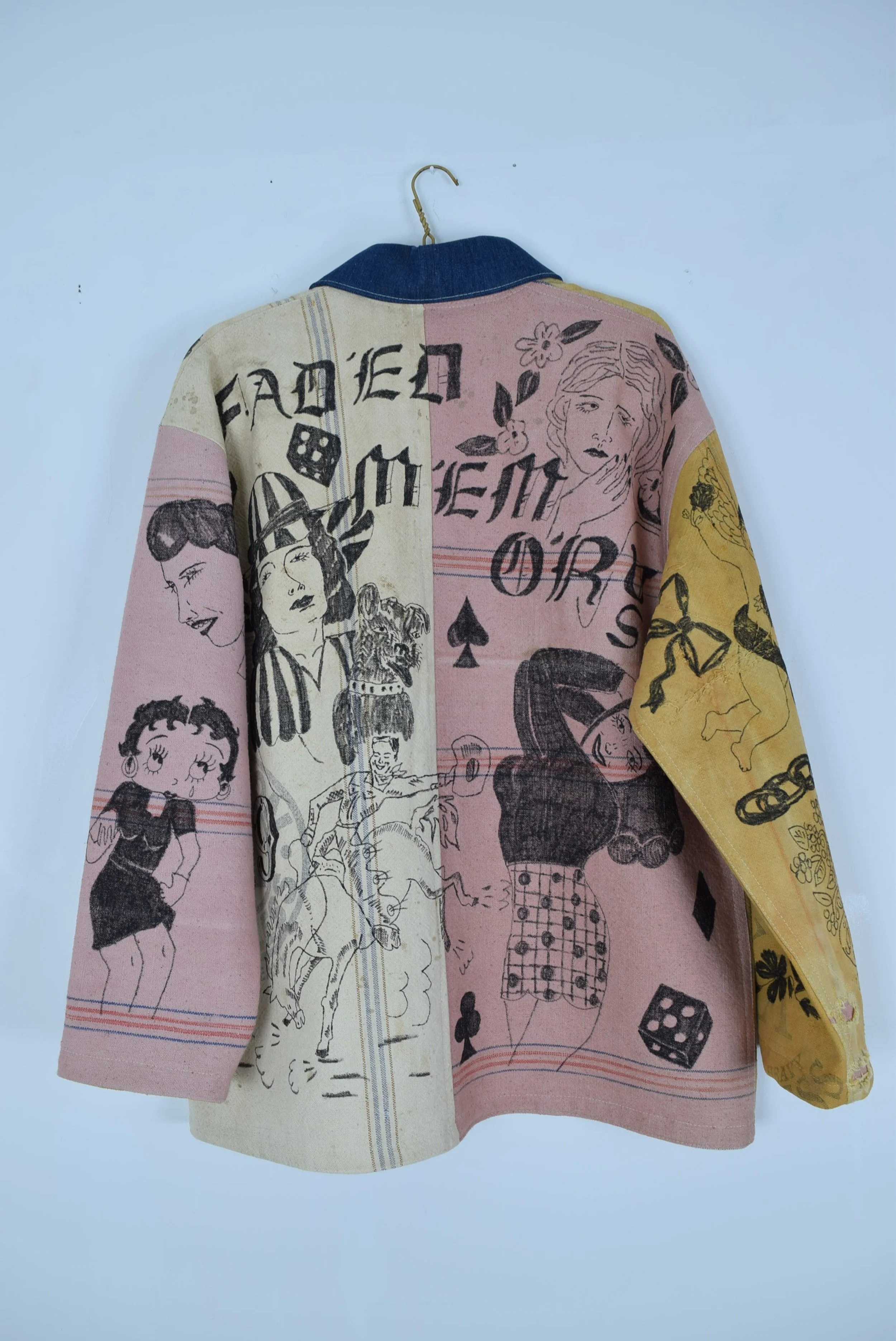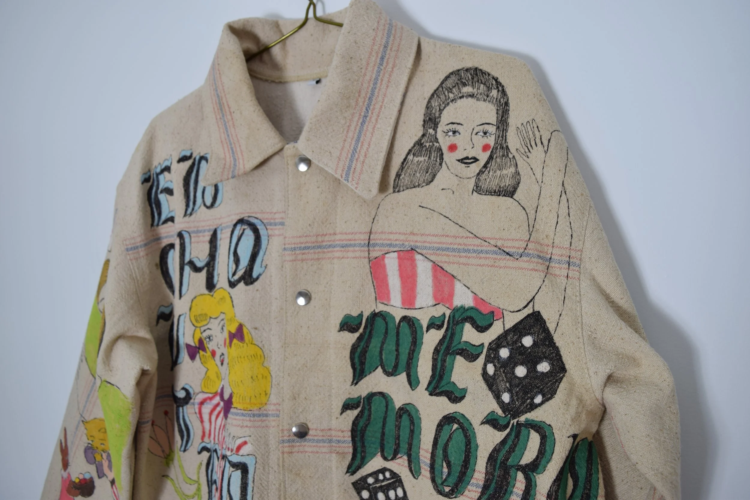 "Infinite Mystery" hand drawn cotton feedsack chore coat Size Medium