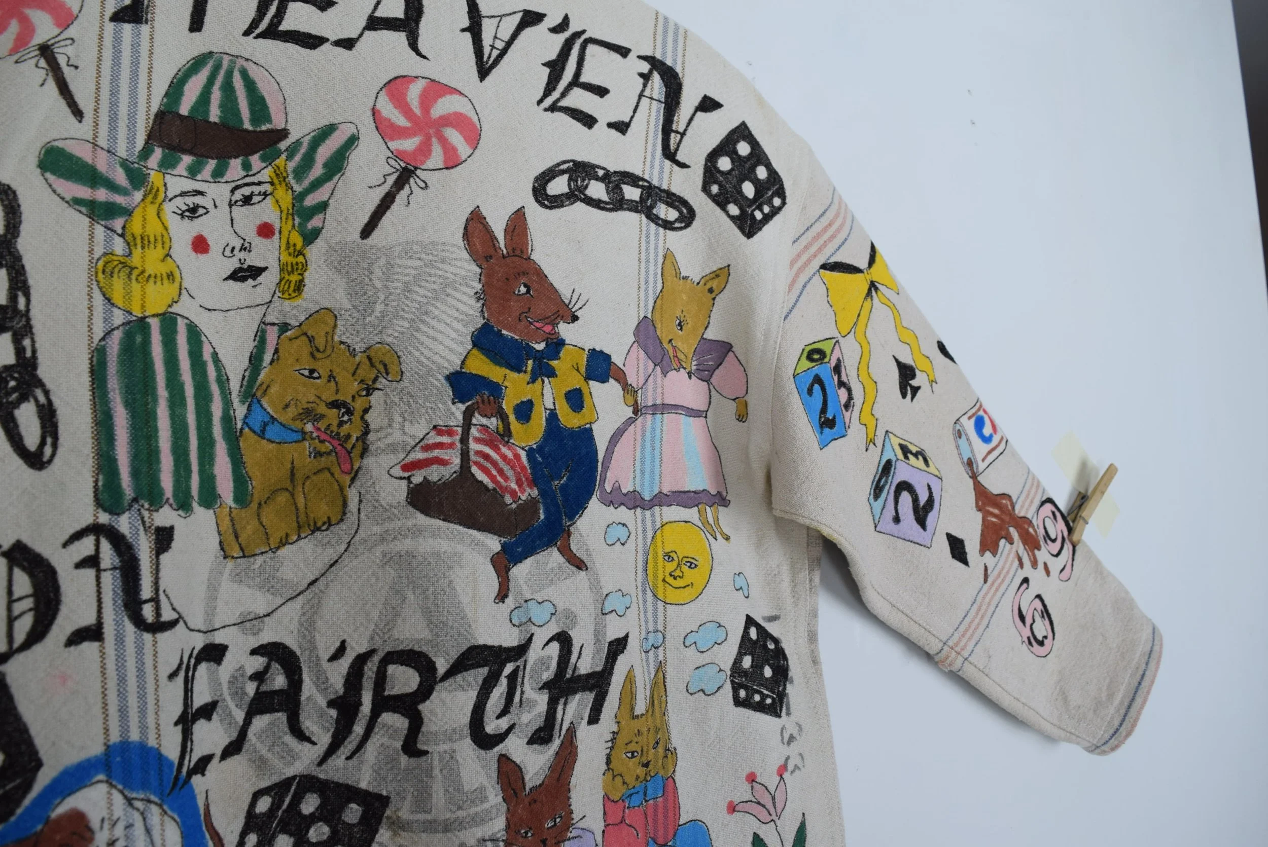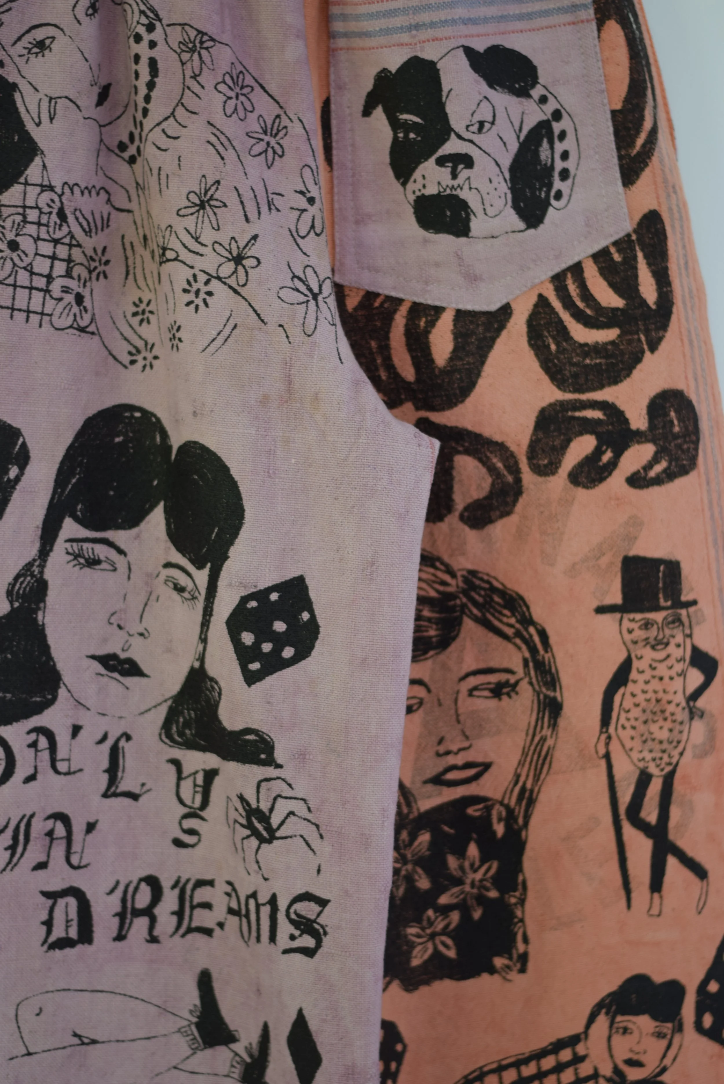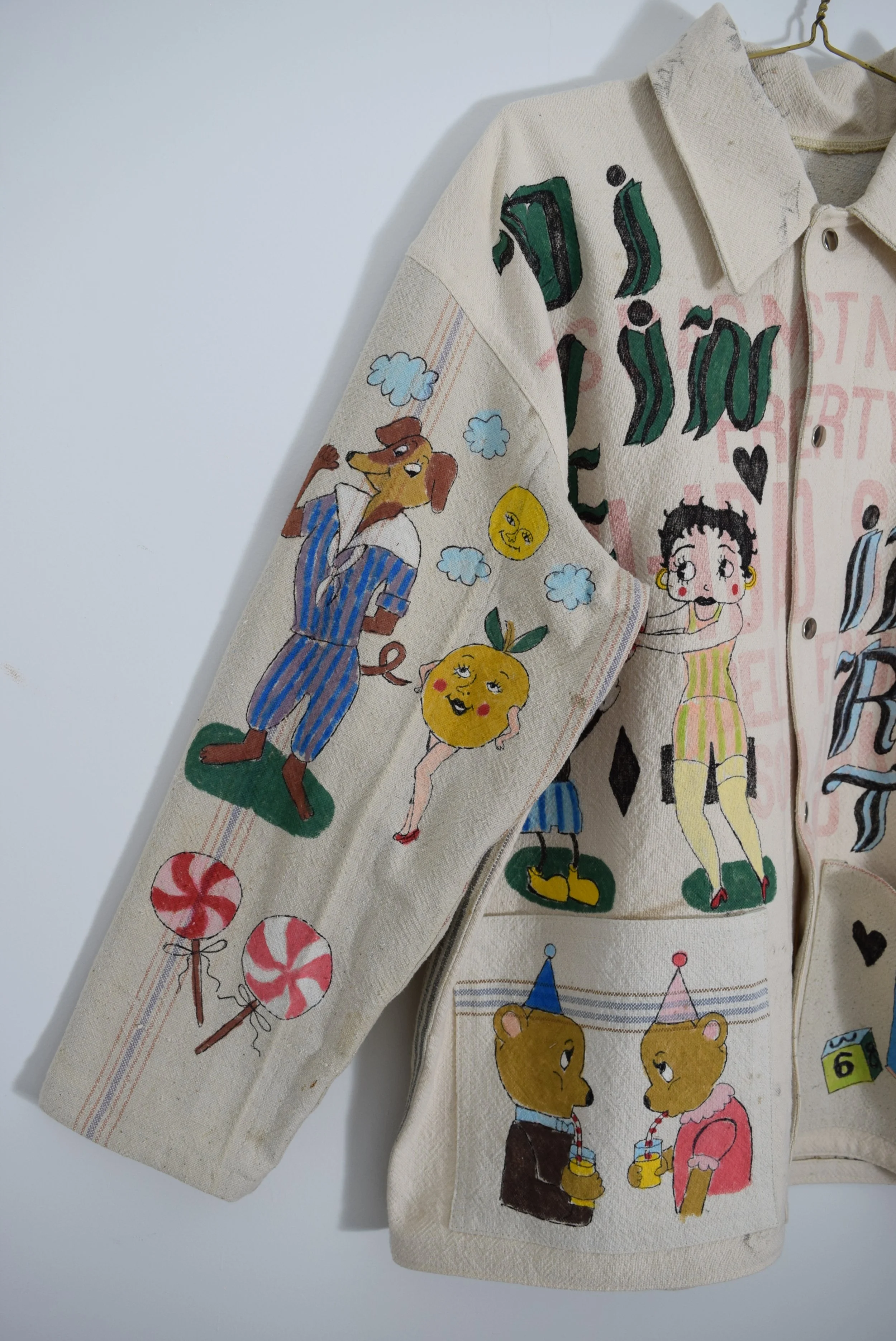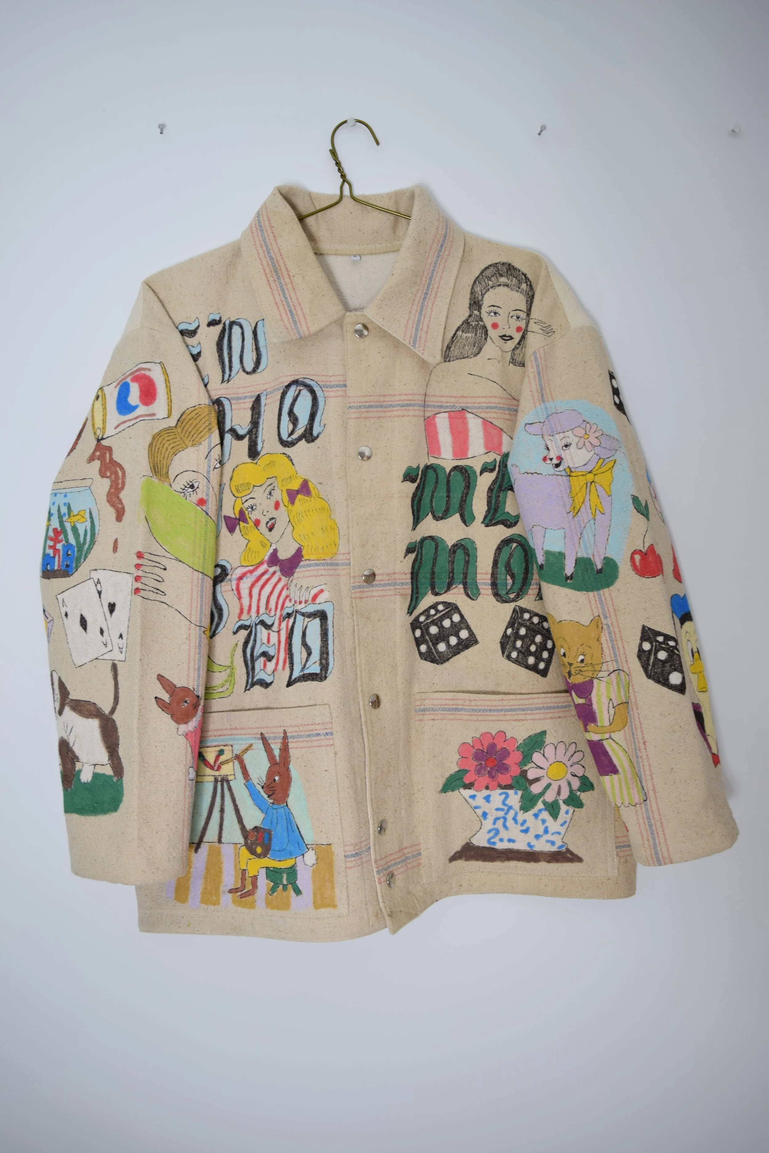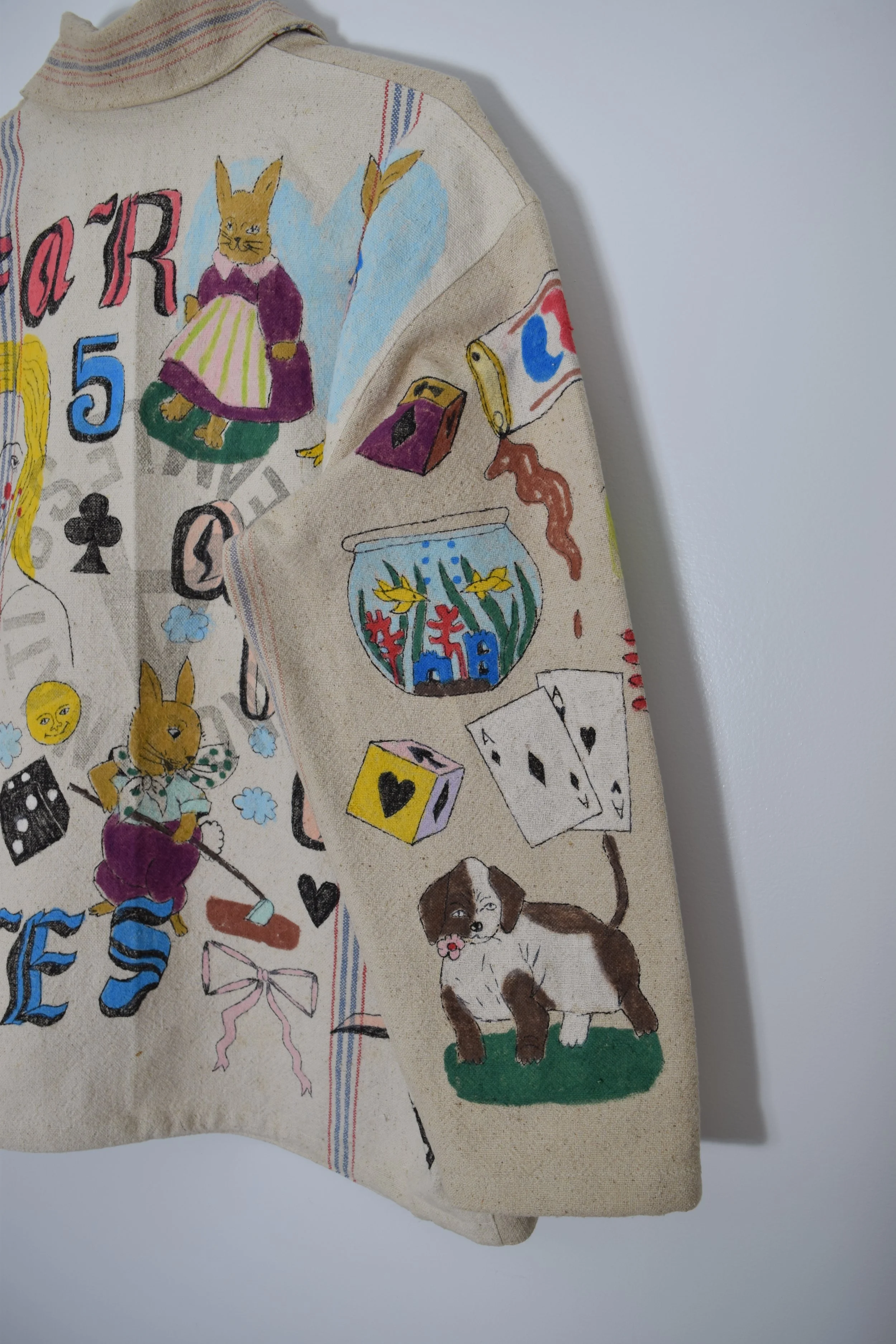 "Infinite Mystery" hand drawn cotton feedsack chore coat Size Medium