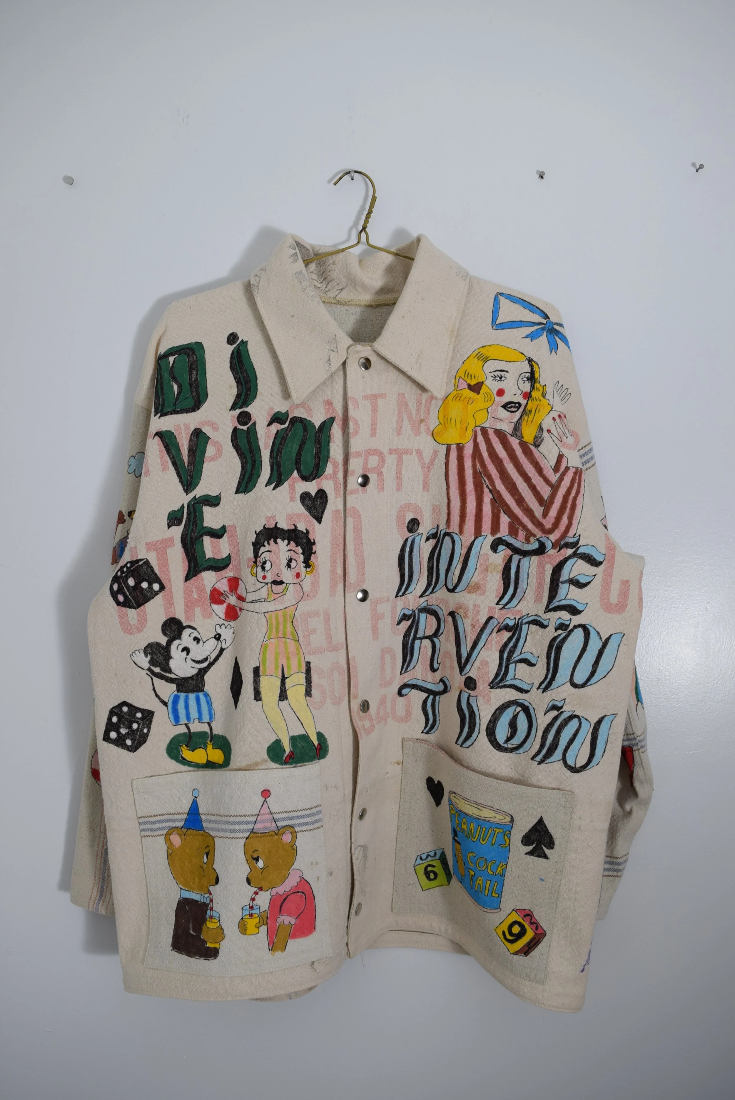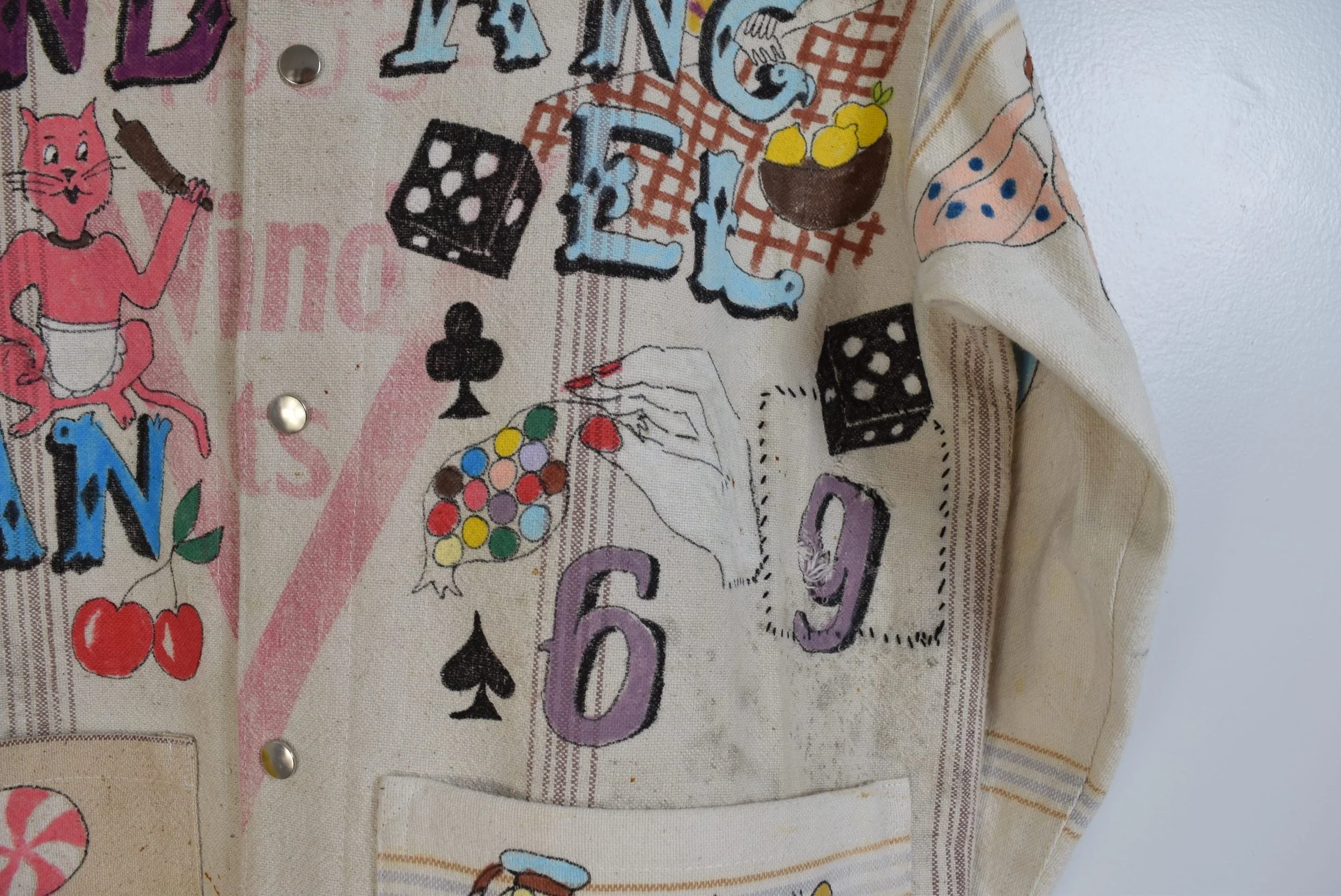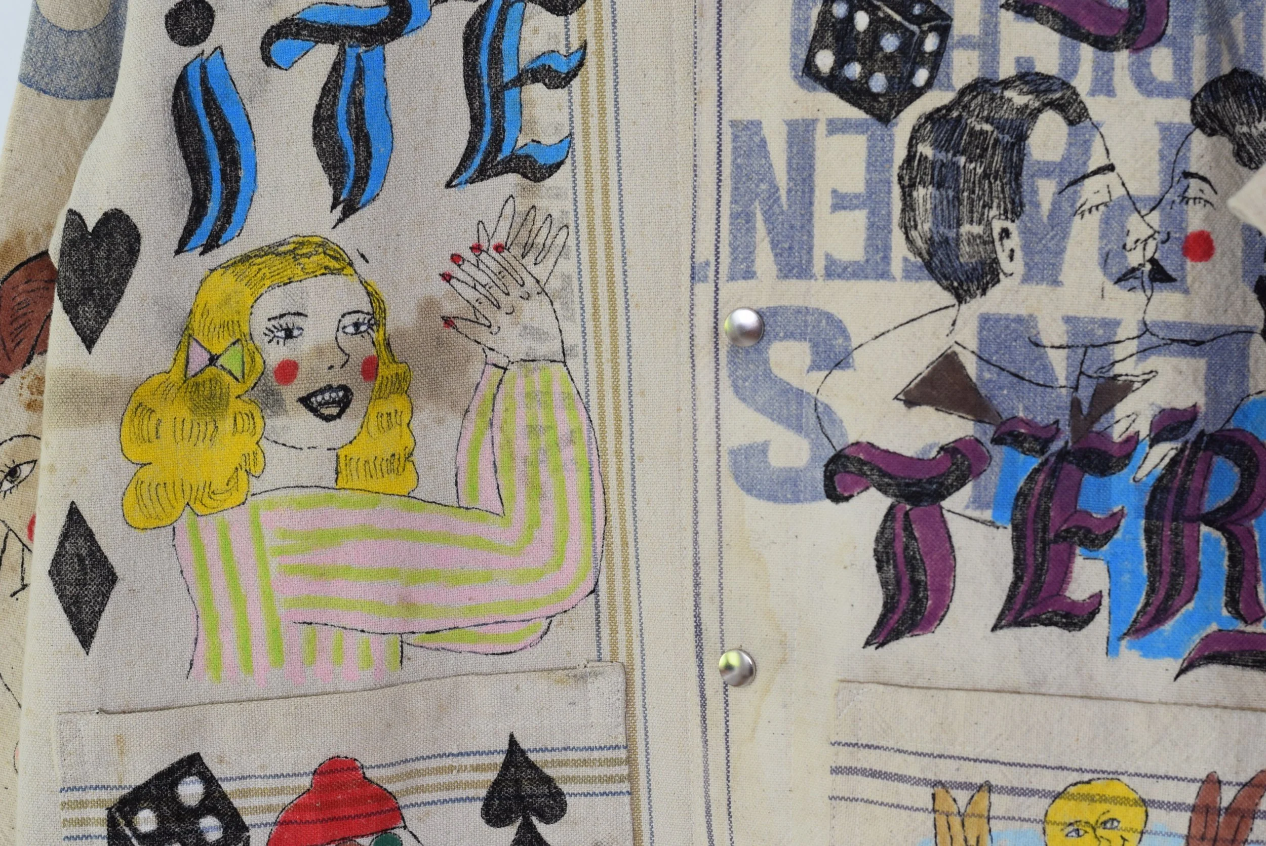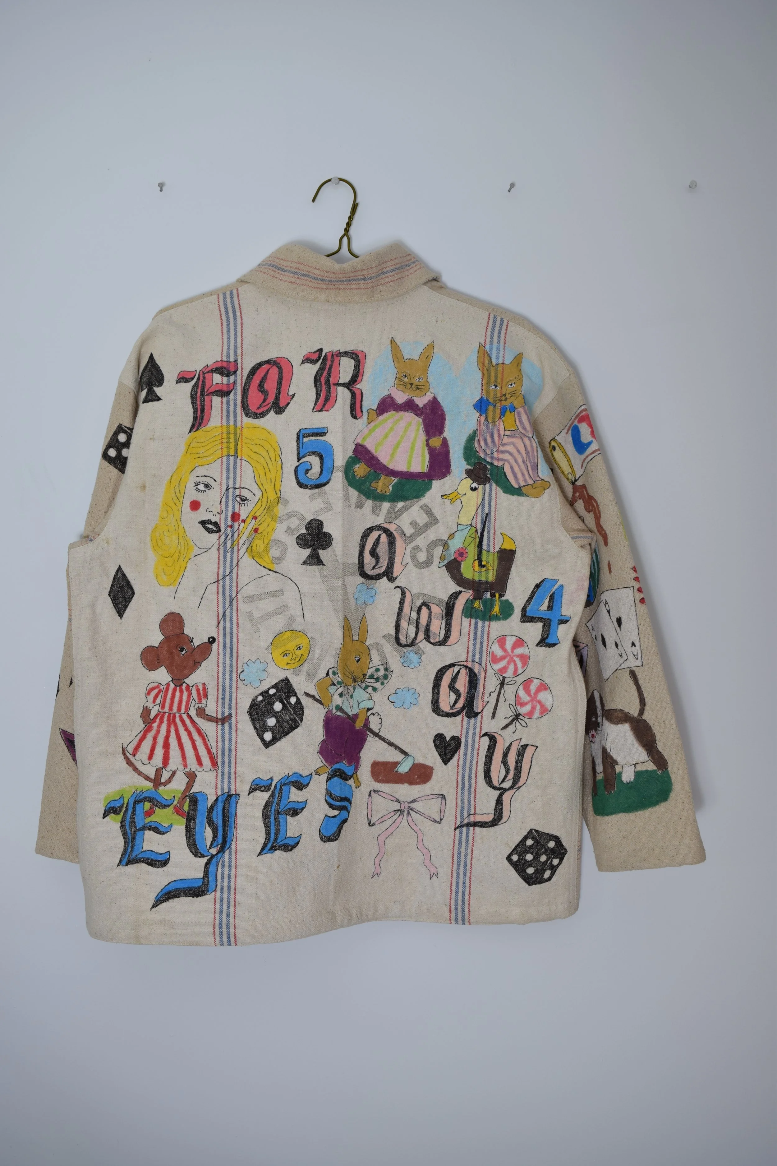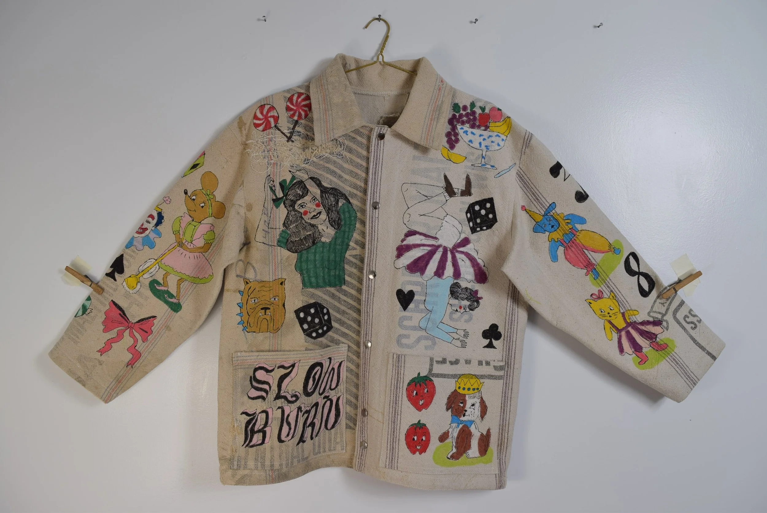"Infinite Mystery" hand drawn cotton feedsack chore coat Size Medium