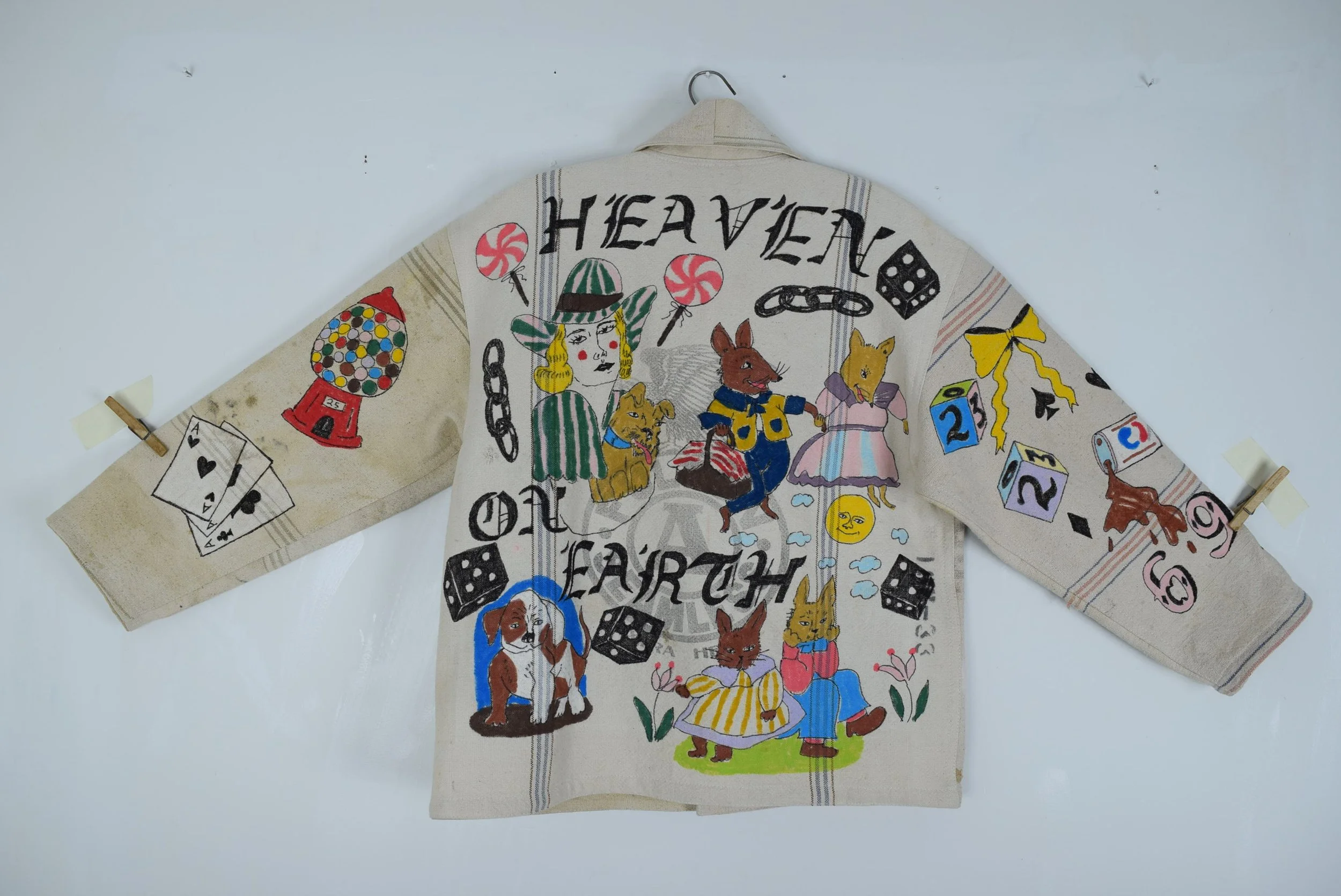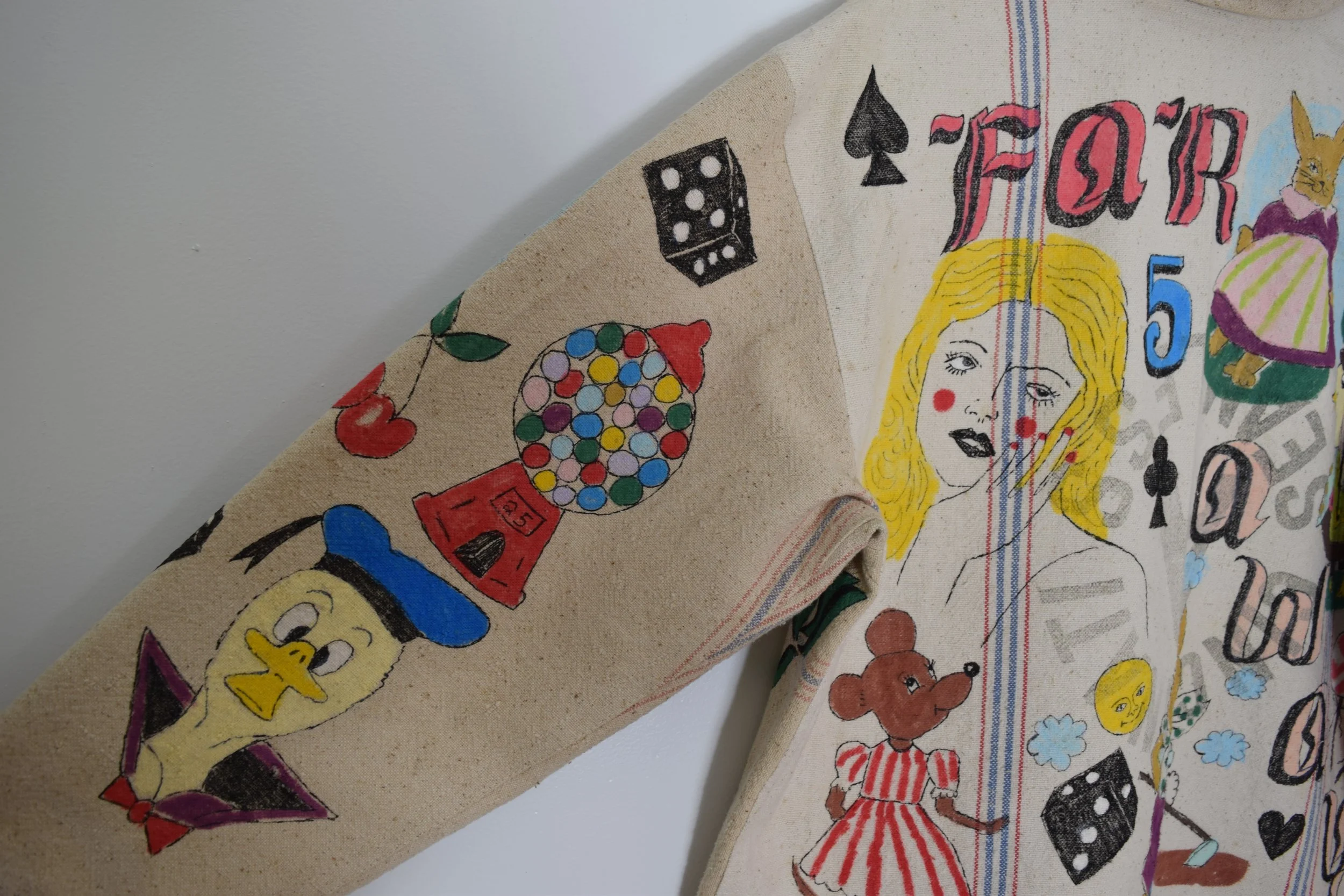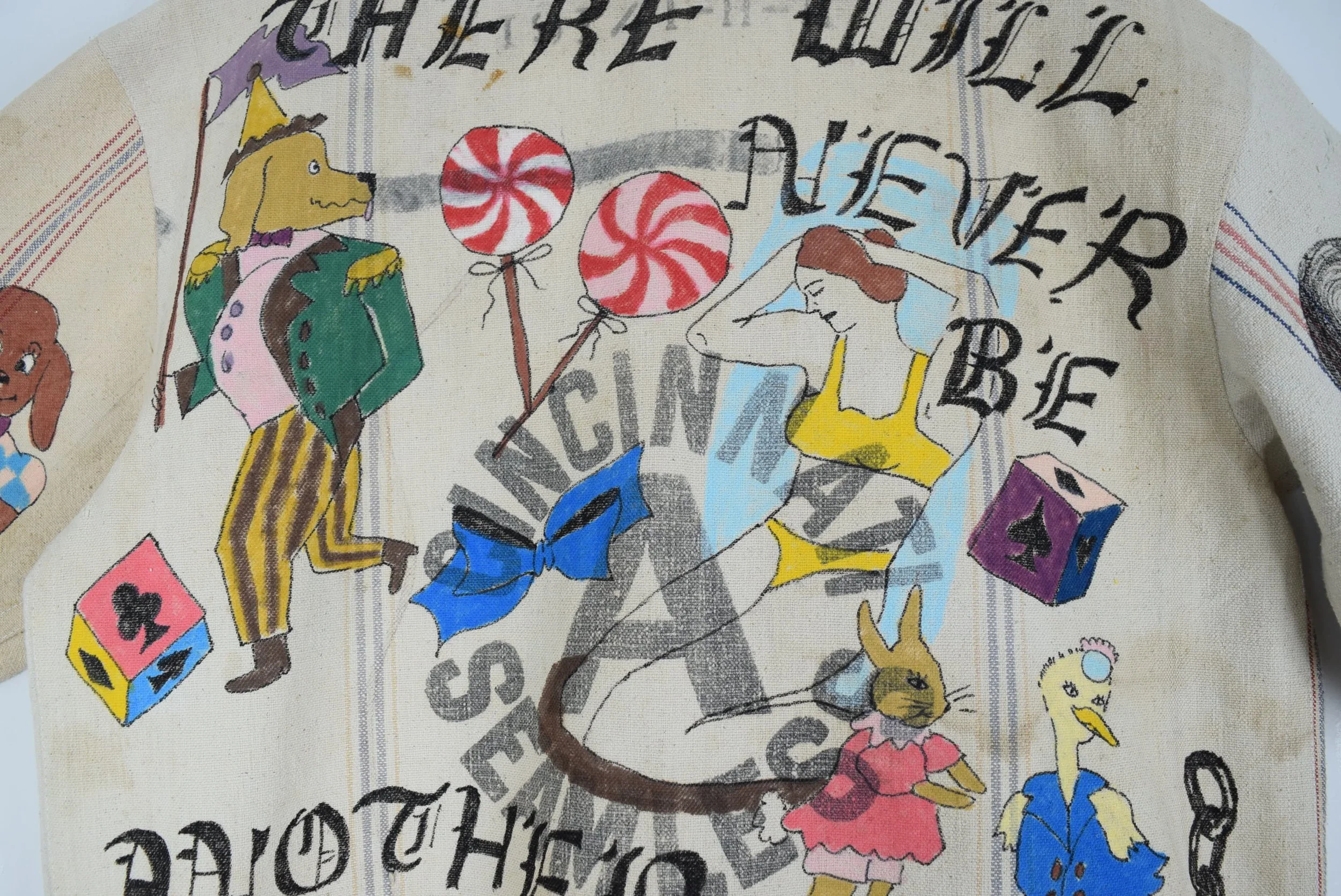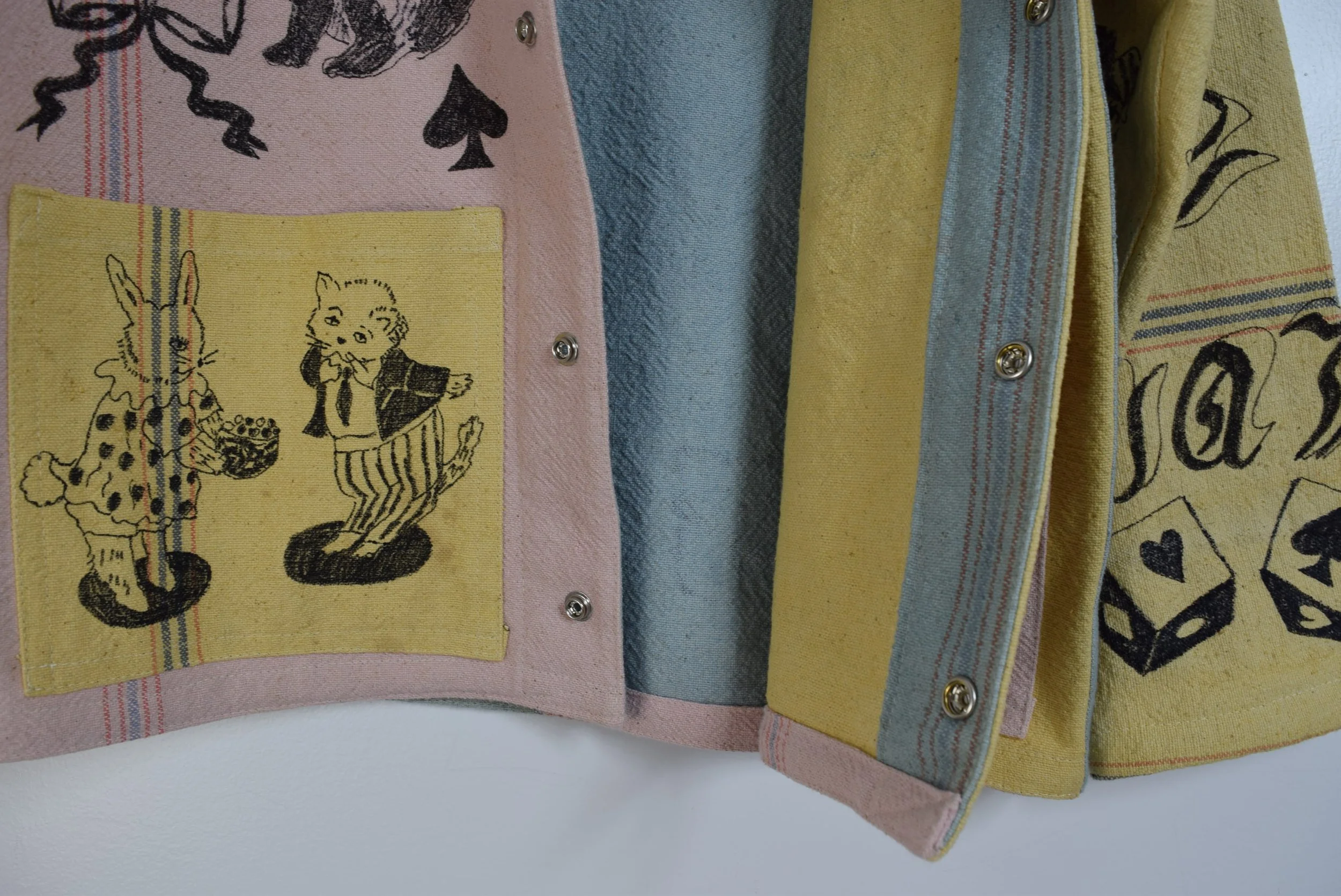 "Infinite Mystery" hand drawn cotton feedsack chore coat Size Medium