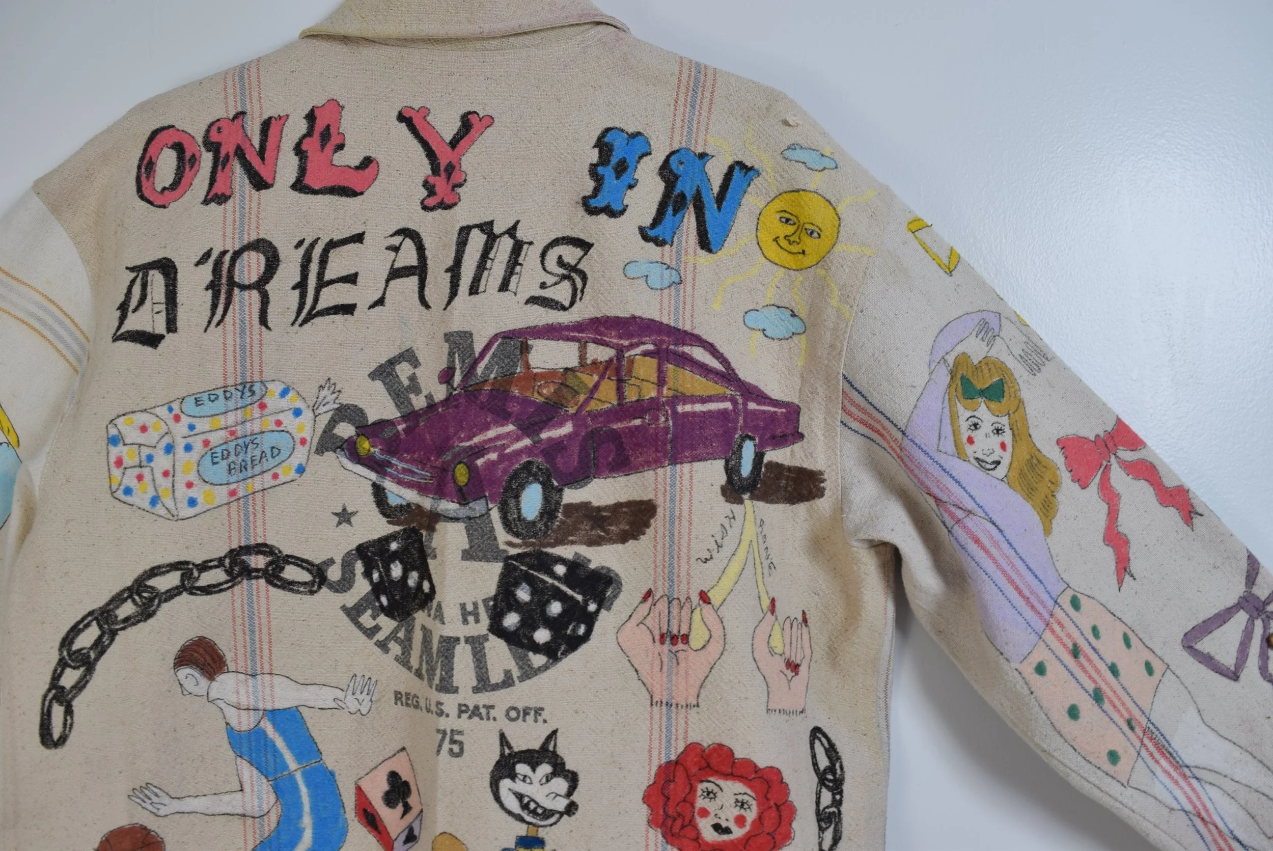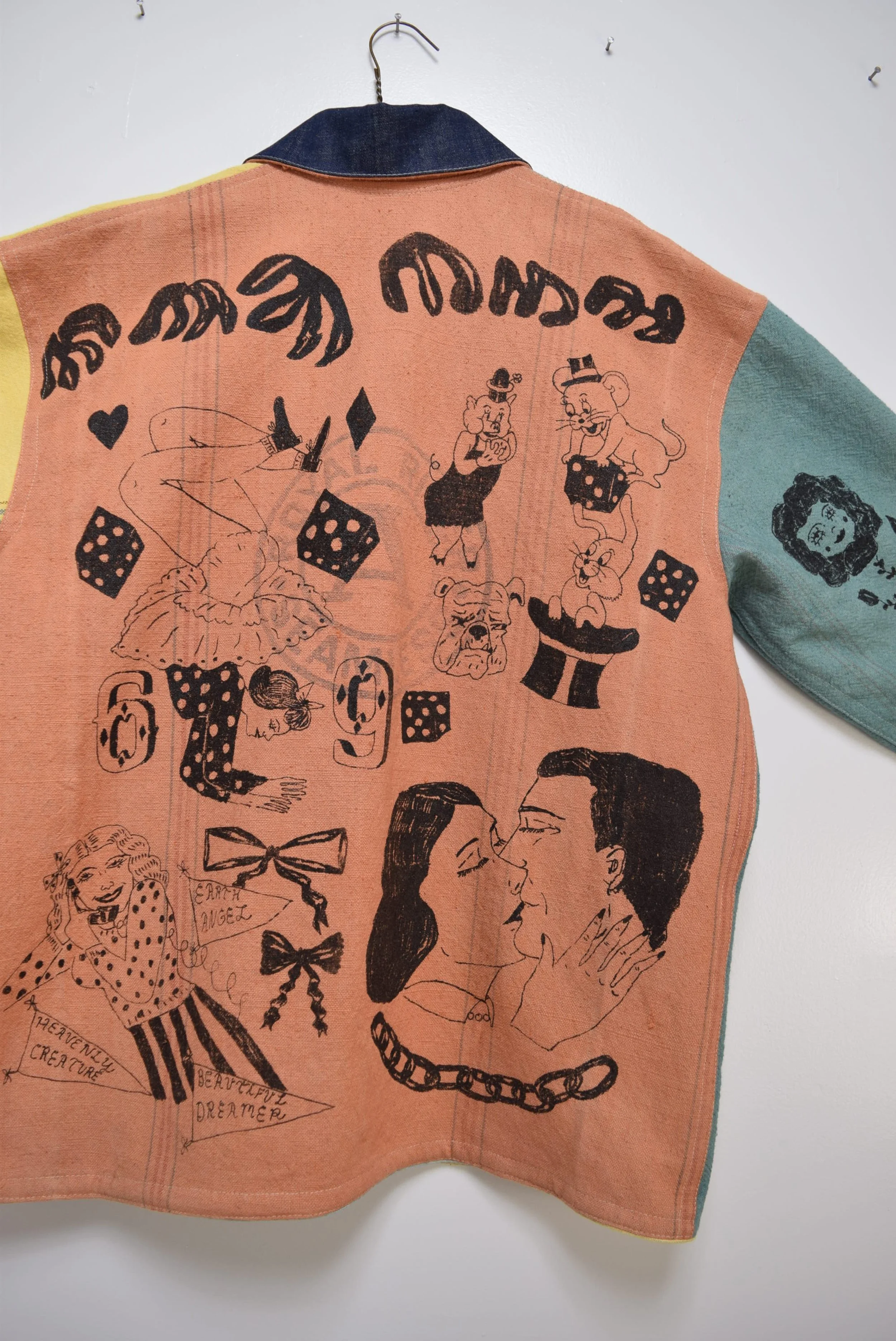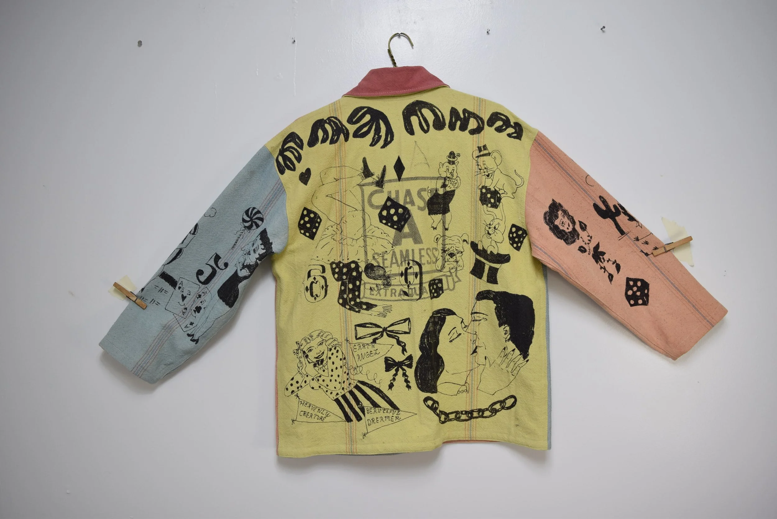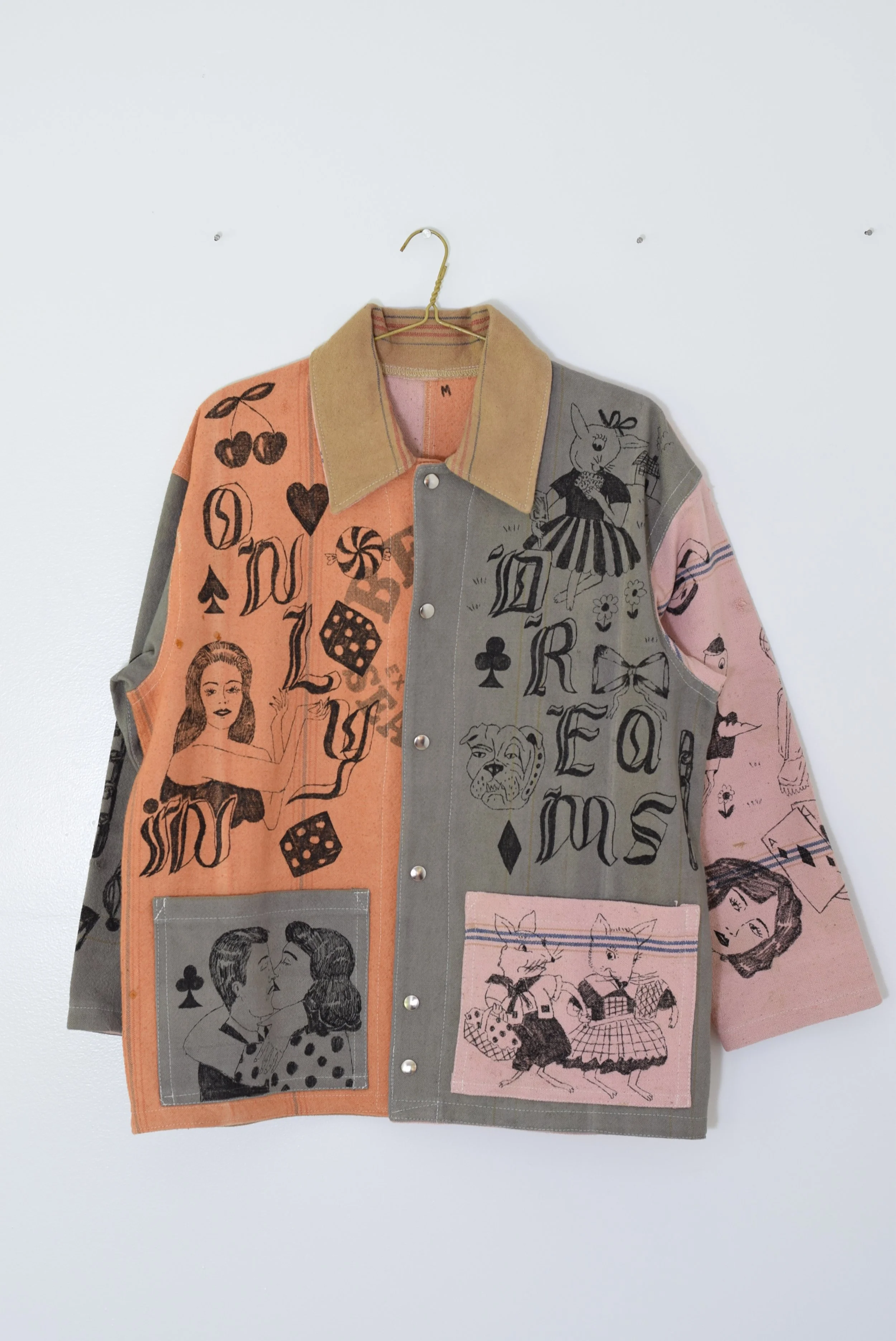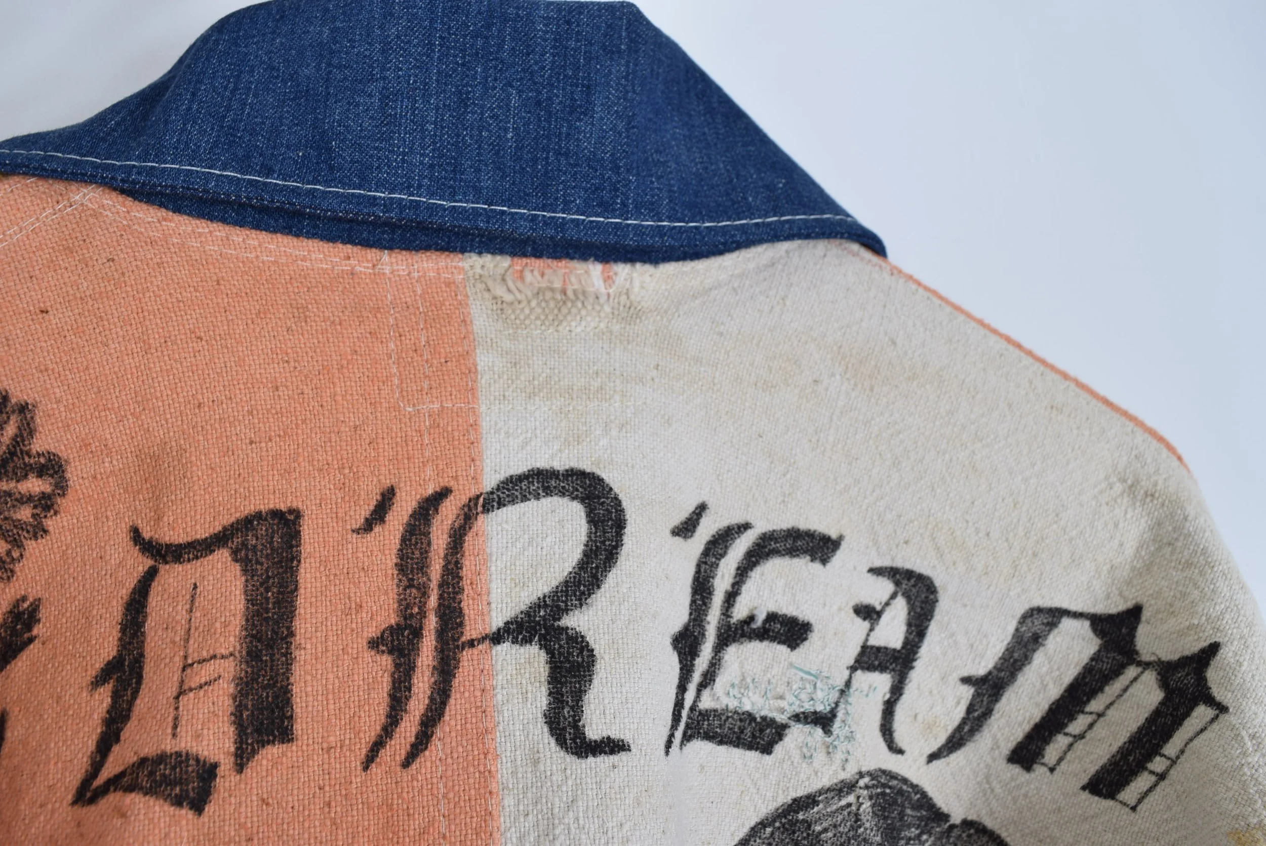 "Only Dreams" hand drawn colorblock cotton feedsack chore coat Size Medium