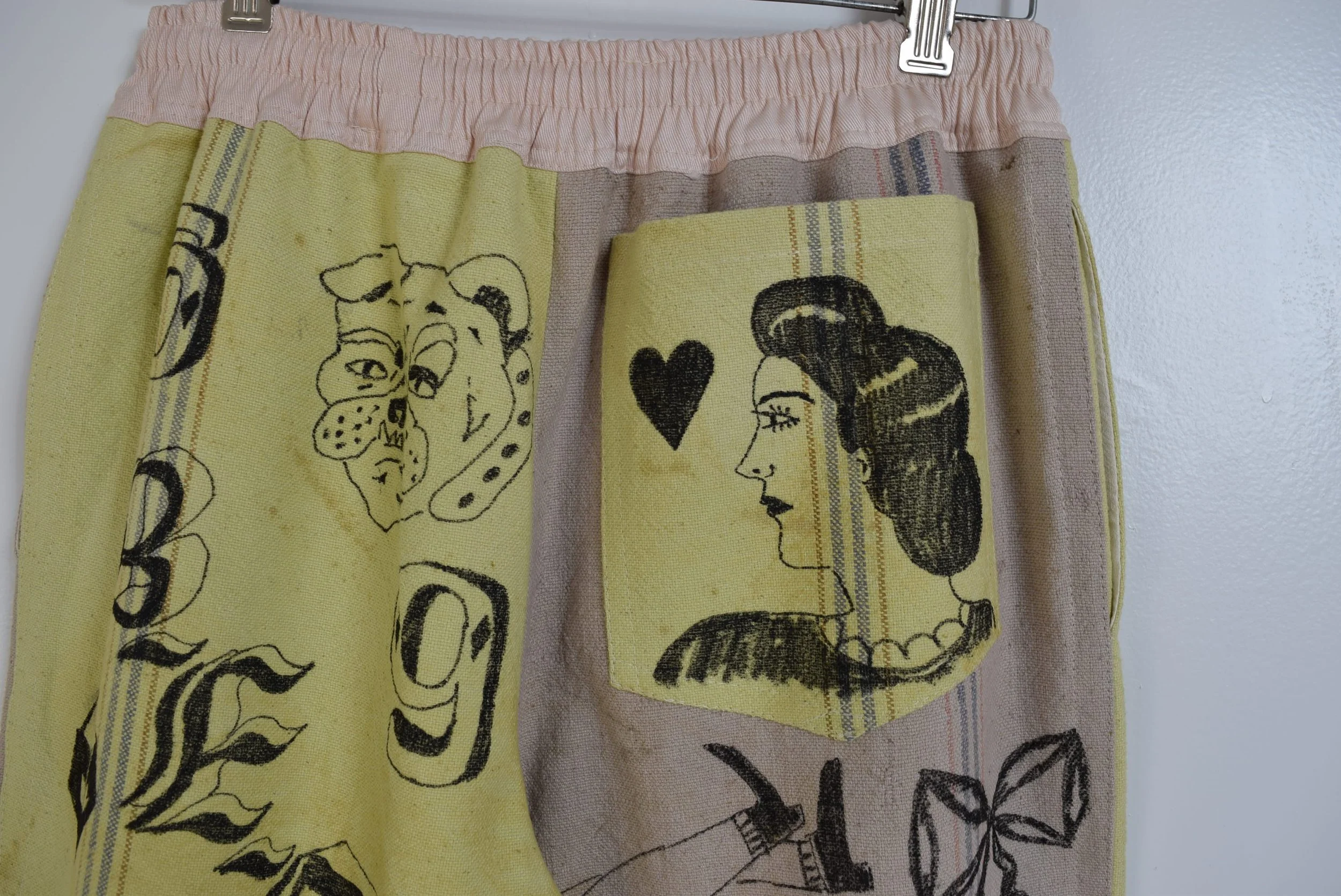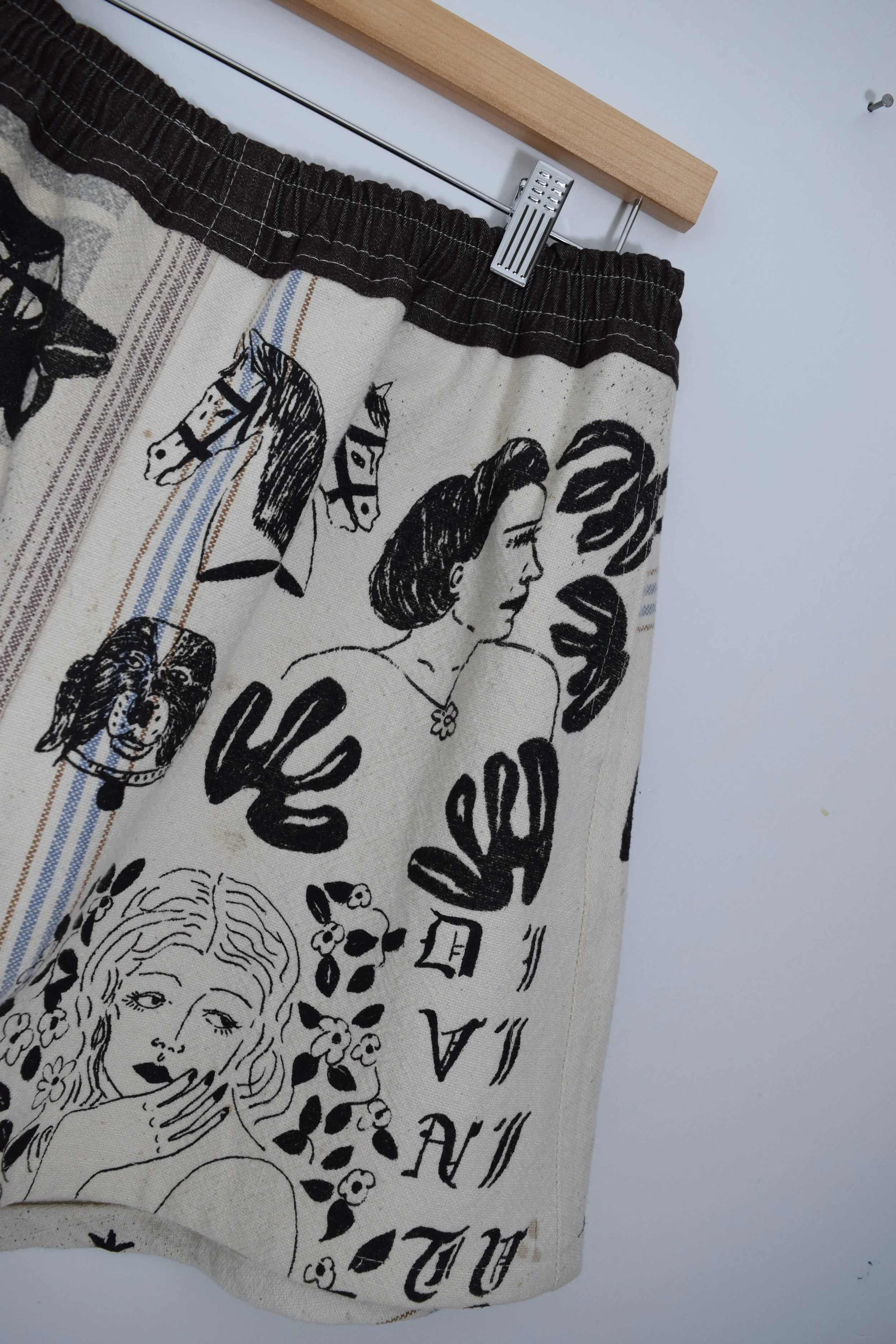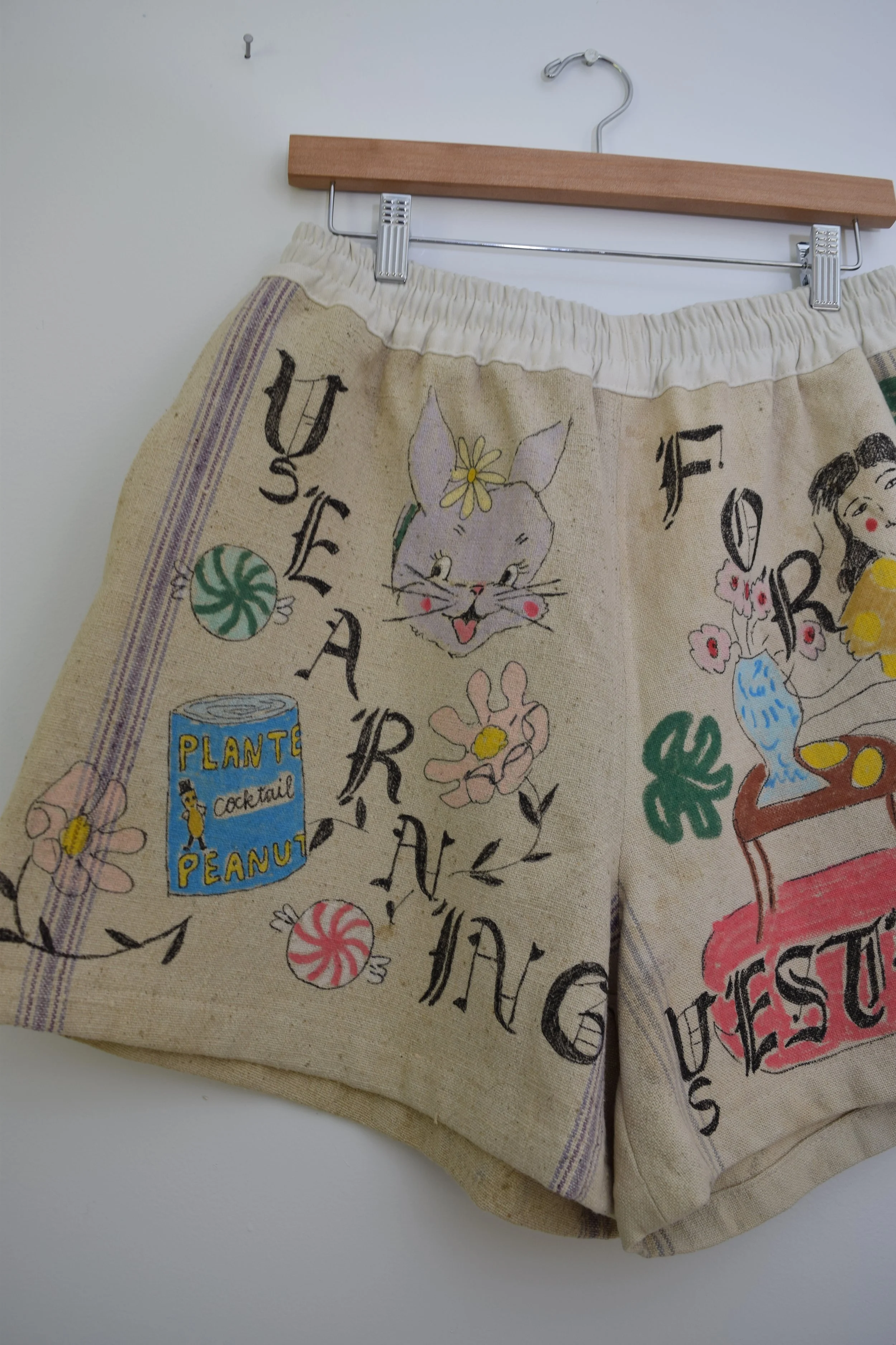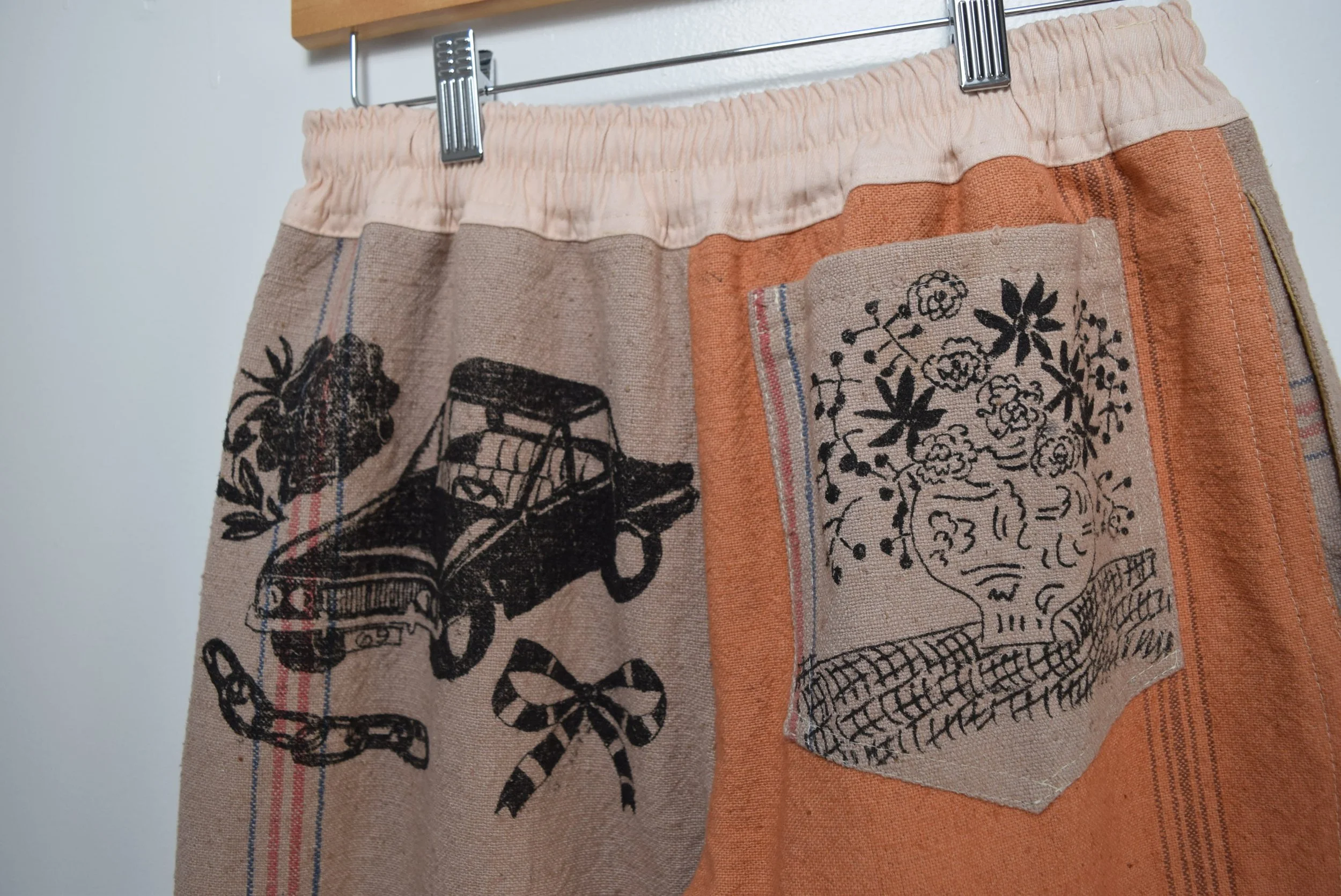"yearning for yesterday" Hand Drawn Cotton Feedsack Shorts size M/L