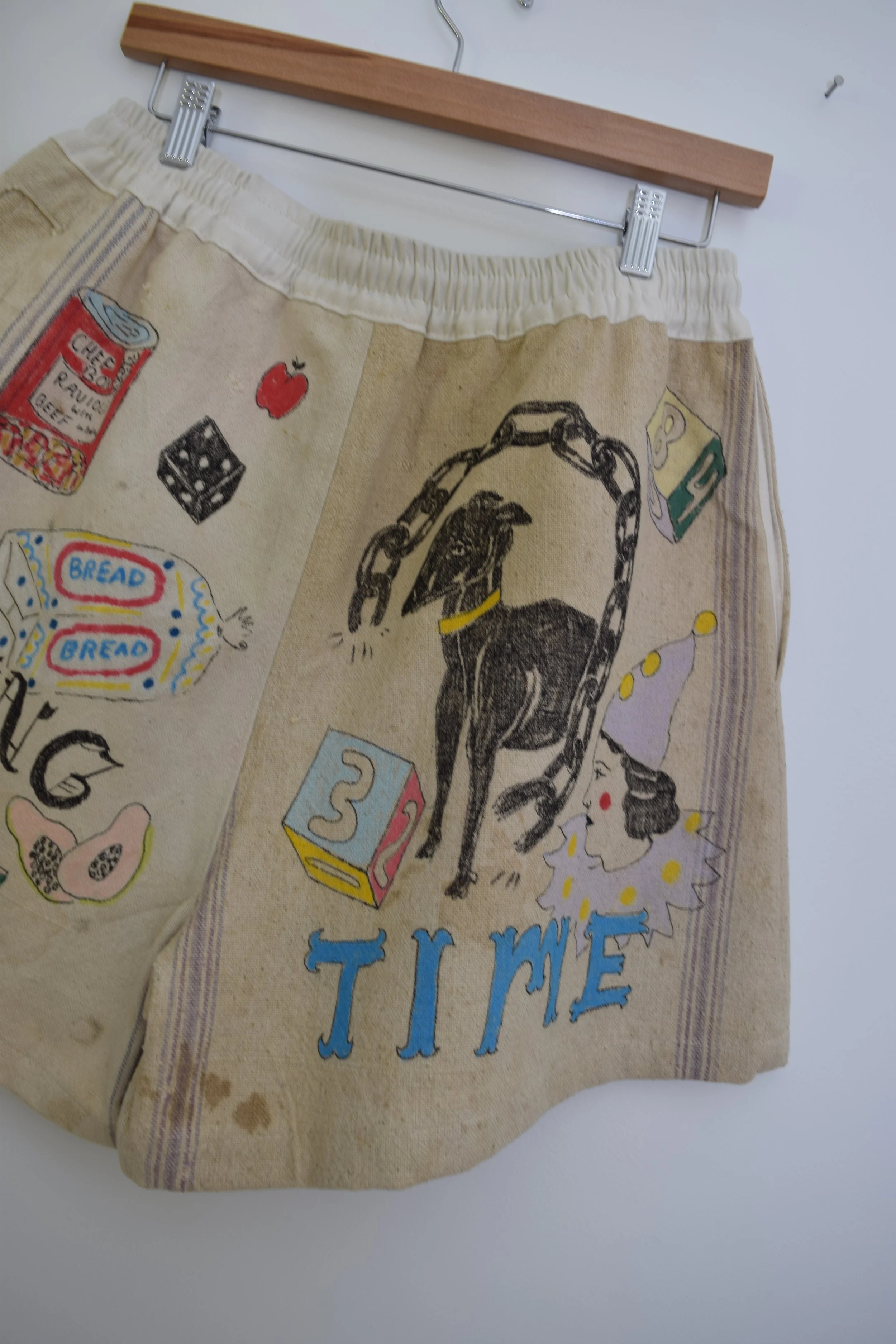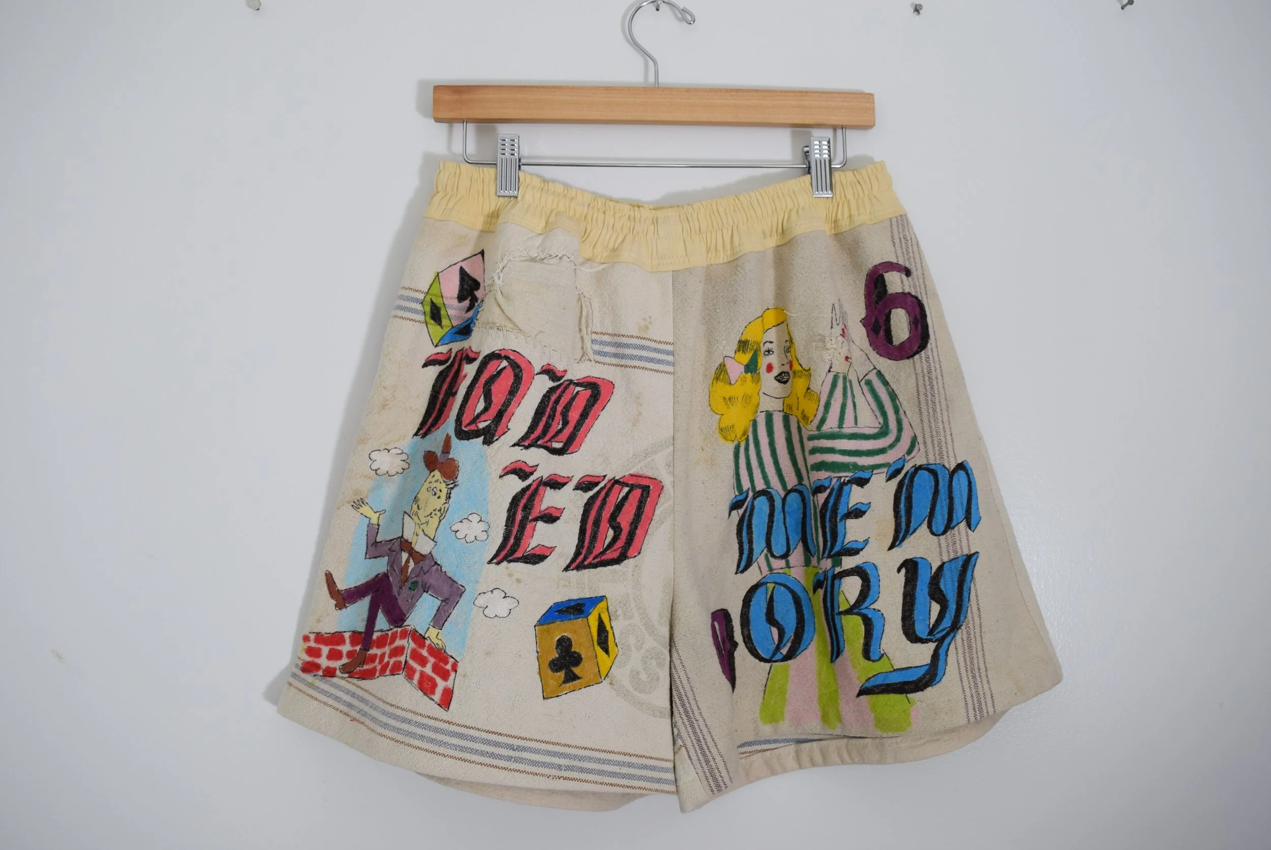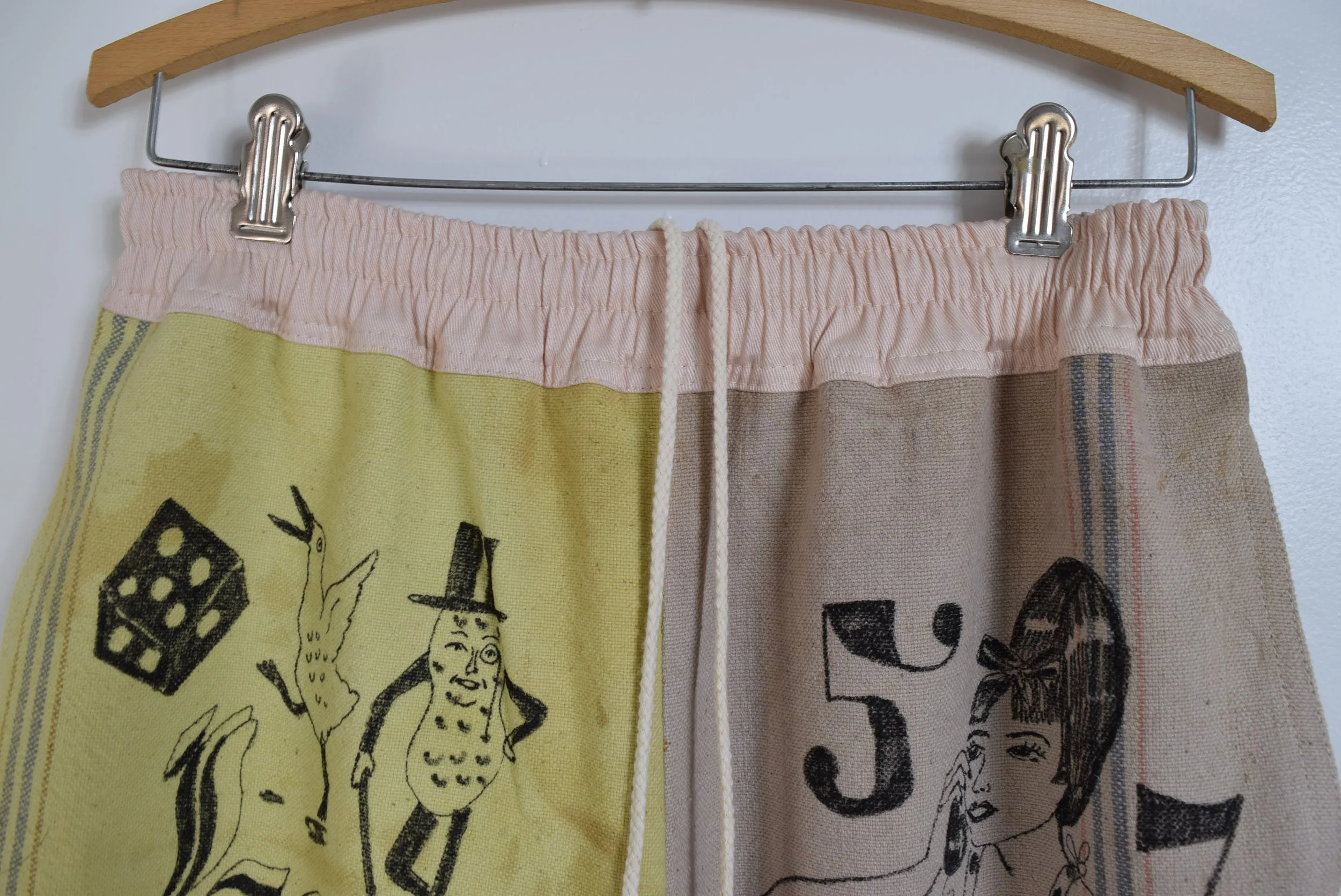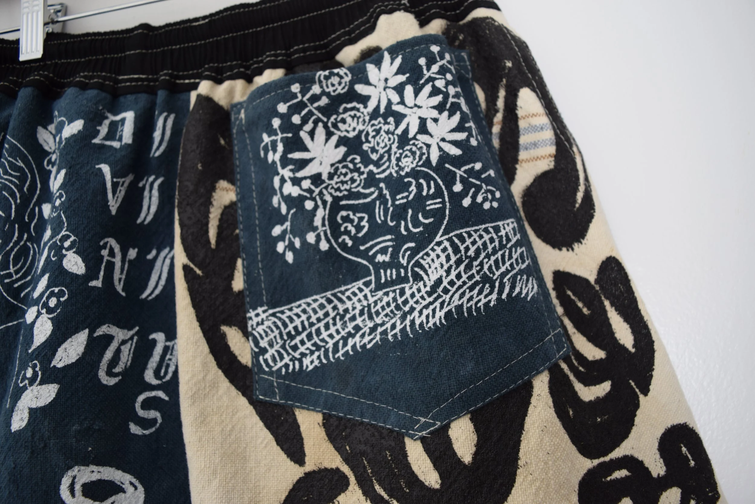 "yearning for yesterday" Hand Drawn Cotton Feedsack Shorts size M/L