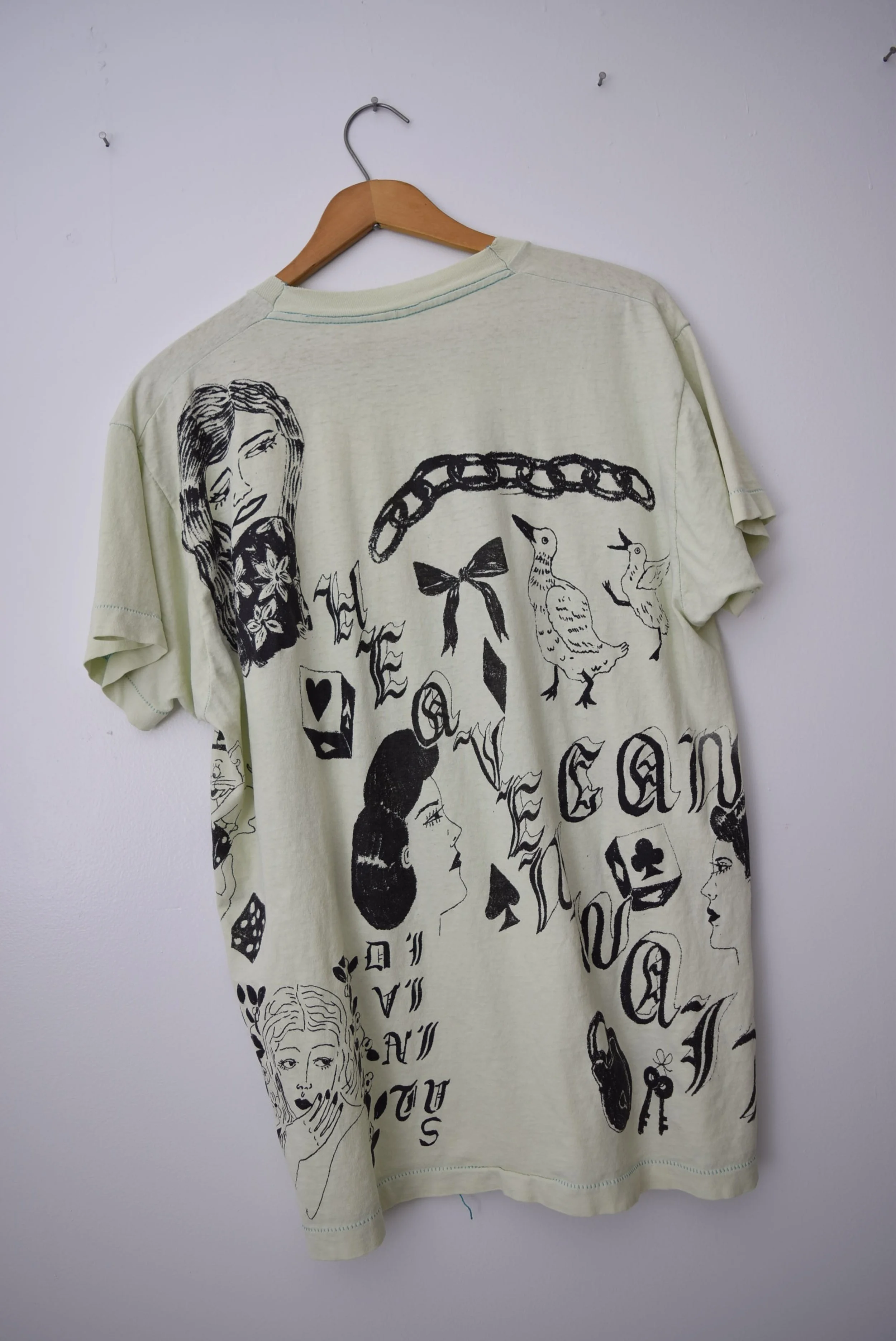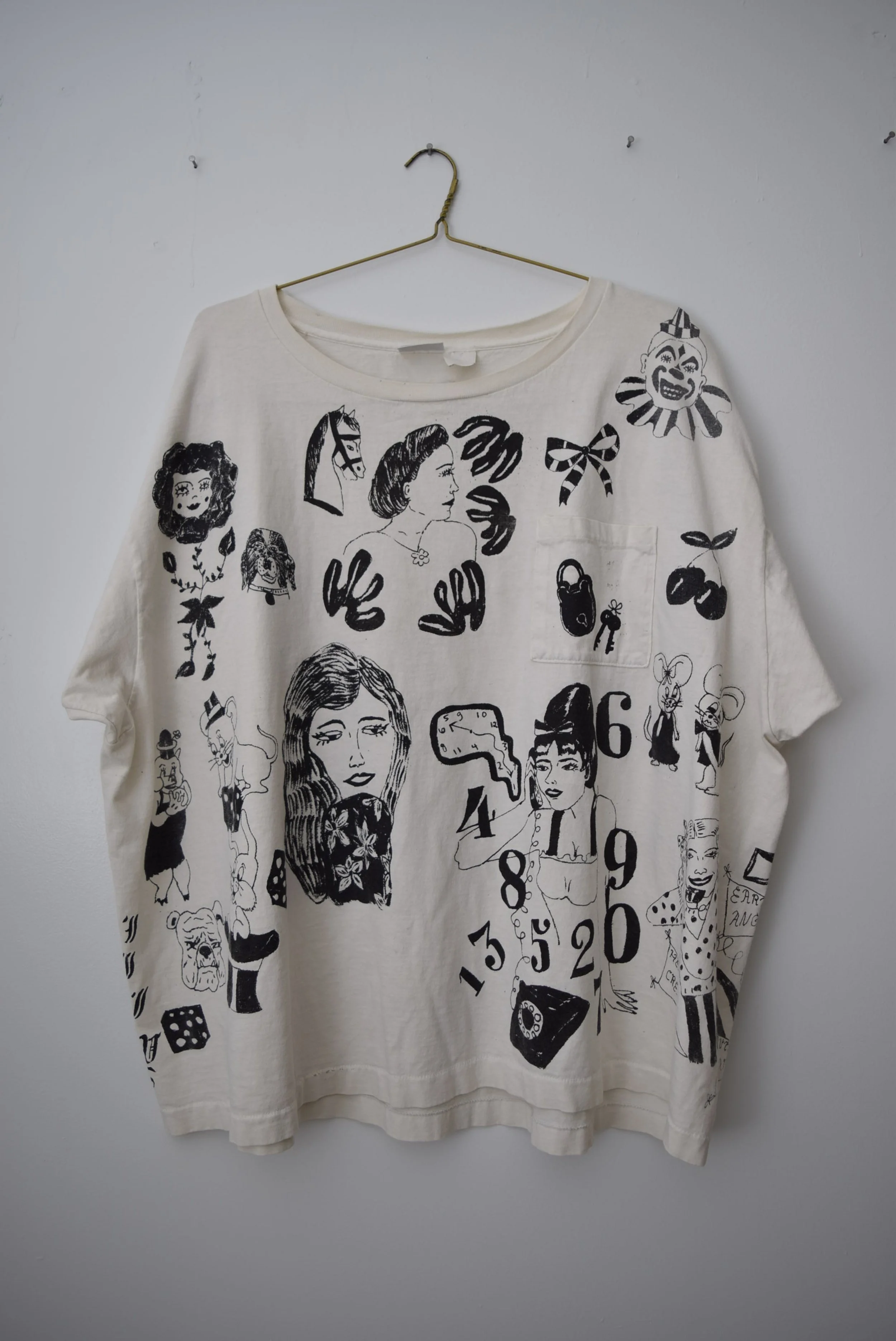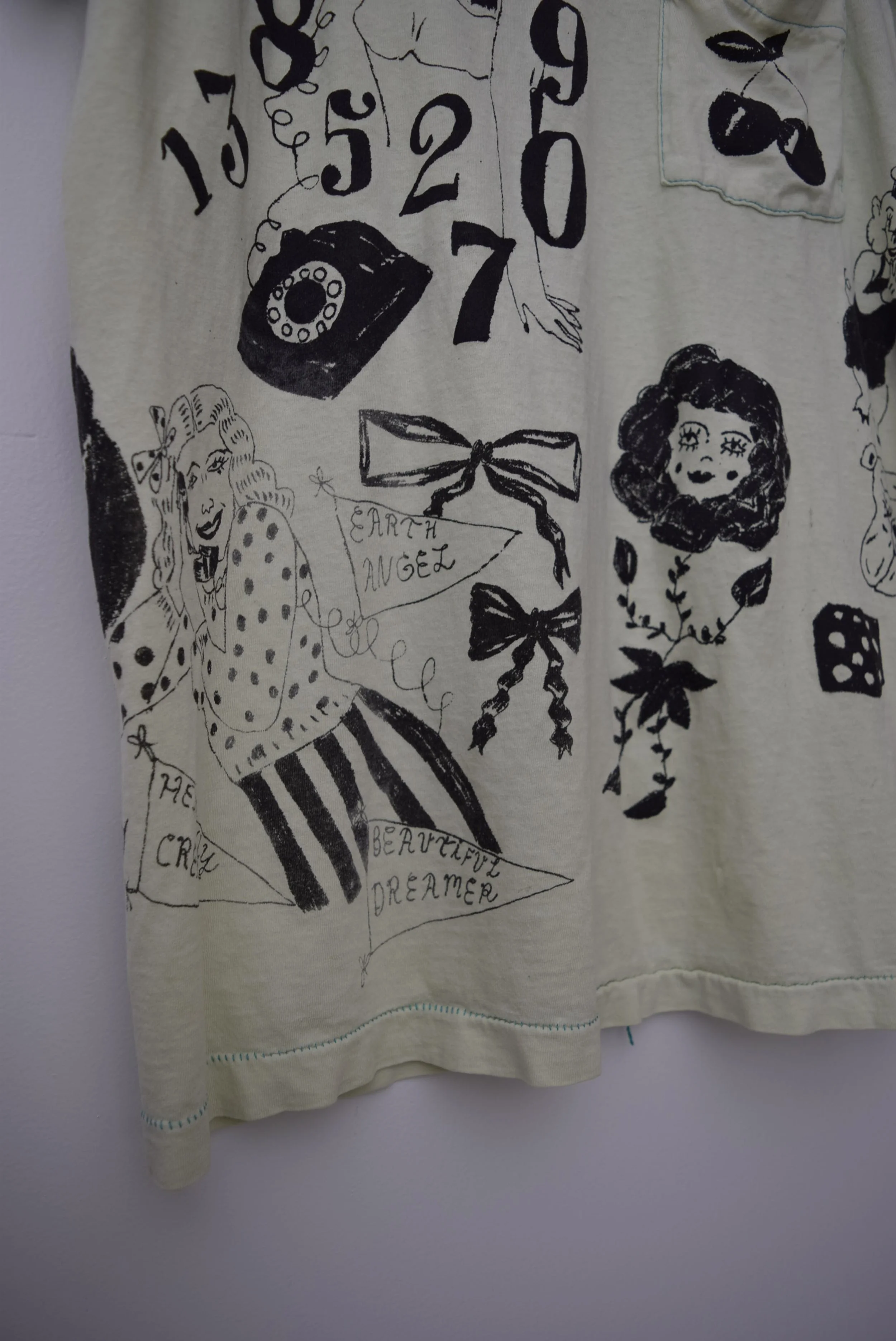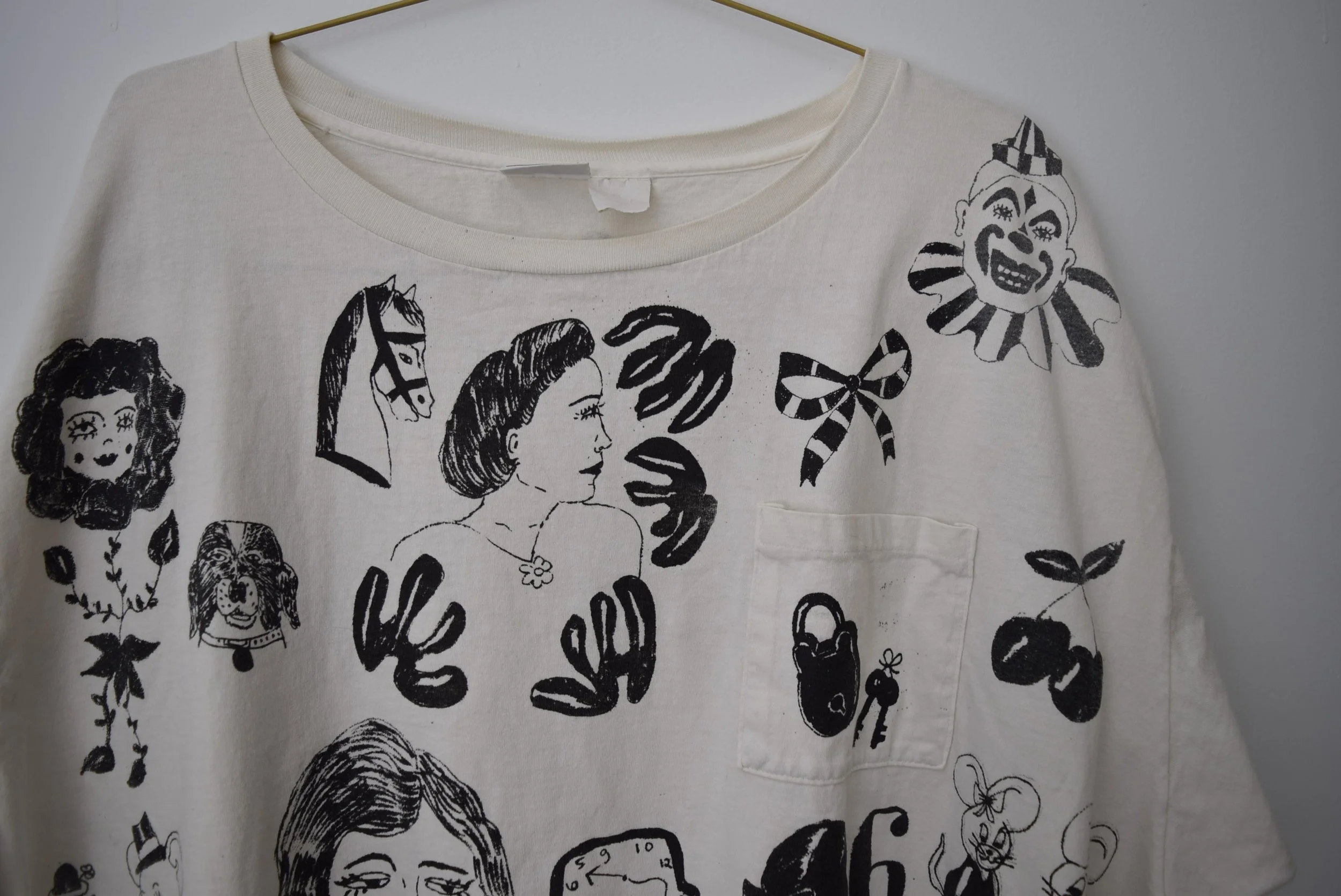 hand drawn + screen printed all over print off white vintage Tee M/L LONG