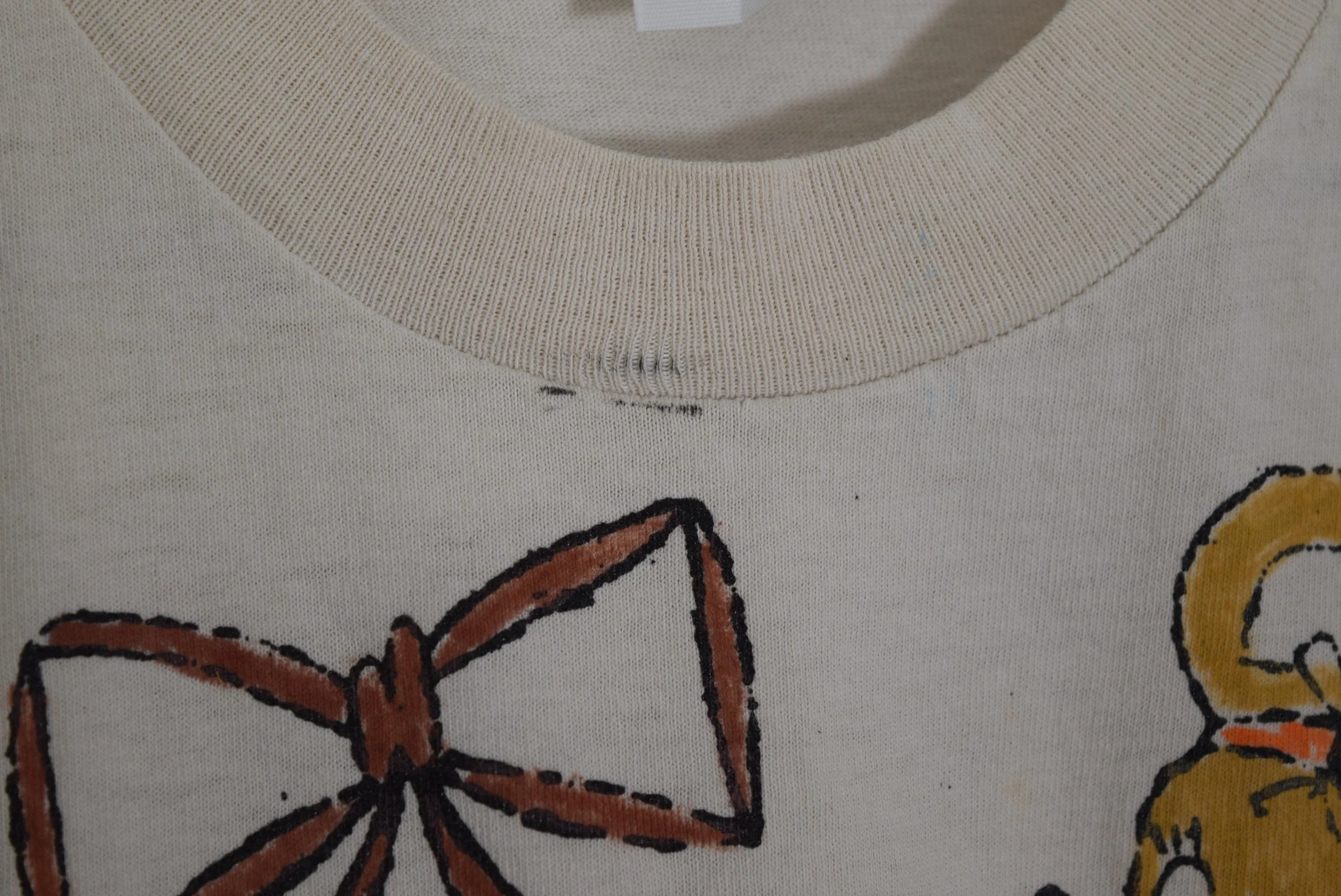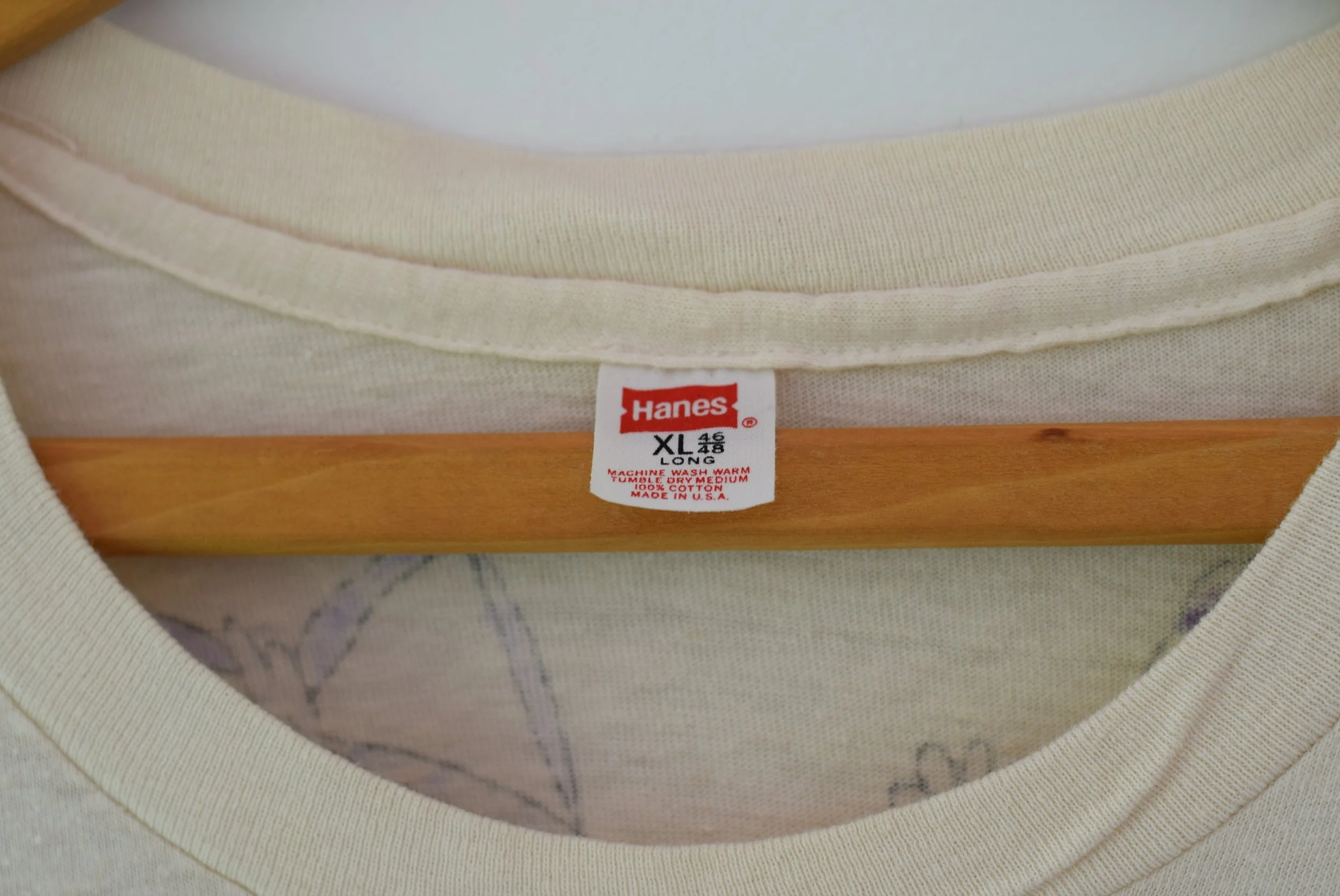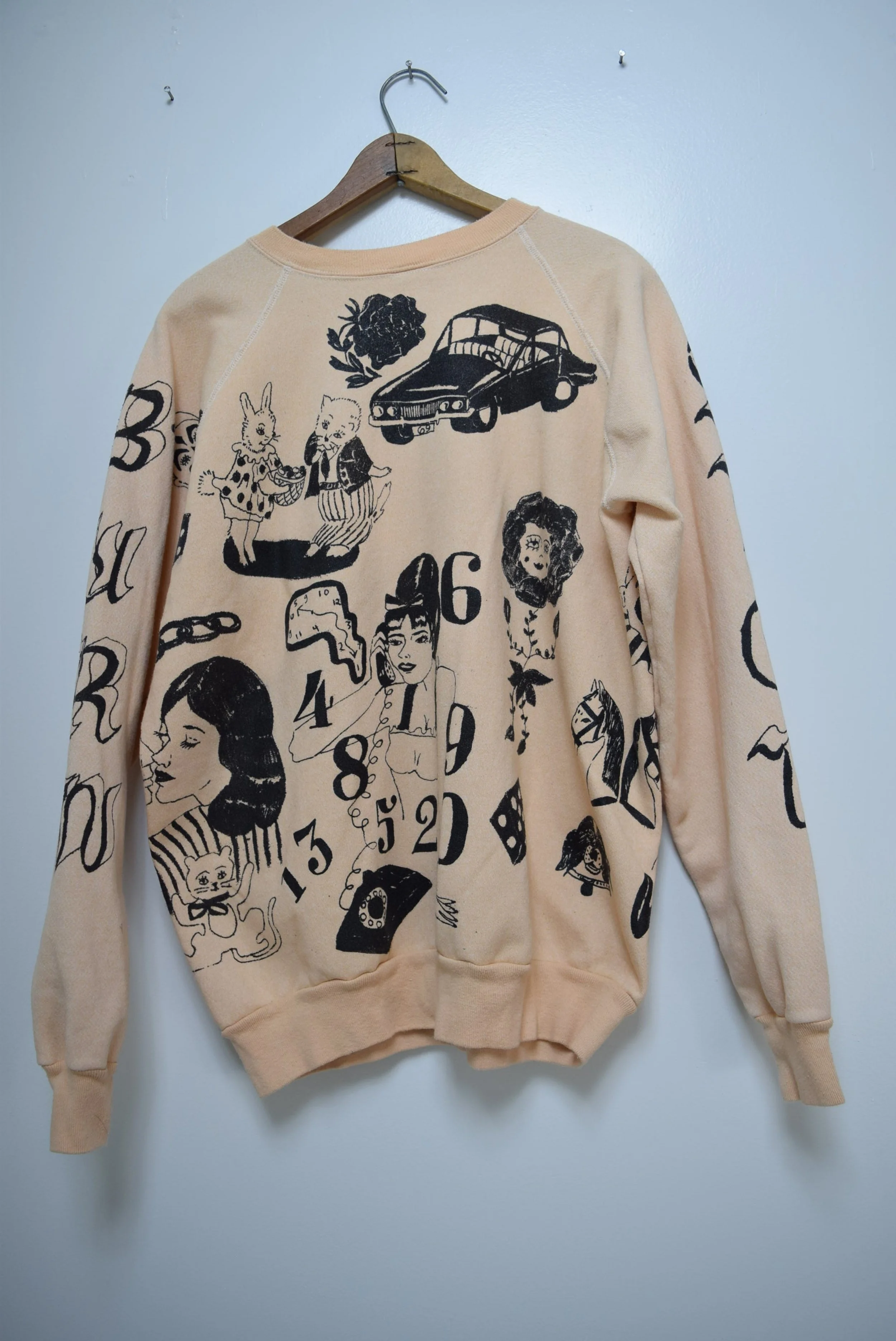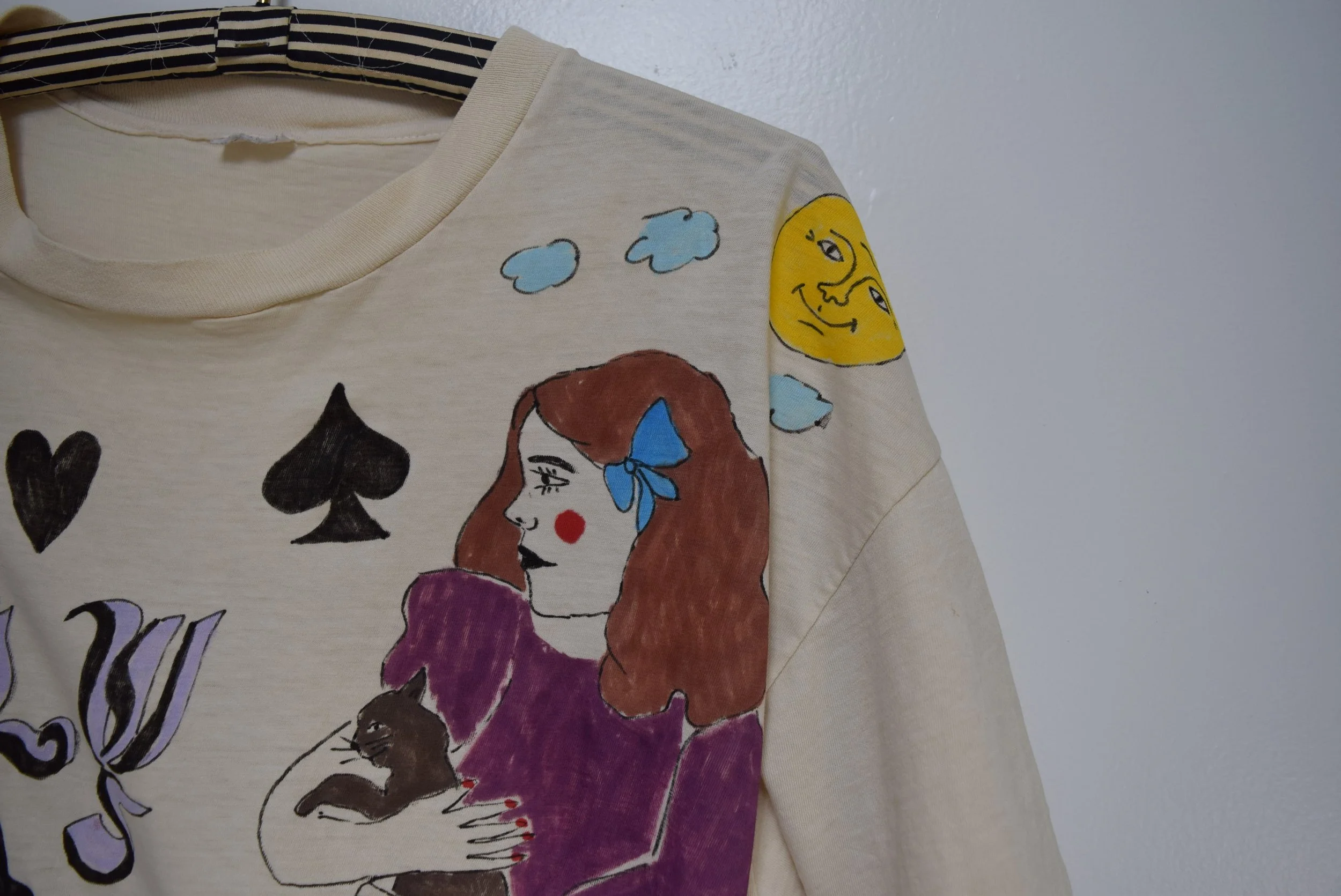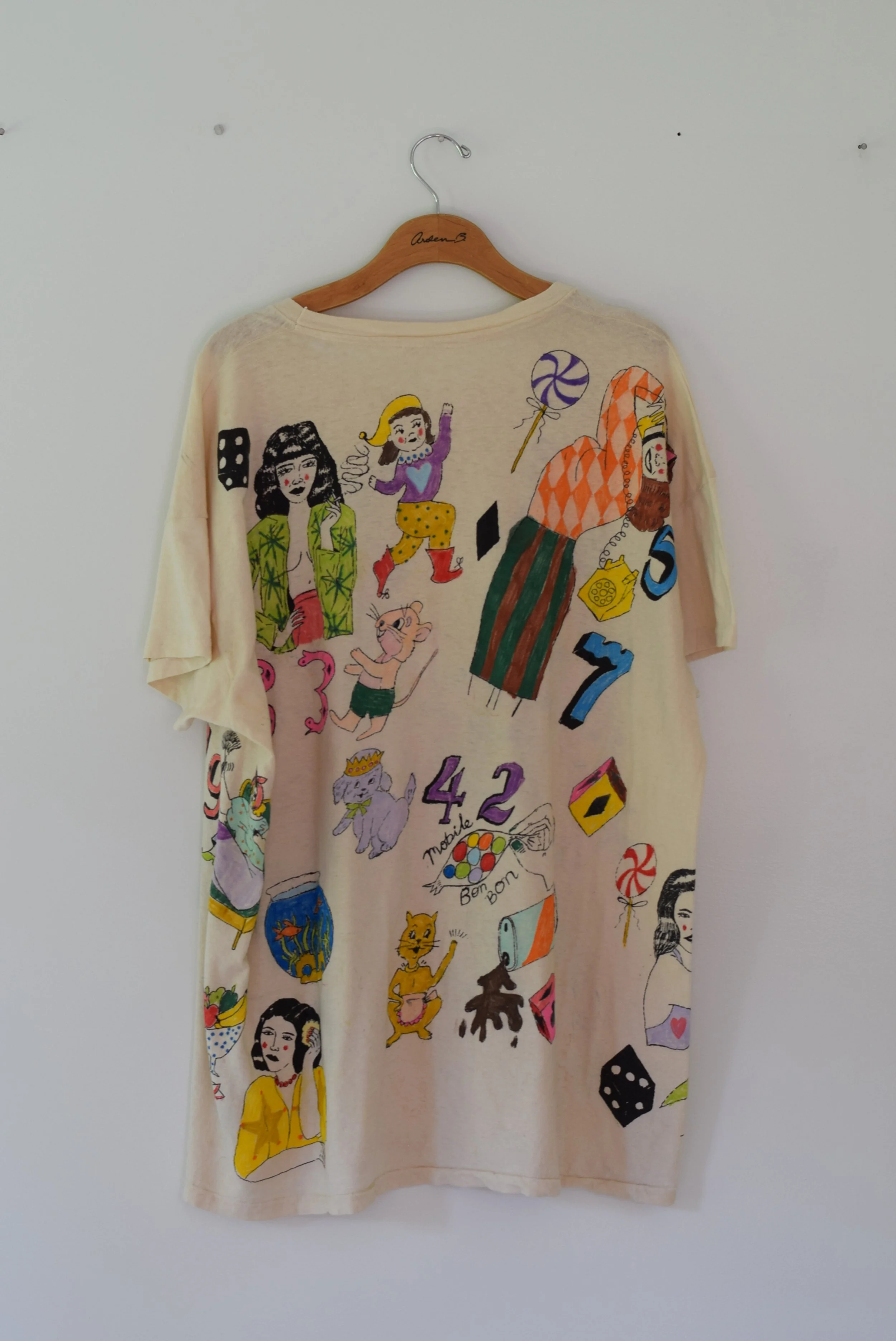 hand drawn + screen printed all over print off white vintage Tee M/L LONG