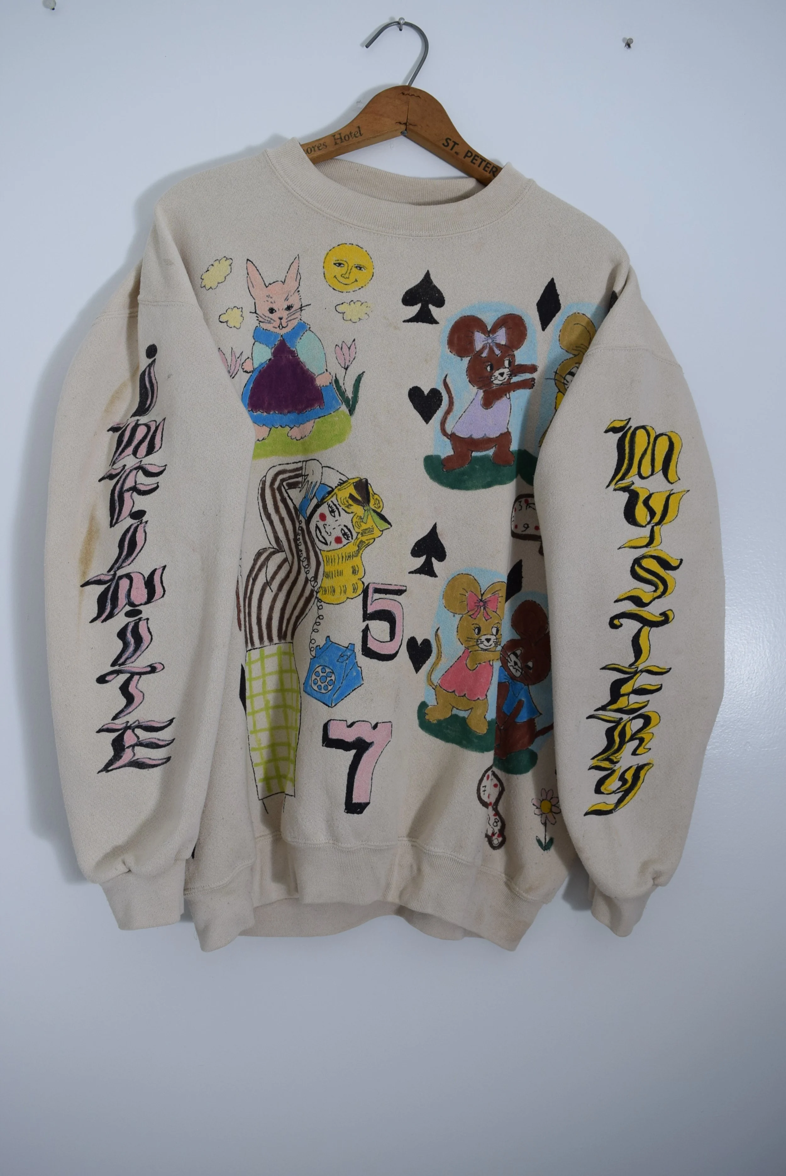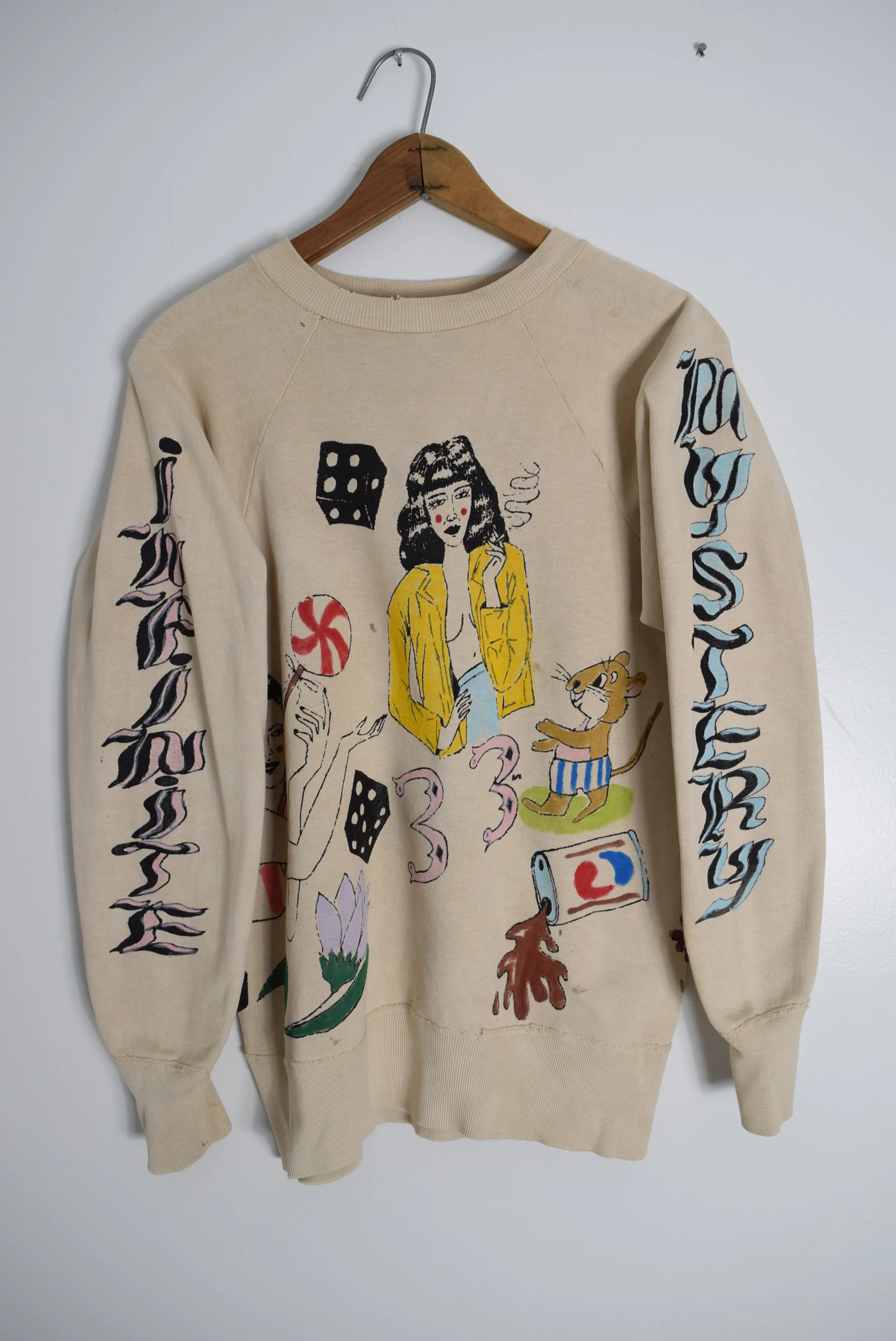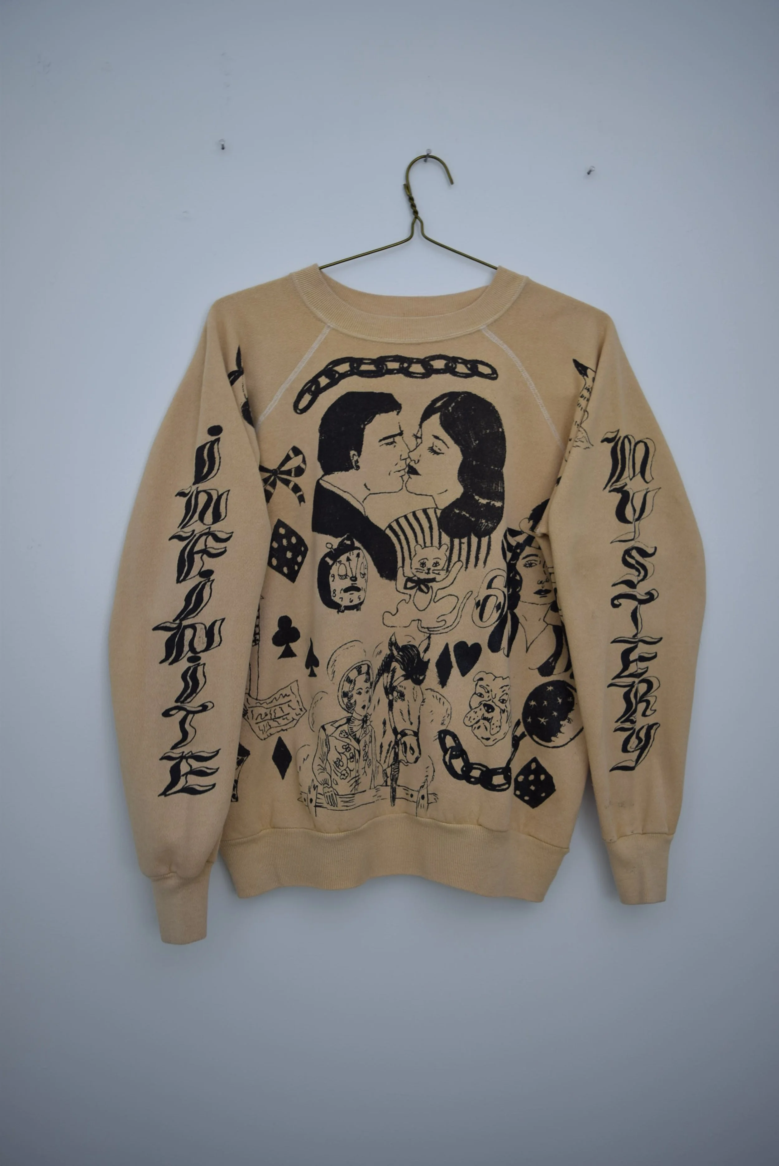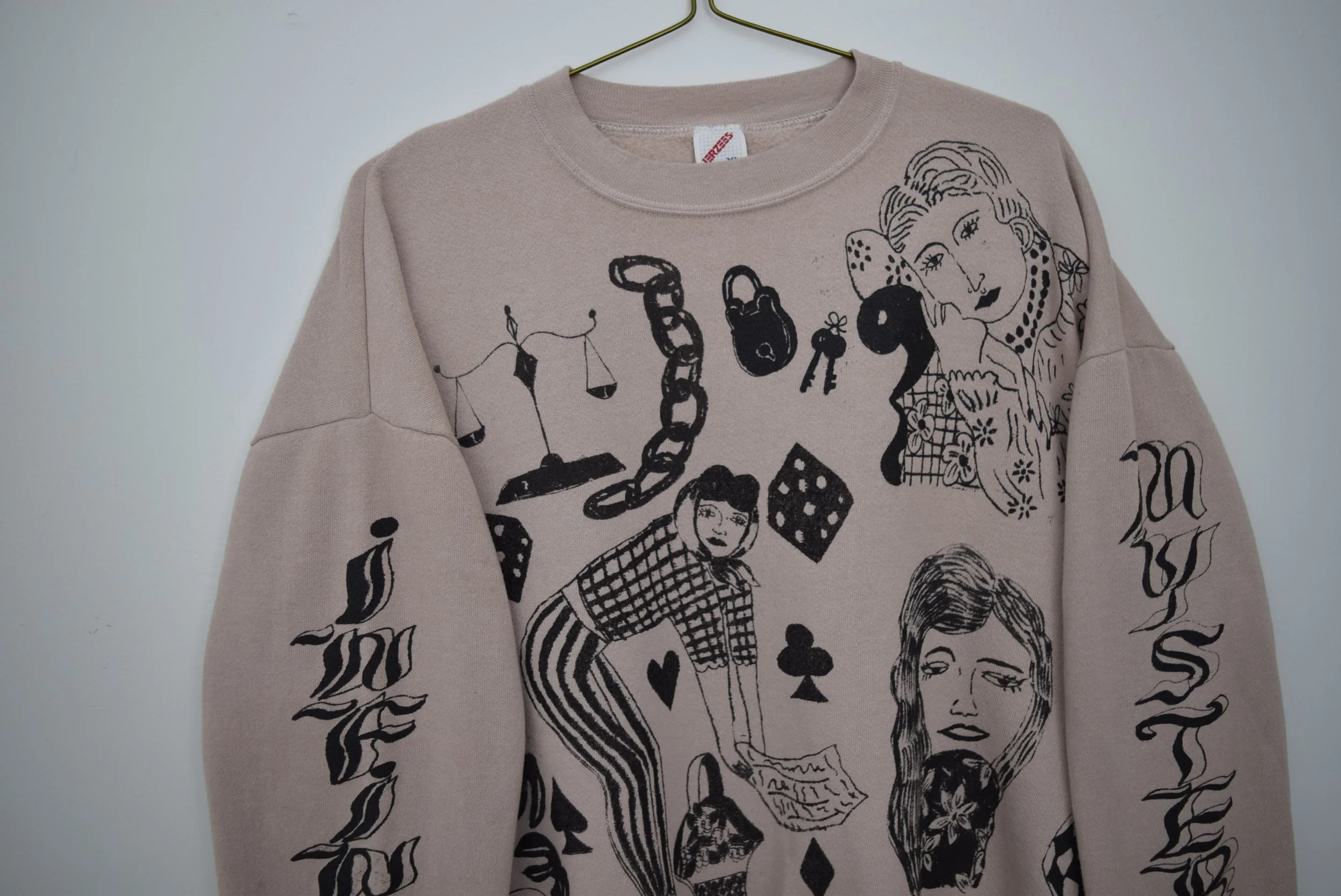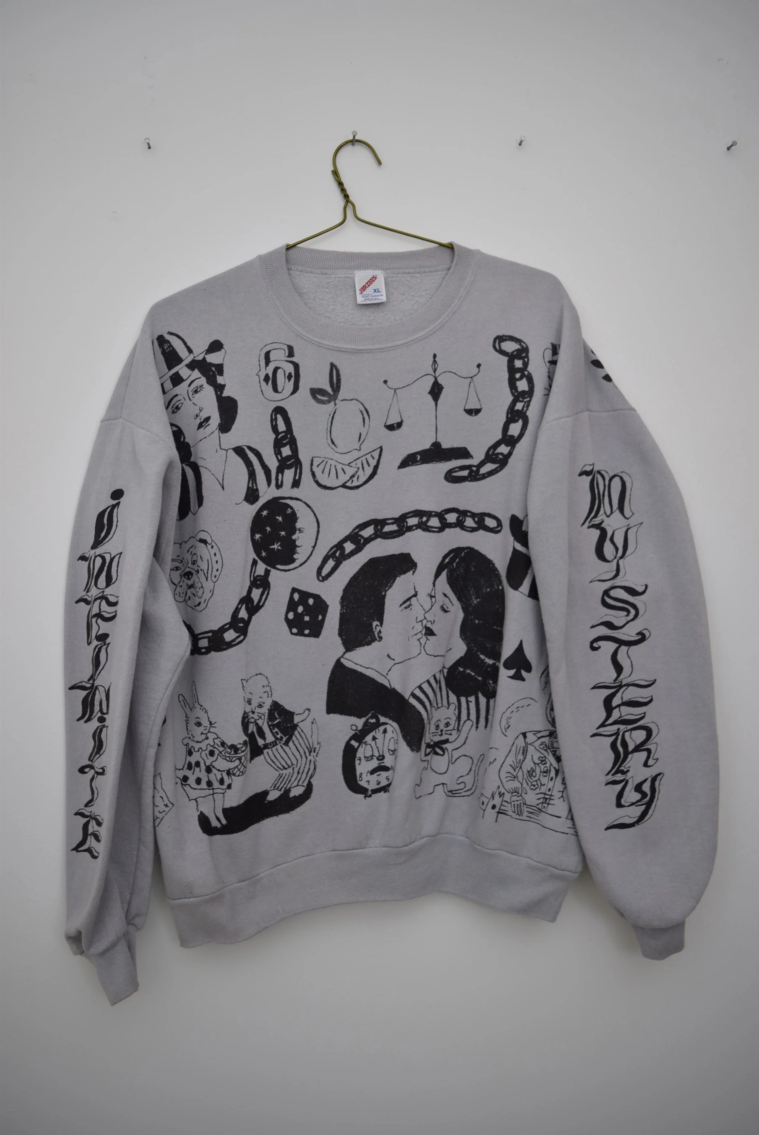 "Infinite Mystery" off white hand drawn + screen printed vintage sweatshirt L