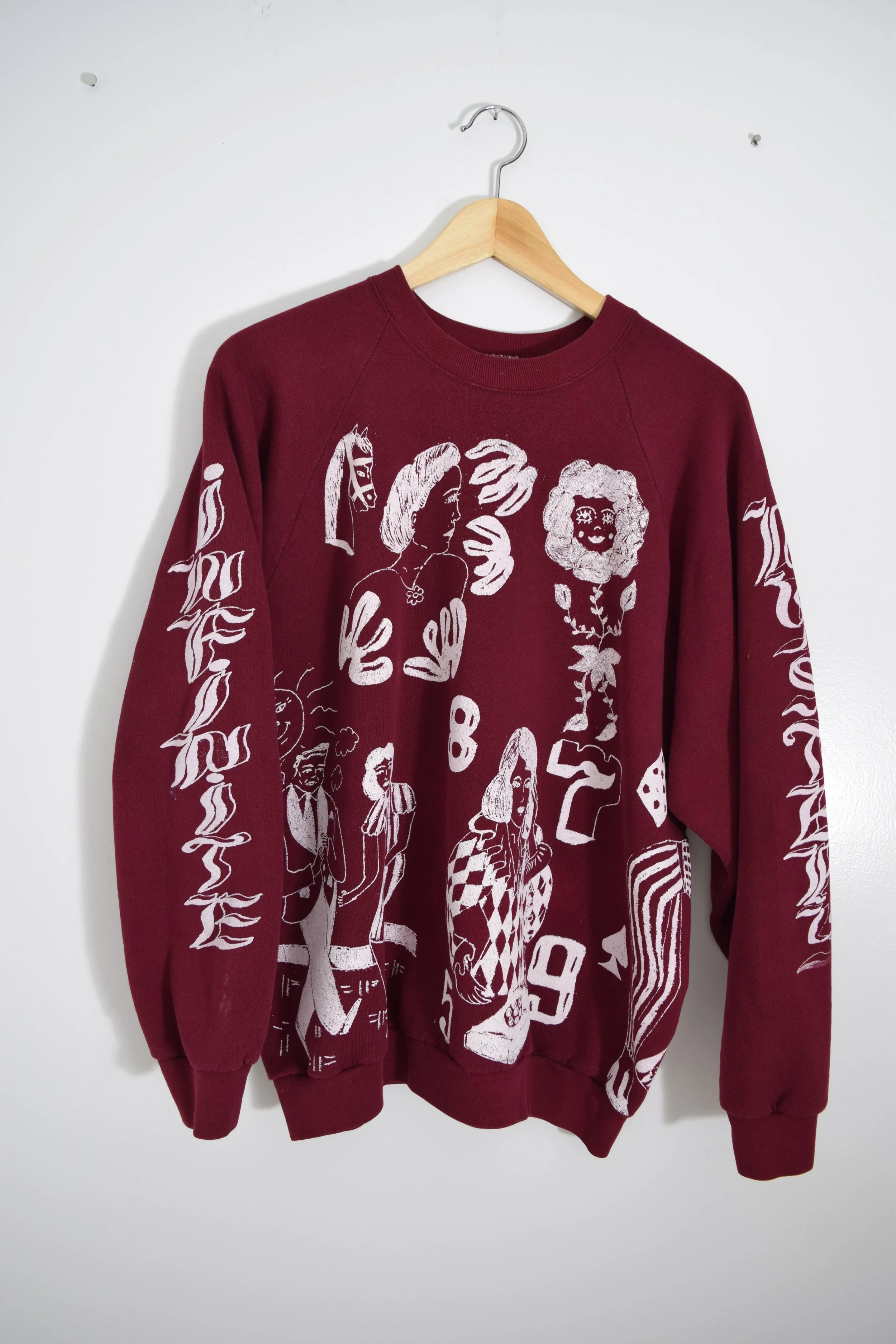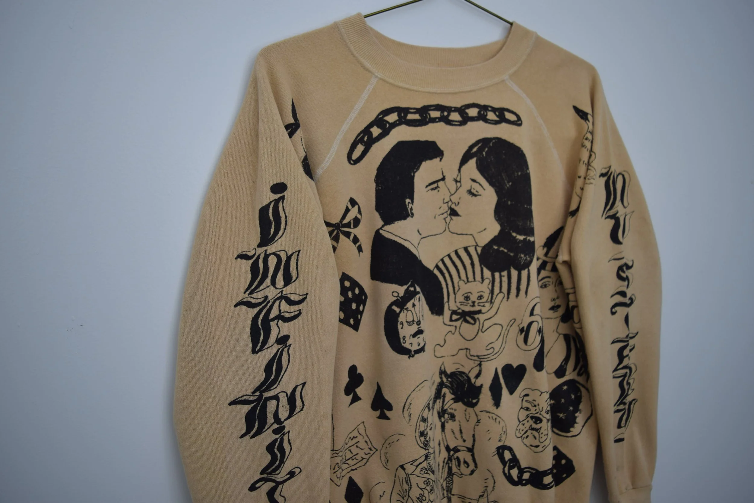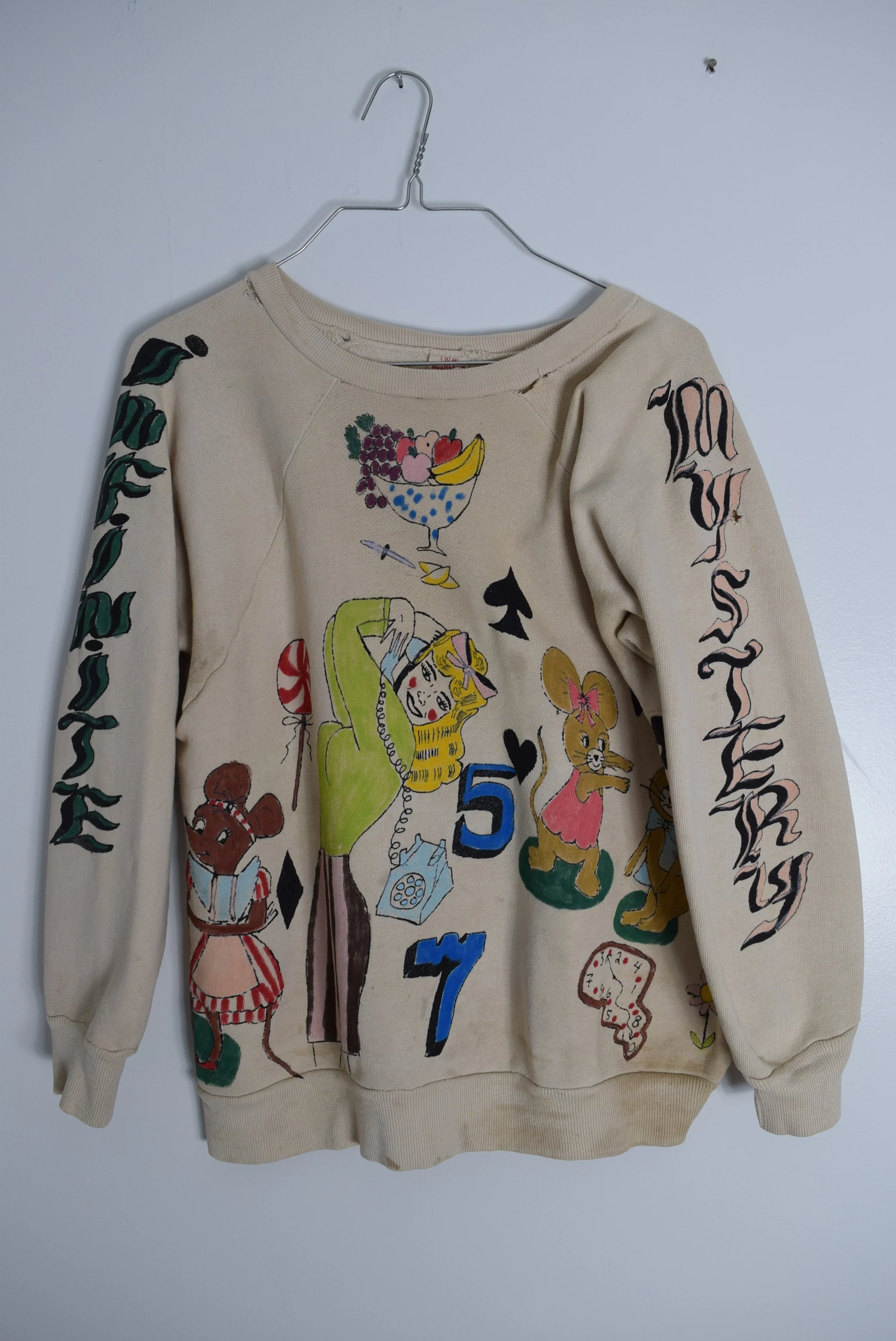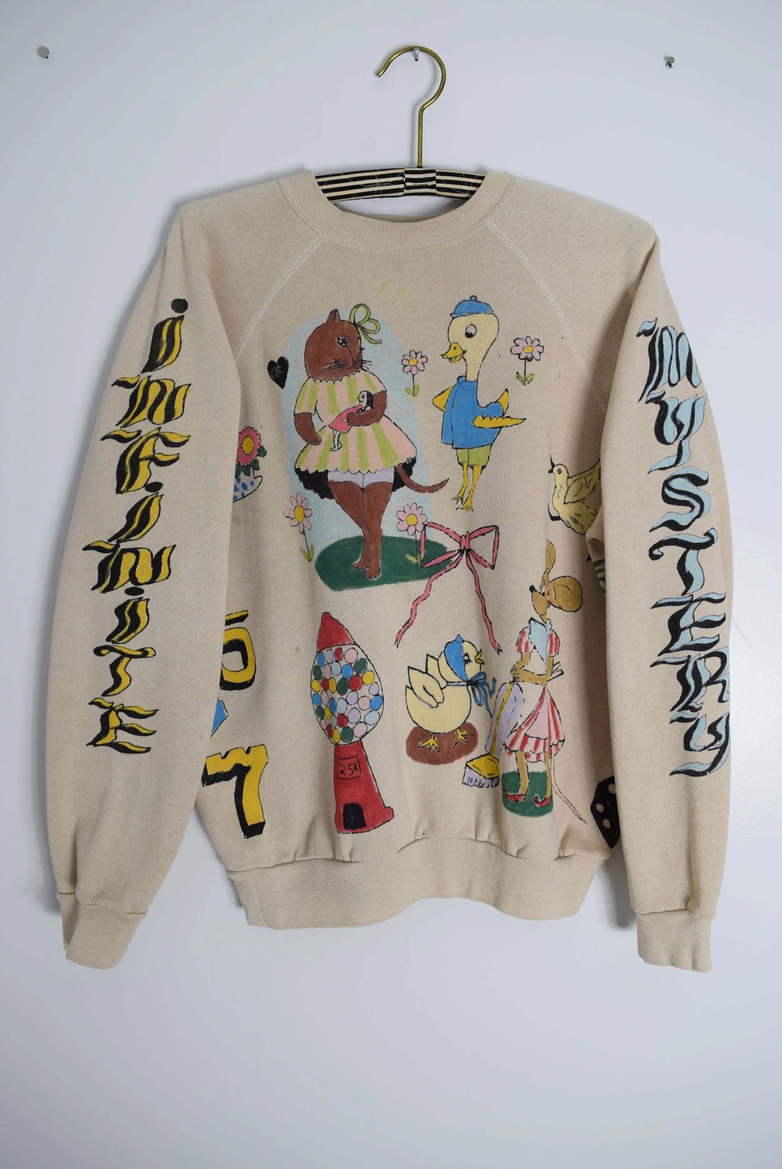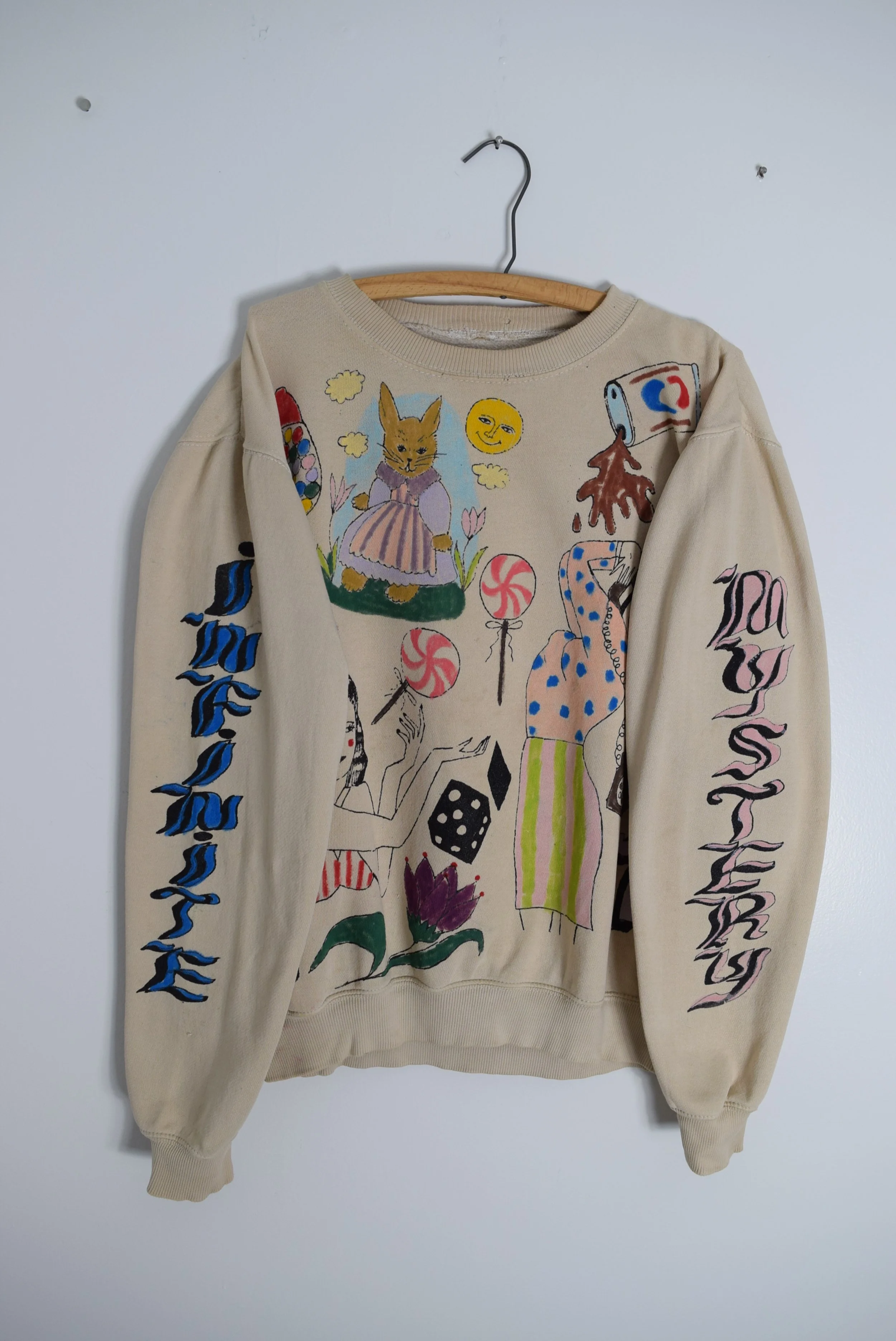 "Infinite Mystery" off white hand drawn + screen printed vintage sweatshirt L