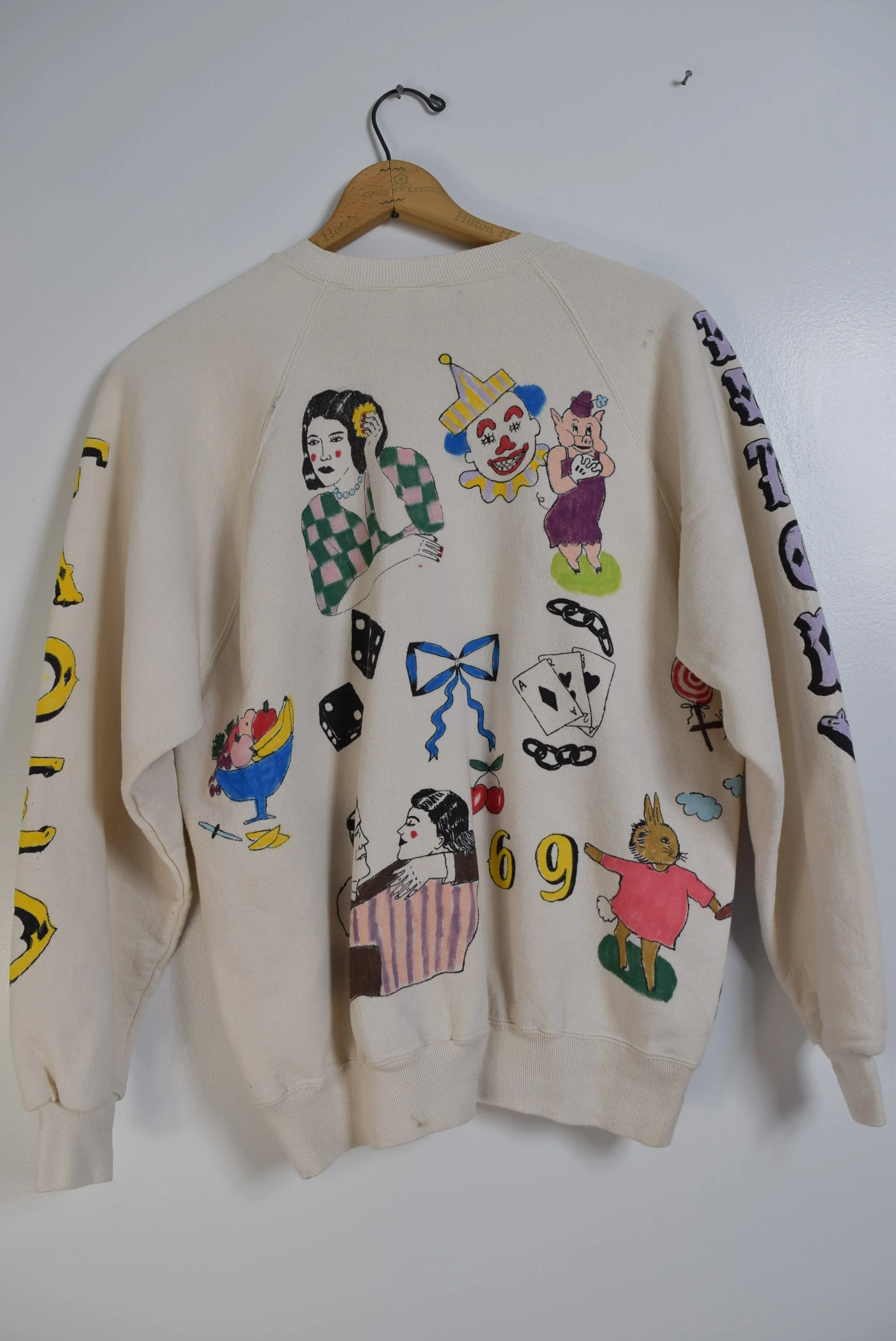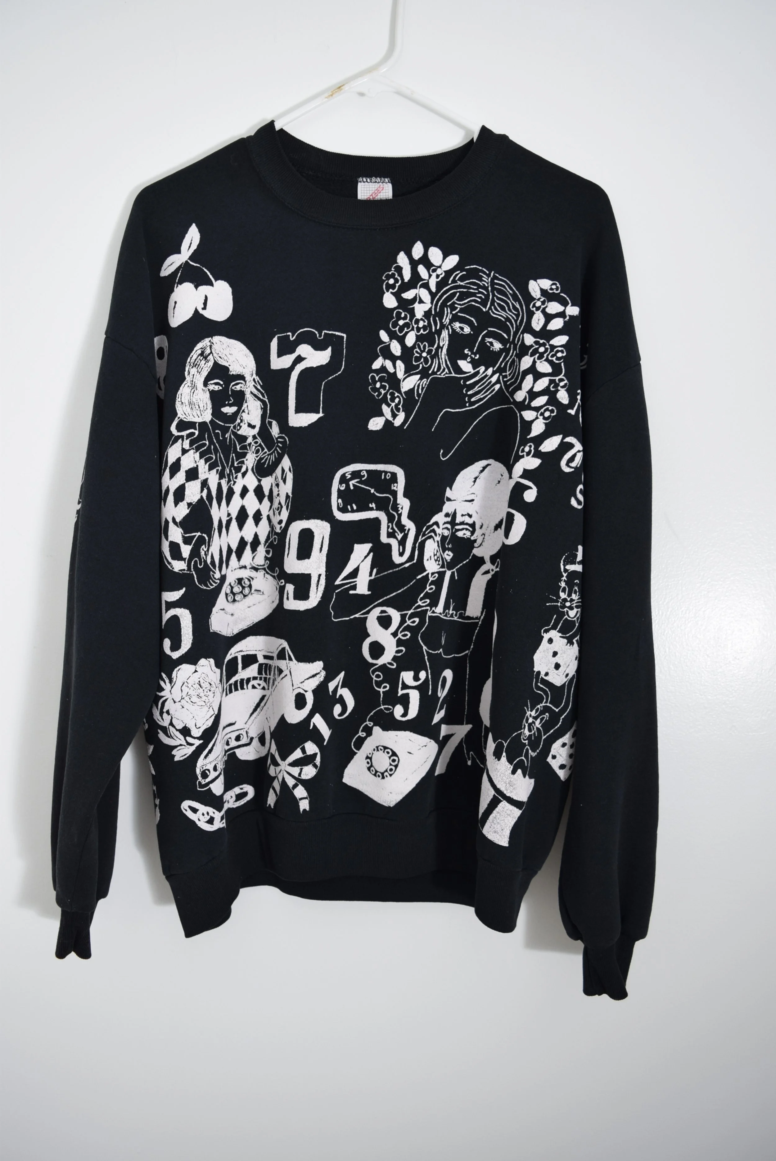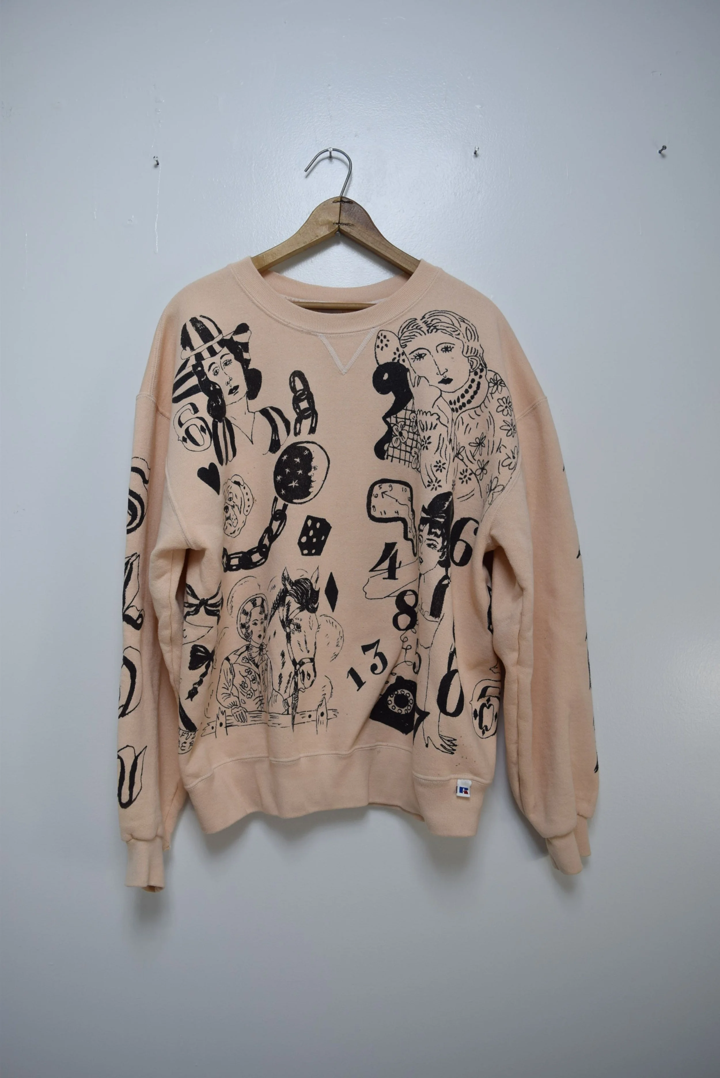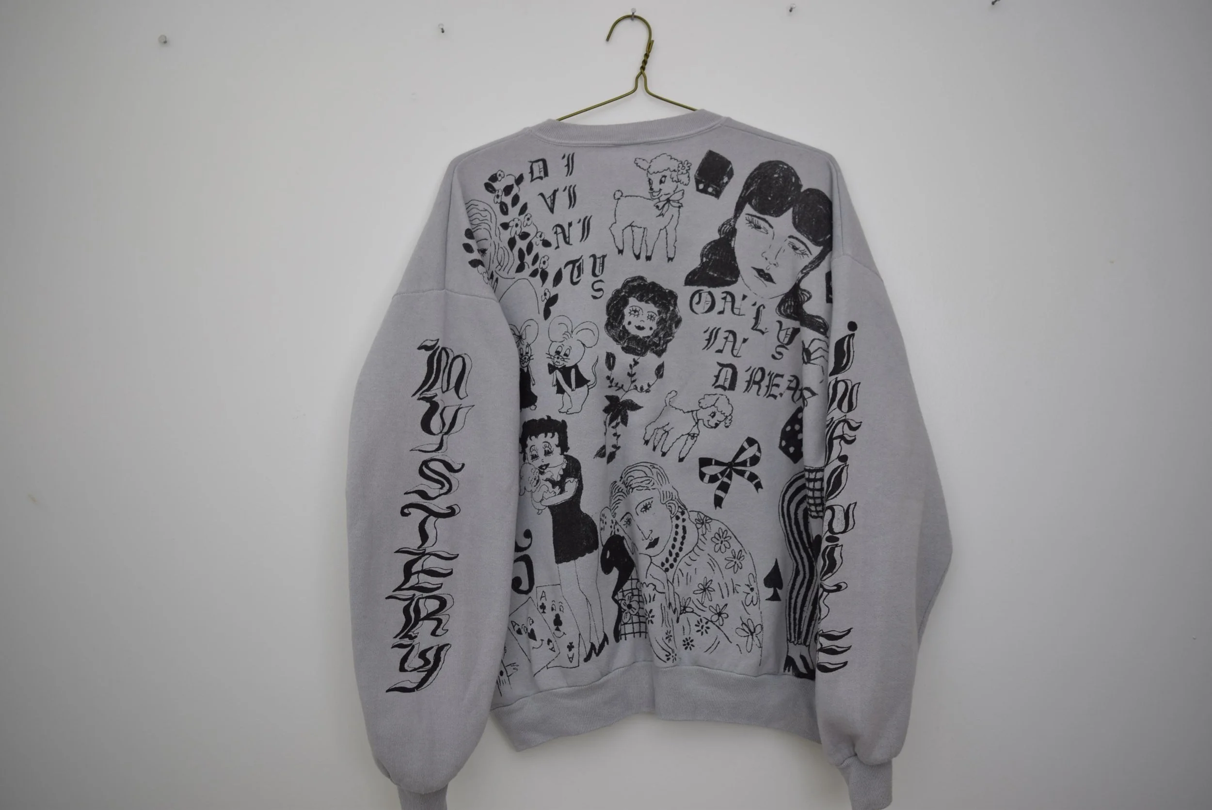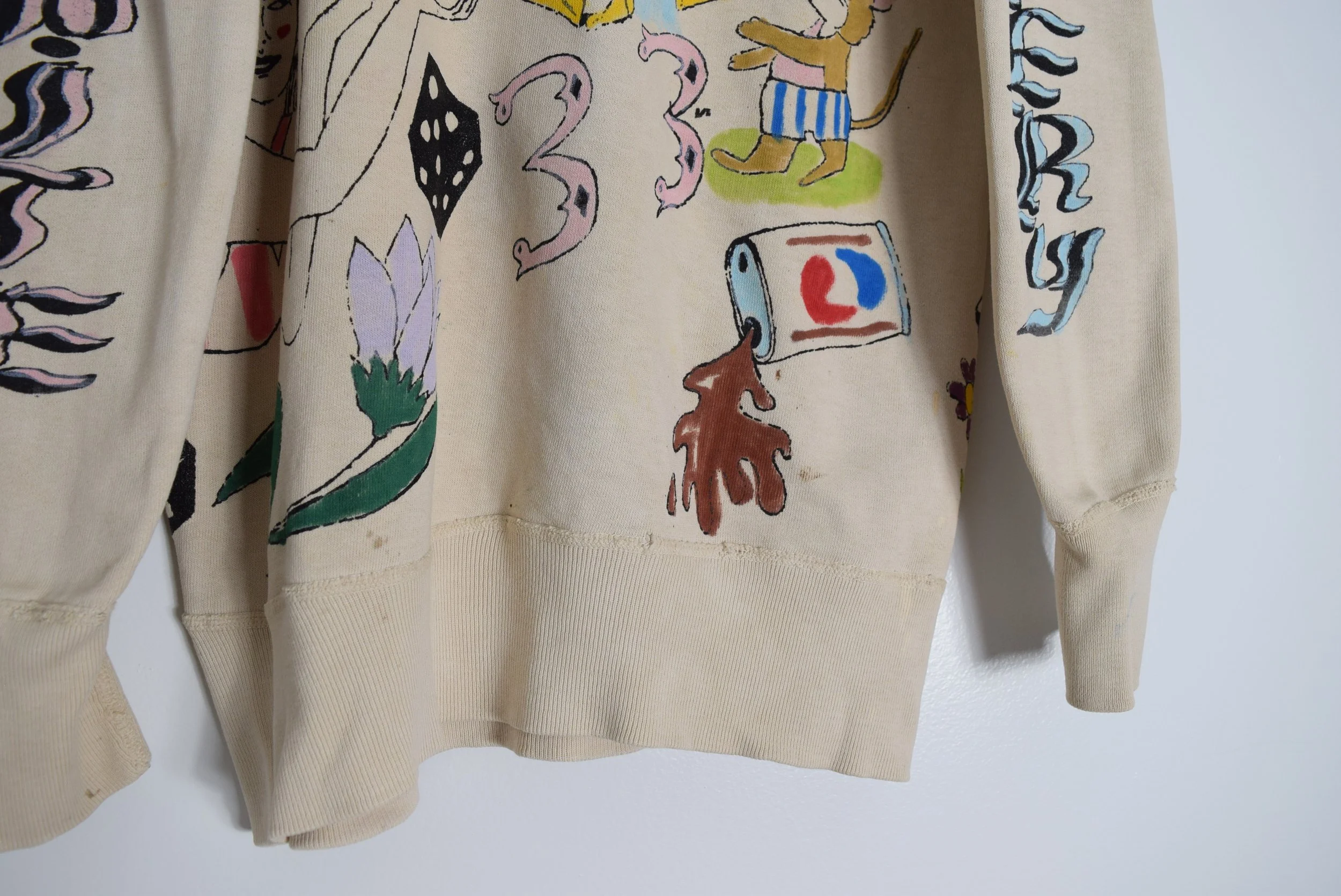 "Infinite Mystery" off white hand drawn + screen printed vintage sweatshirt L