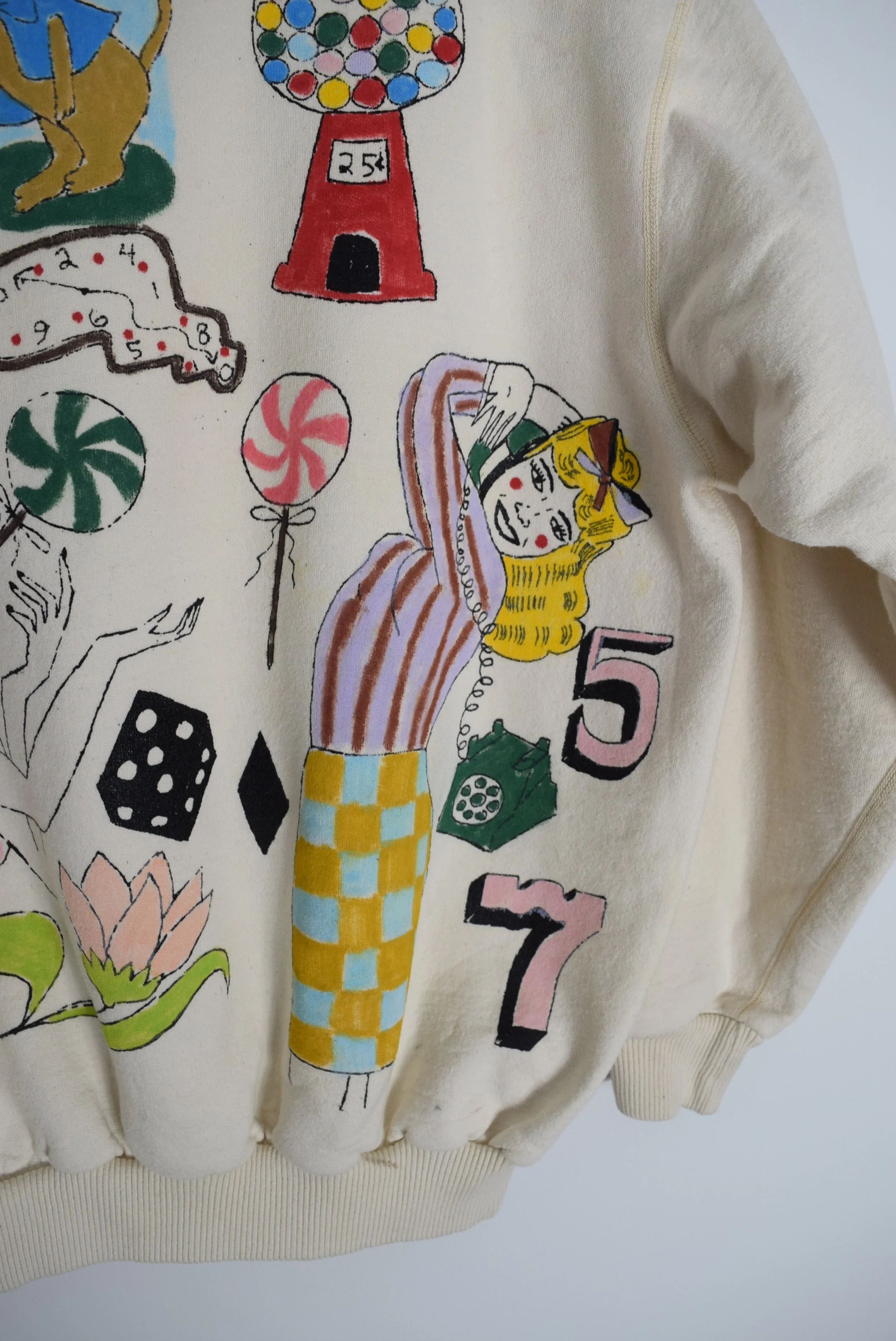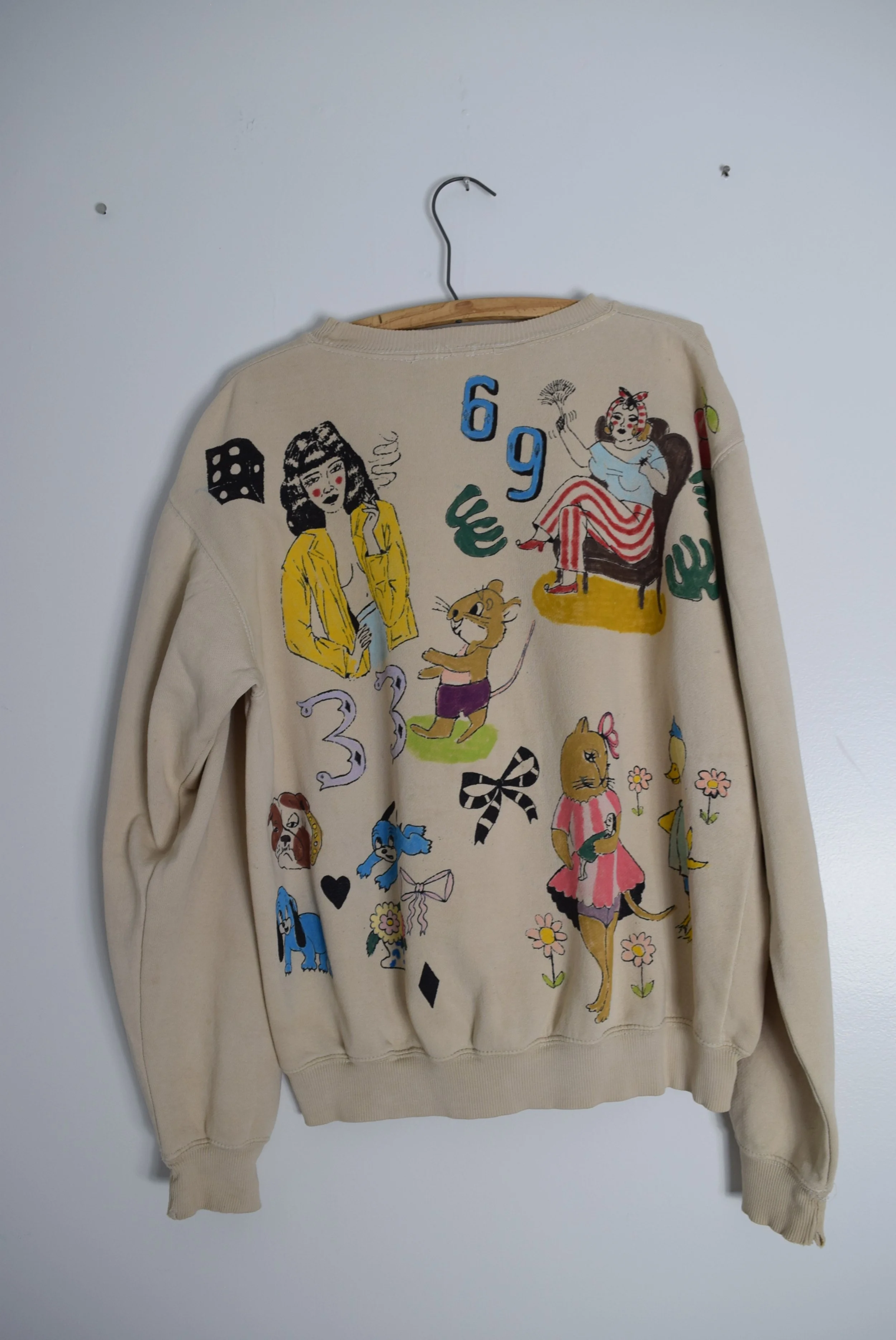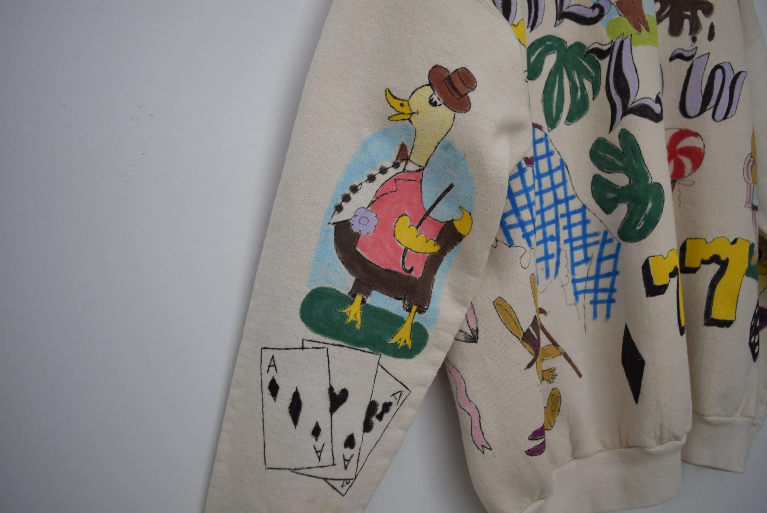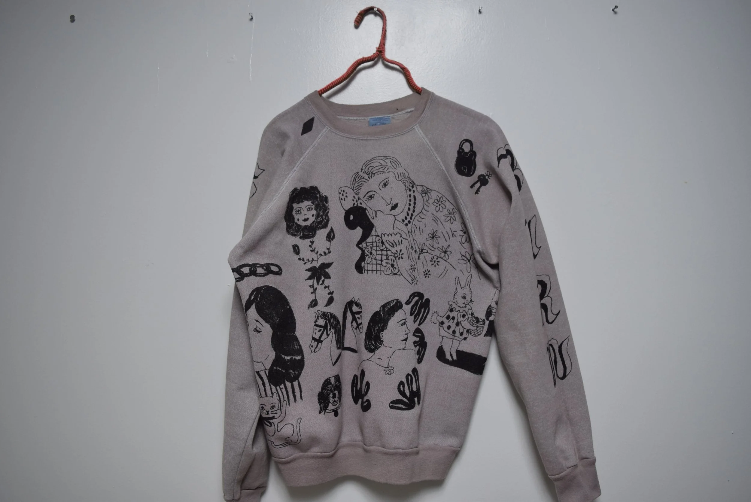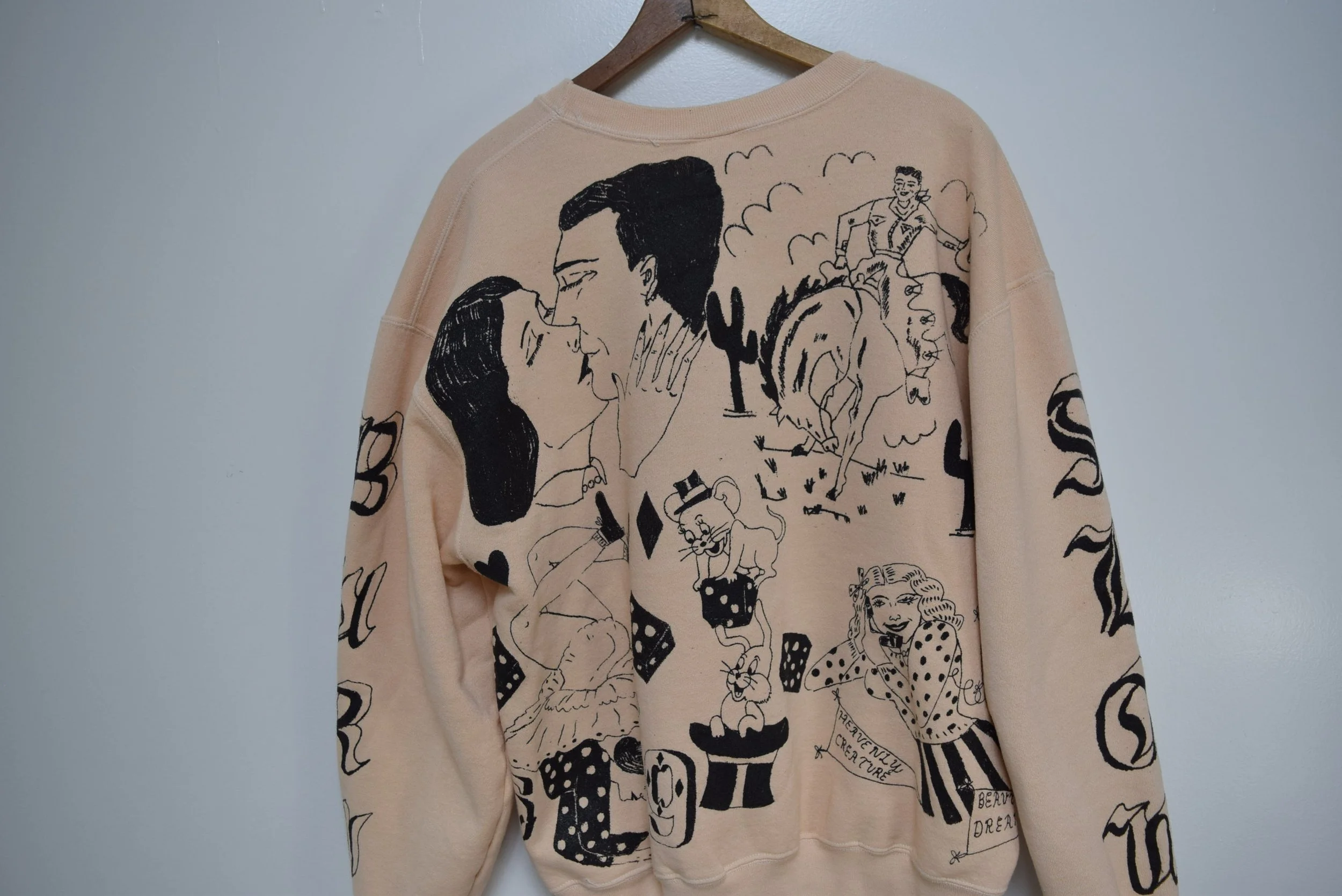 "Infinite Mystery" off white hand drawn + screen printed vintage sweatshirt L