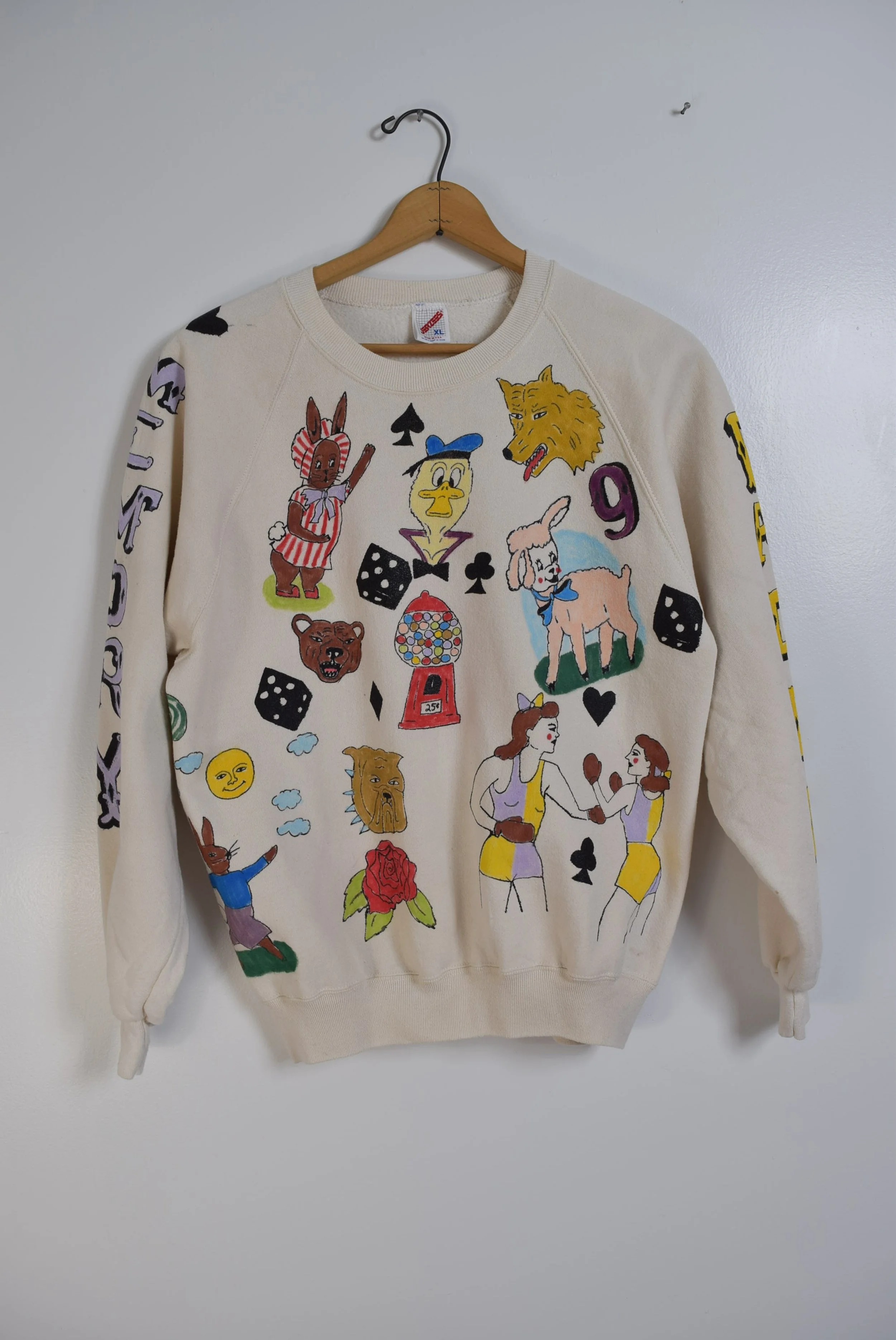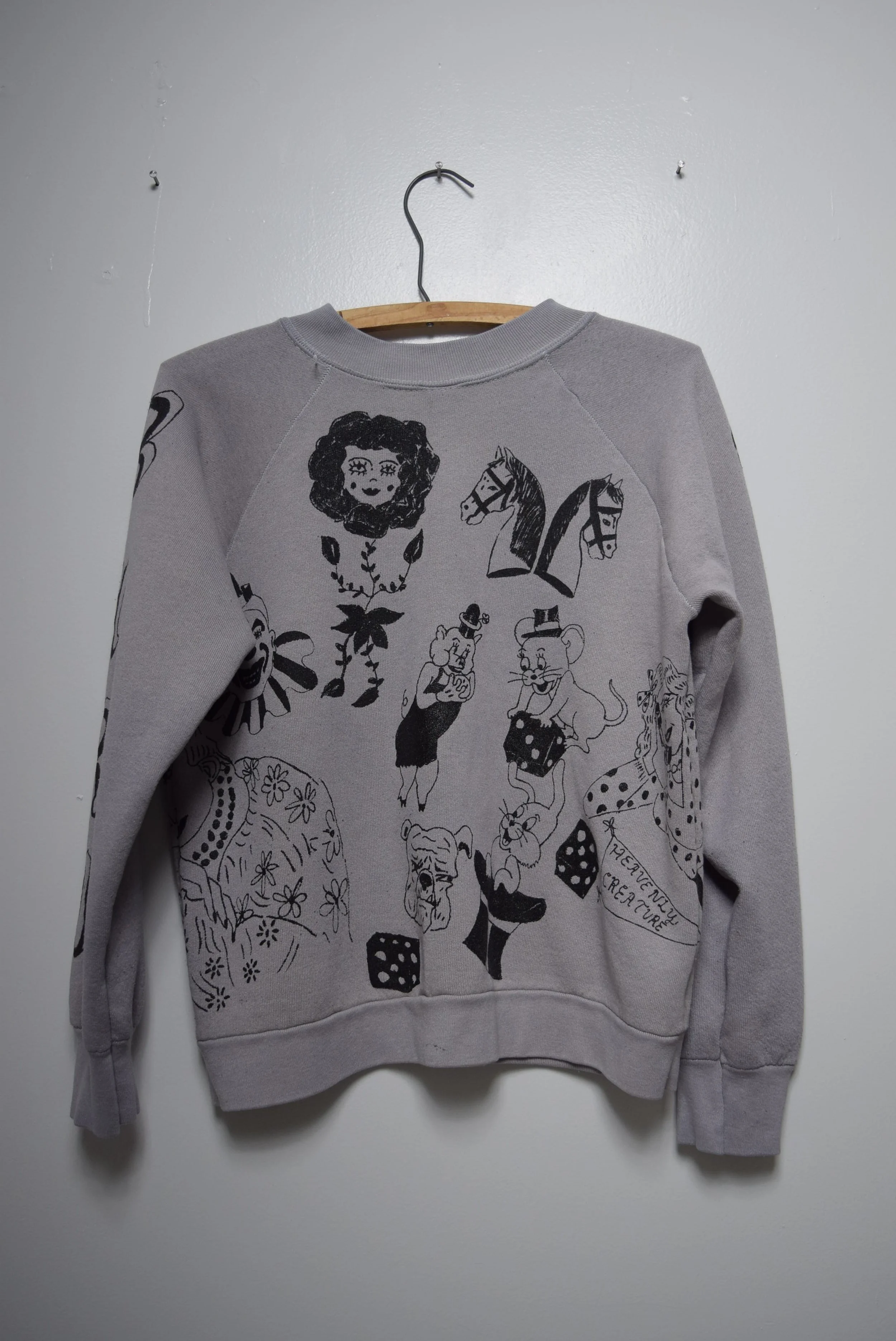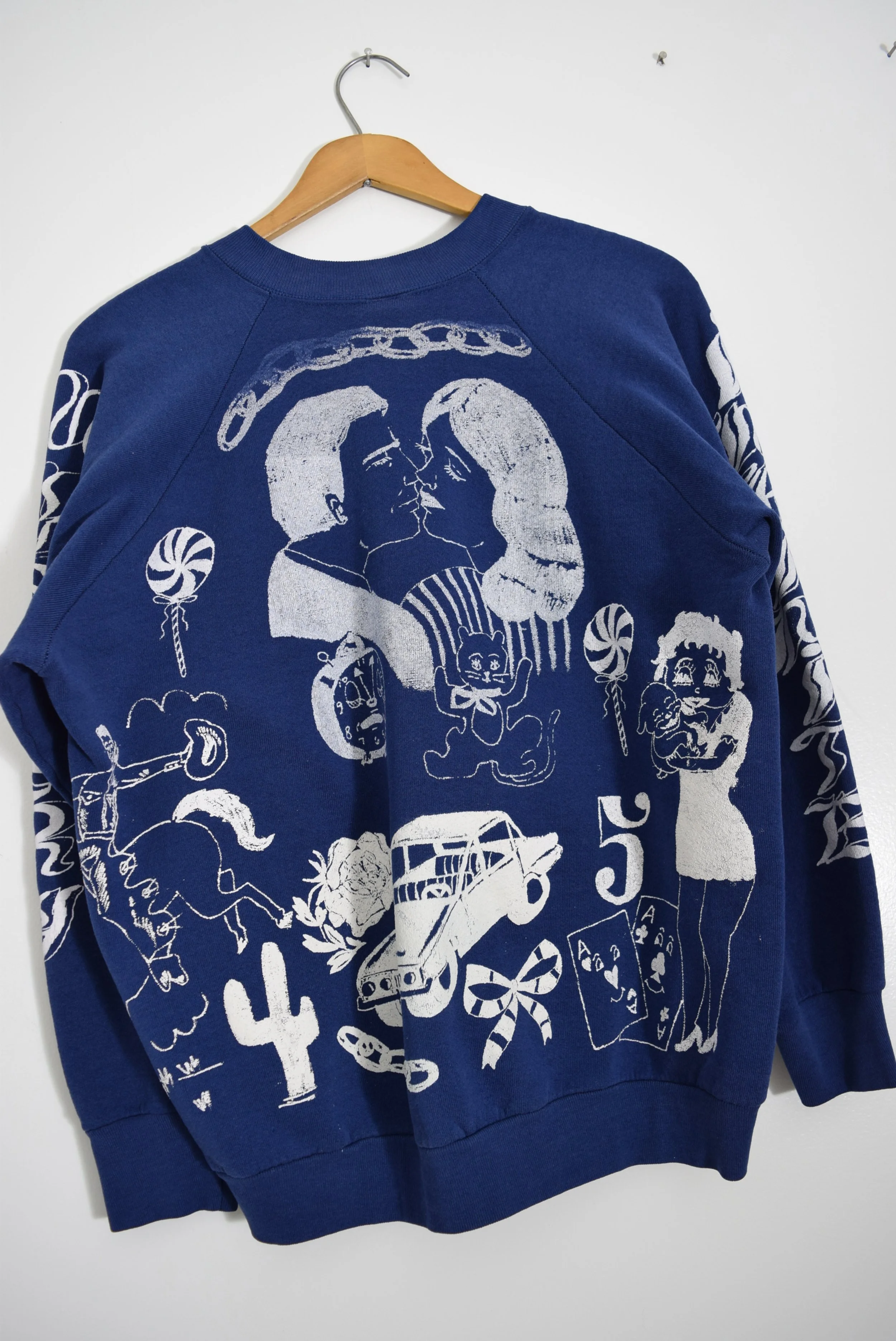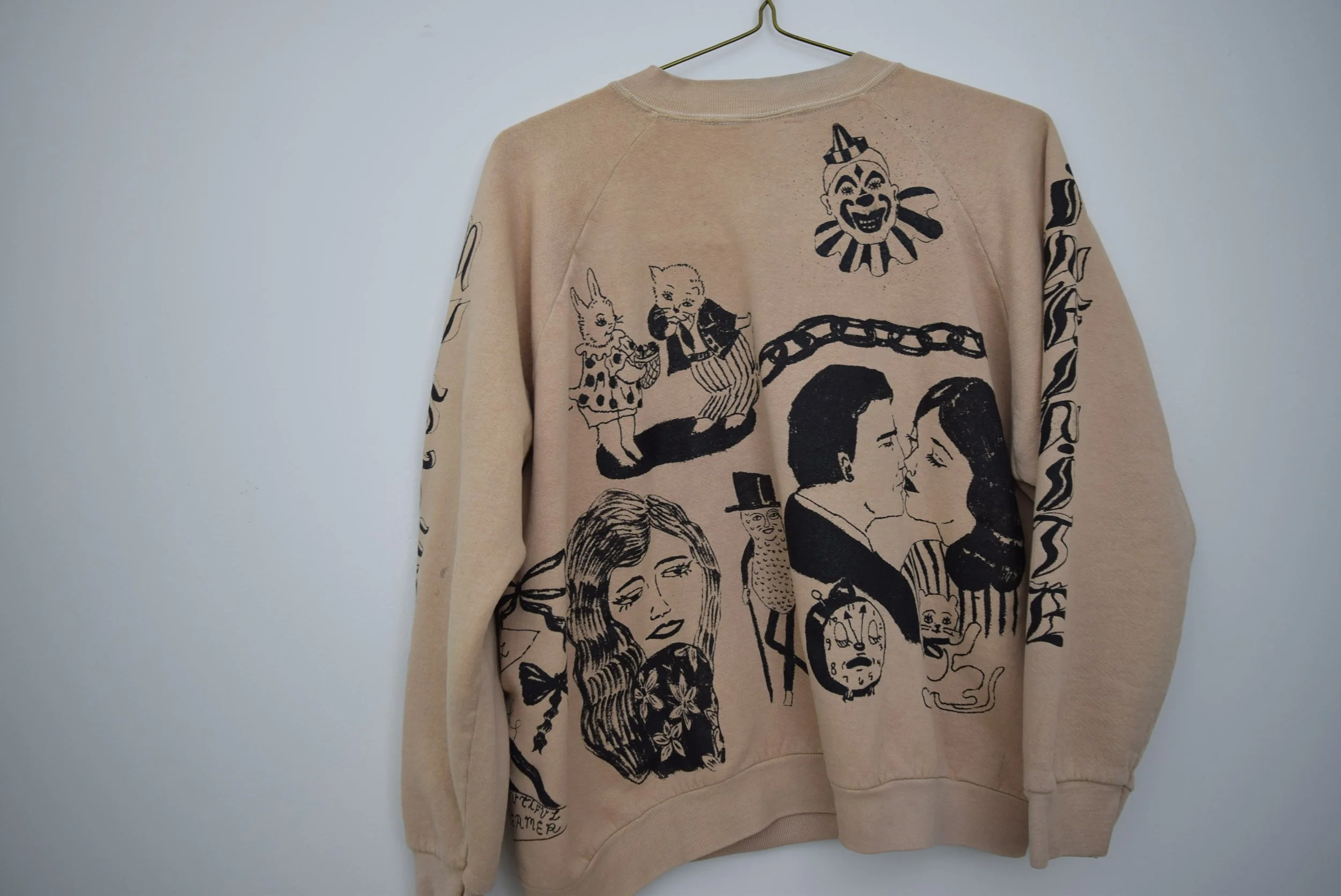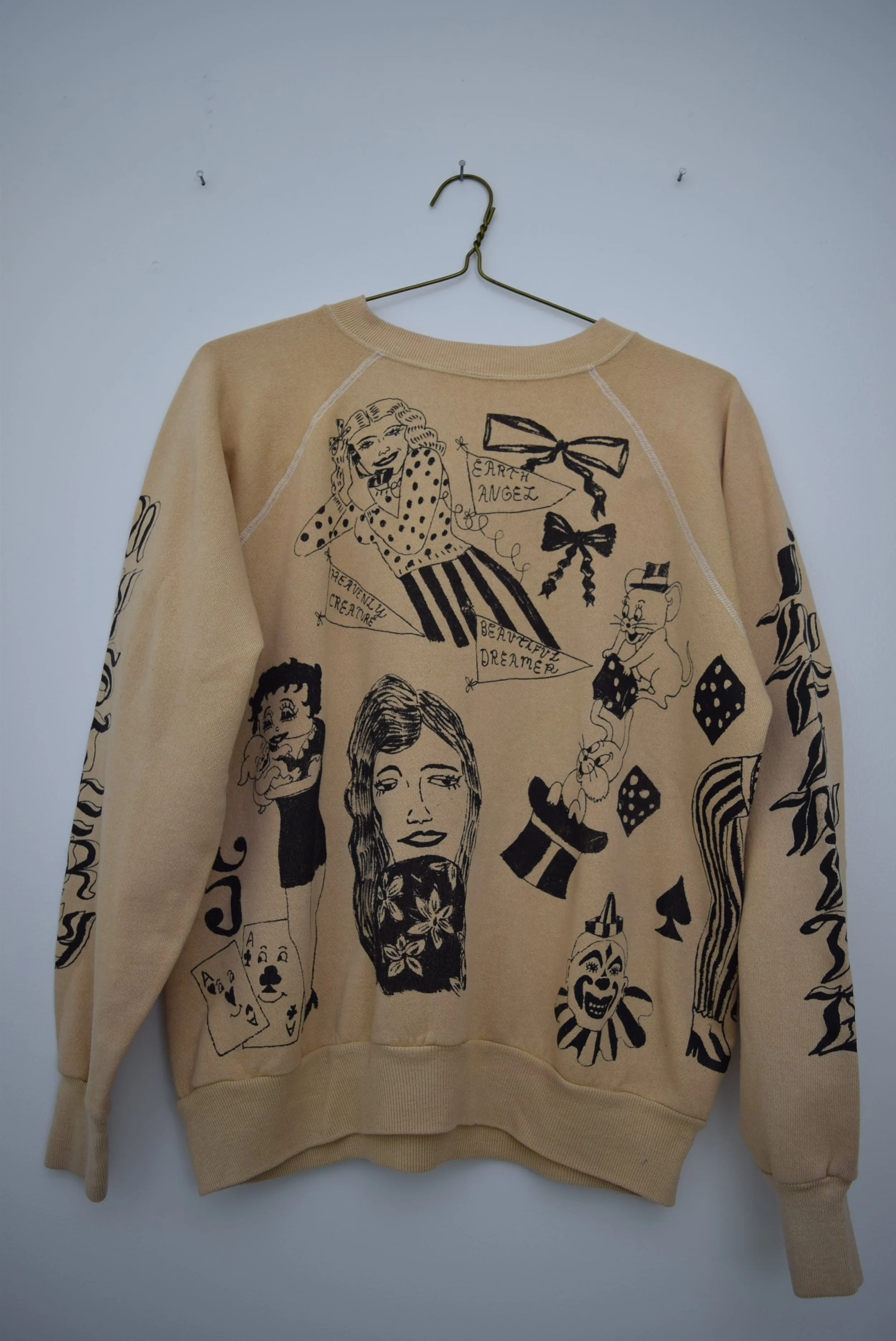 "Infinite Mystery" off white hand drawn + screen printed vintage sweatshirt L