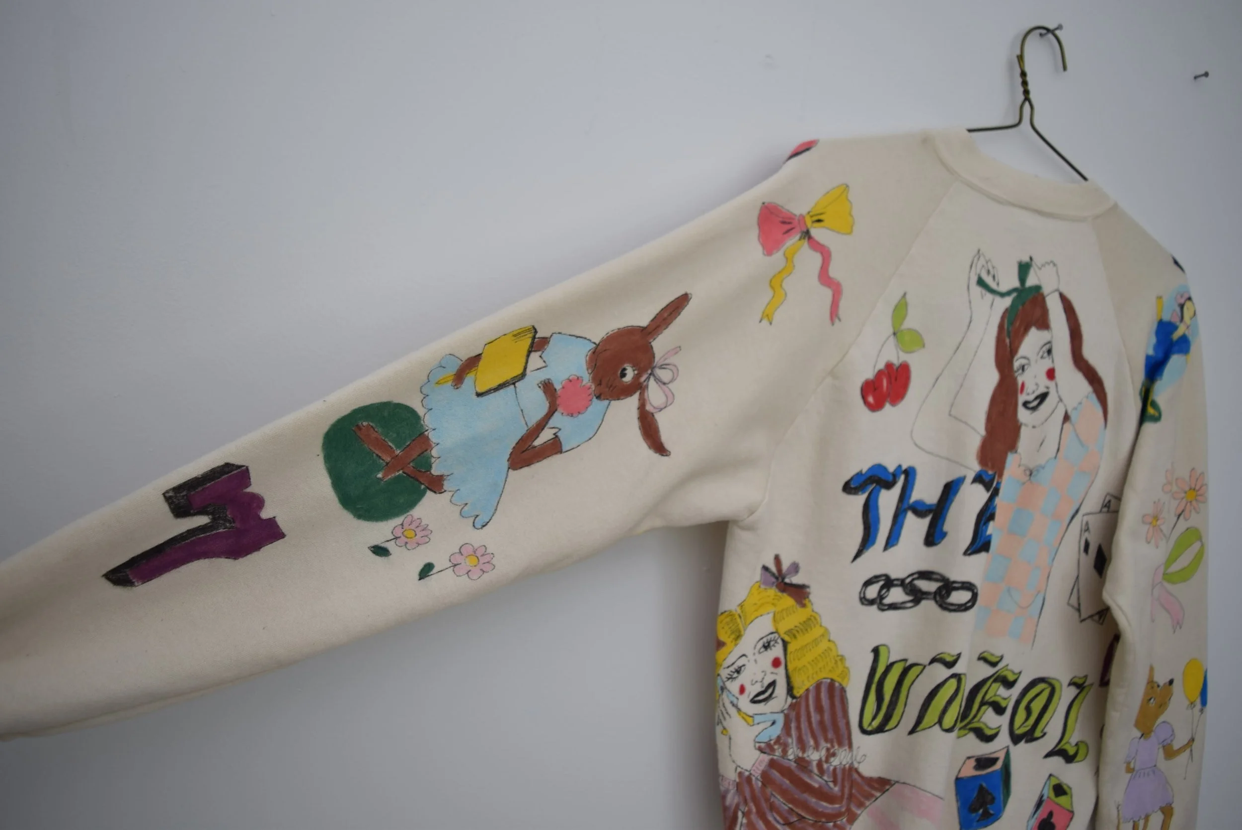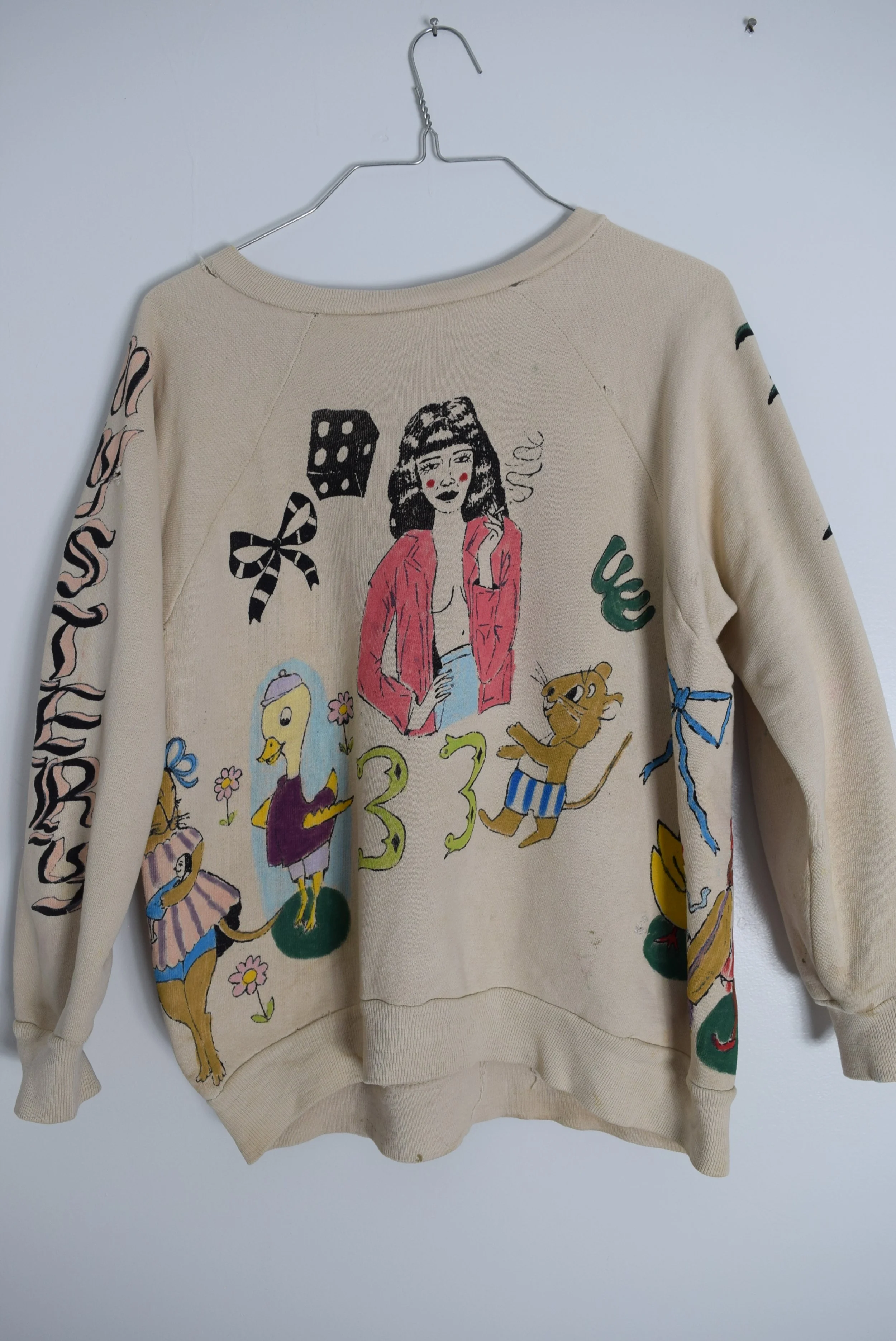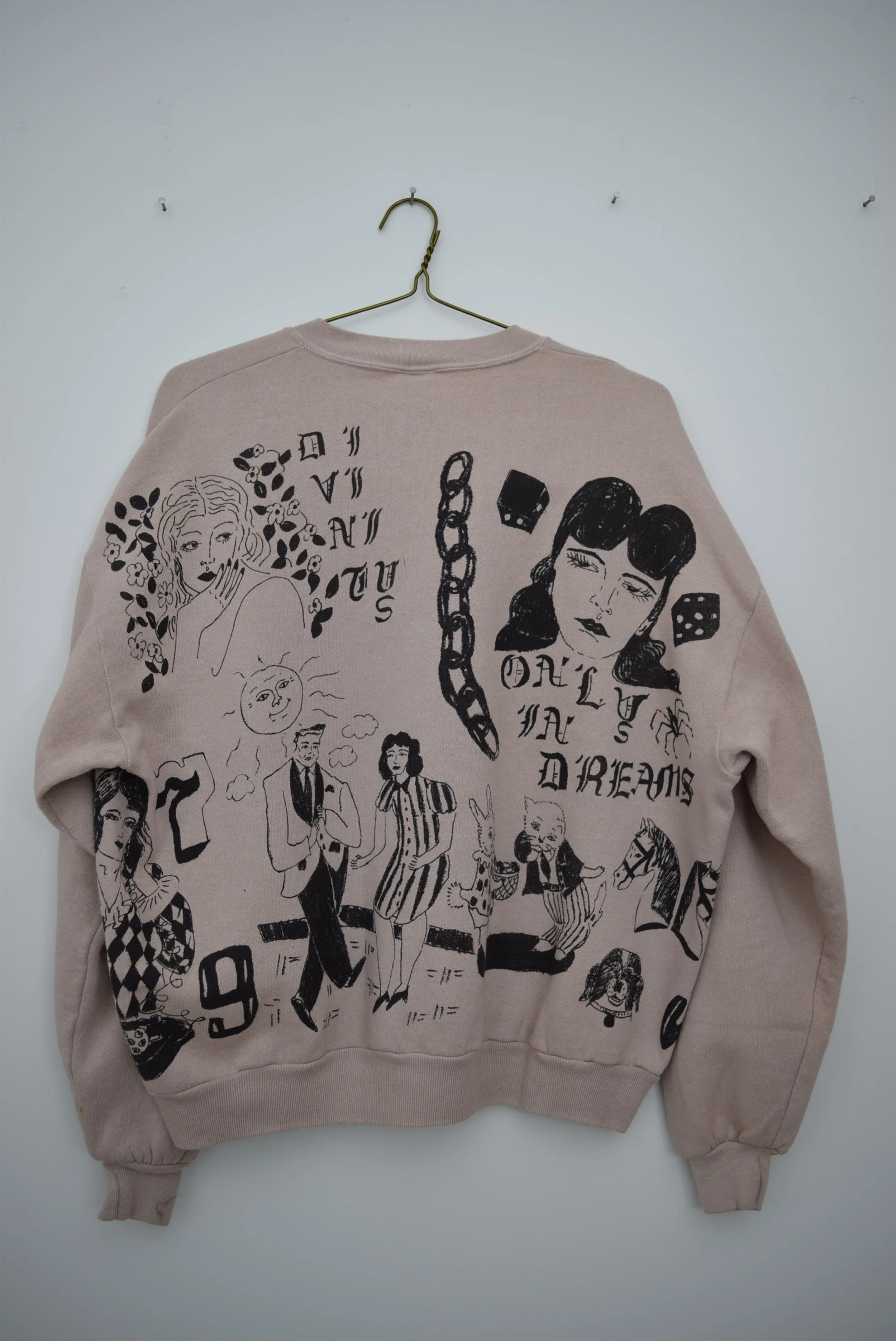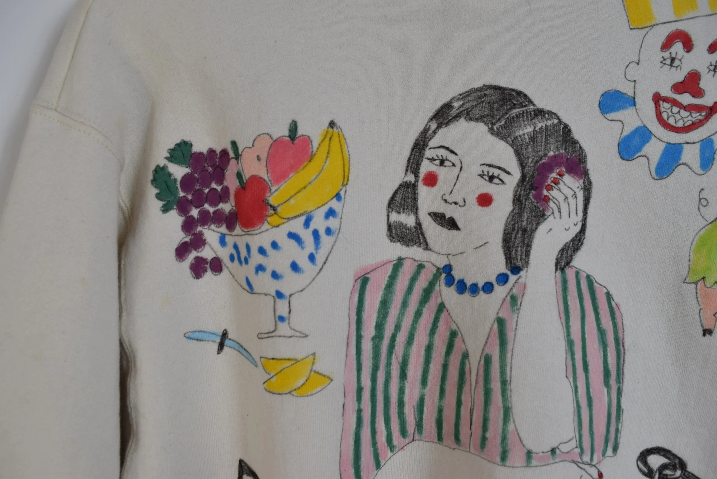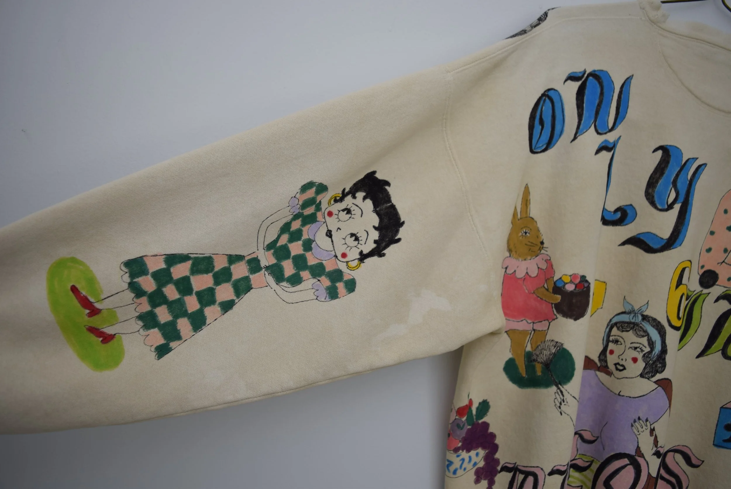 "Infinite Mystery" off white hand drawn + screen printed vintage sweatshirt L