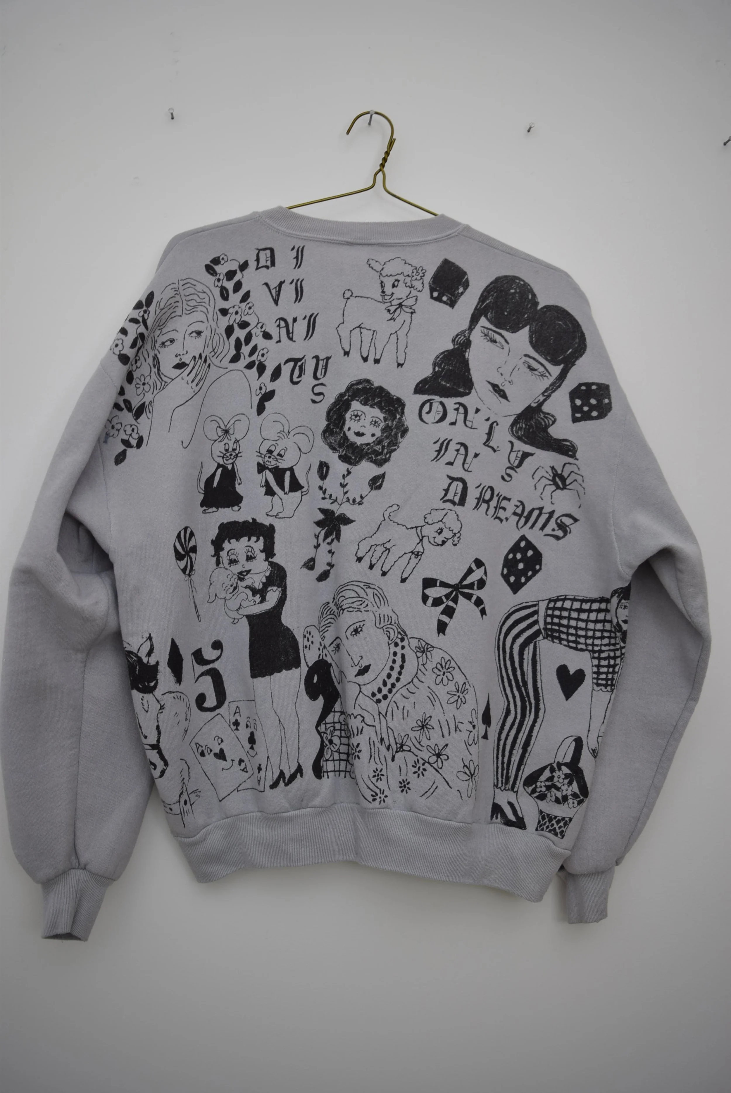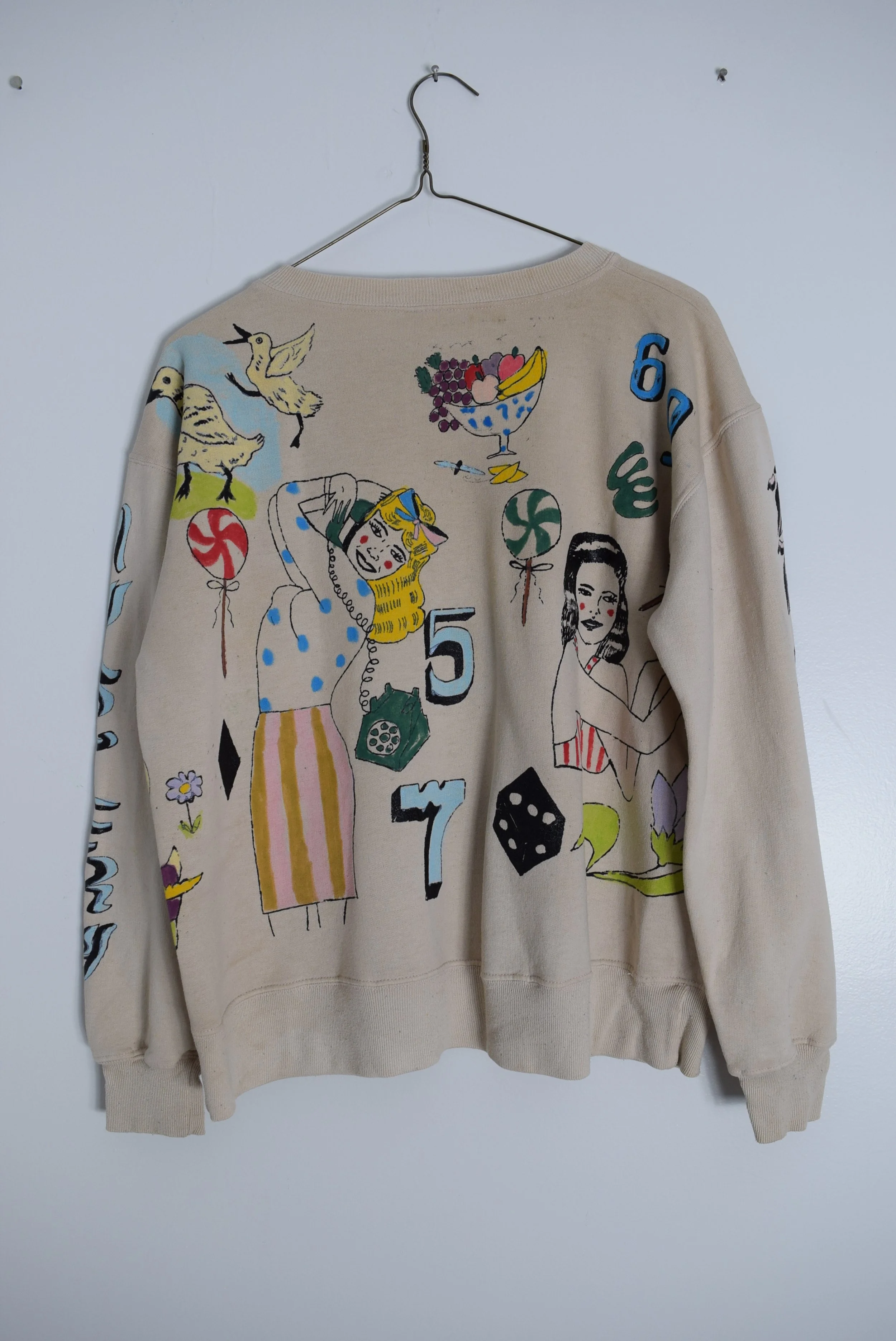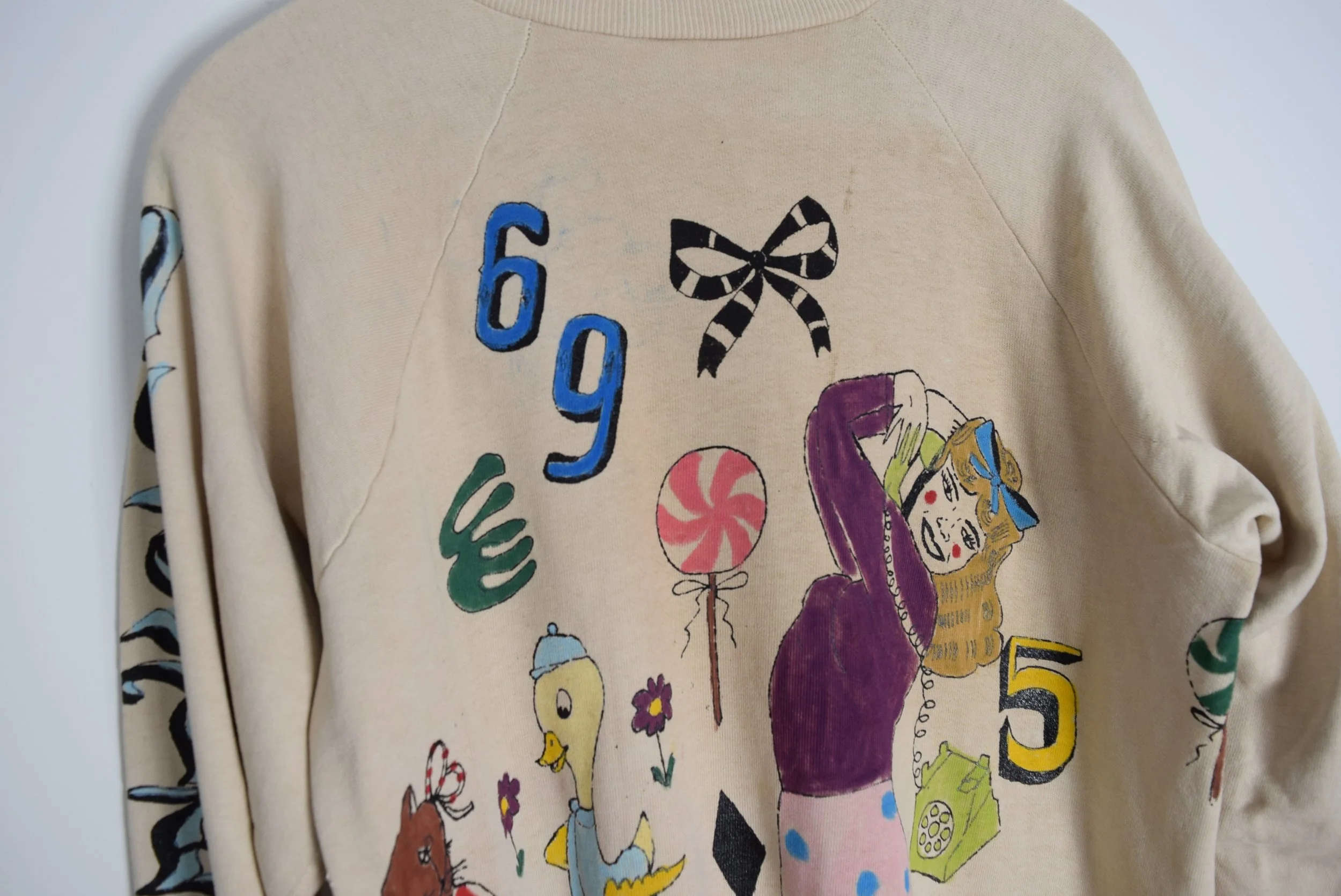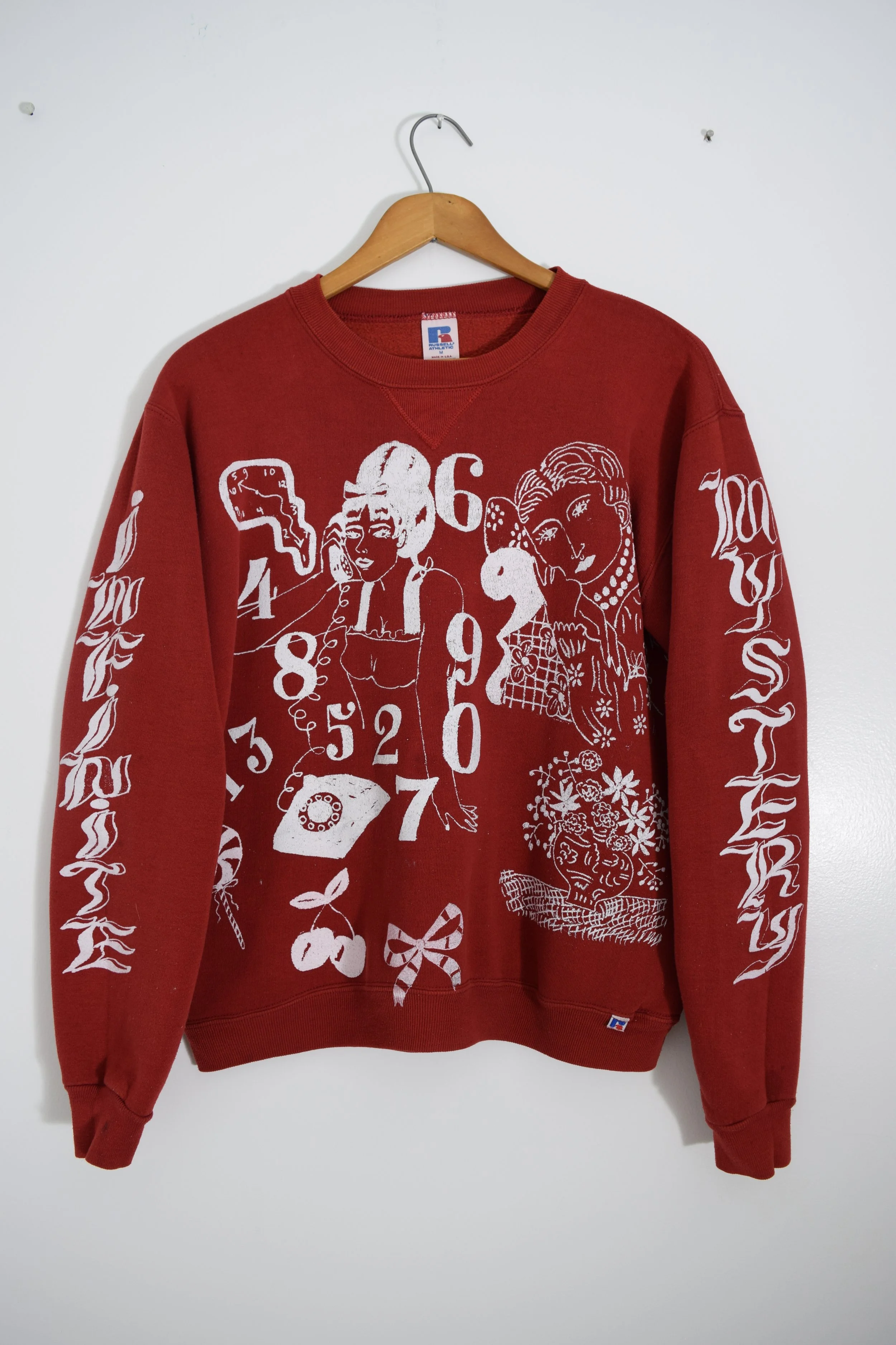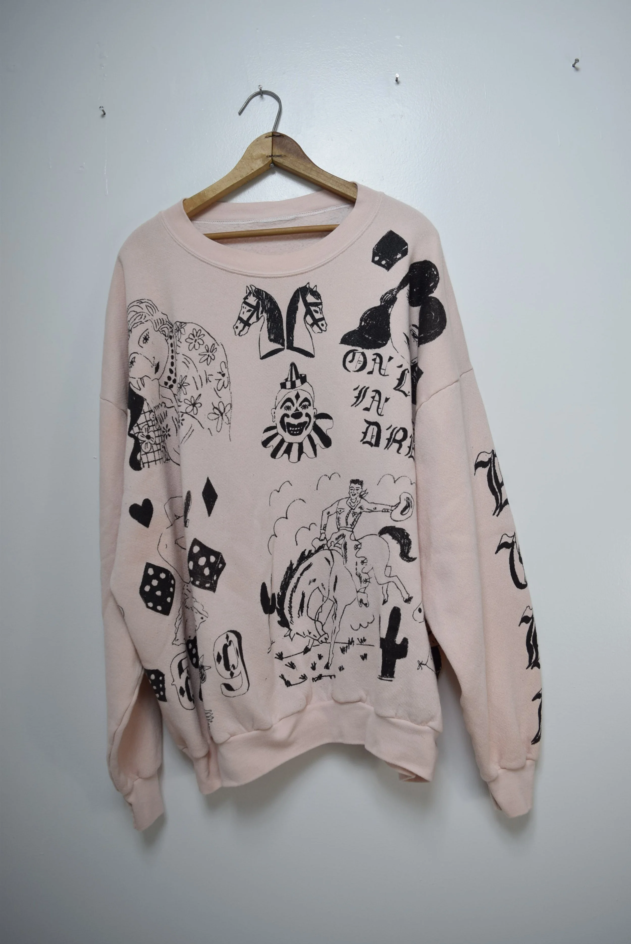 "Infinite Mystery" off white hand drawn + screen printed vintage sweatshirt L