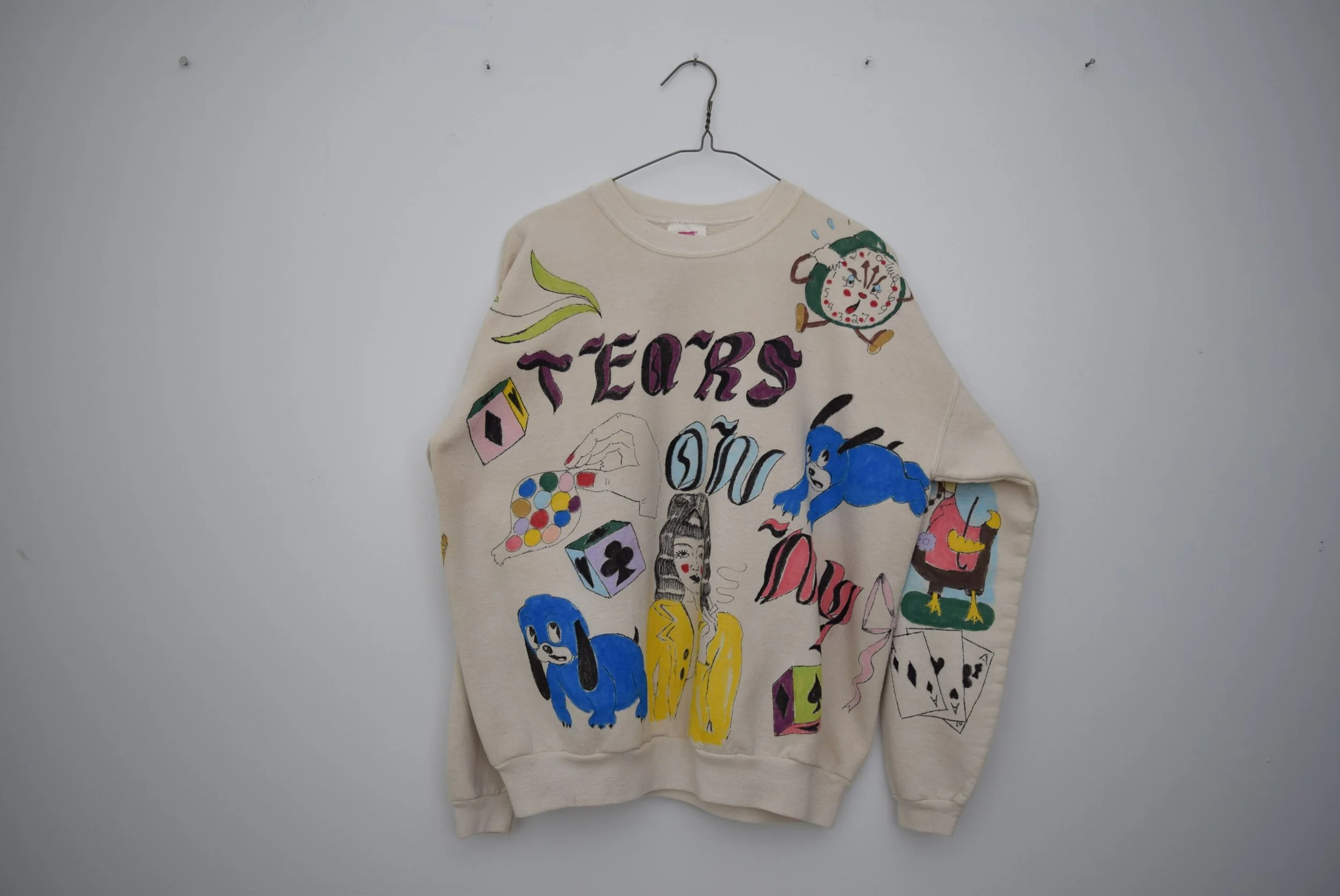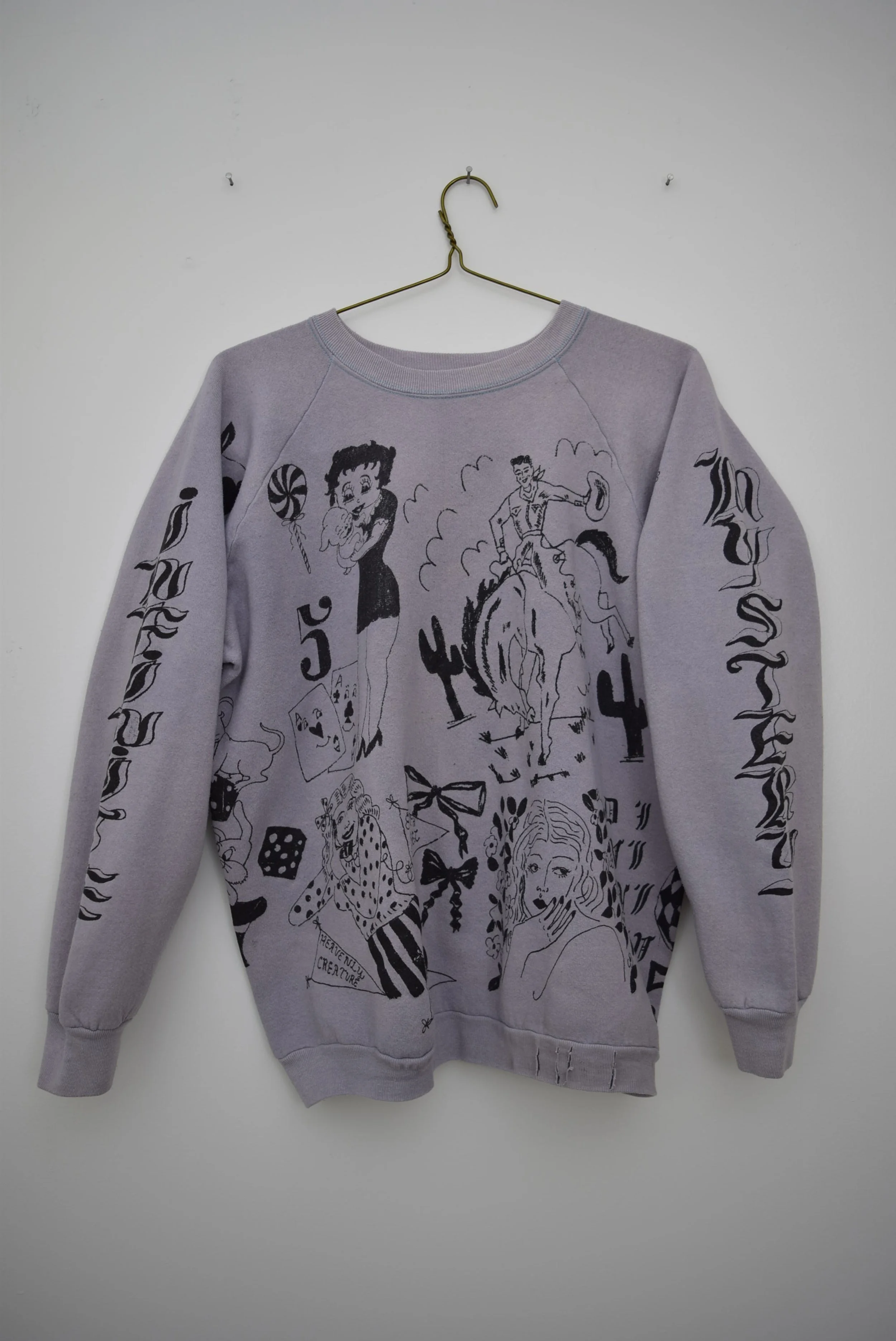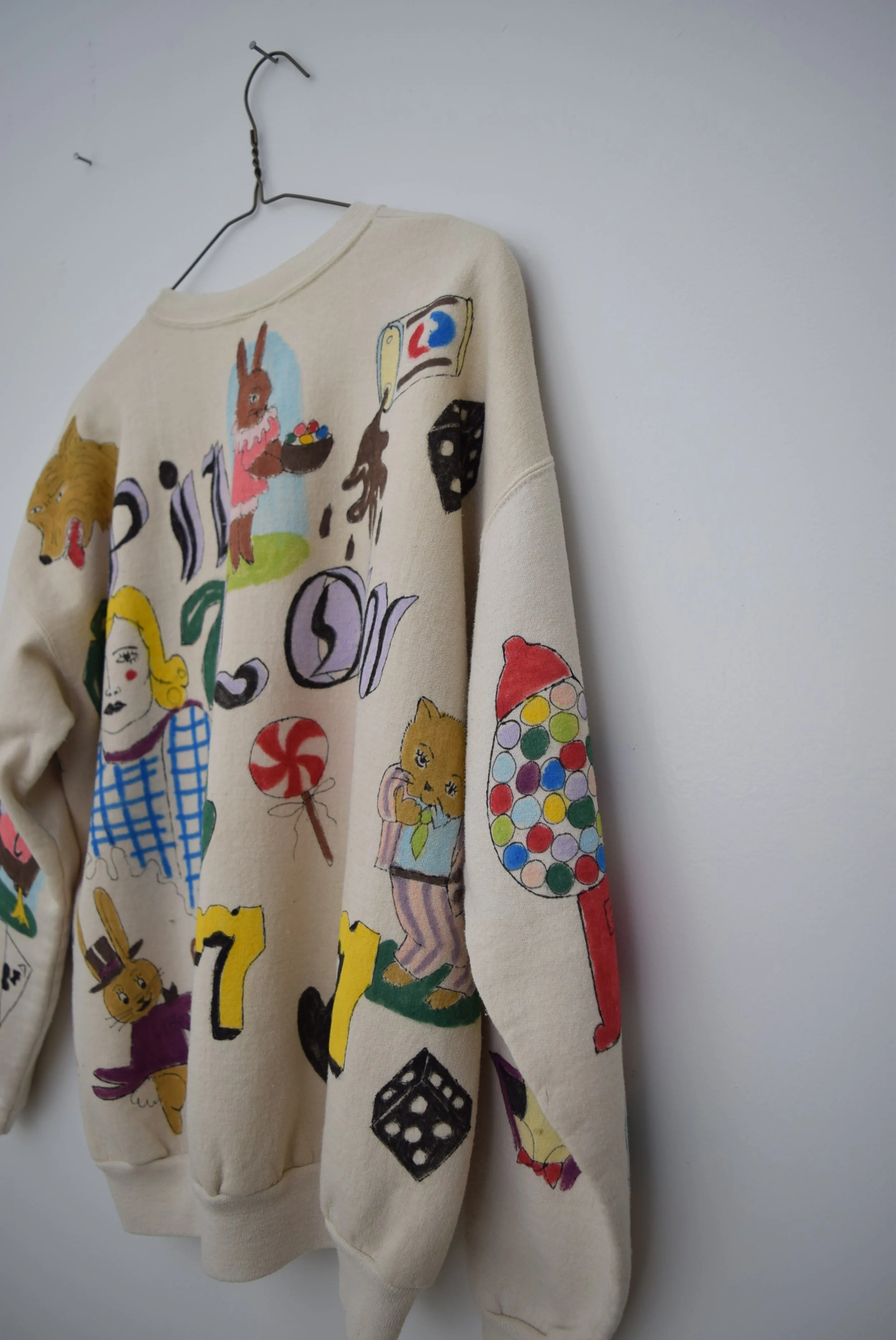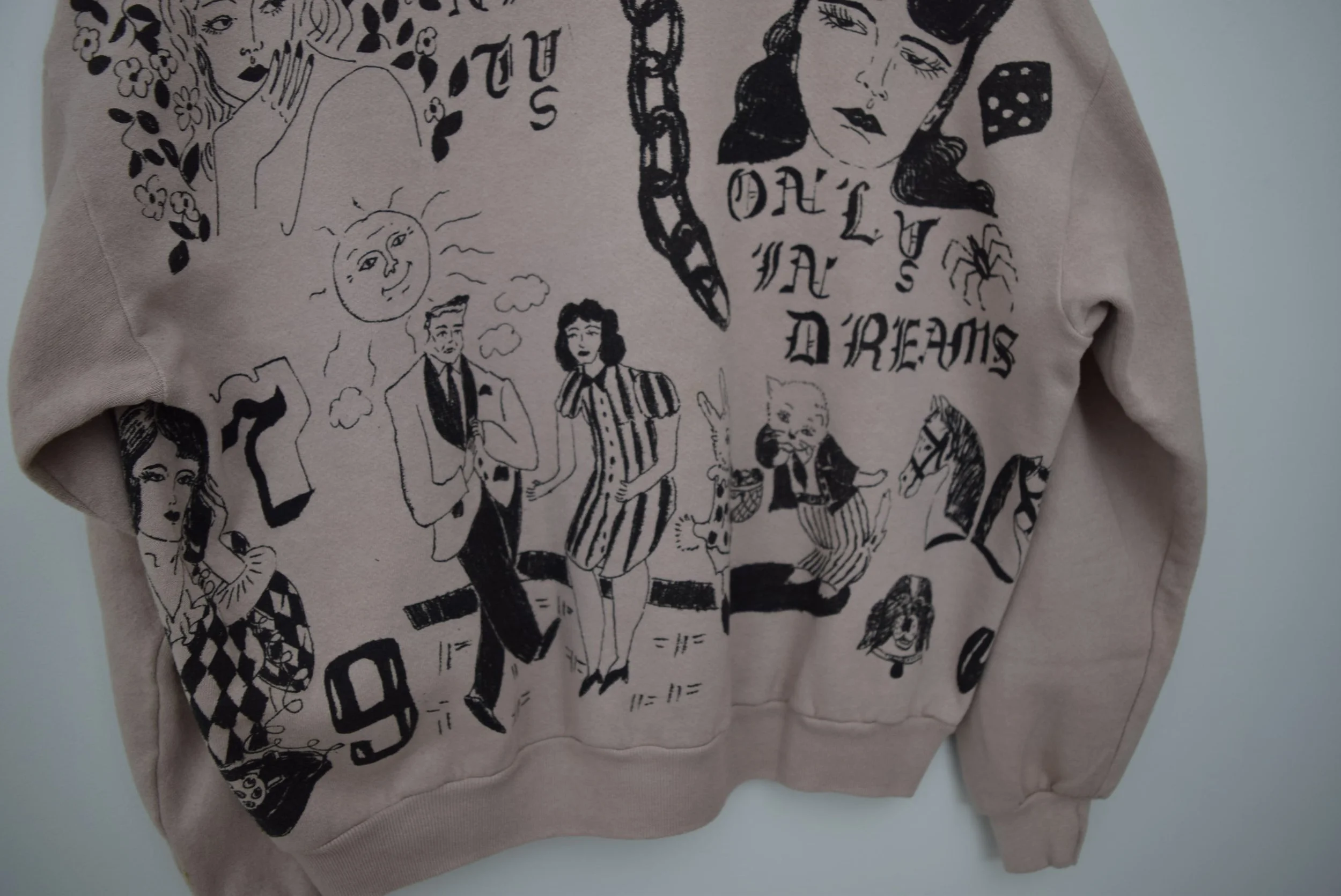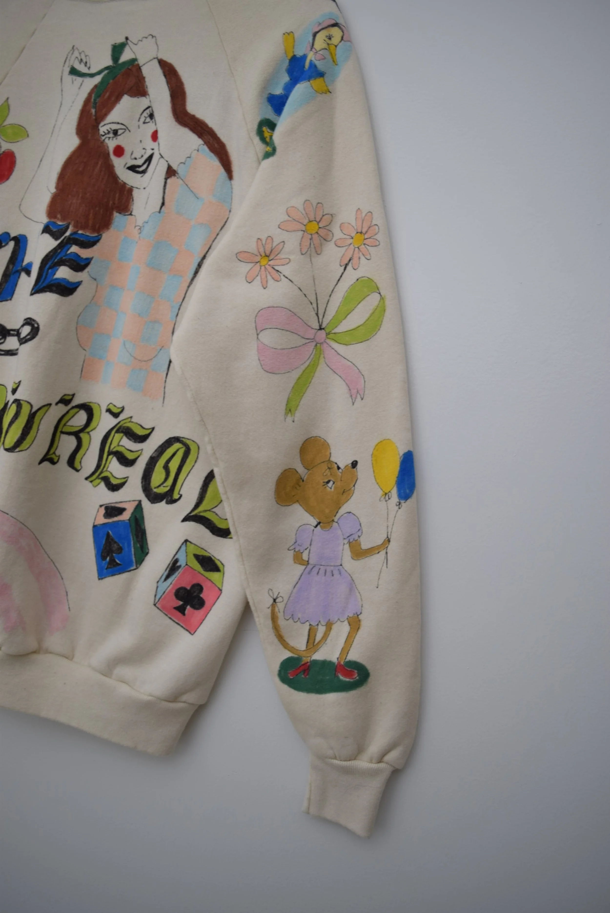 "Infinite Mystery" off white hand drawn + screen printed vintage sweatshirt L
