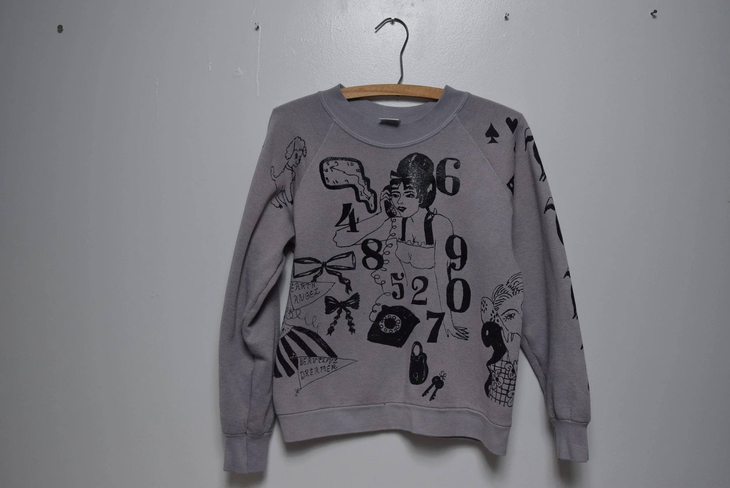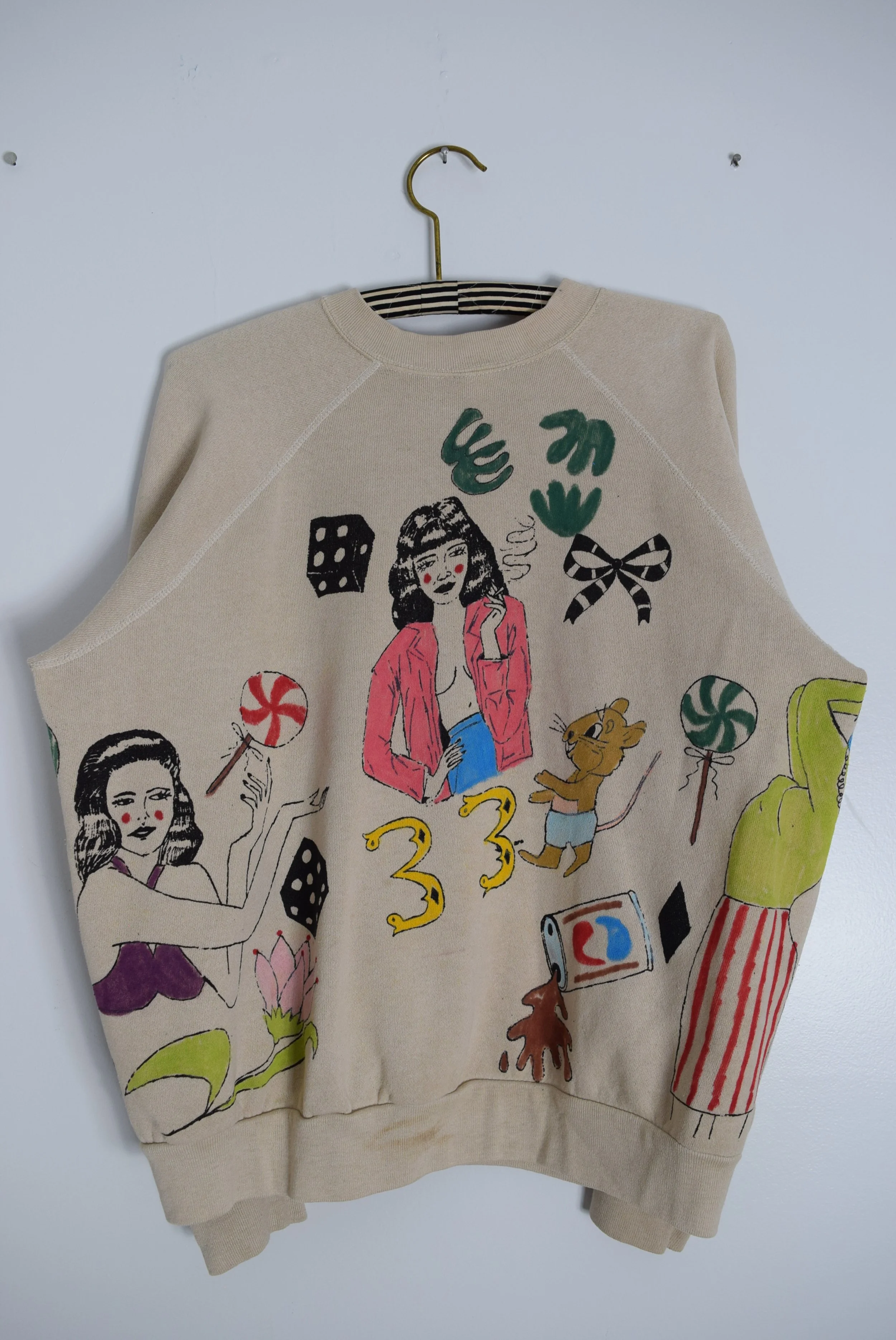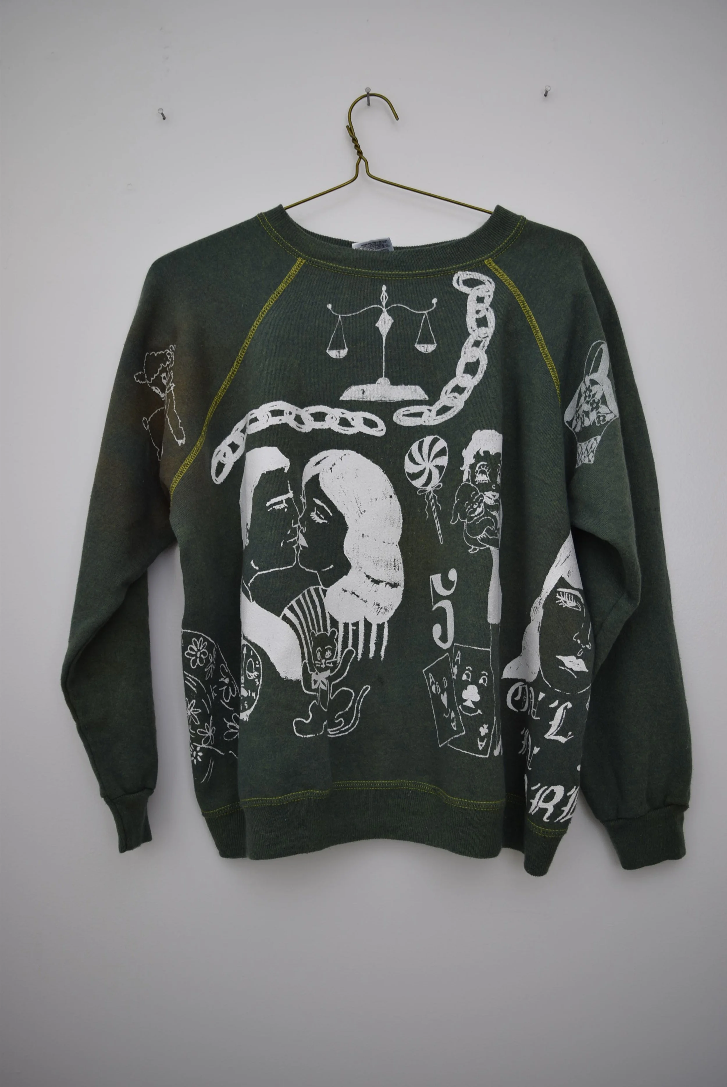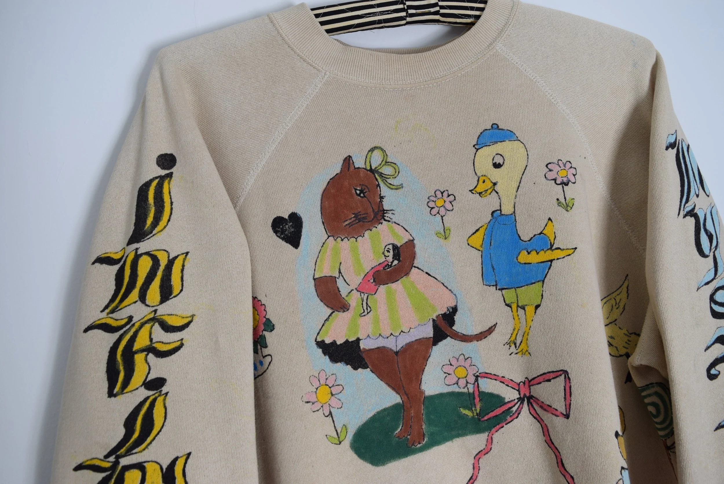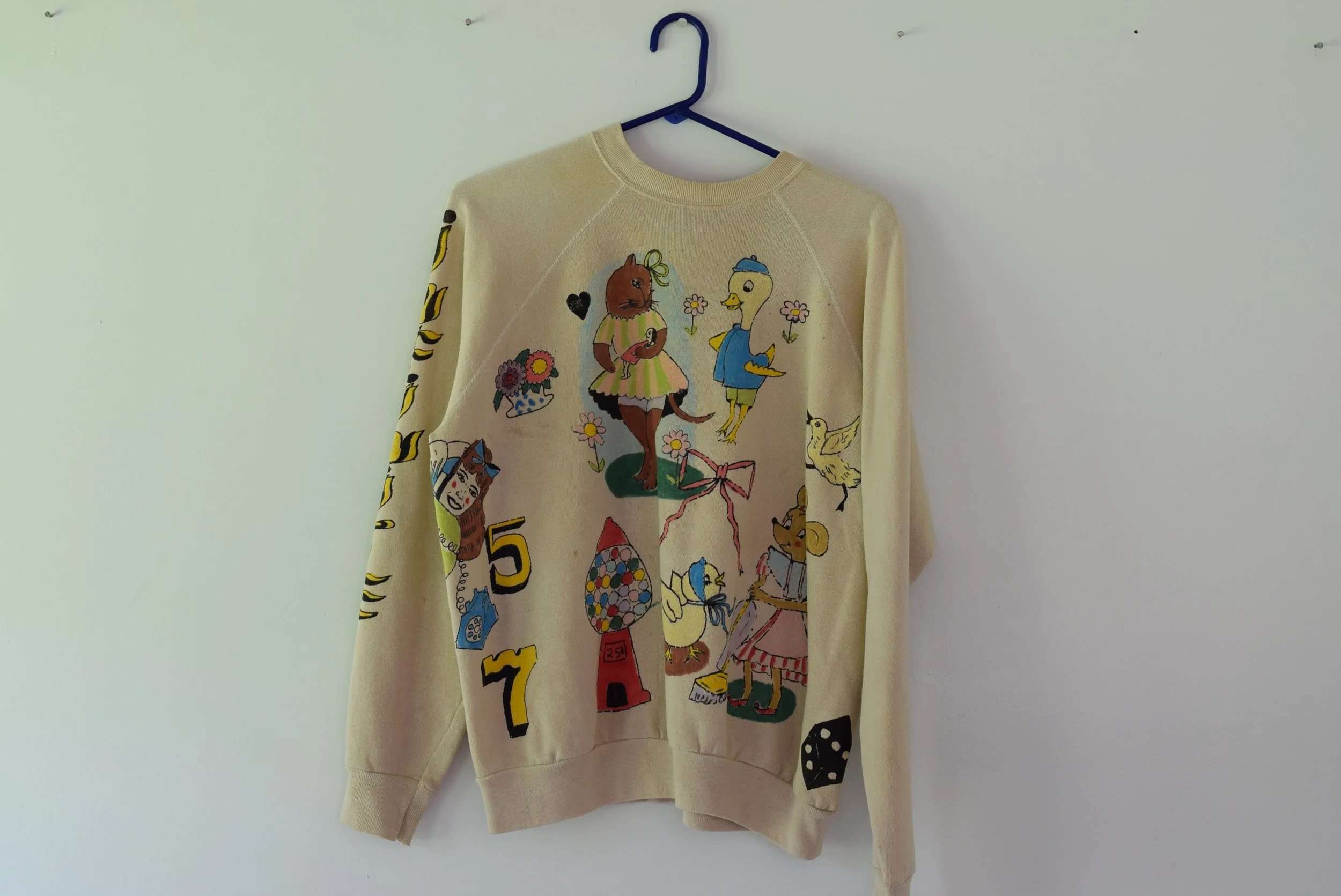 "Infinite Mystery" off white hand drawn + screen printed vintage sweatshirt L