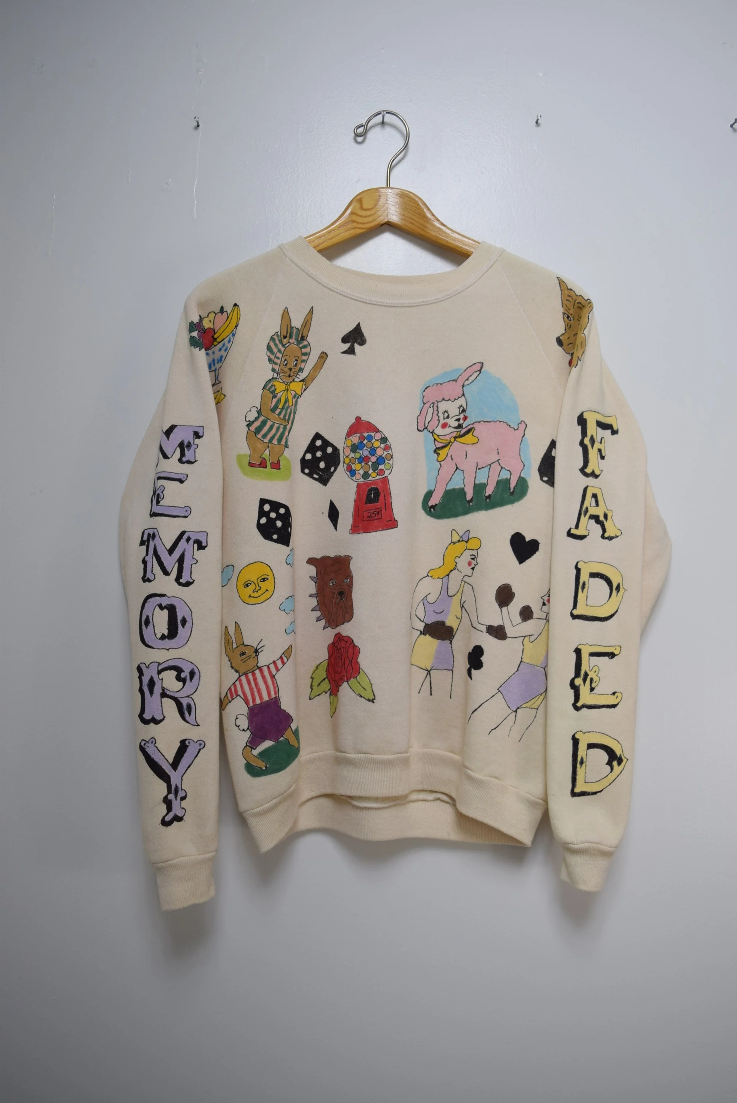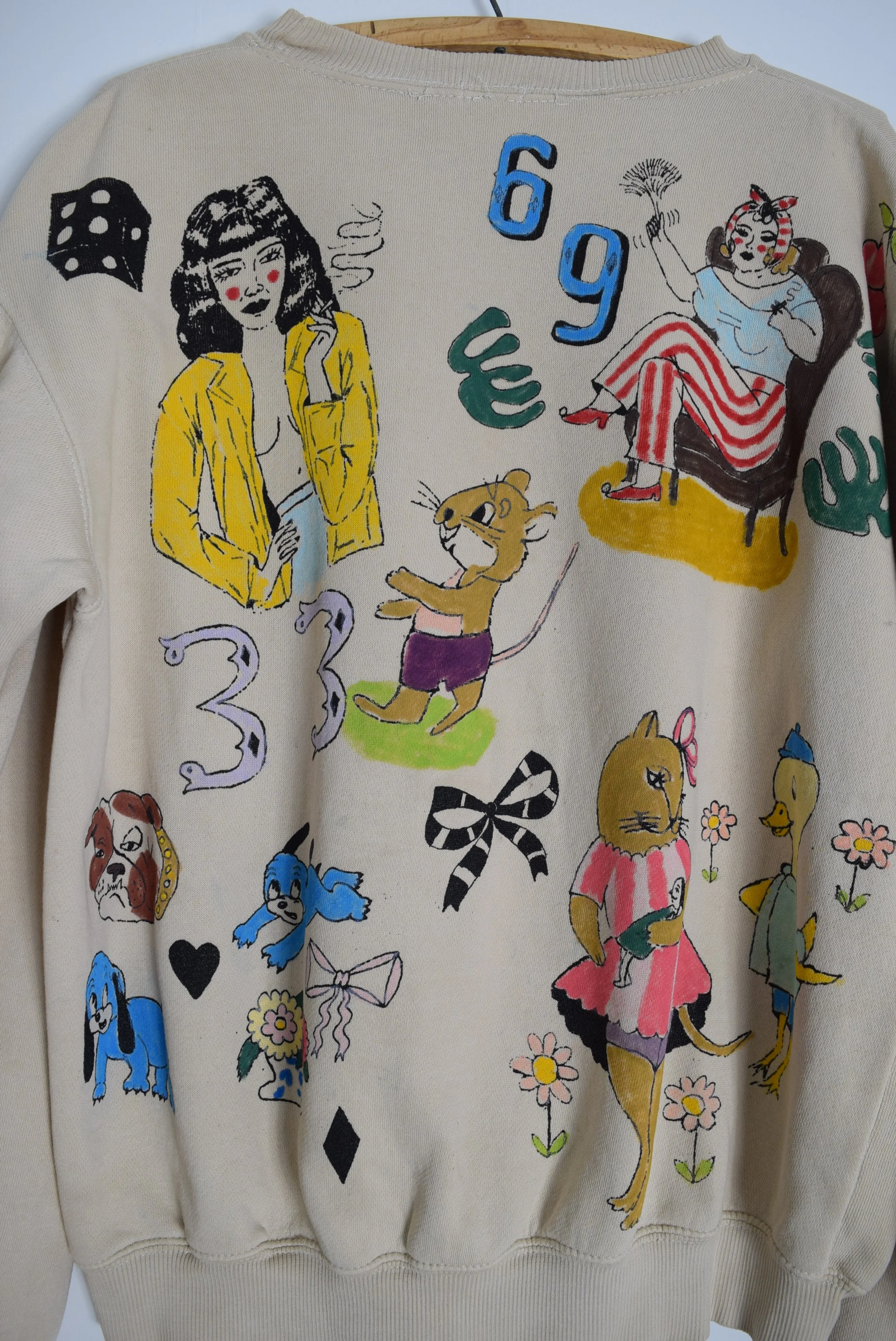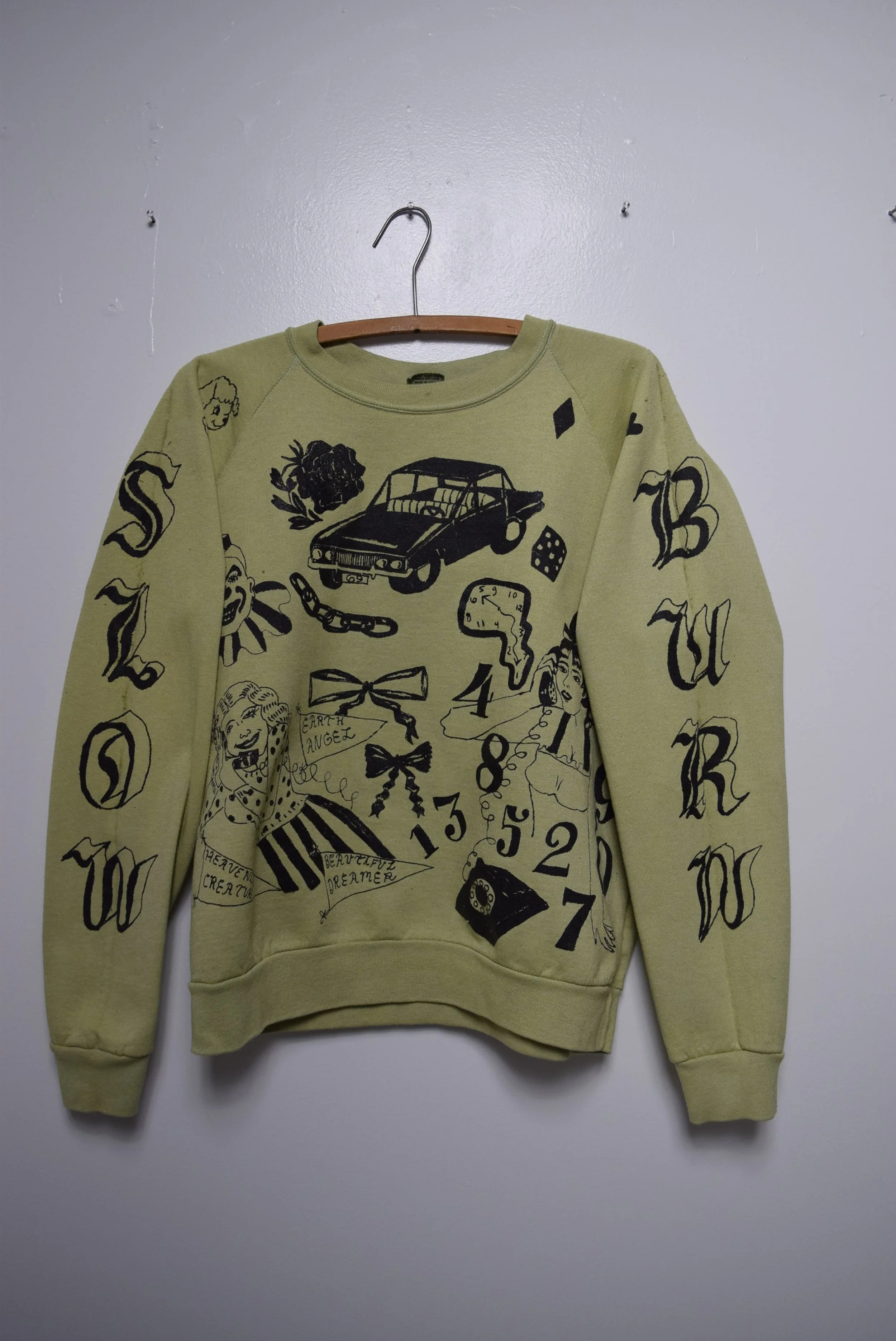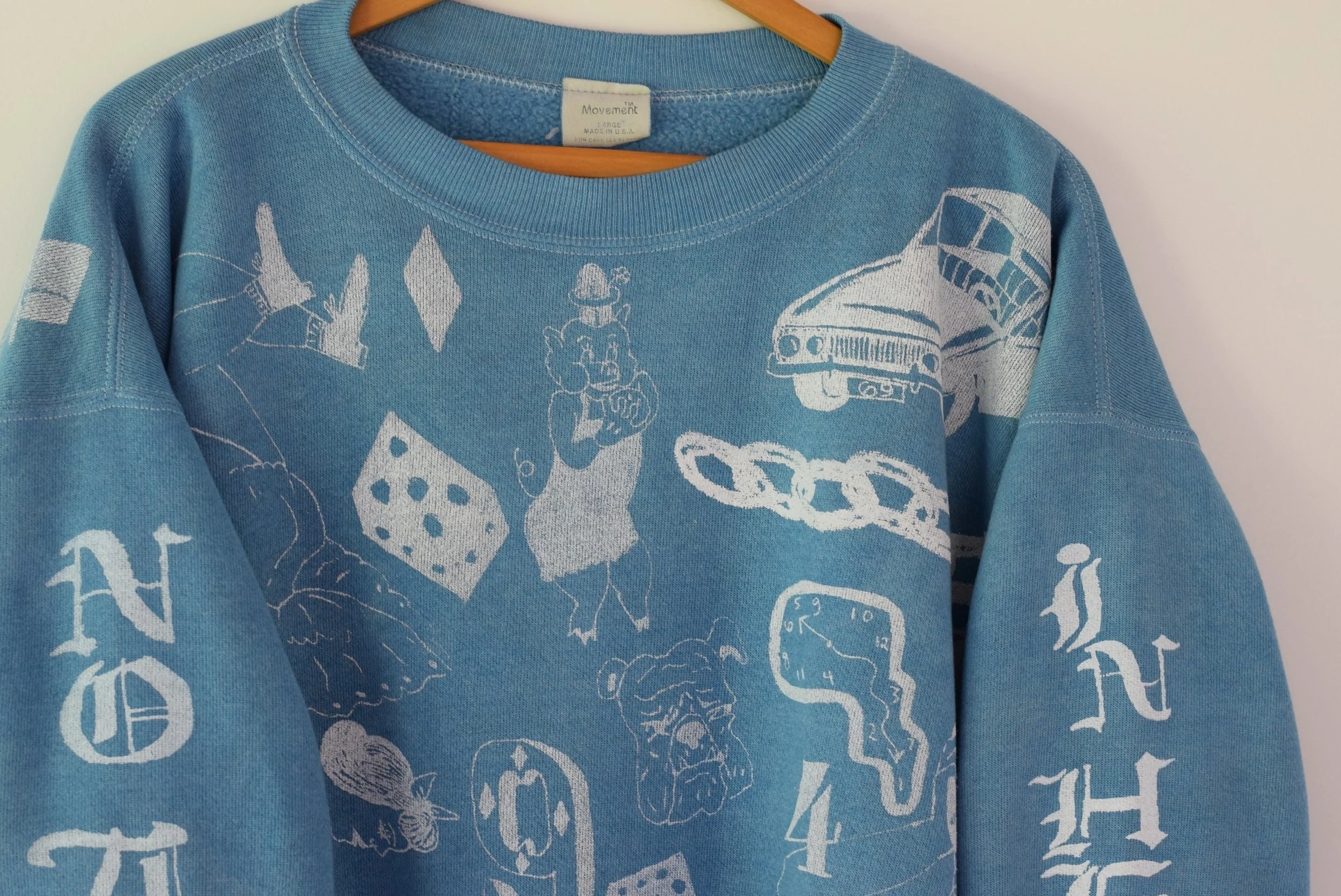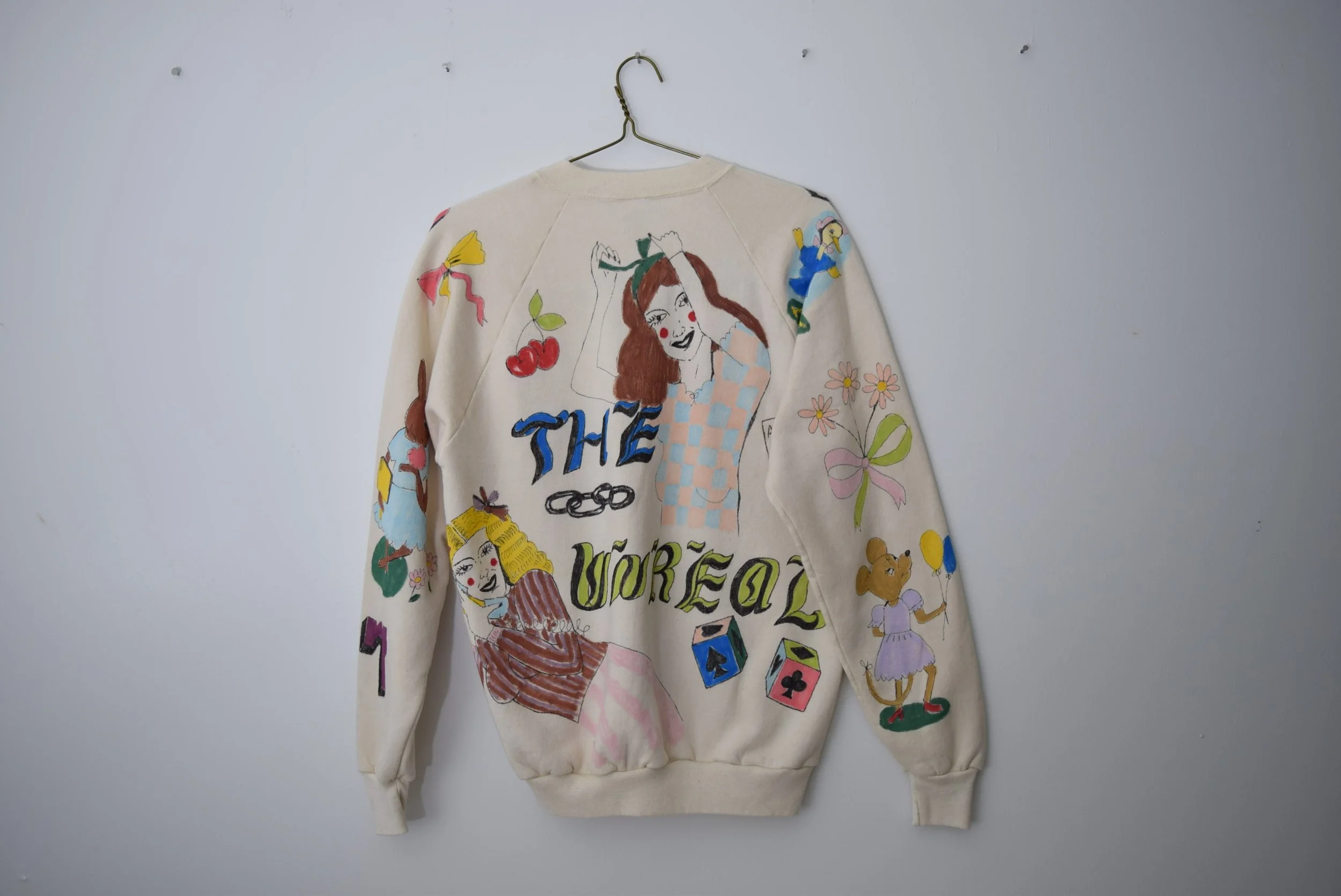 "Infinite Mystery" off white hand drawn + screen printed vintage sweatshirt L