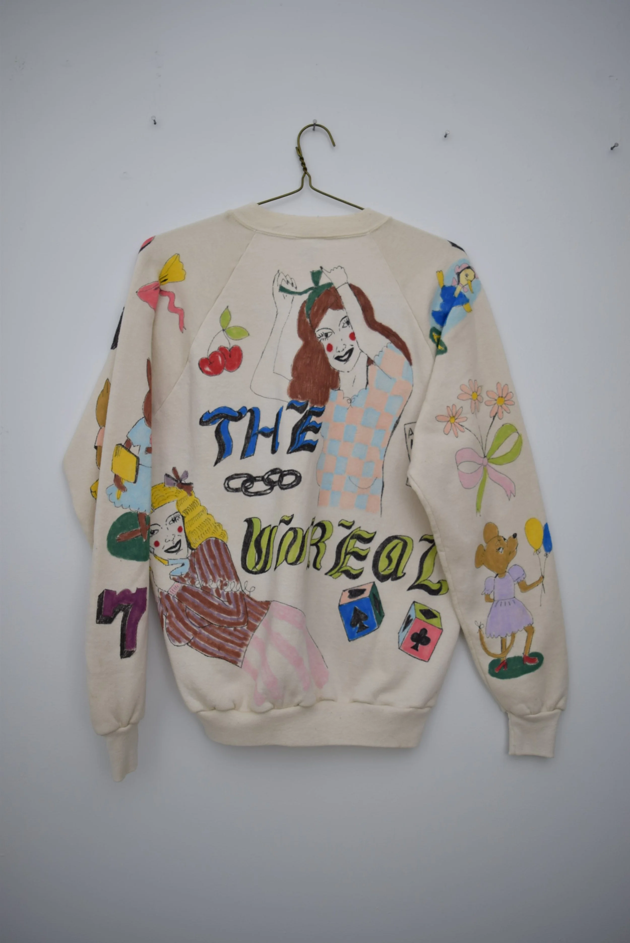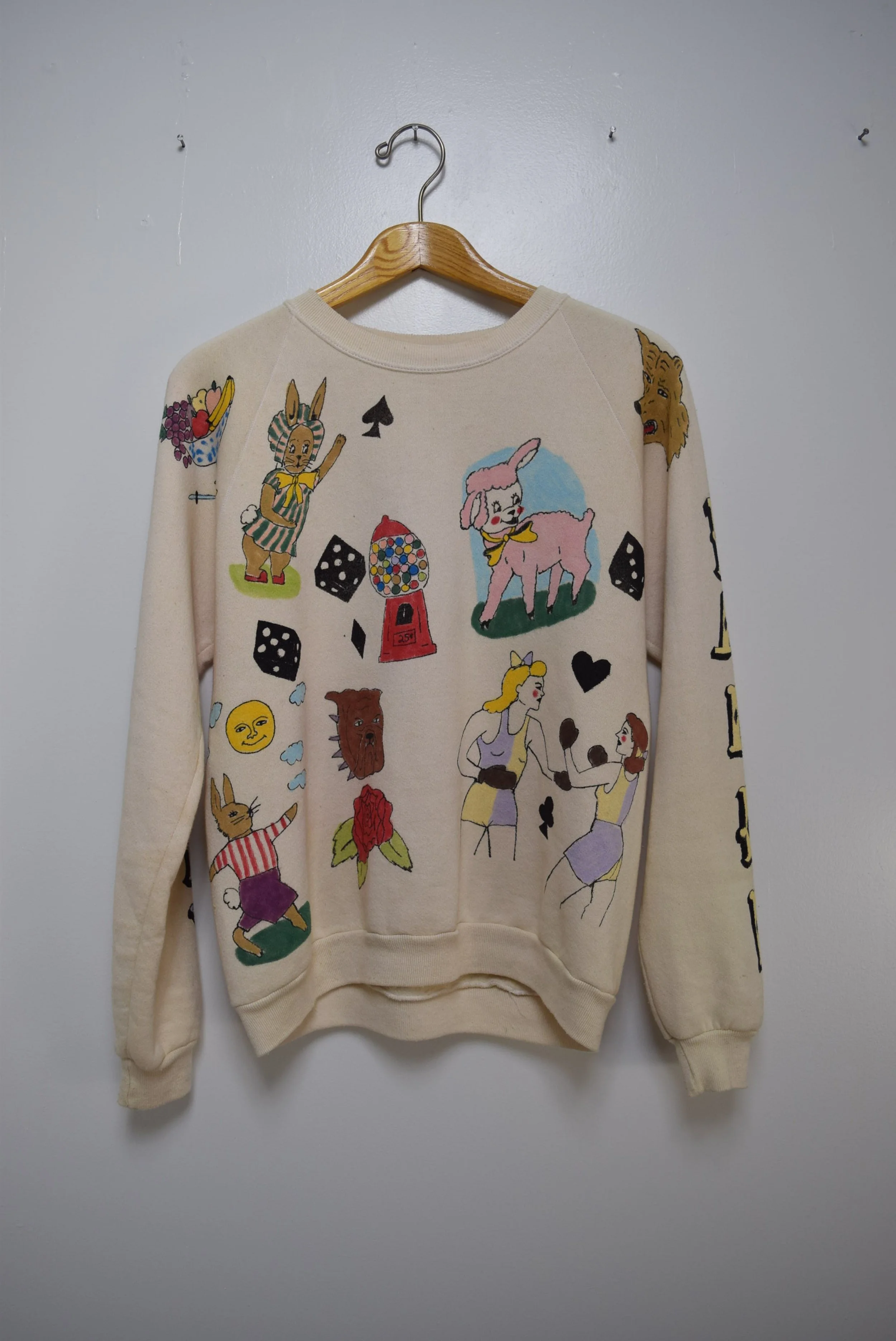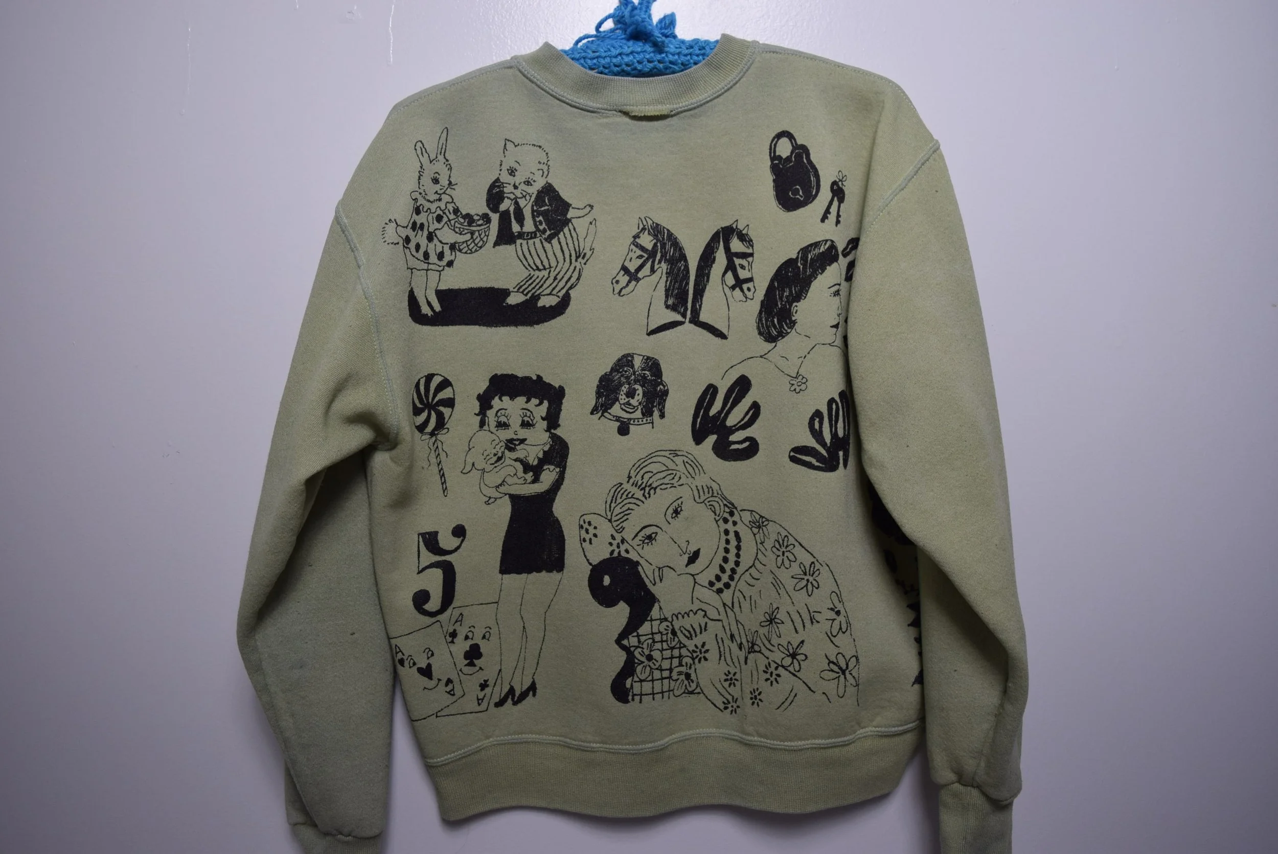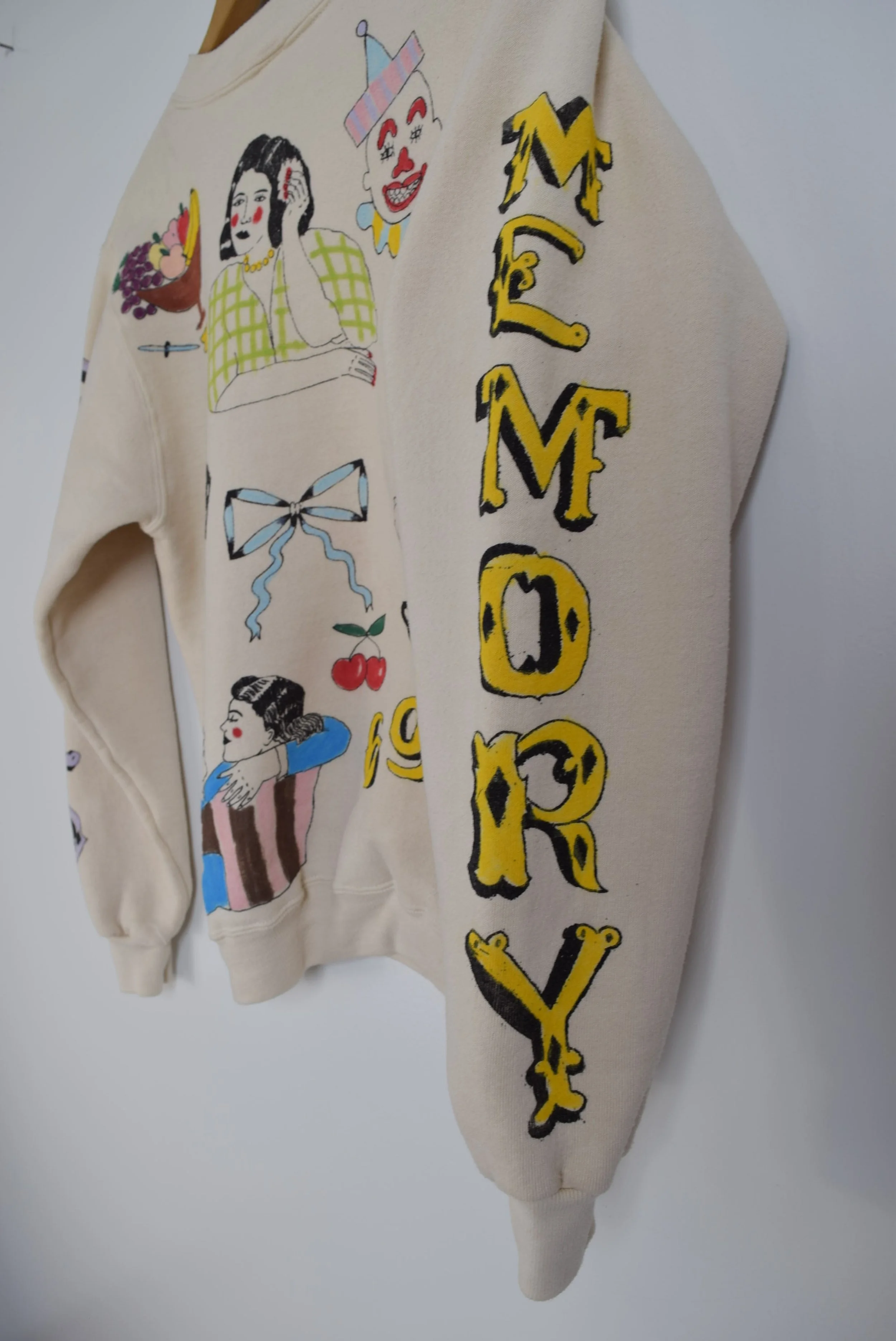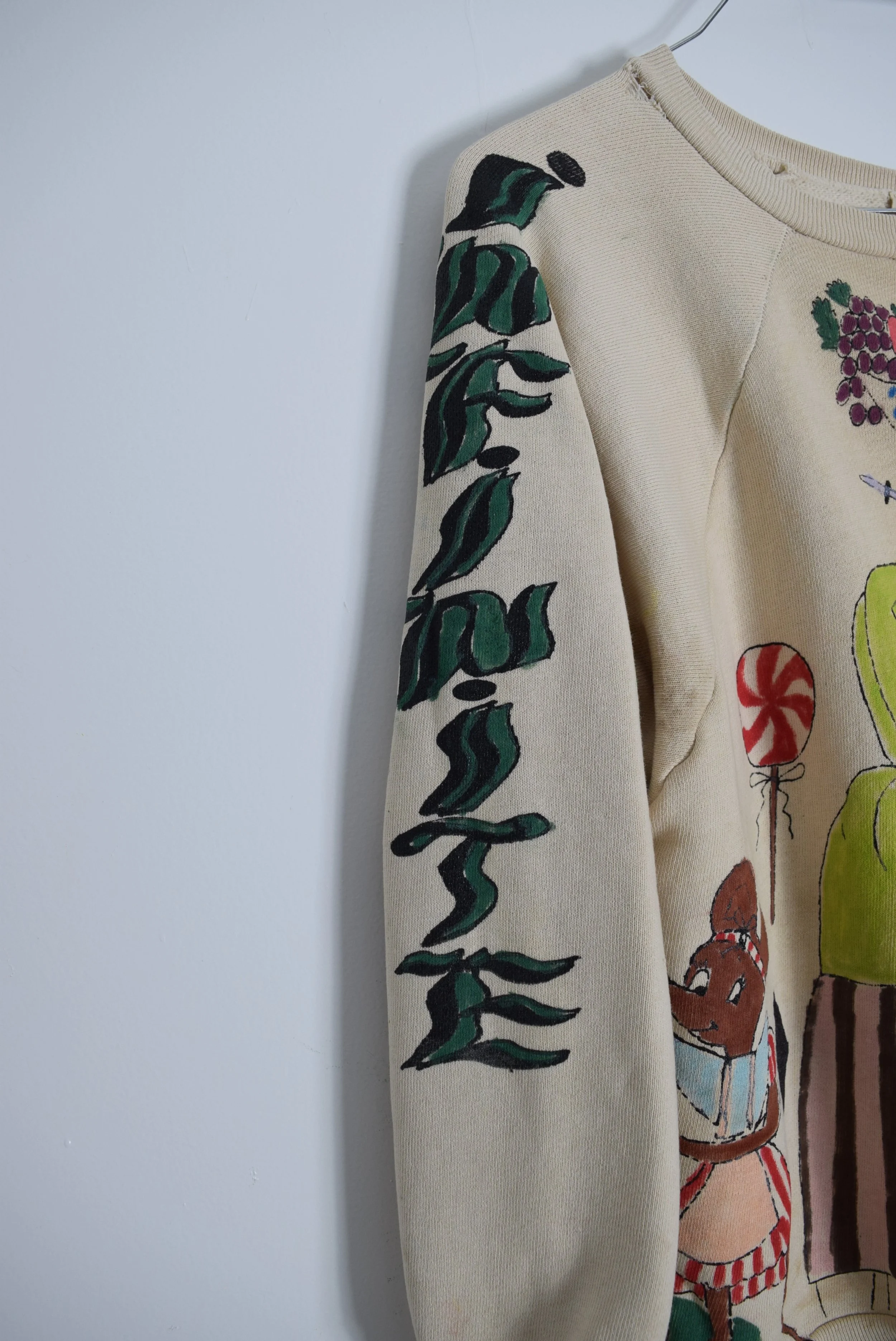 "Infinite Mystery" off white hand drawn + screen printed vintage sweatshirt L