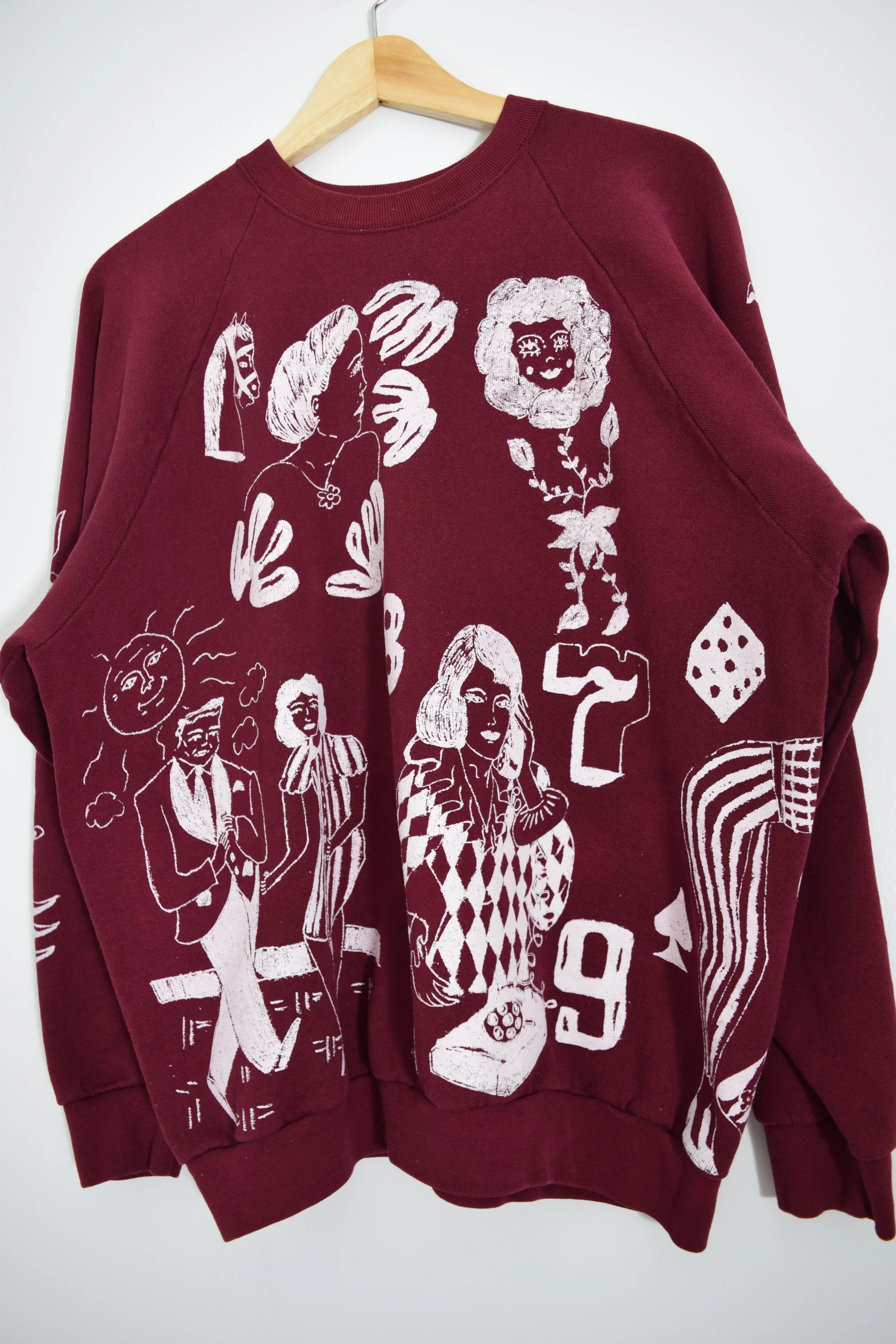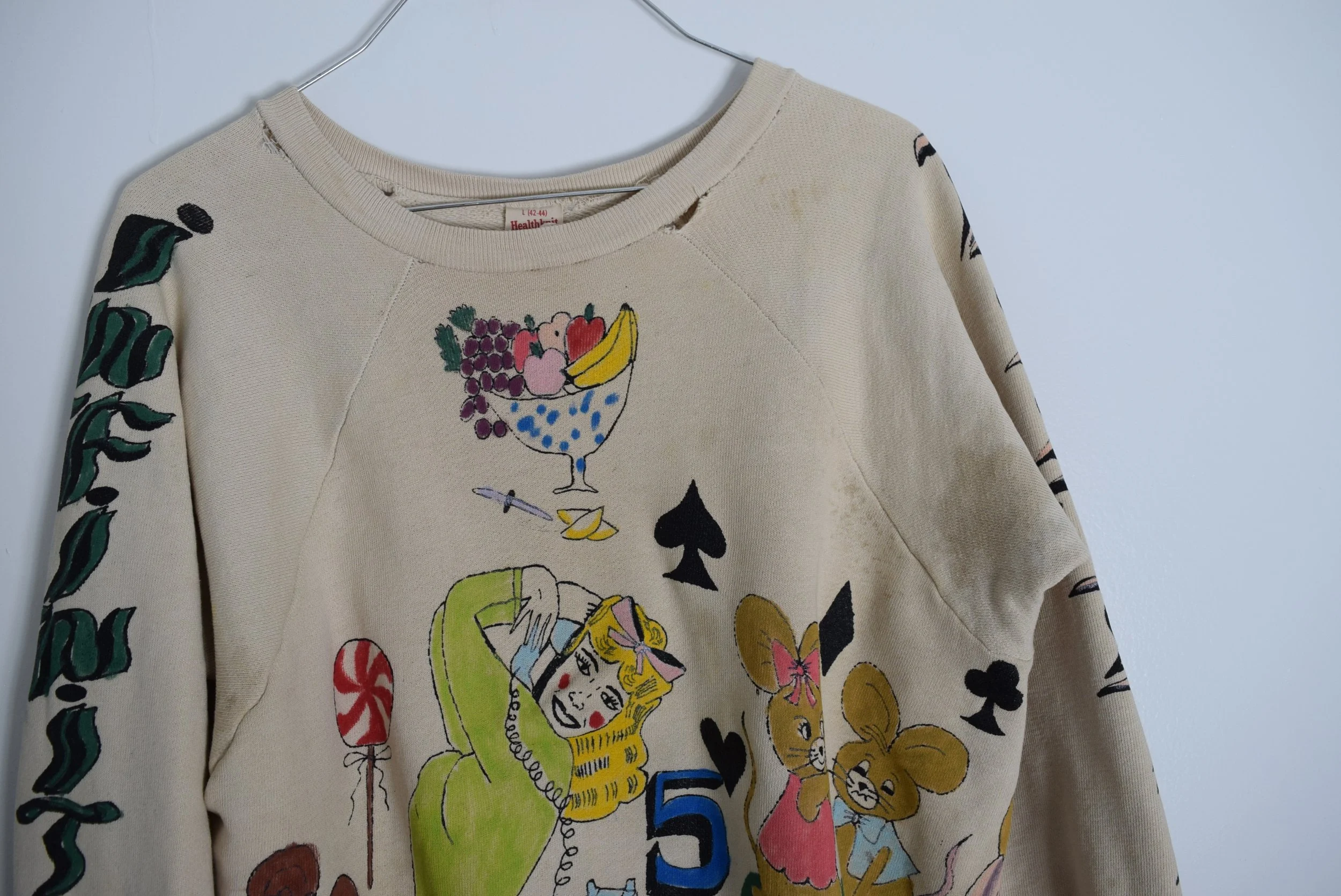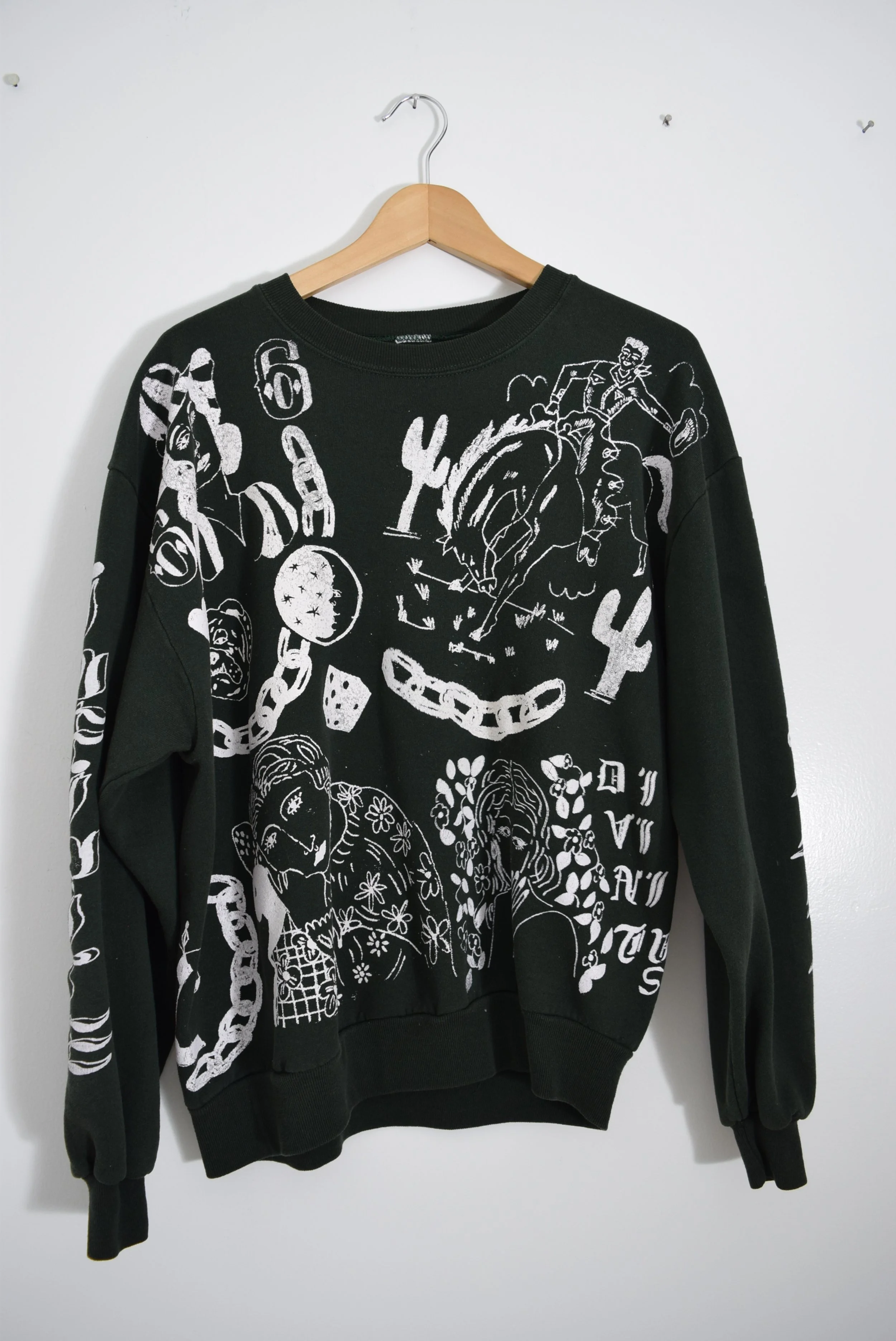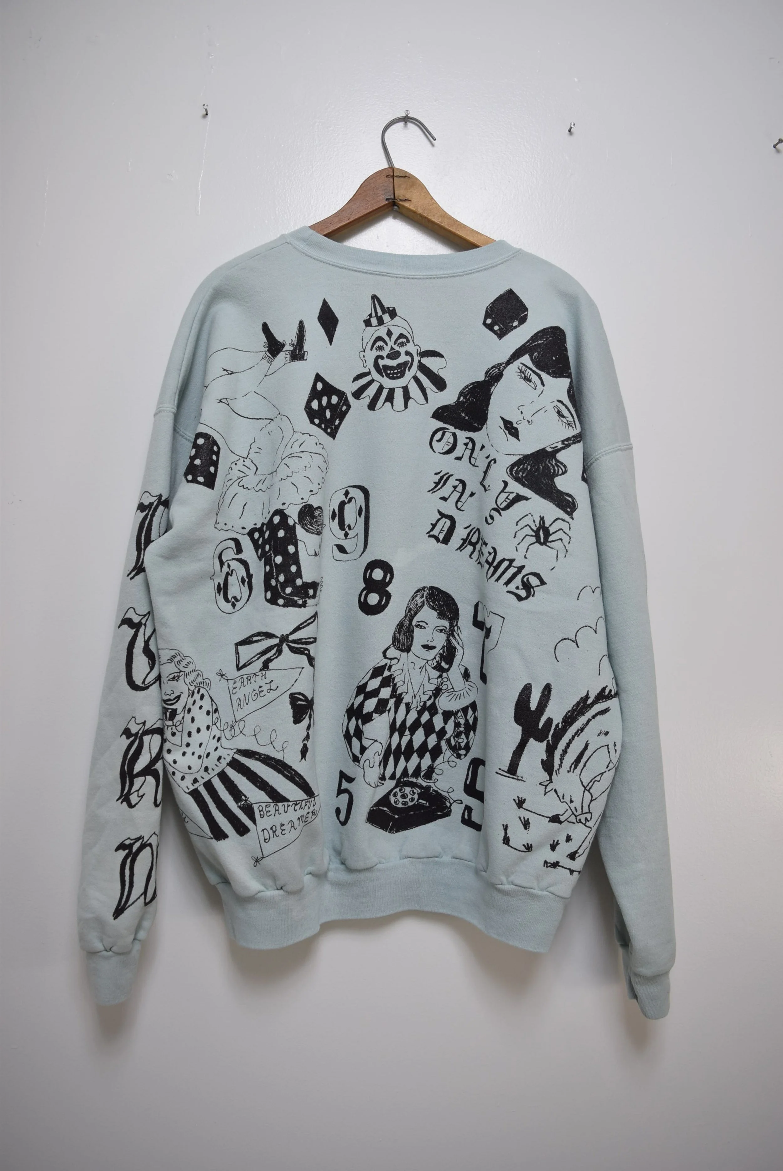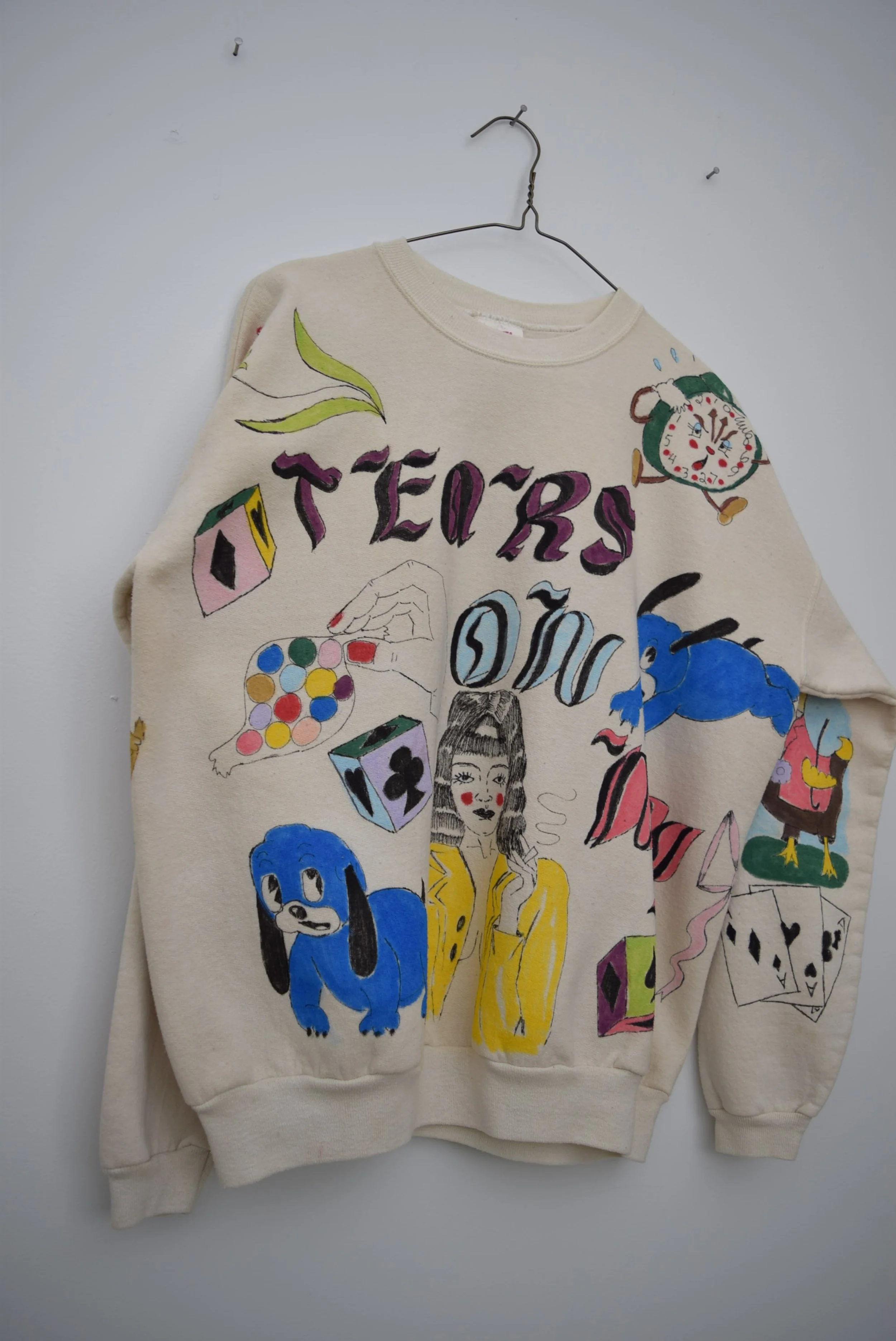"Infinite Mystery" off white hand drawn + screen printed vintage sweatshirt L