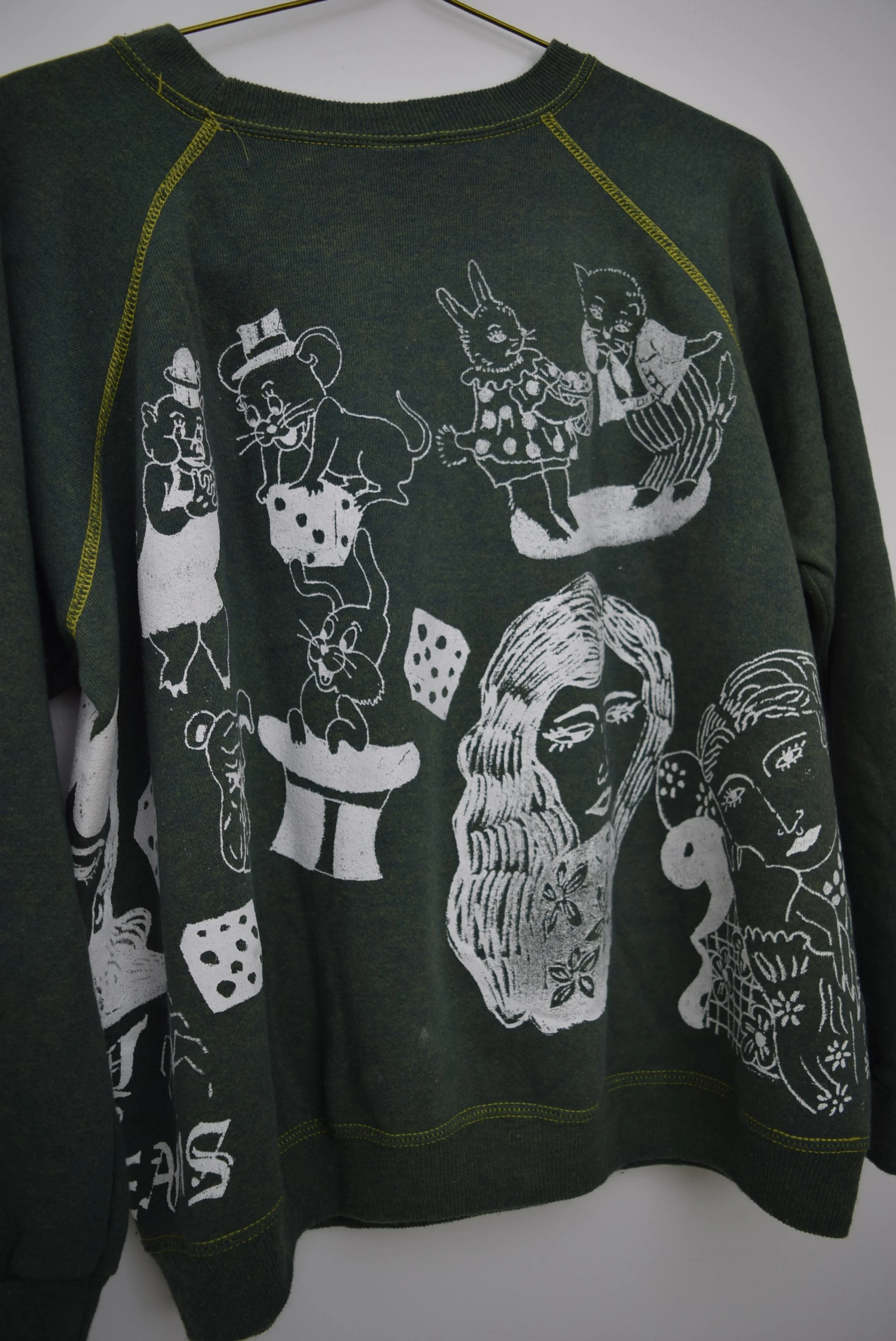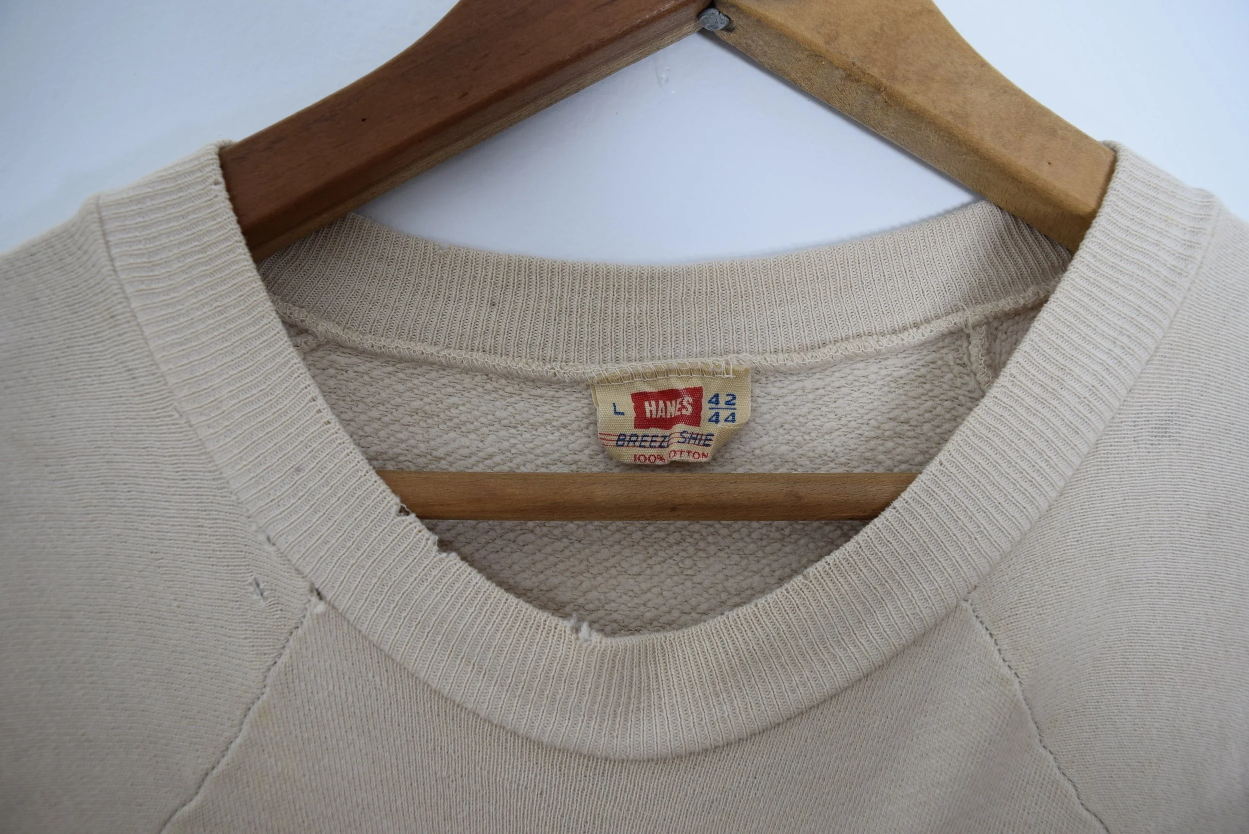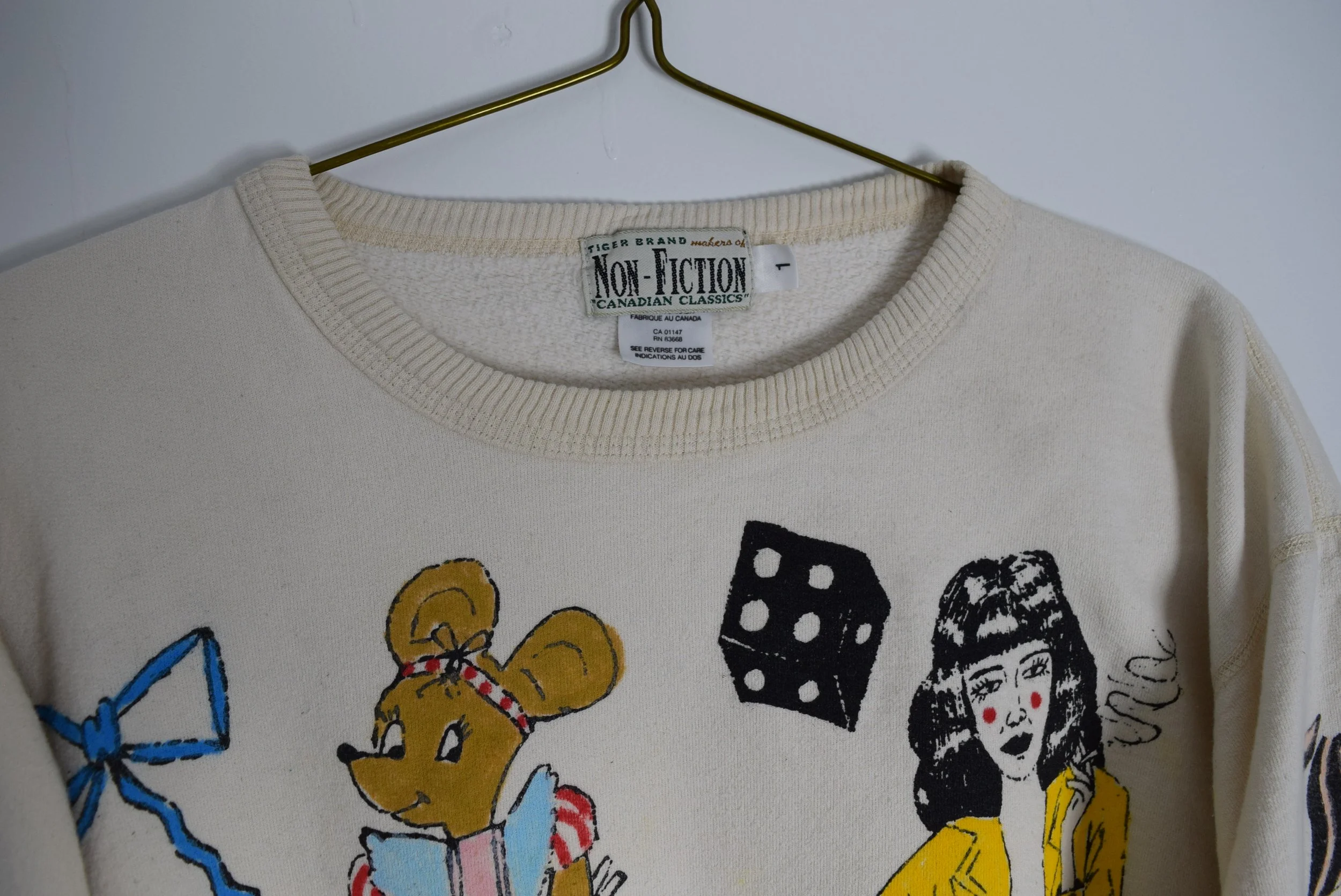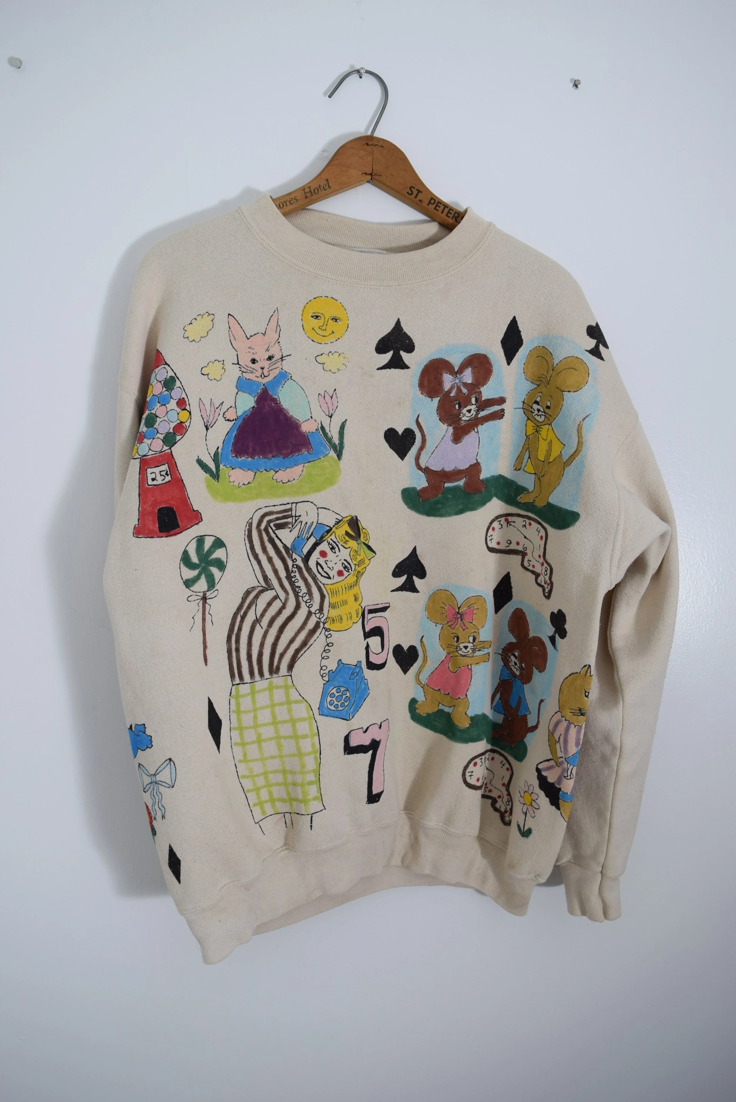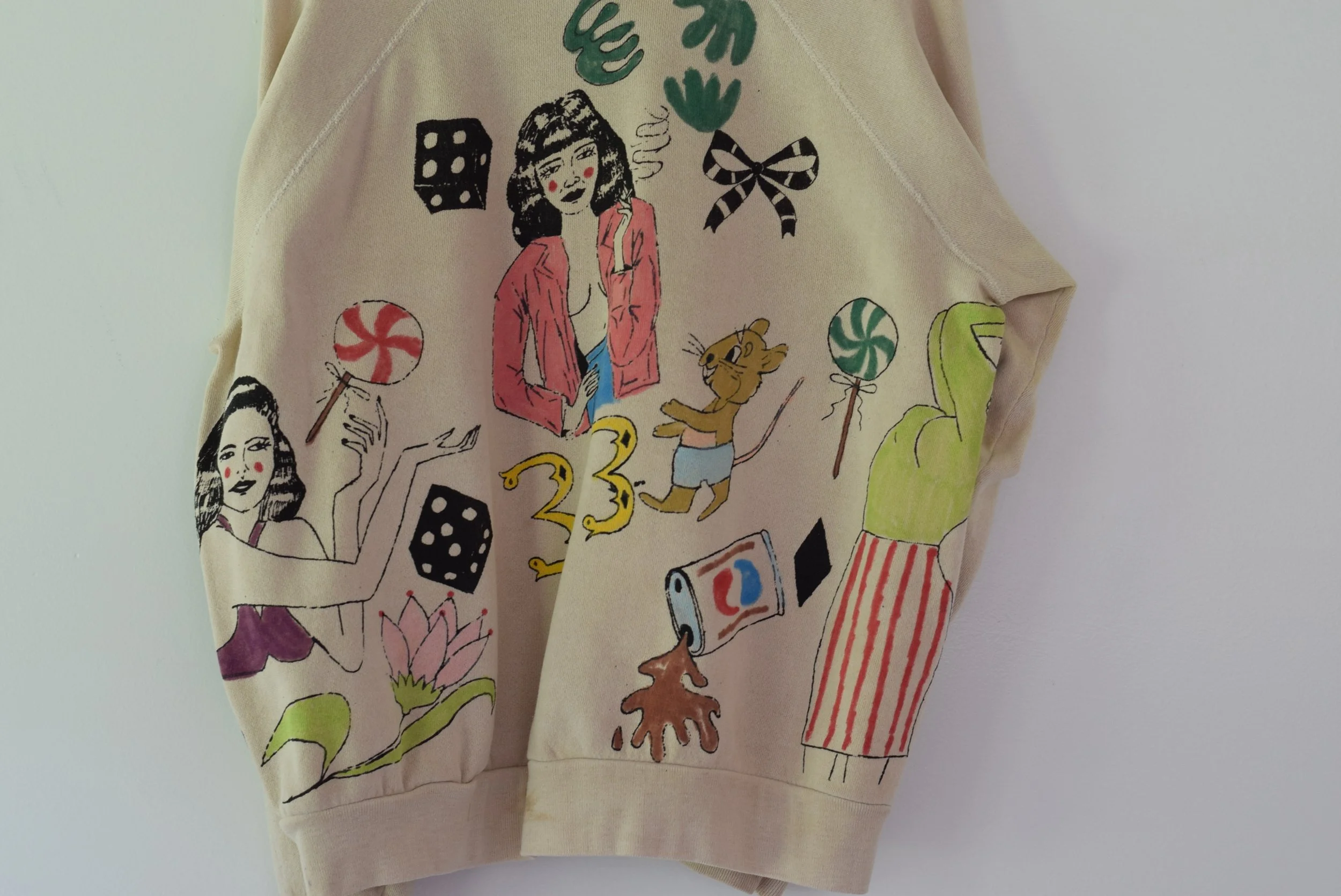 "Infinite Mystery" off white hand drawn + screen printed vintage sweatshirt L