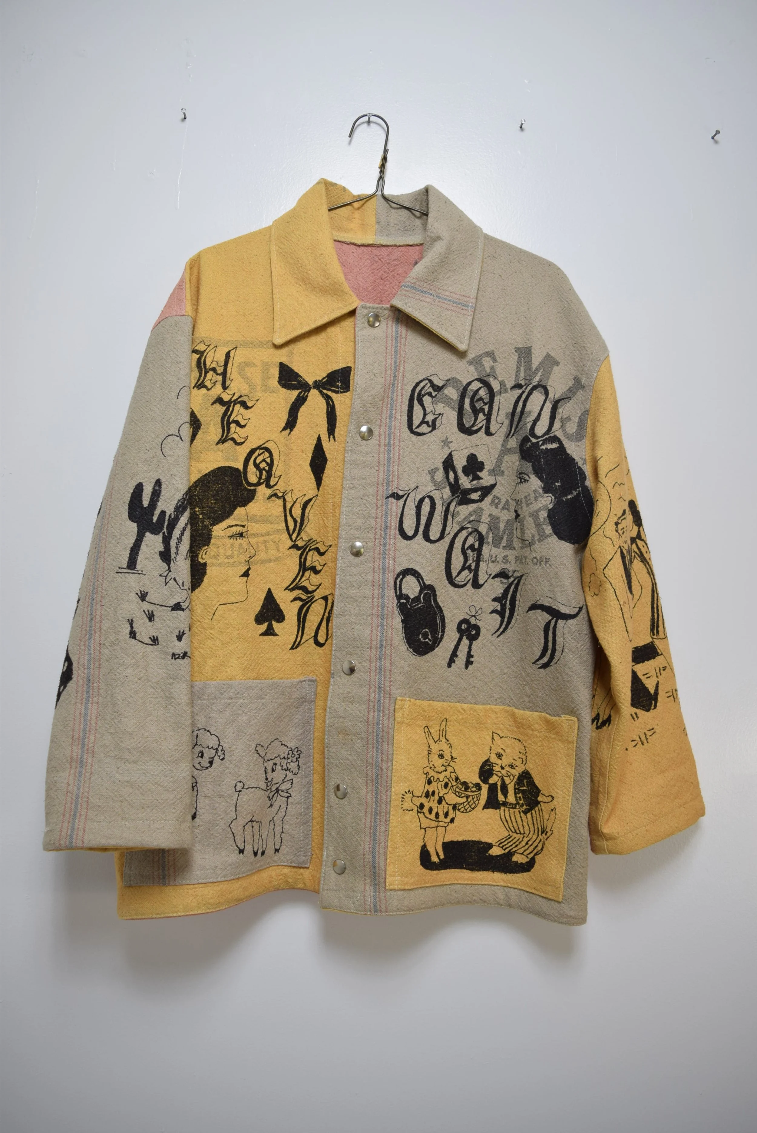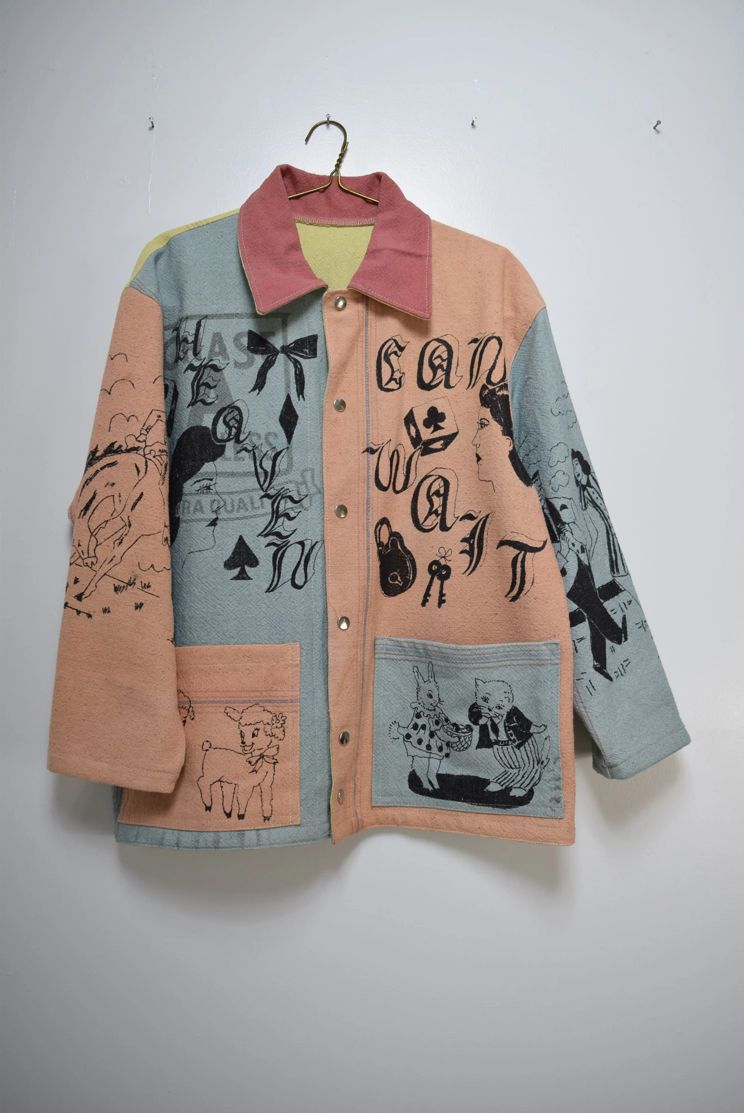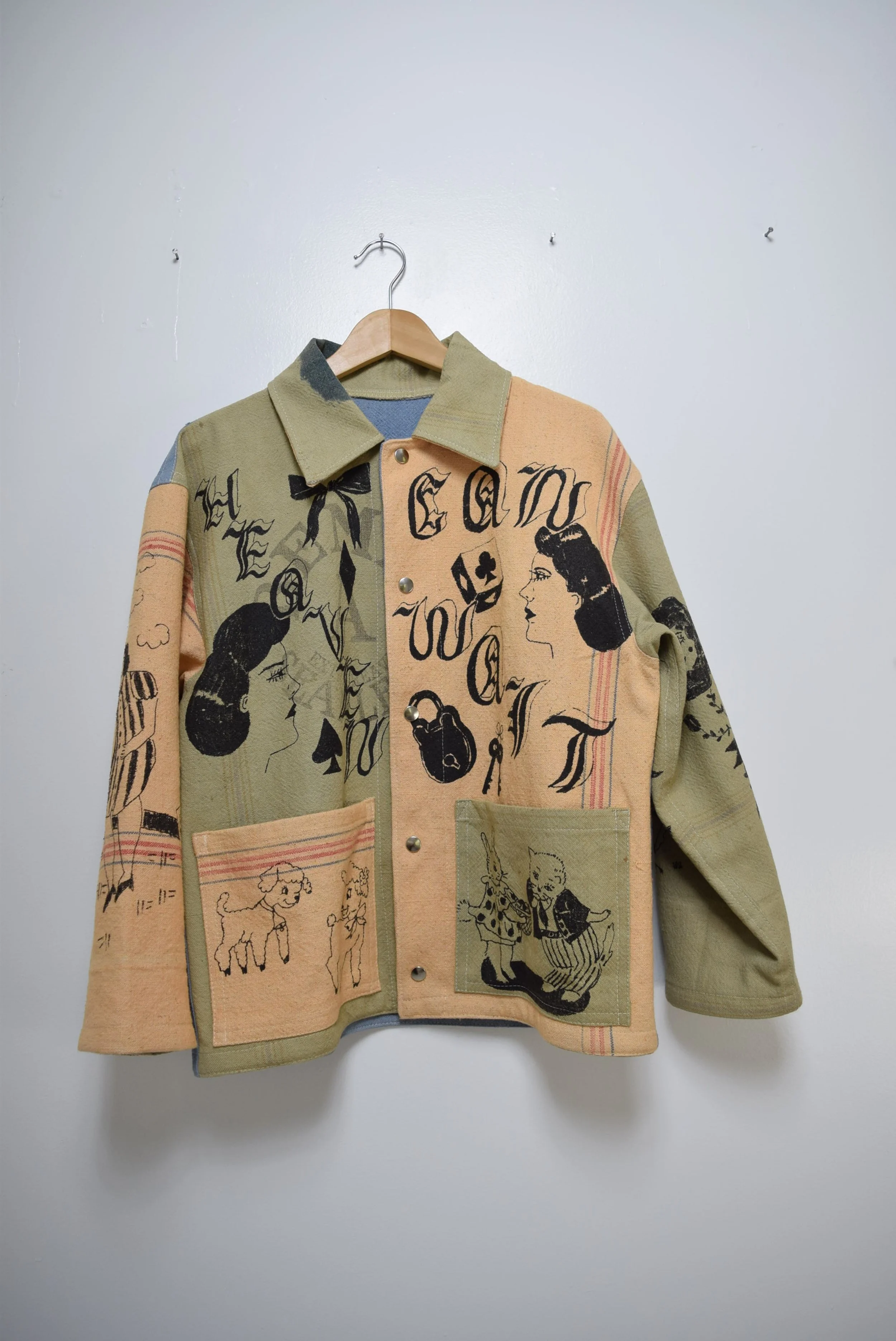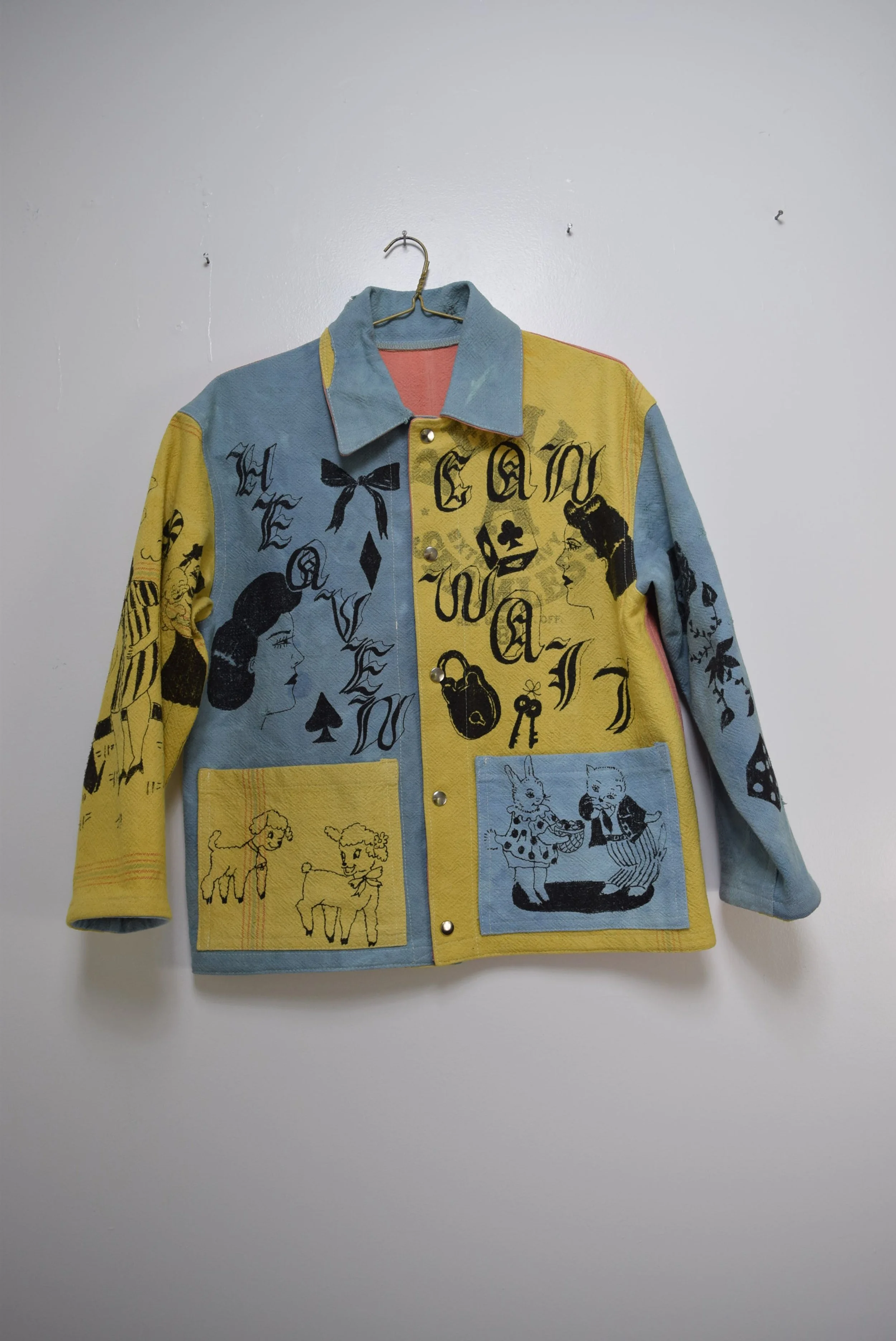 "Heaven can Wait" screen printed colorblock cotton feedsack chore coat Size Small