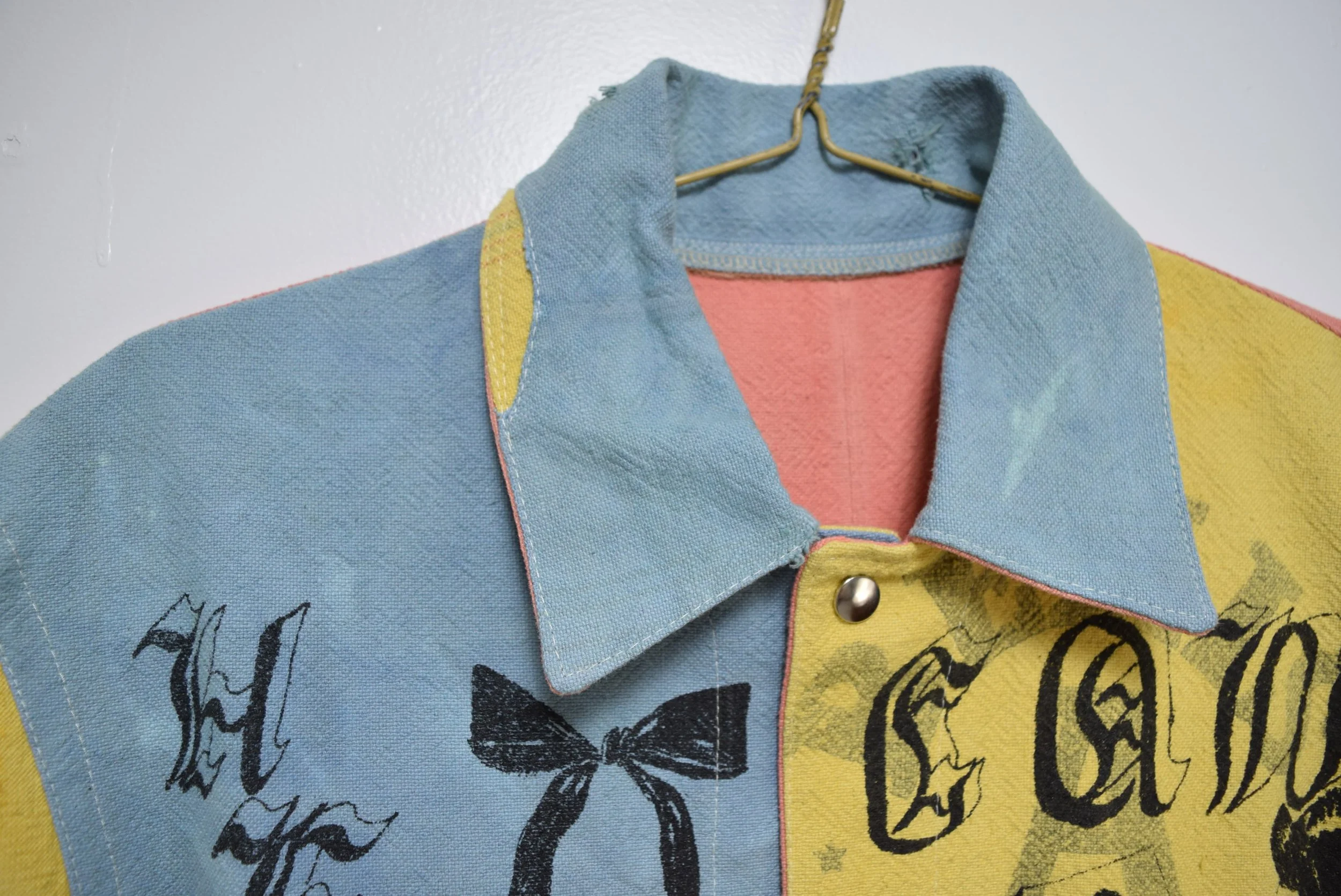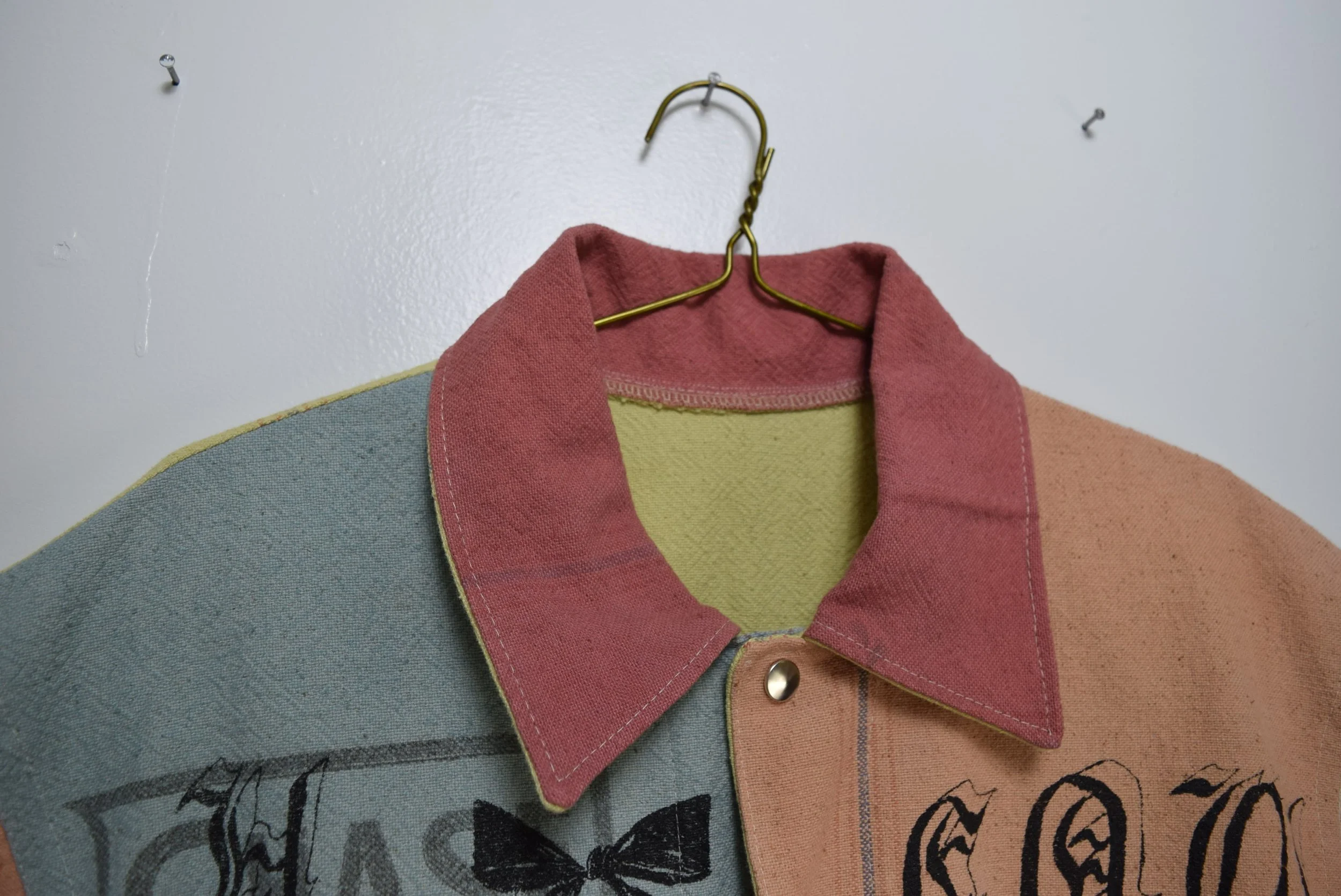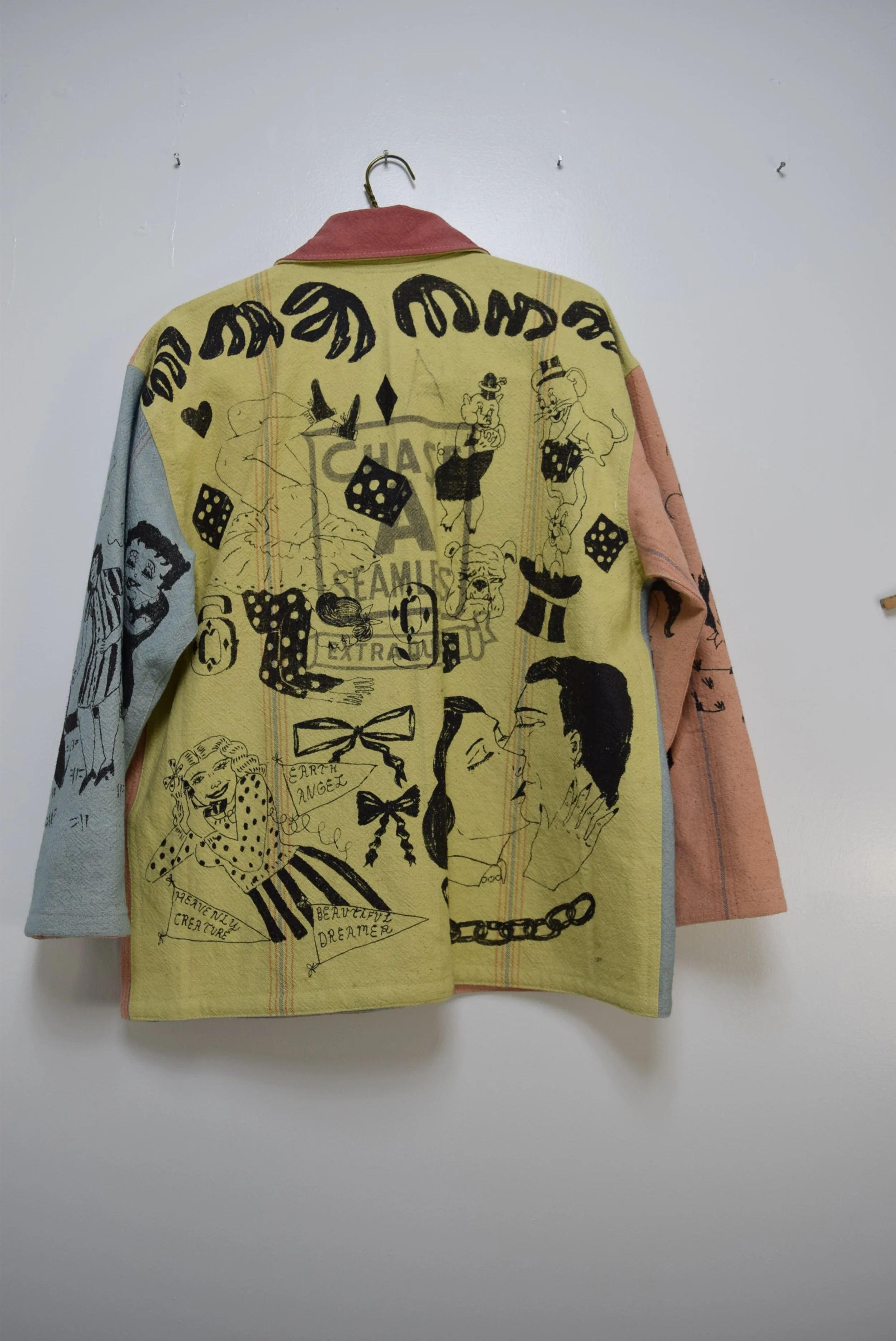 "Heaven can Wait" screen printed colorblock cotton feedsack chore coat Size Small