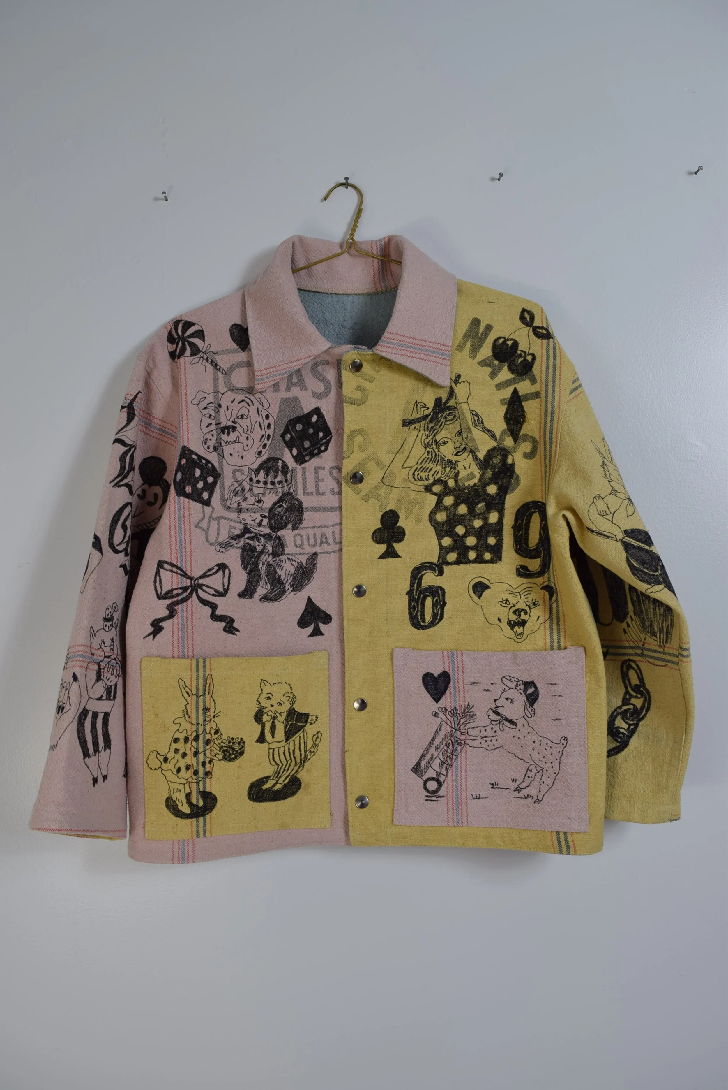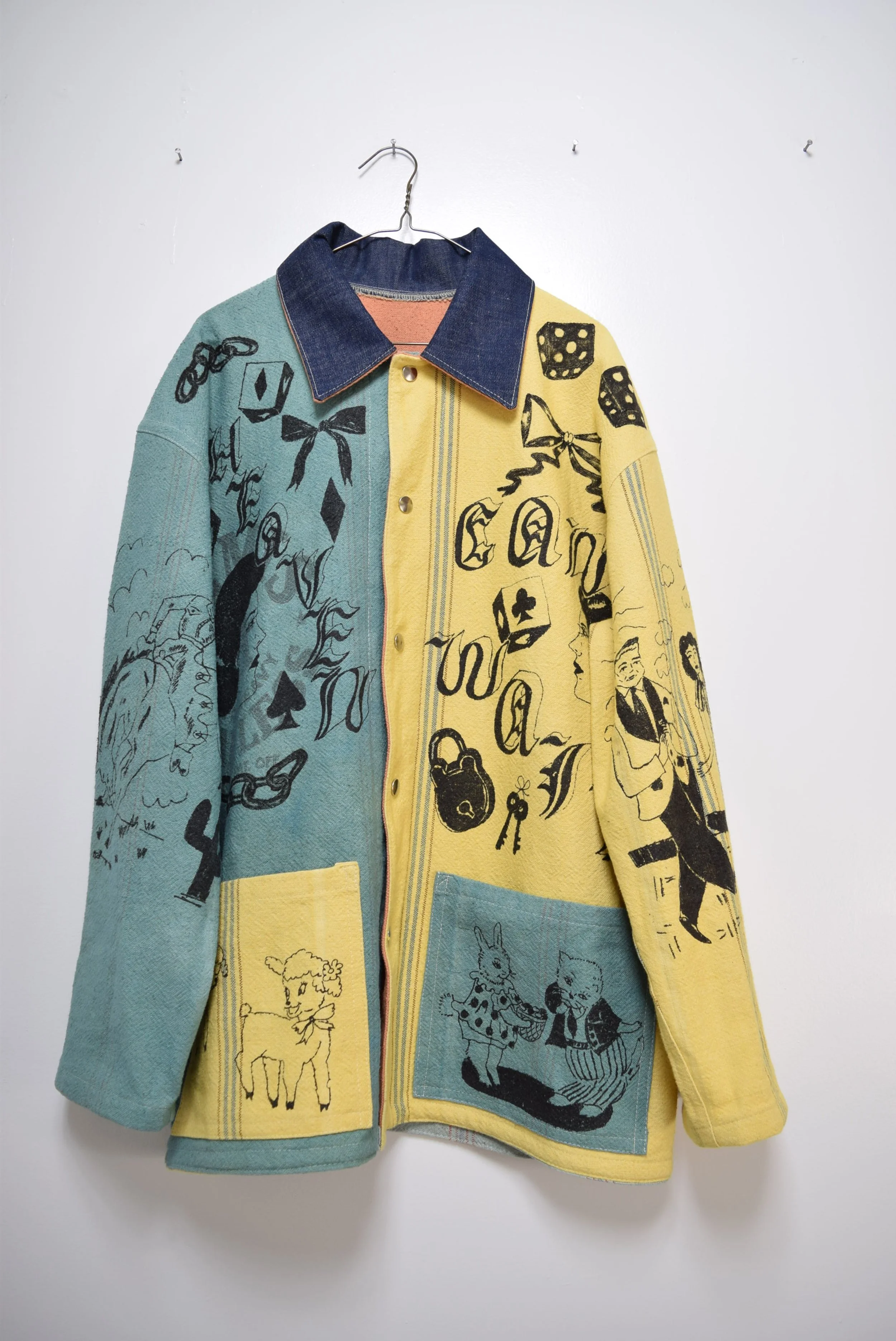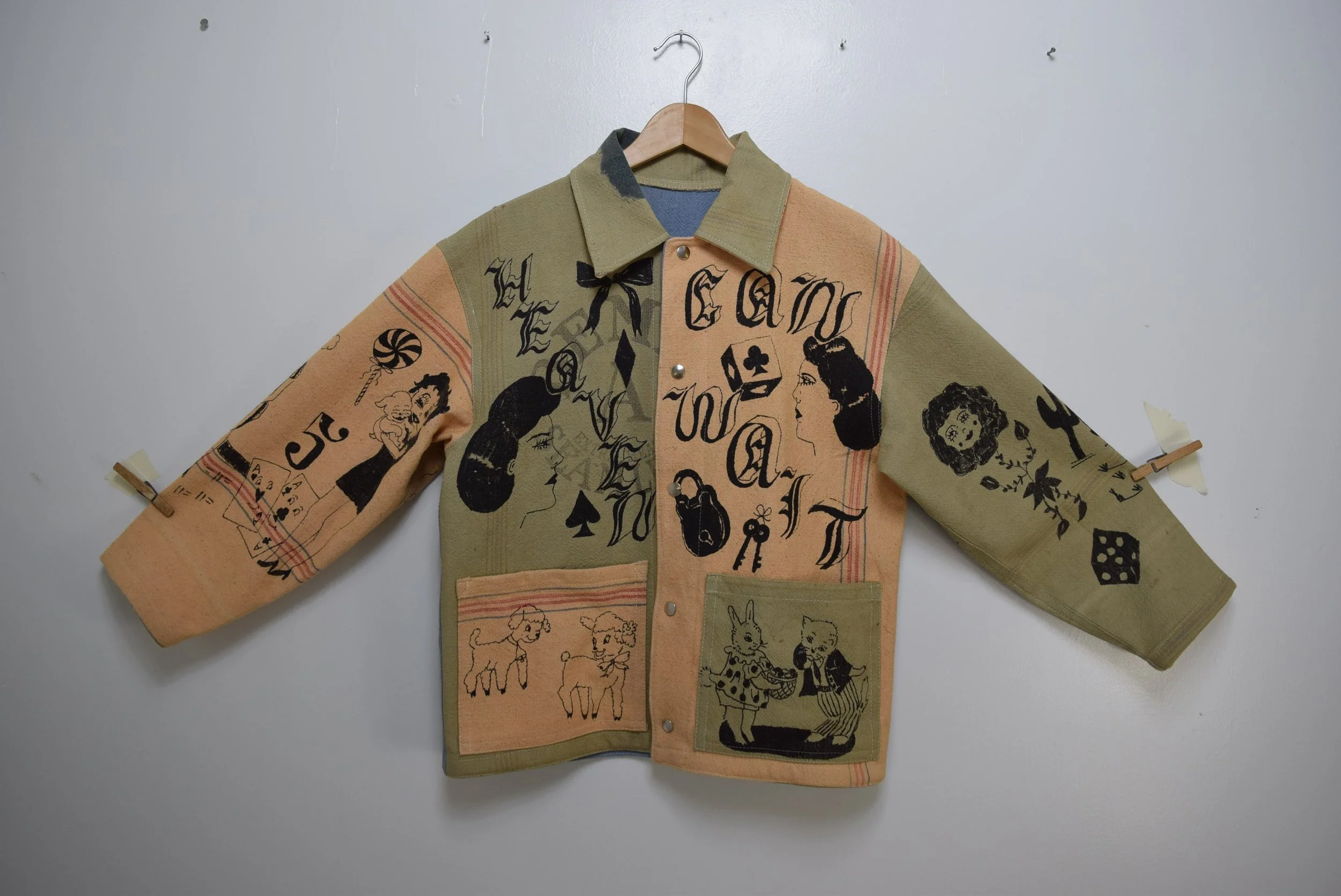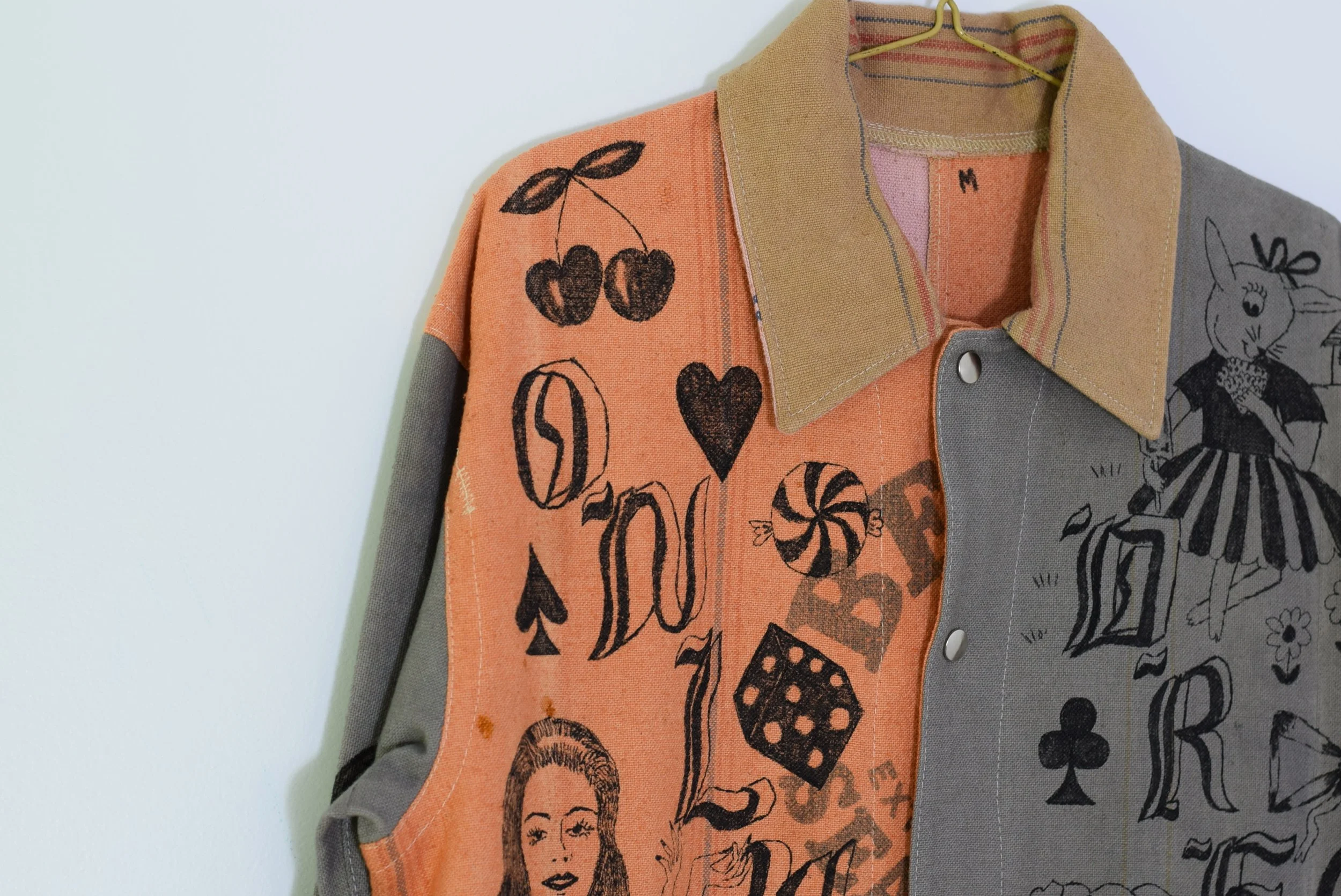 "Heaven can Wait" screen printed colorblock cotton feedsack chore coat Size Small