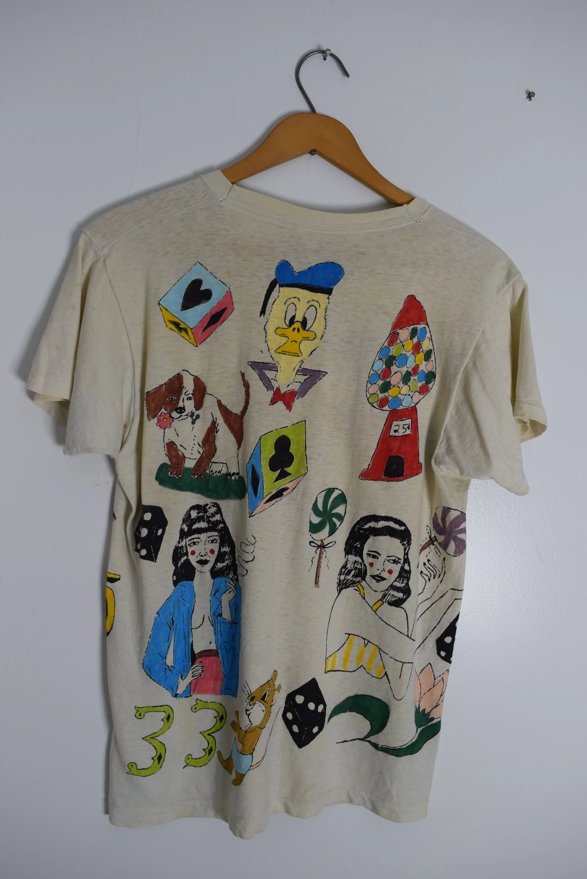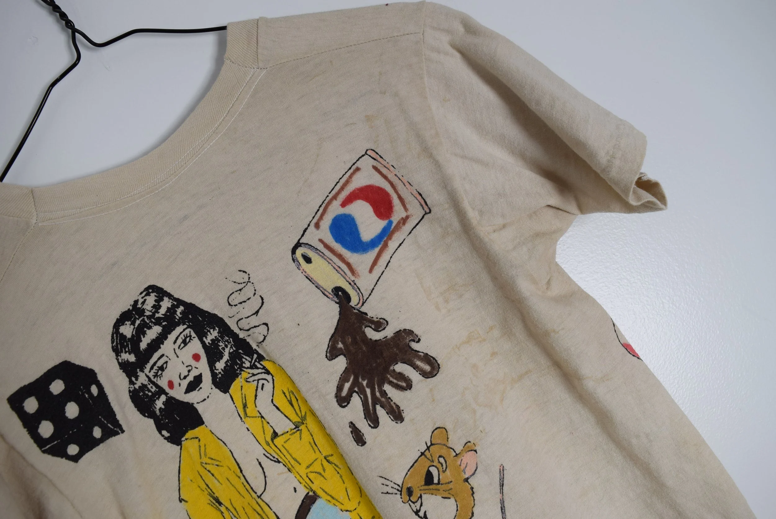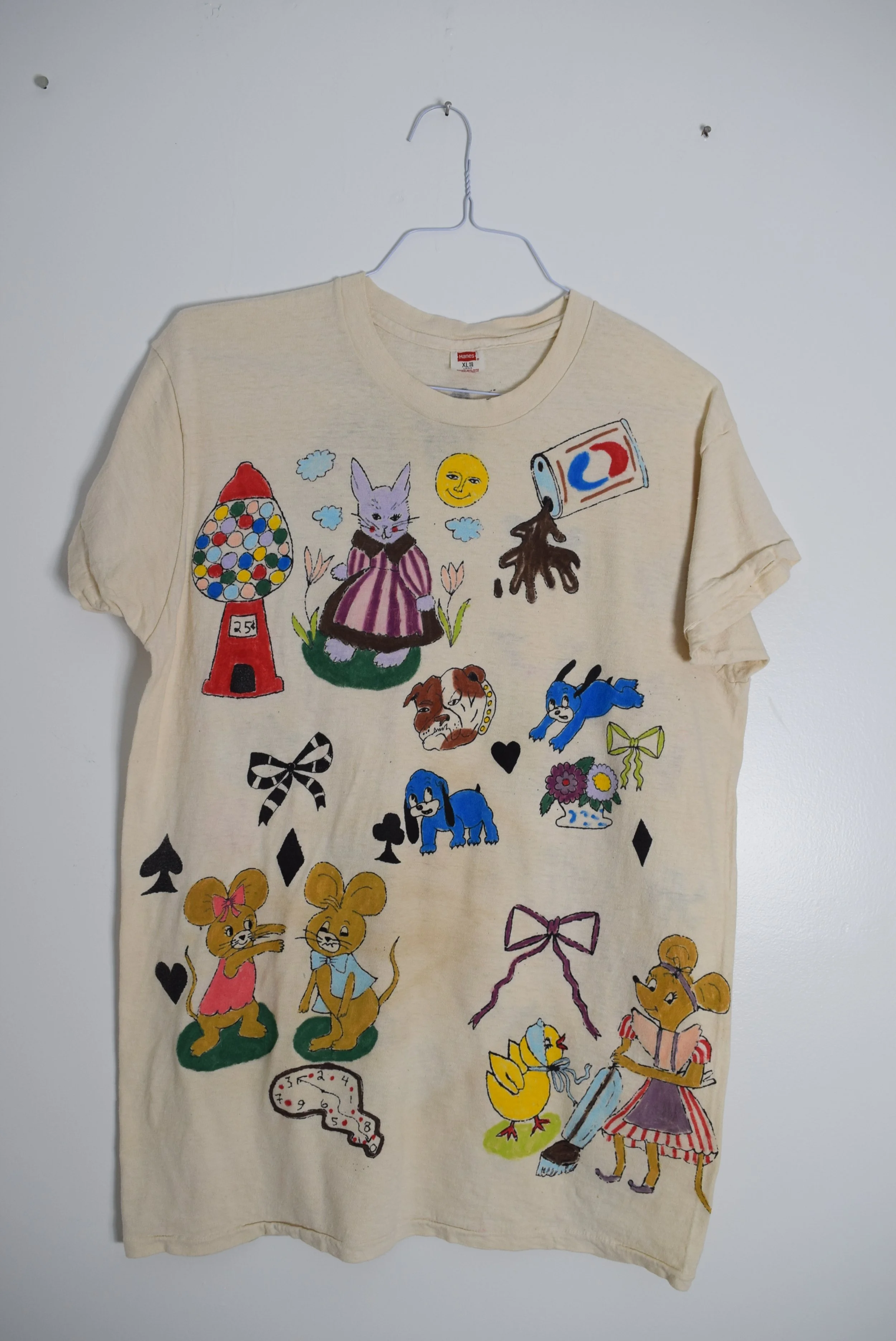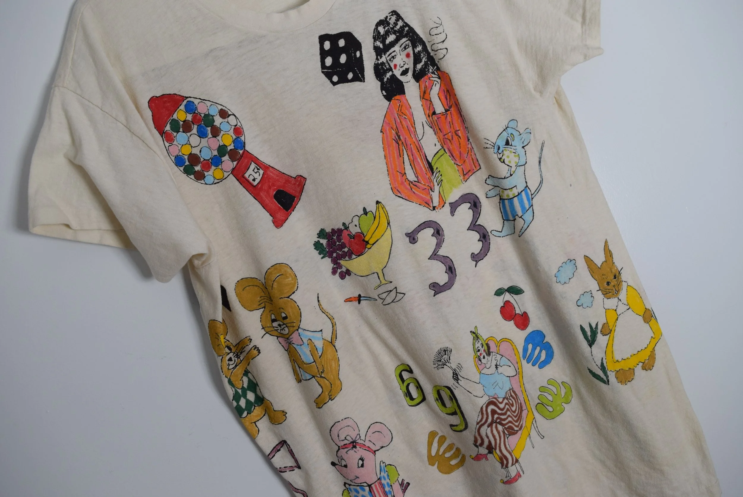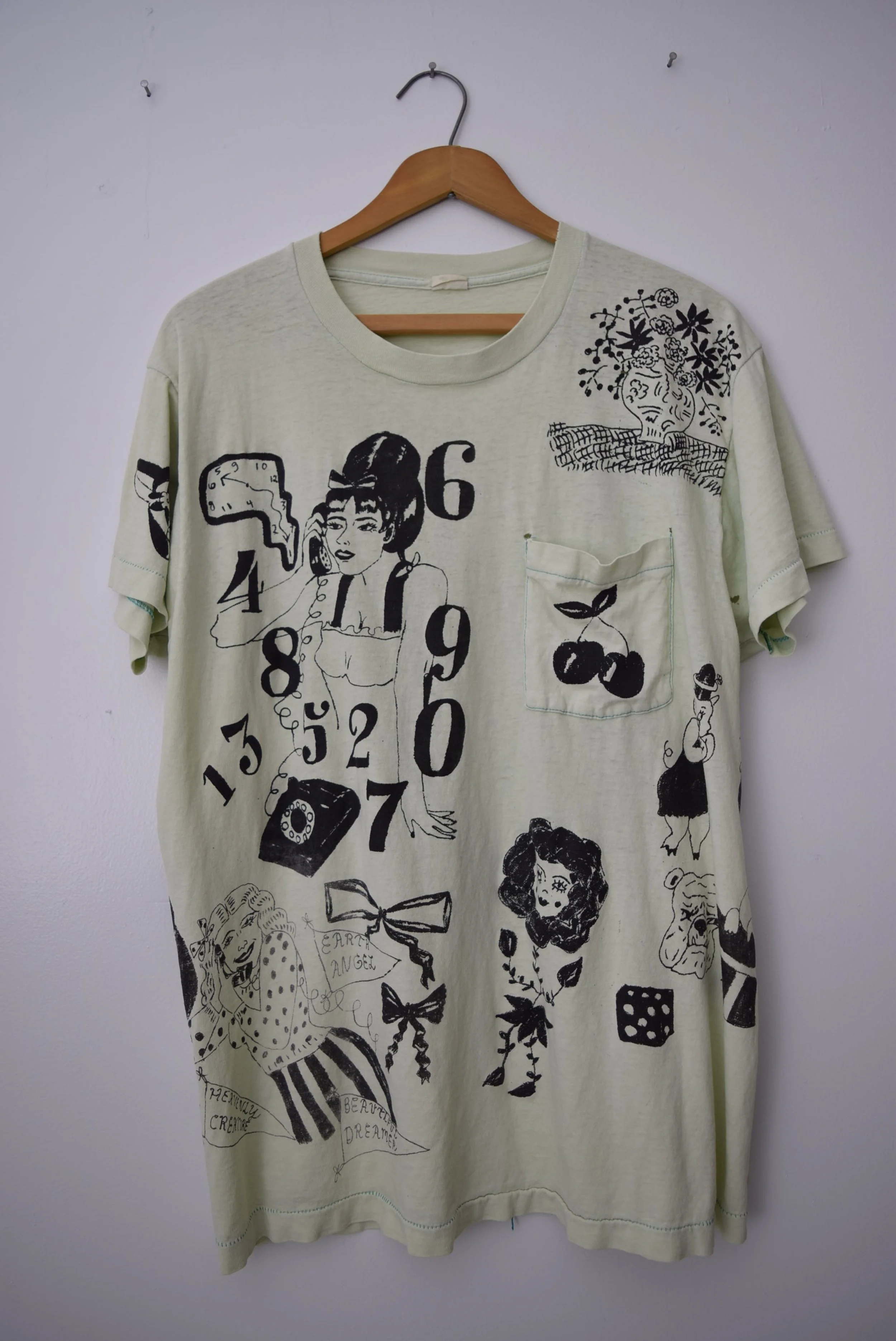 hand drawn + screen printed all over print off white vintage Tee S/M