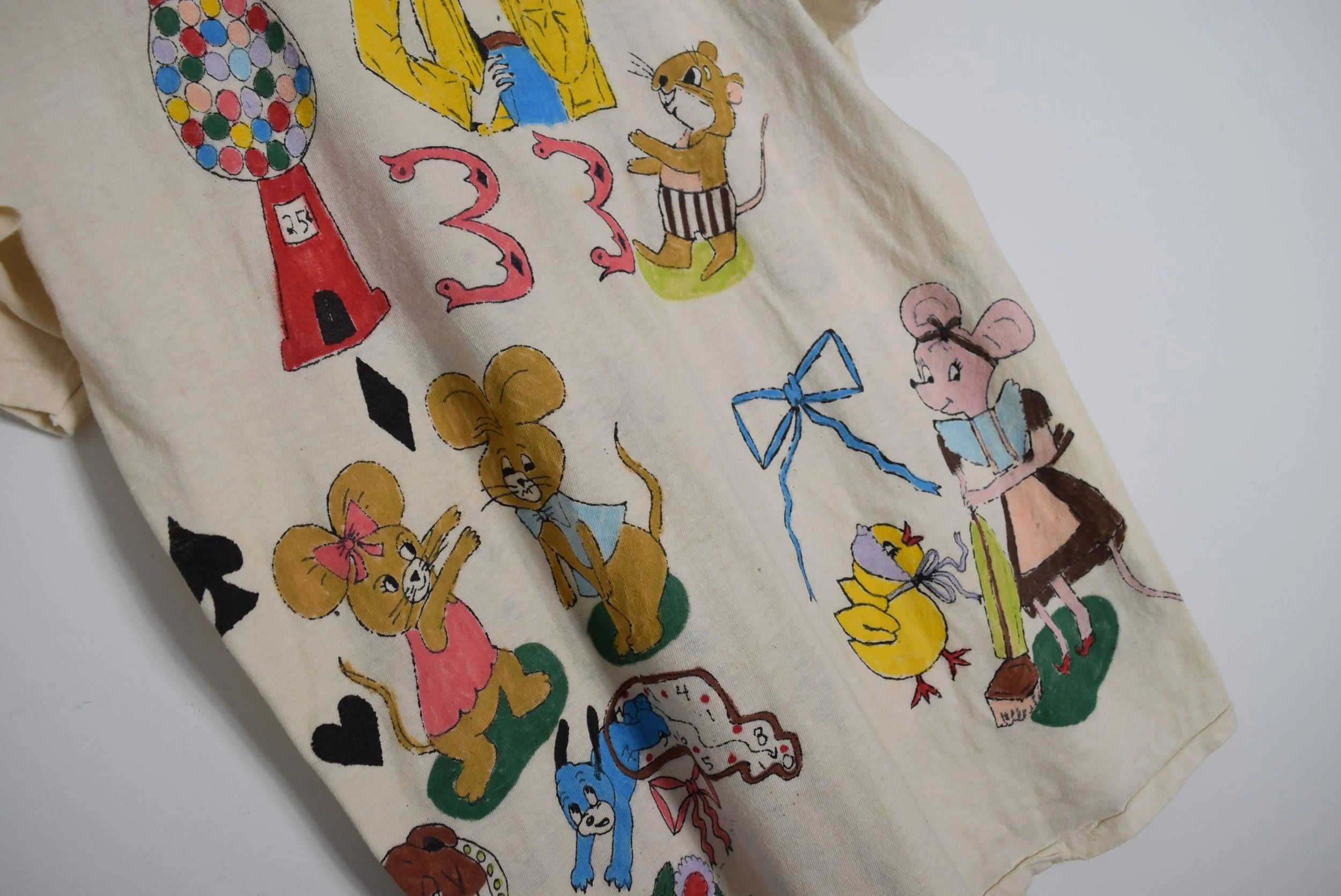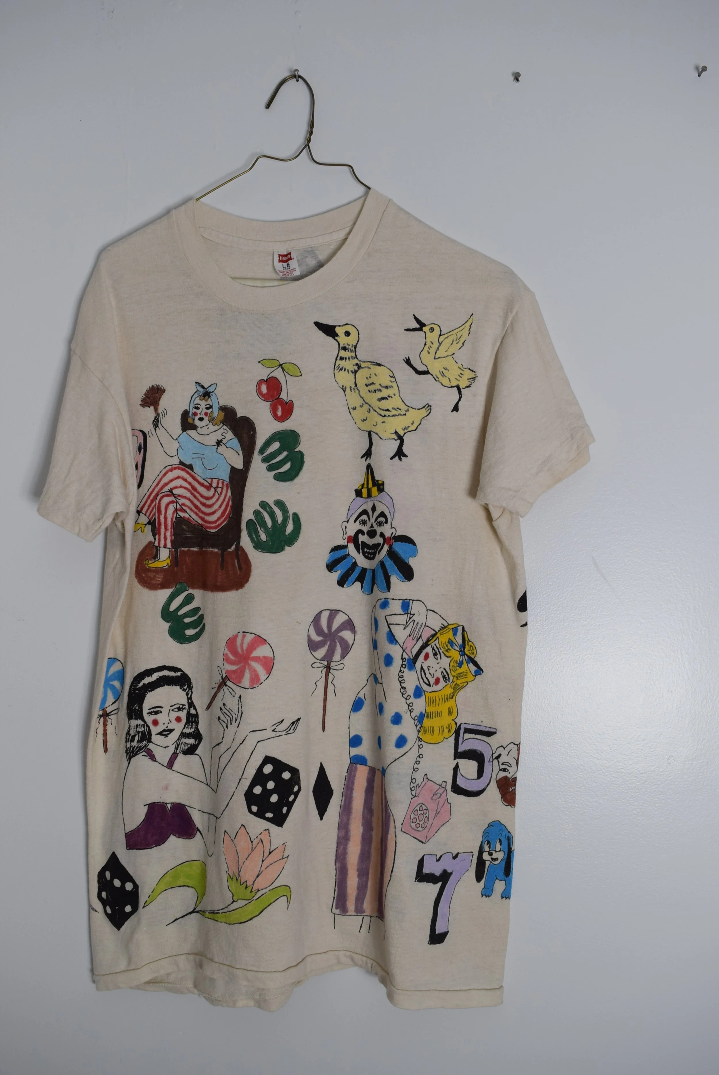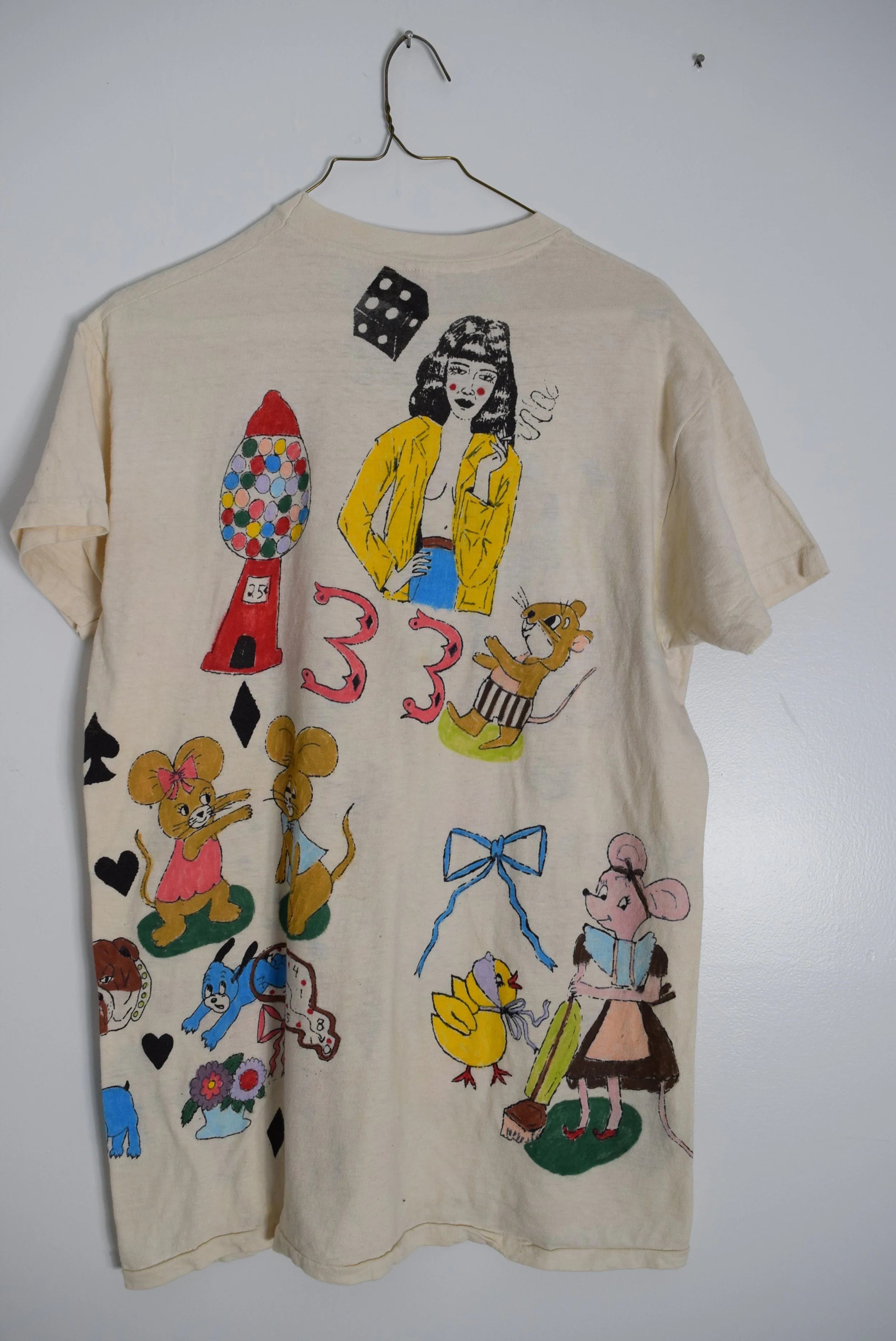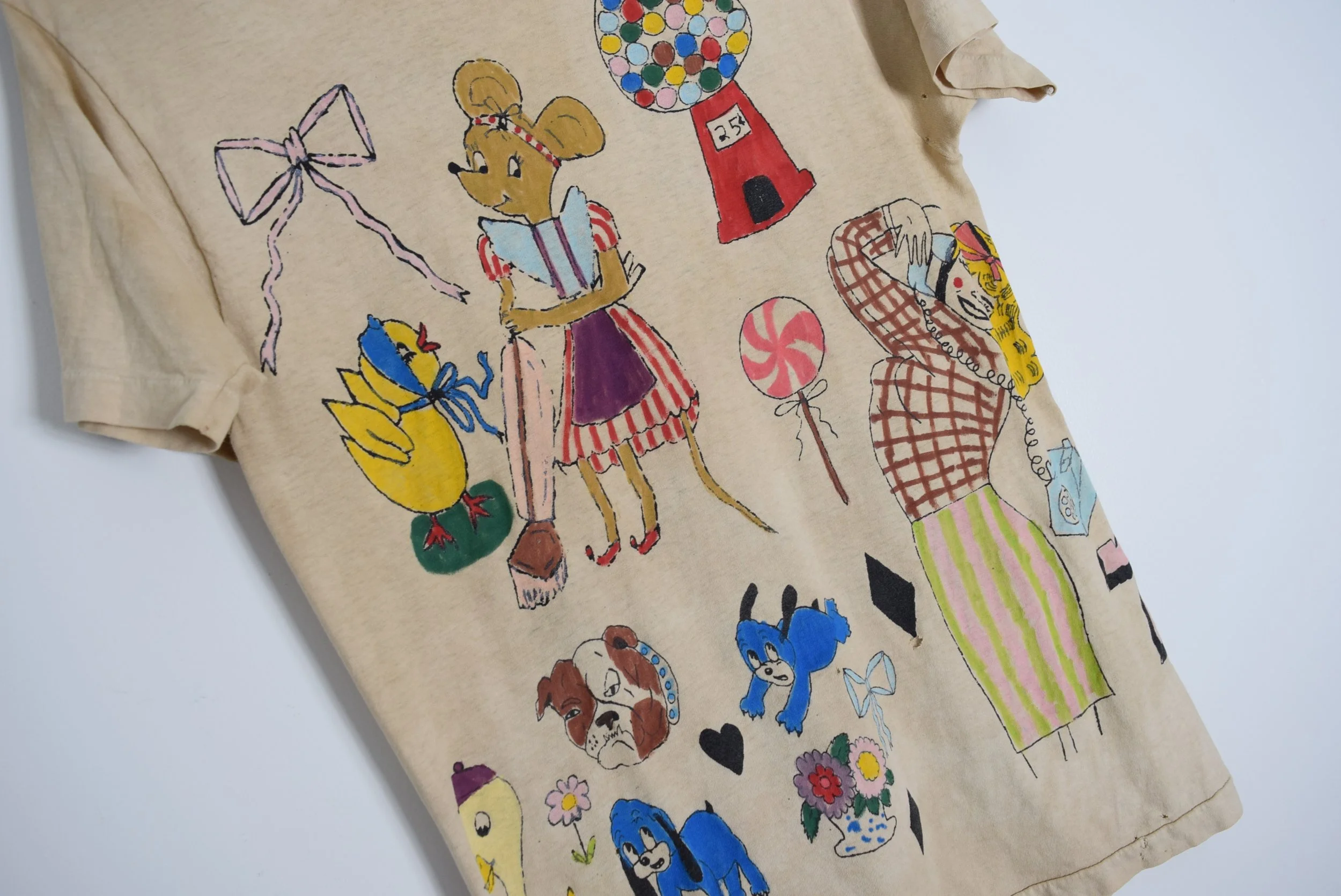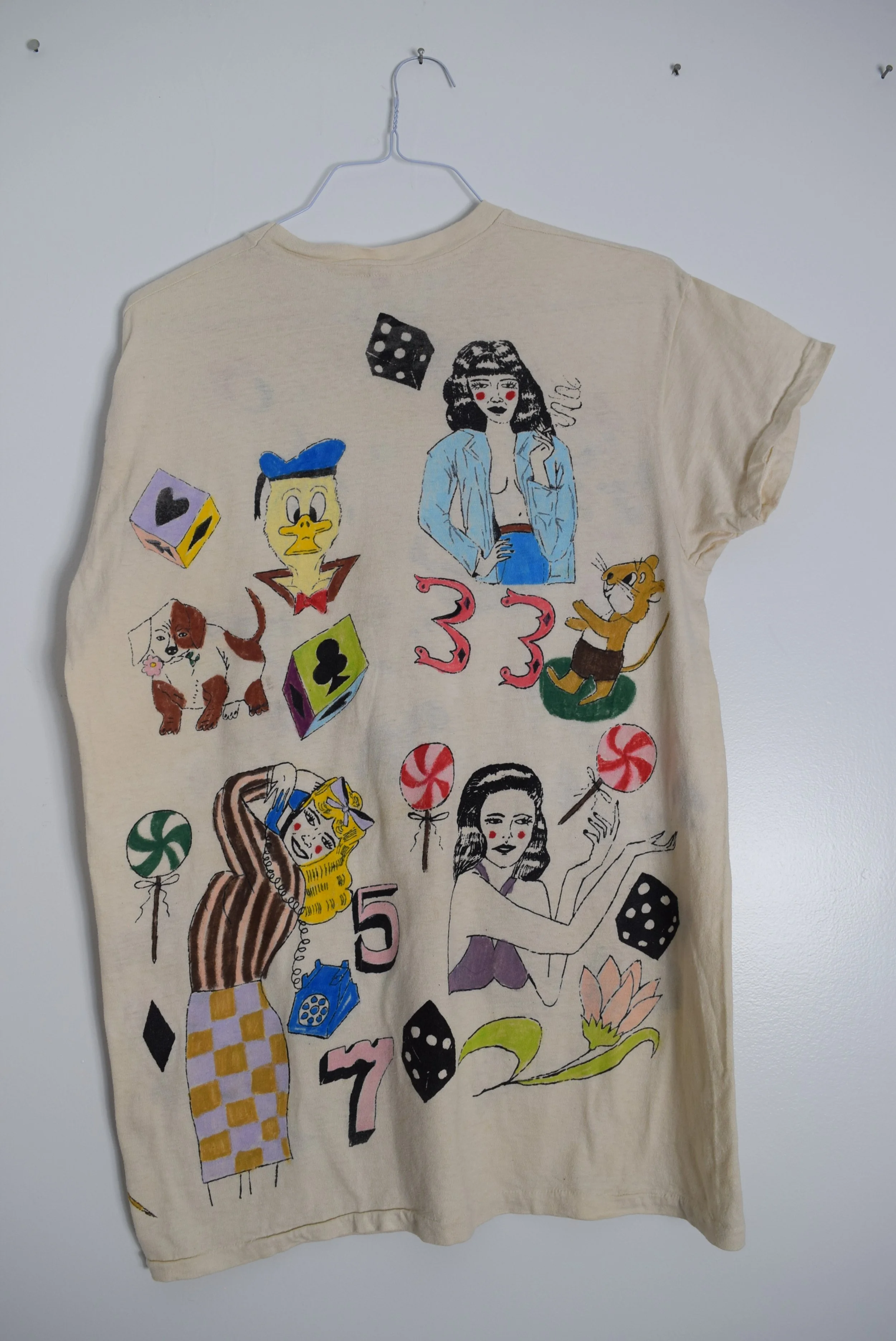 hand drawn + screen printed all over print off white vintage Tee S/M