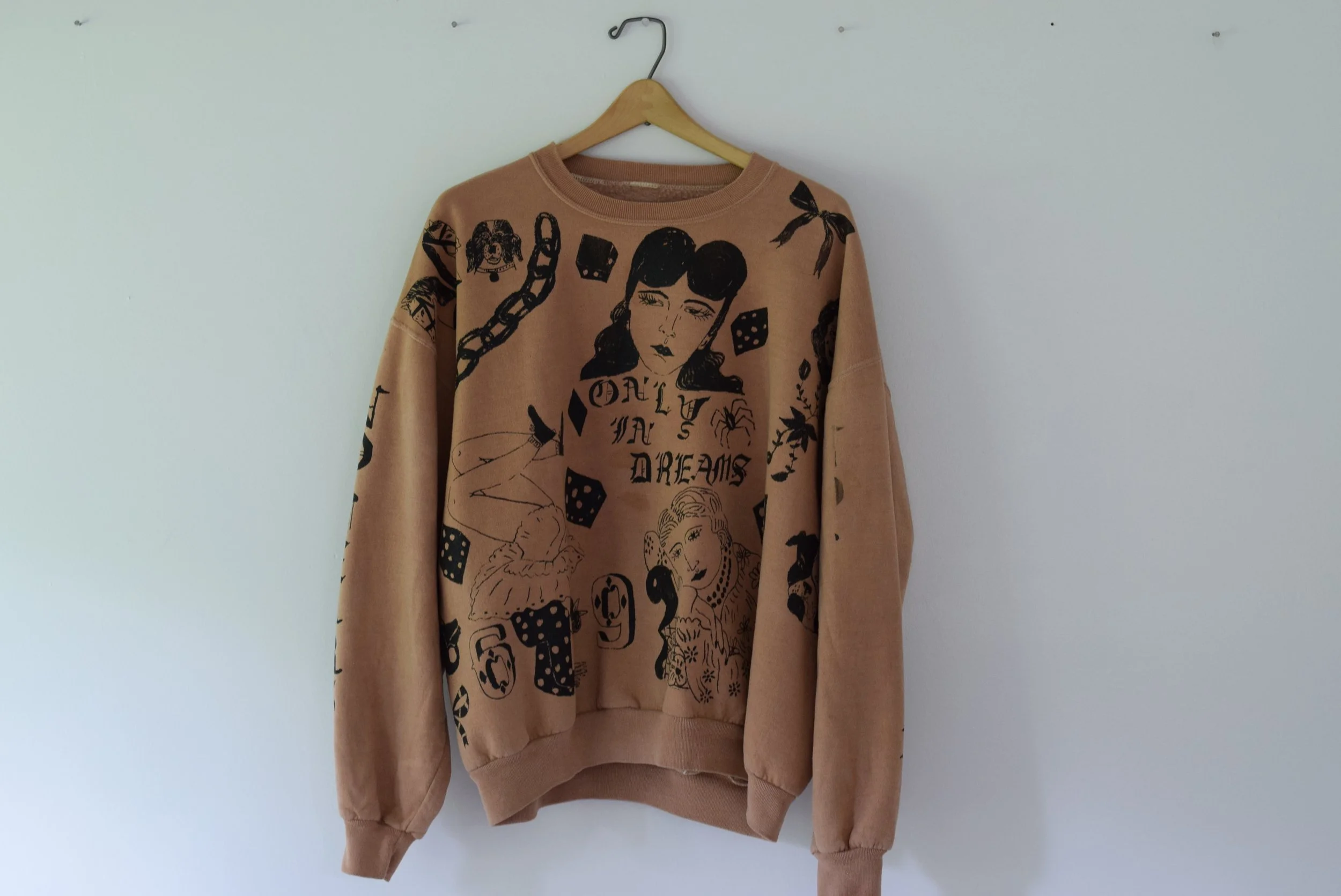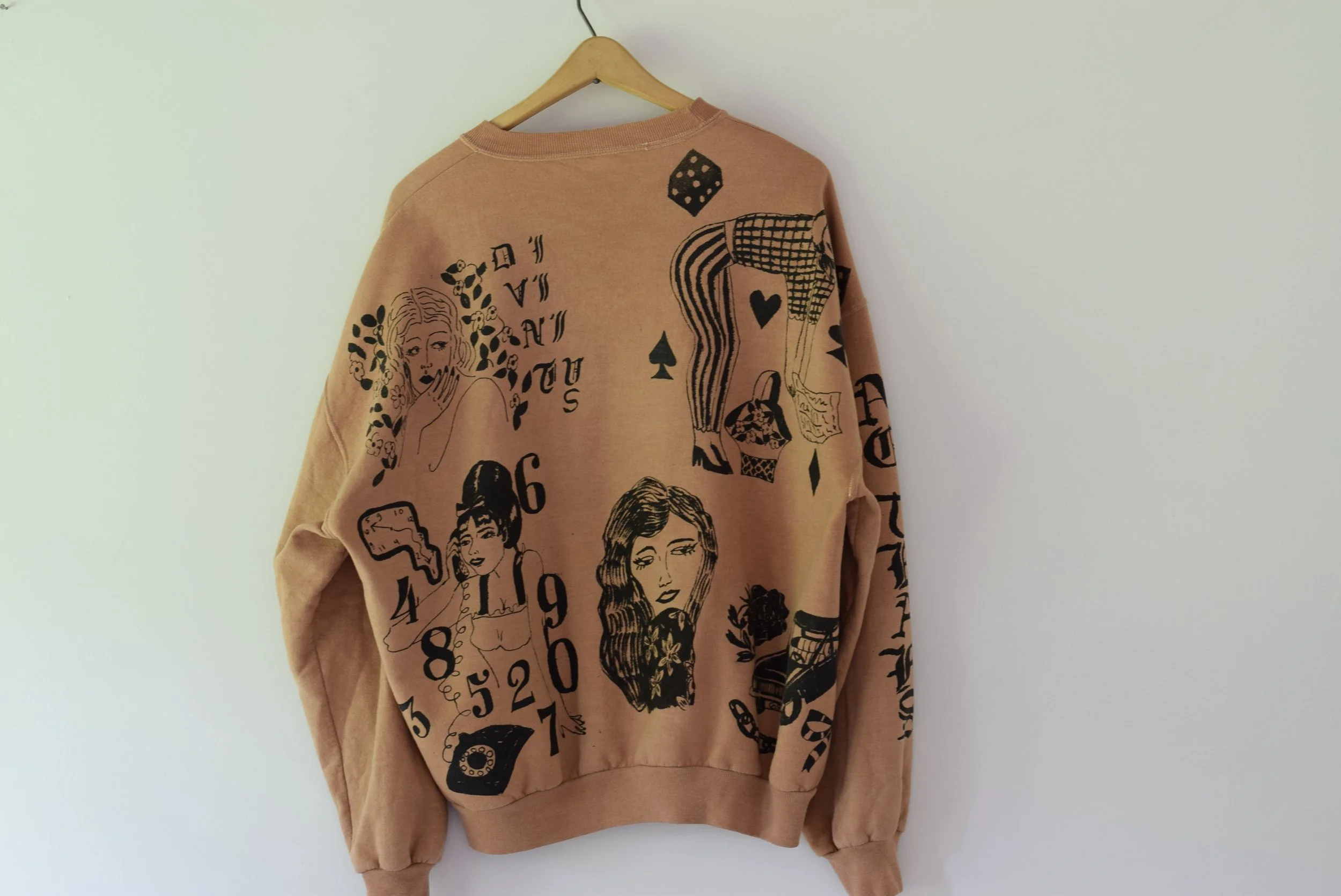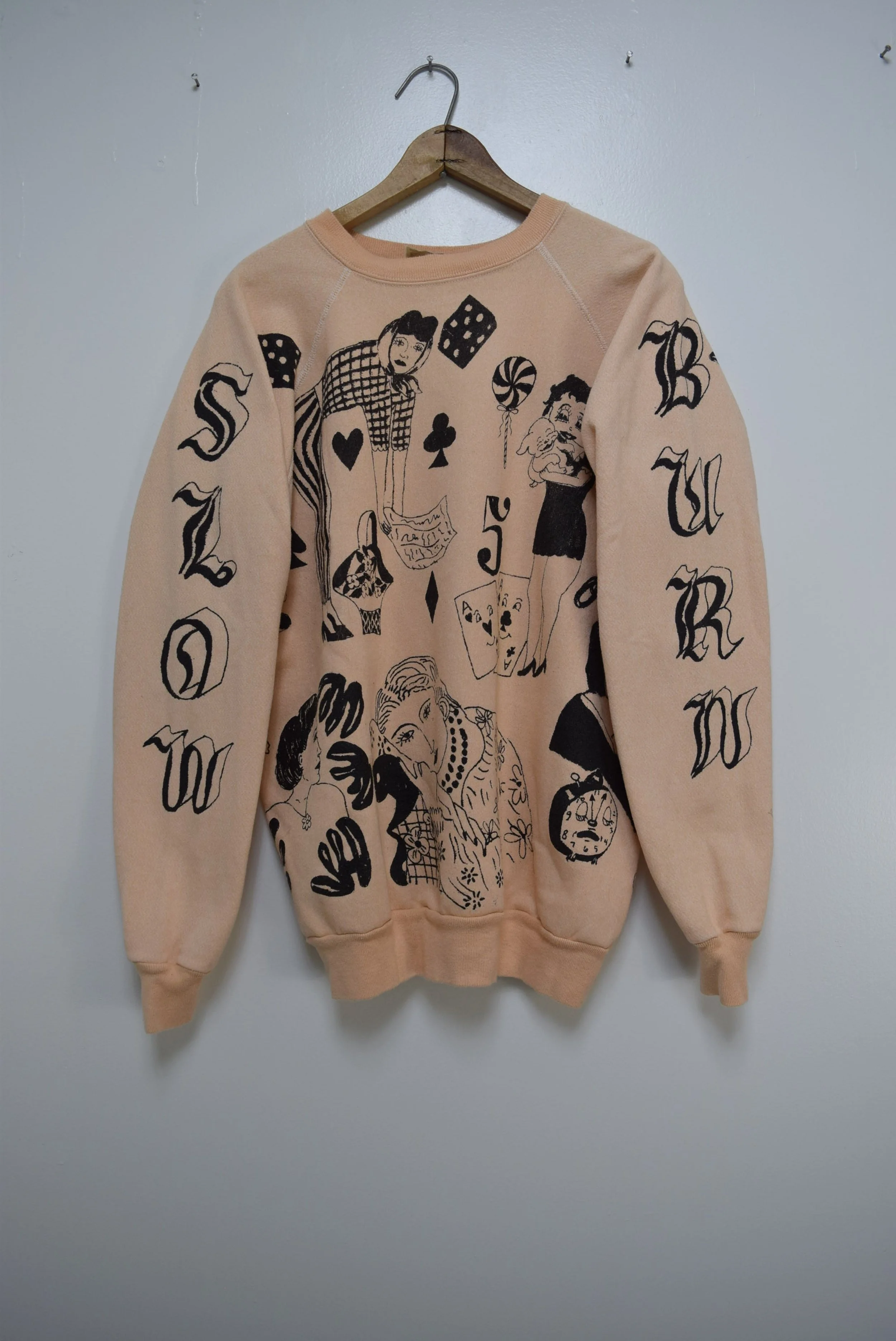 "Slow Burn" camel screen printed vintage sweatshirt S/M