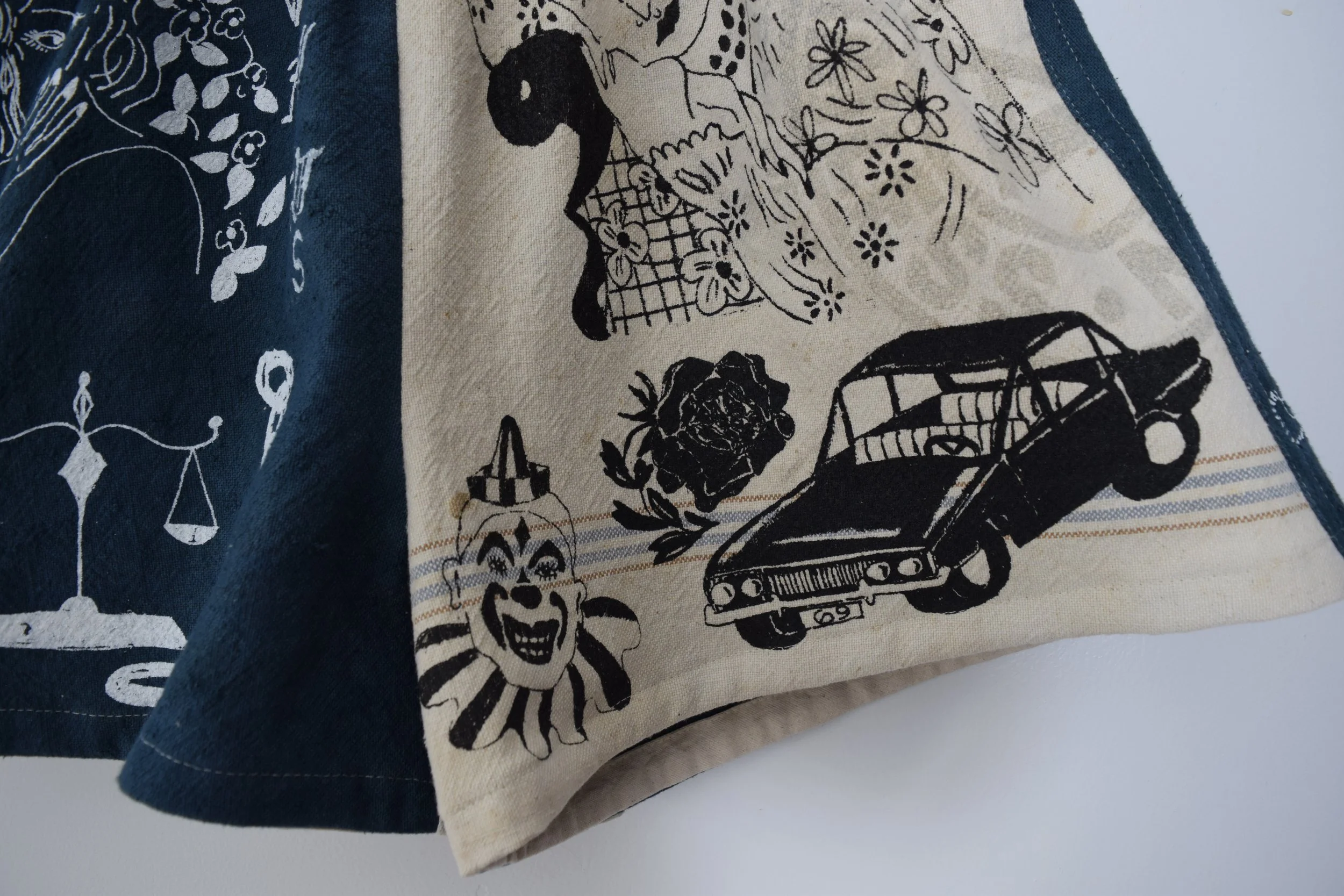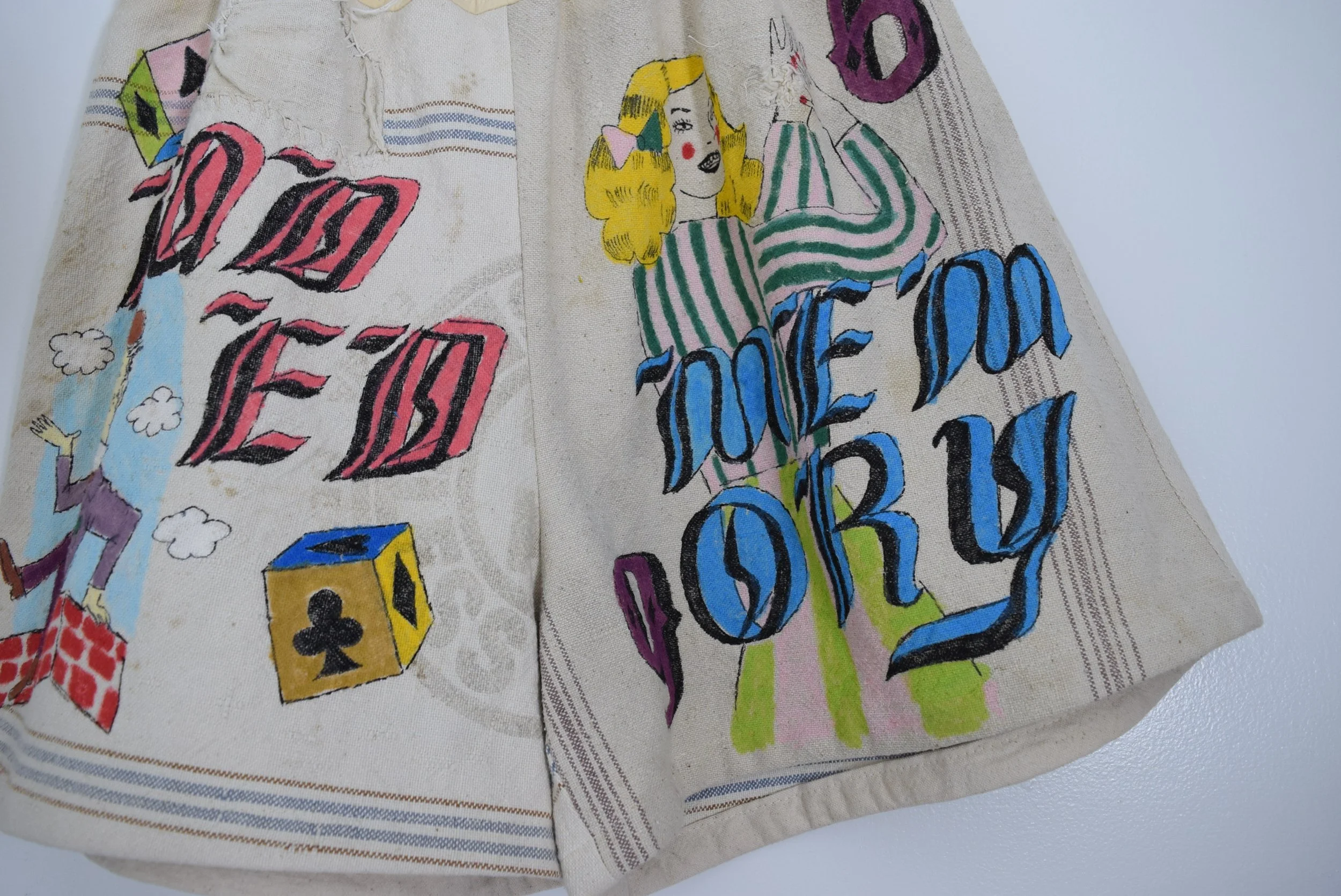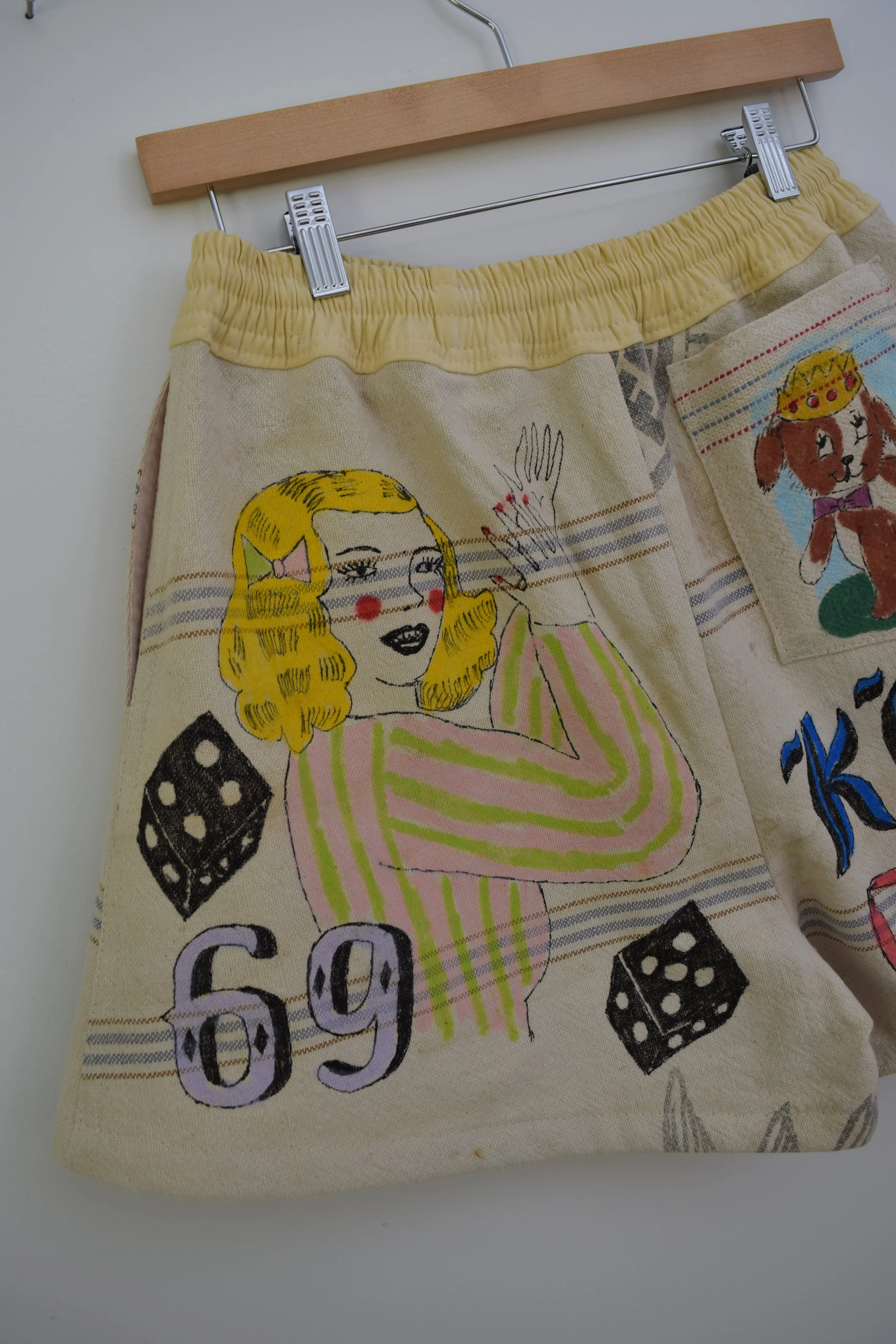 "heaven only knows" Hand Drawn Cotton Feedsack Shorts size M