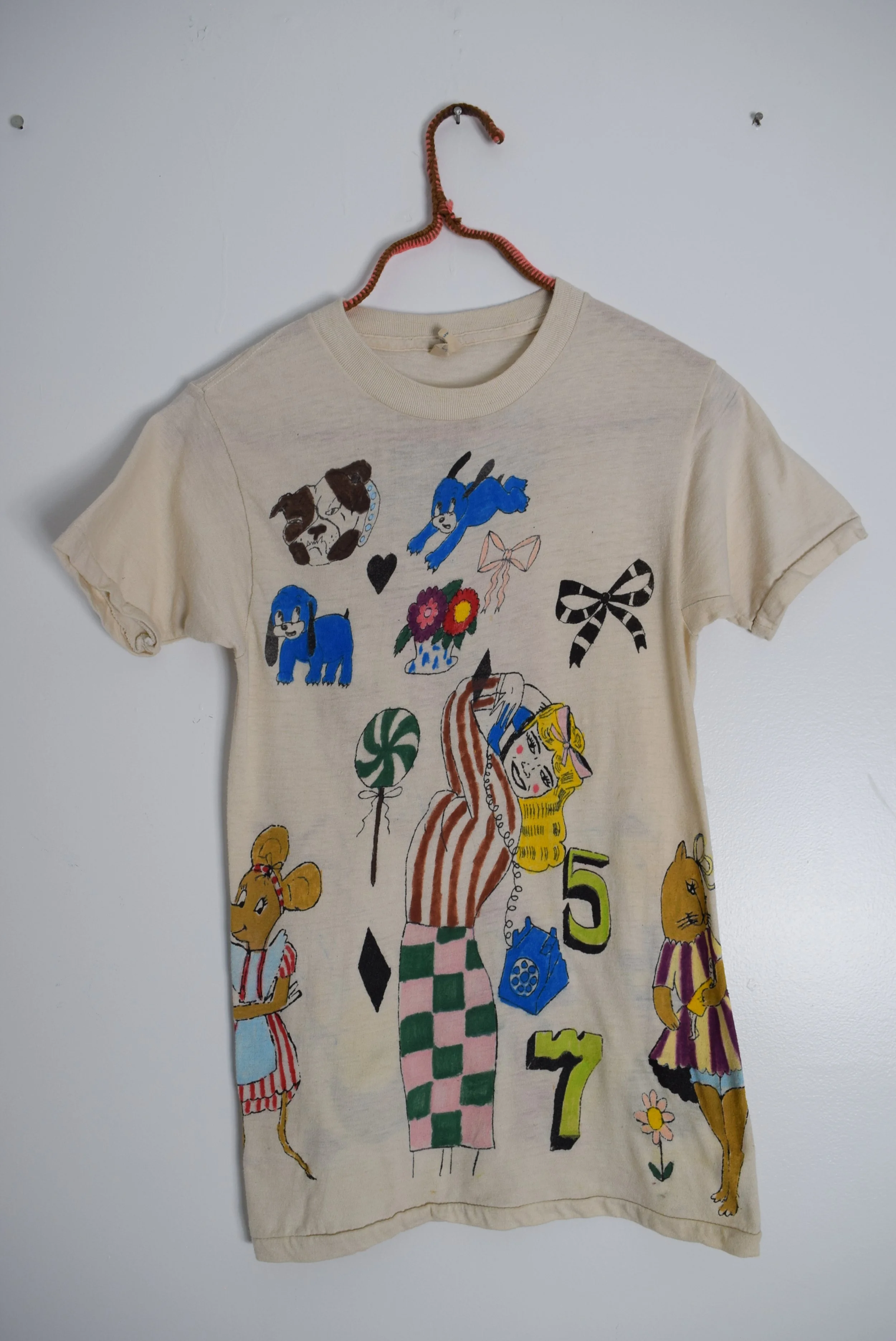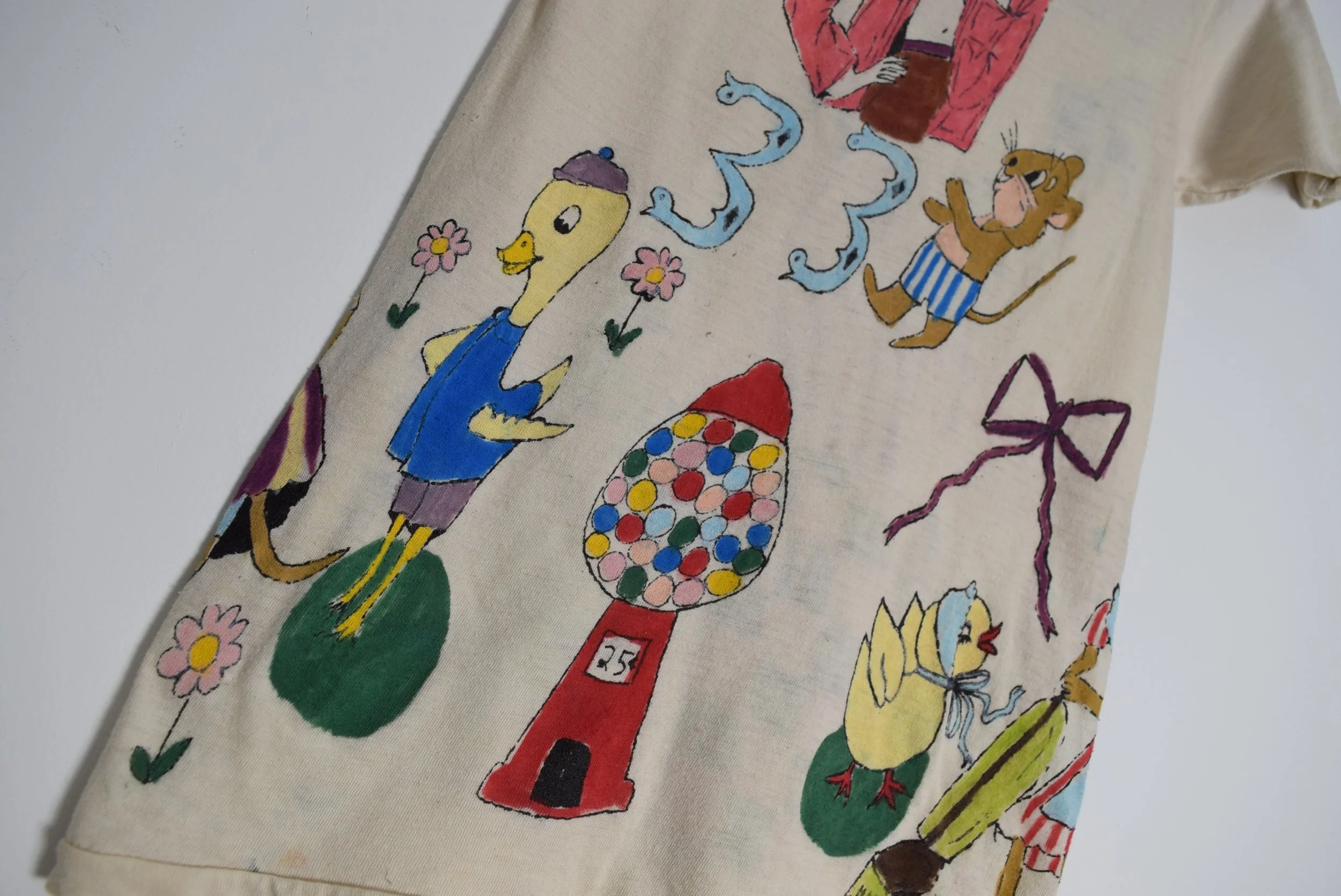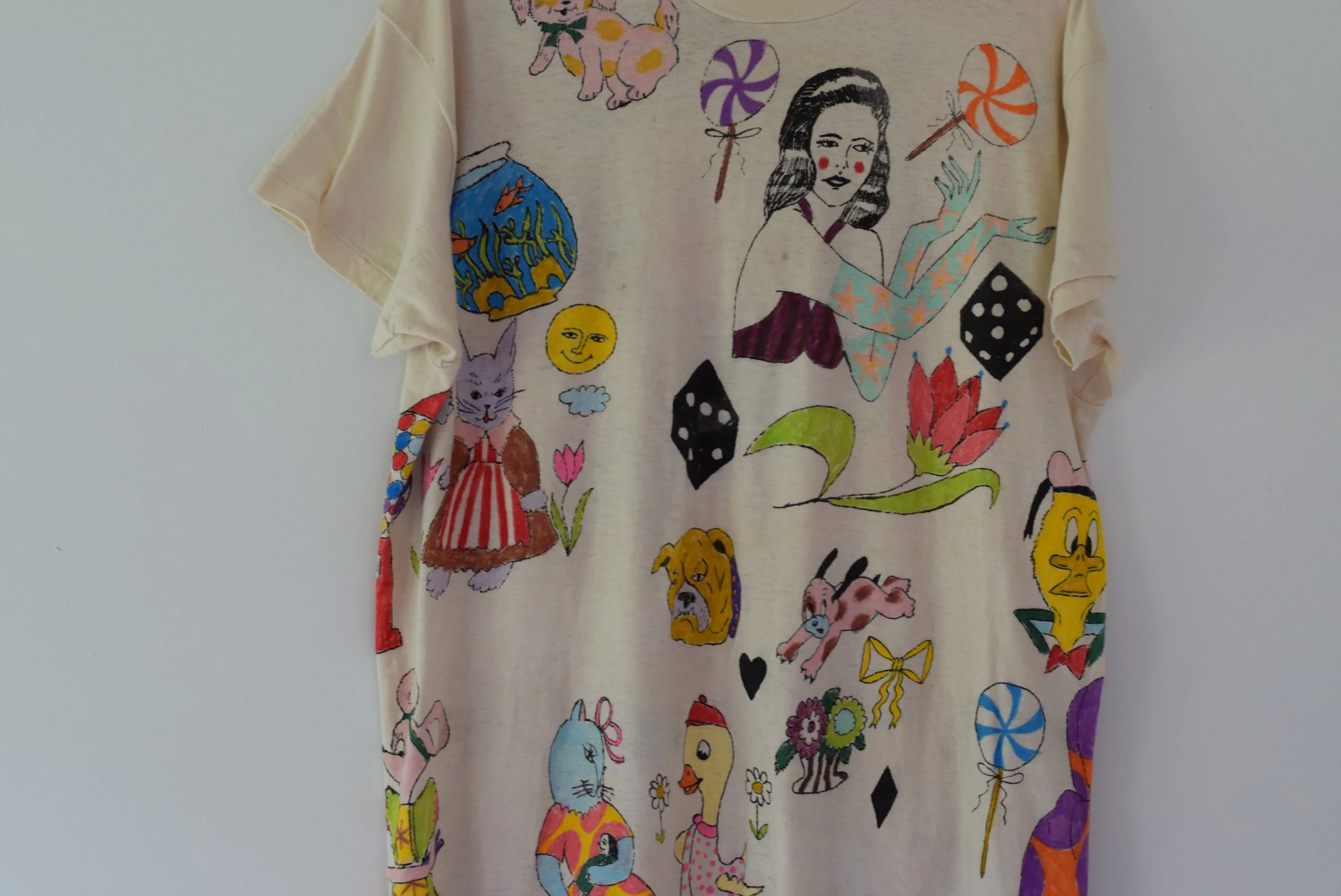 hand drawn + screen printed all over print off white vintage Tee Large LONG shirt dress