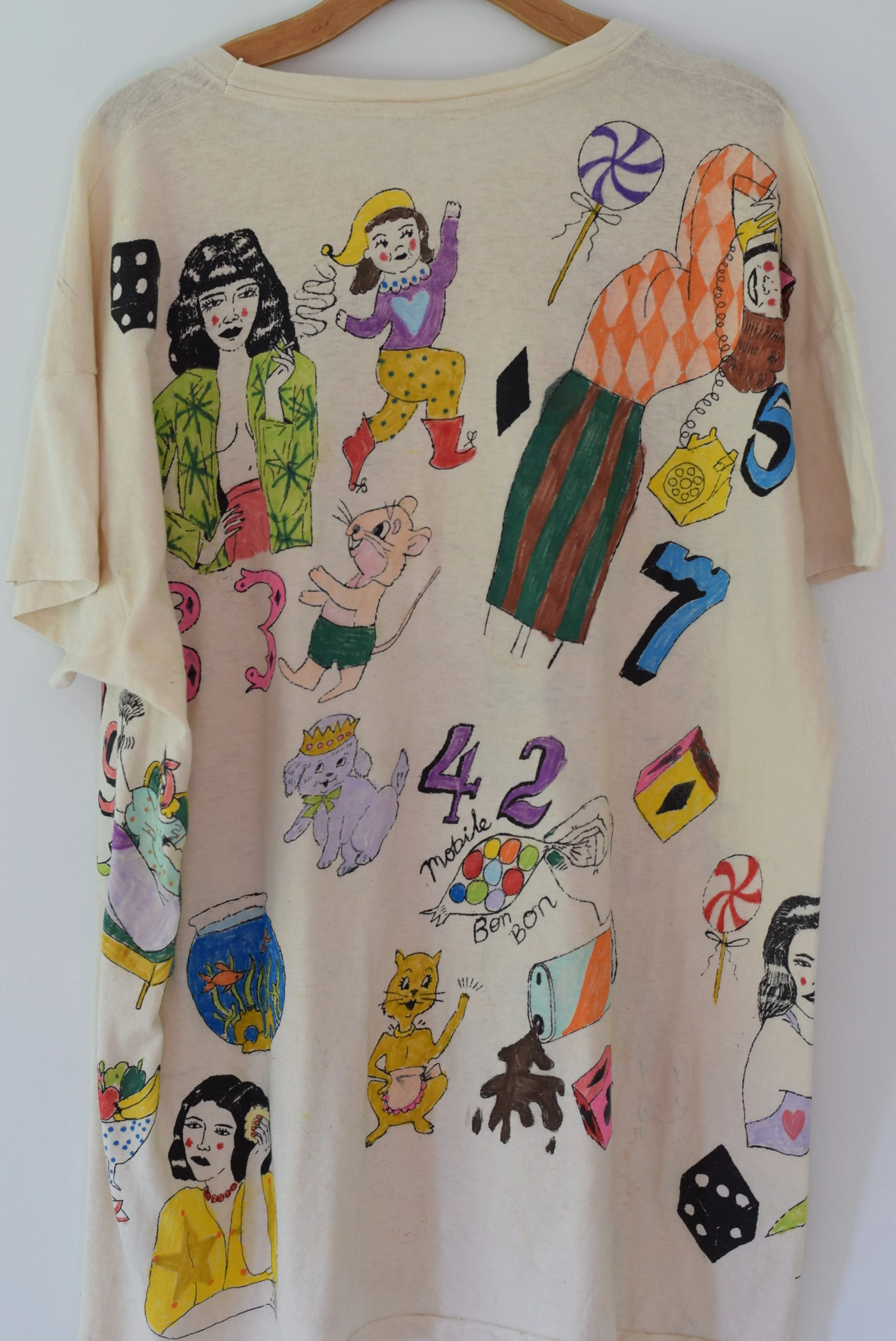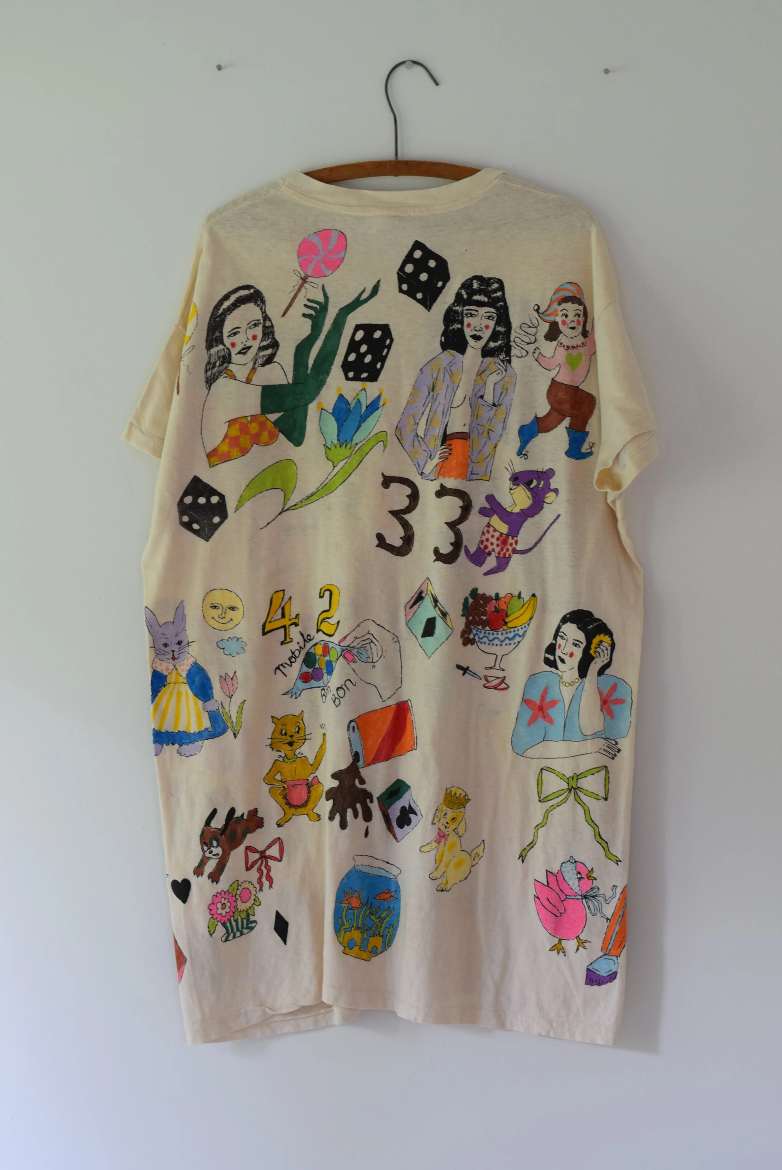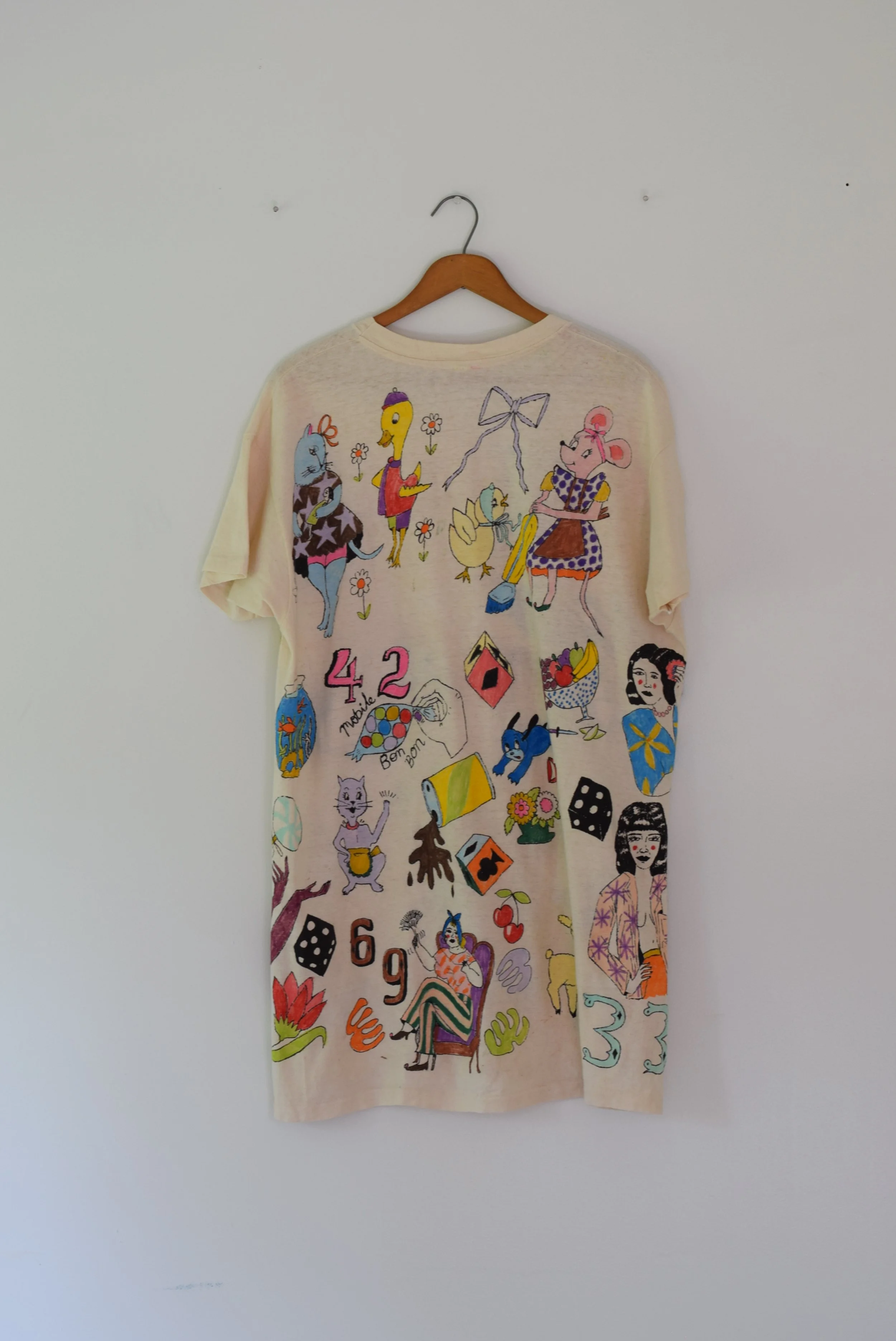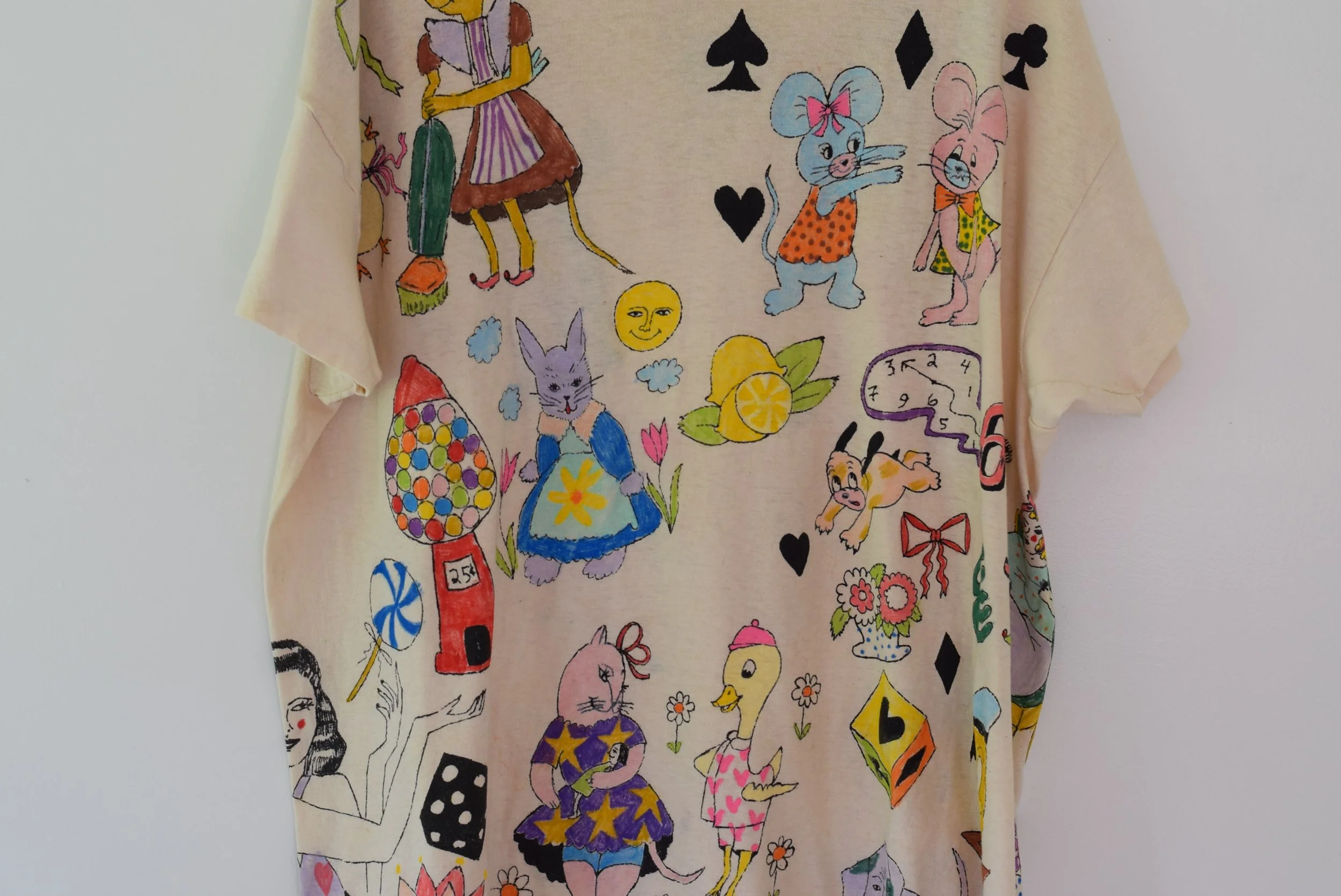 hand drawn + screen printed all over print off white vintage Tee XL LONG shirt dress