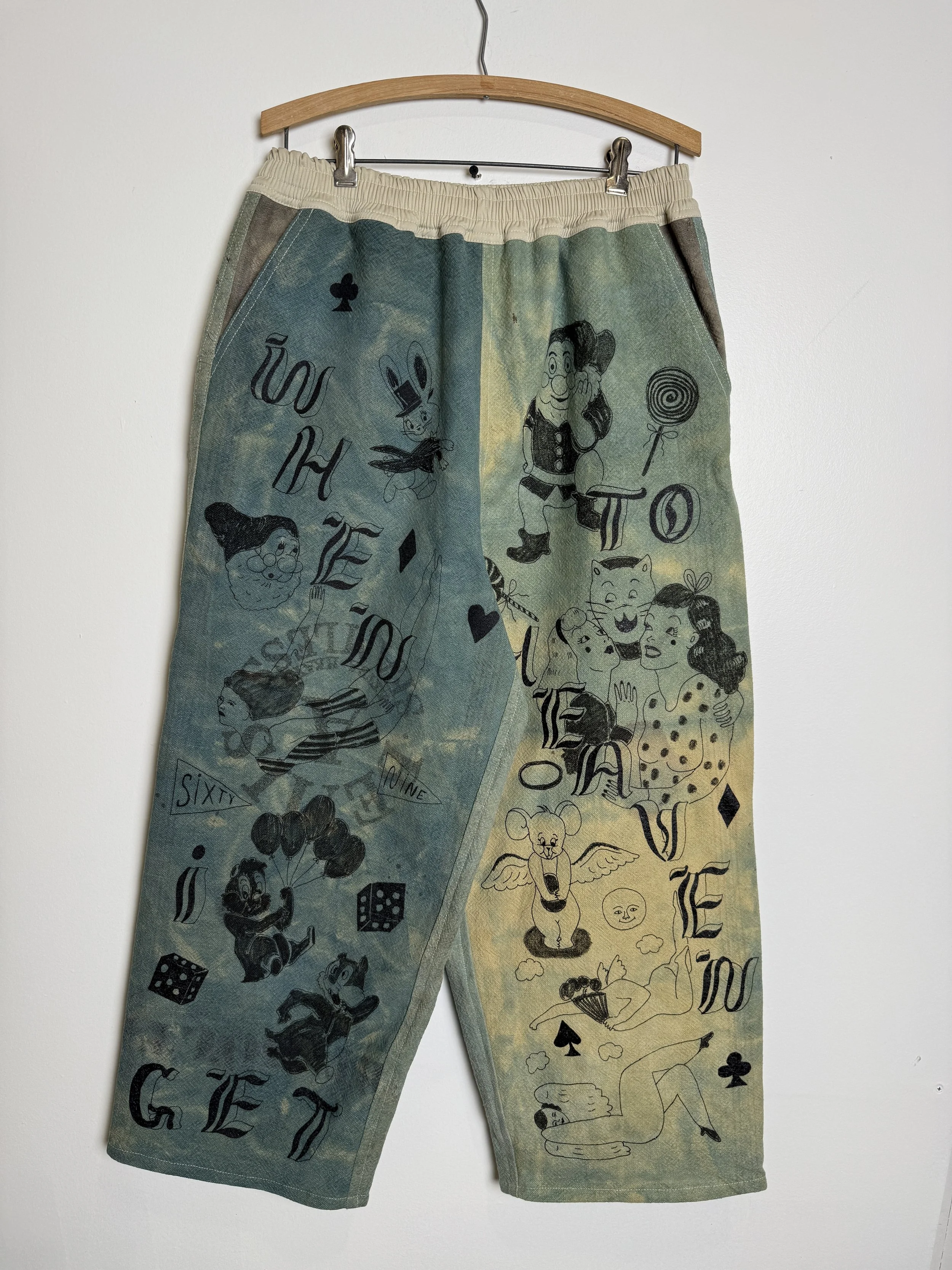 Naturally dyed with Indigo over different base colors, each panel was dyed uniquely before being made into pants. Made of antique and vintage cotton seamless feed sacks. Each feed sack used is unique and has its own history. The black outline of the imagery is screen printed in Brooklyn by Kingsland. Then hand painted, hand-dyed and assembled in our home studio outside of St Louis, MO.