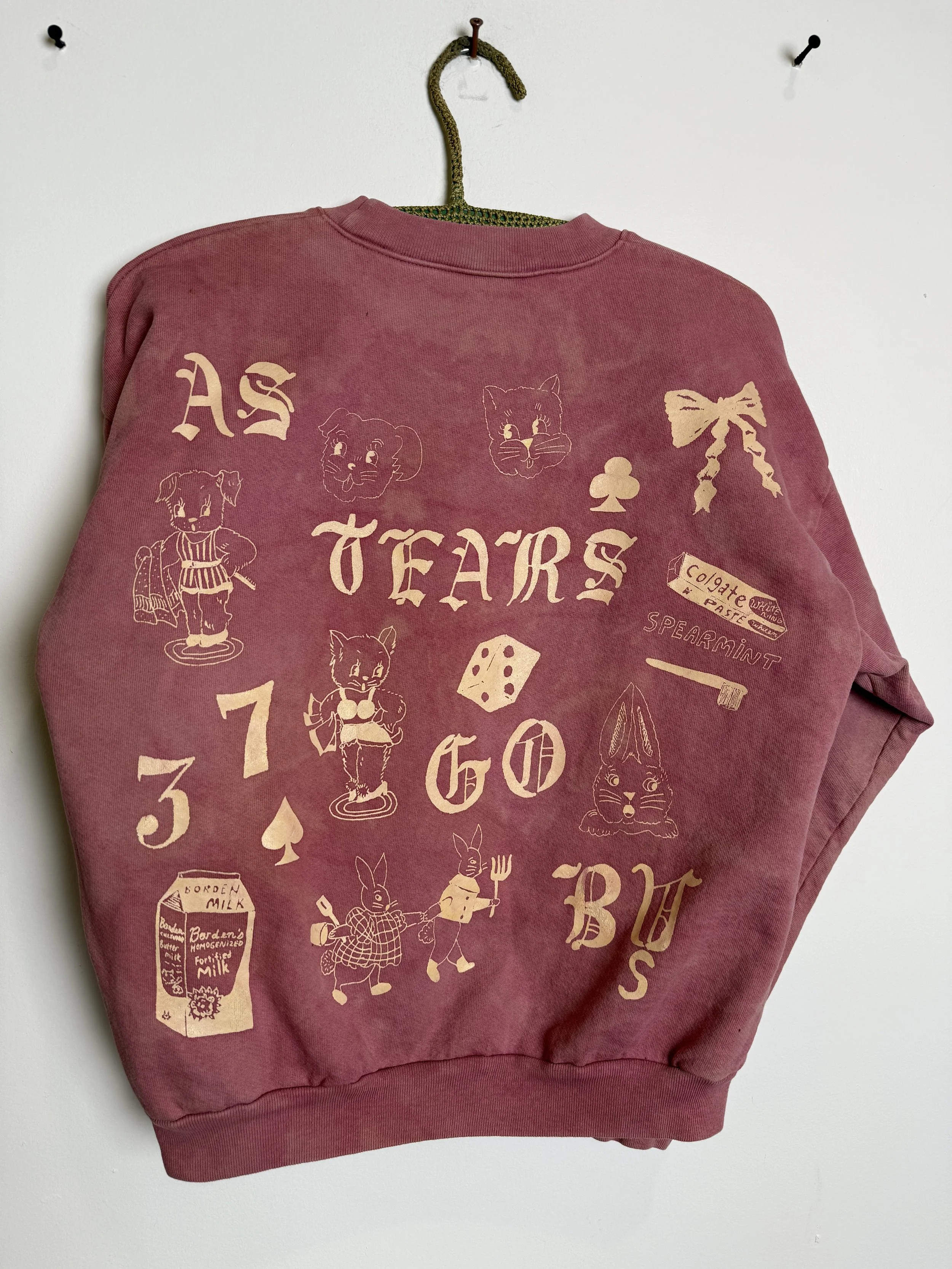 The sweatshirts are made of high quality 100% reclaimed cotton in a US factory. Hand dyed individually by us in our home kitchen. Hand screen printed imagery. Each sweatshirt is unique