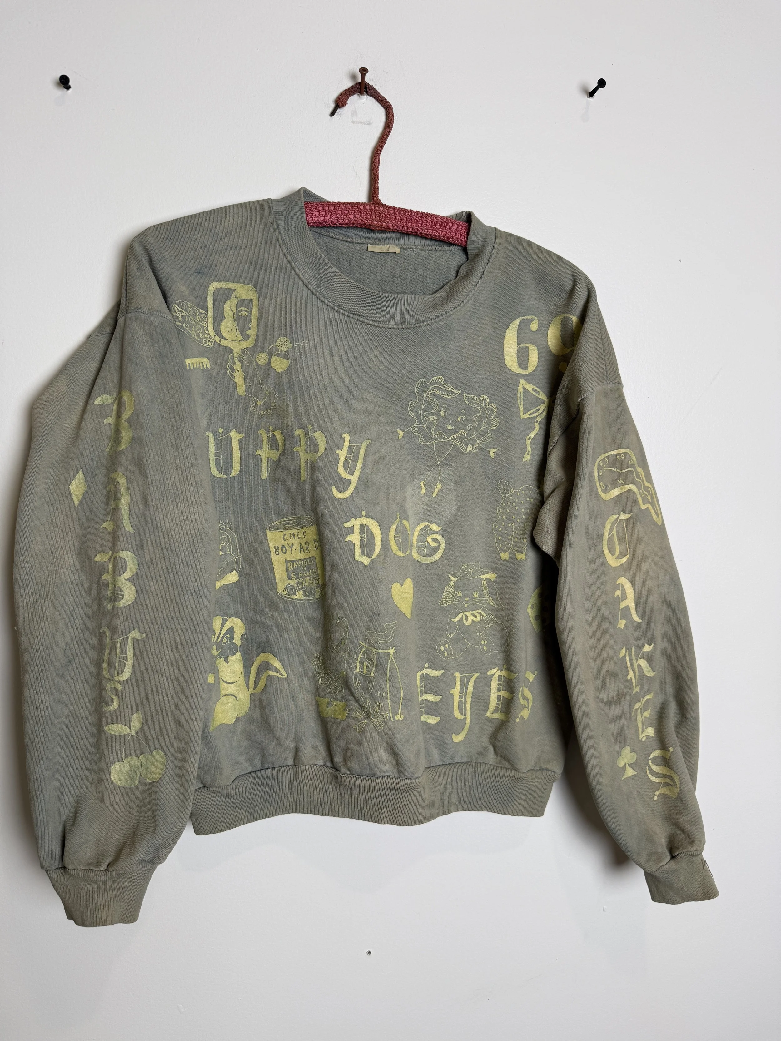 The sweatshirts are made of high quality 100% reclaimed cotton in a US factory. Hand dyed individually by us in our home kitchen. Hand screen printed imagery. Each sweatshirt is unique