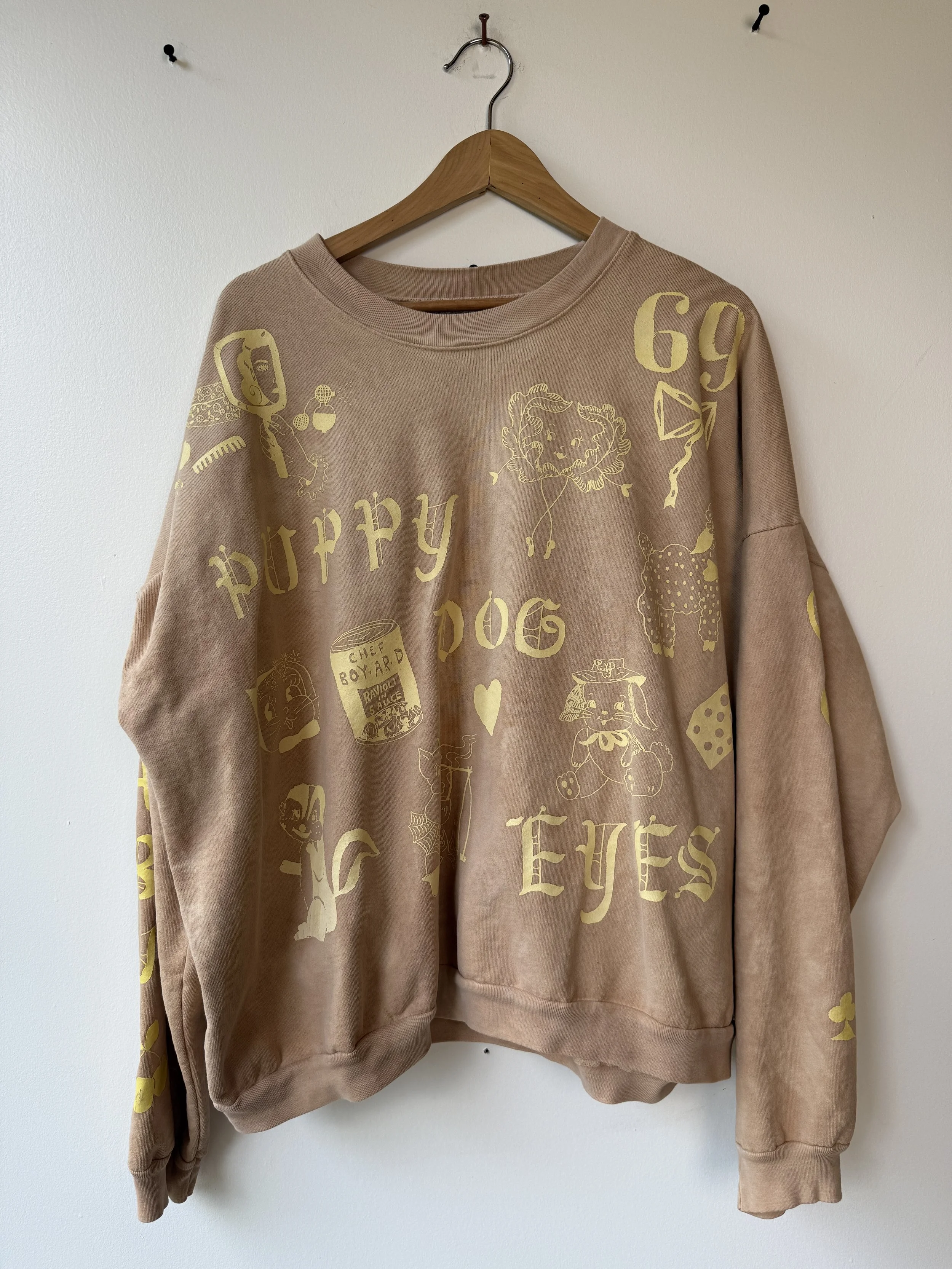 The sweatshirts are made of high quality 100% reclaimed cotton in a US factory. Hand dyed individually by us in our home kitchen. Hand screen printed imagery. Each sweatshirt is unique