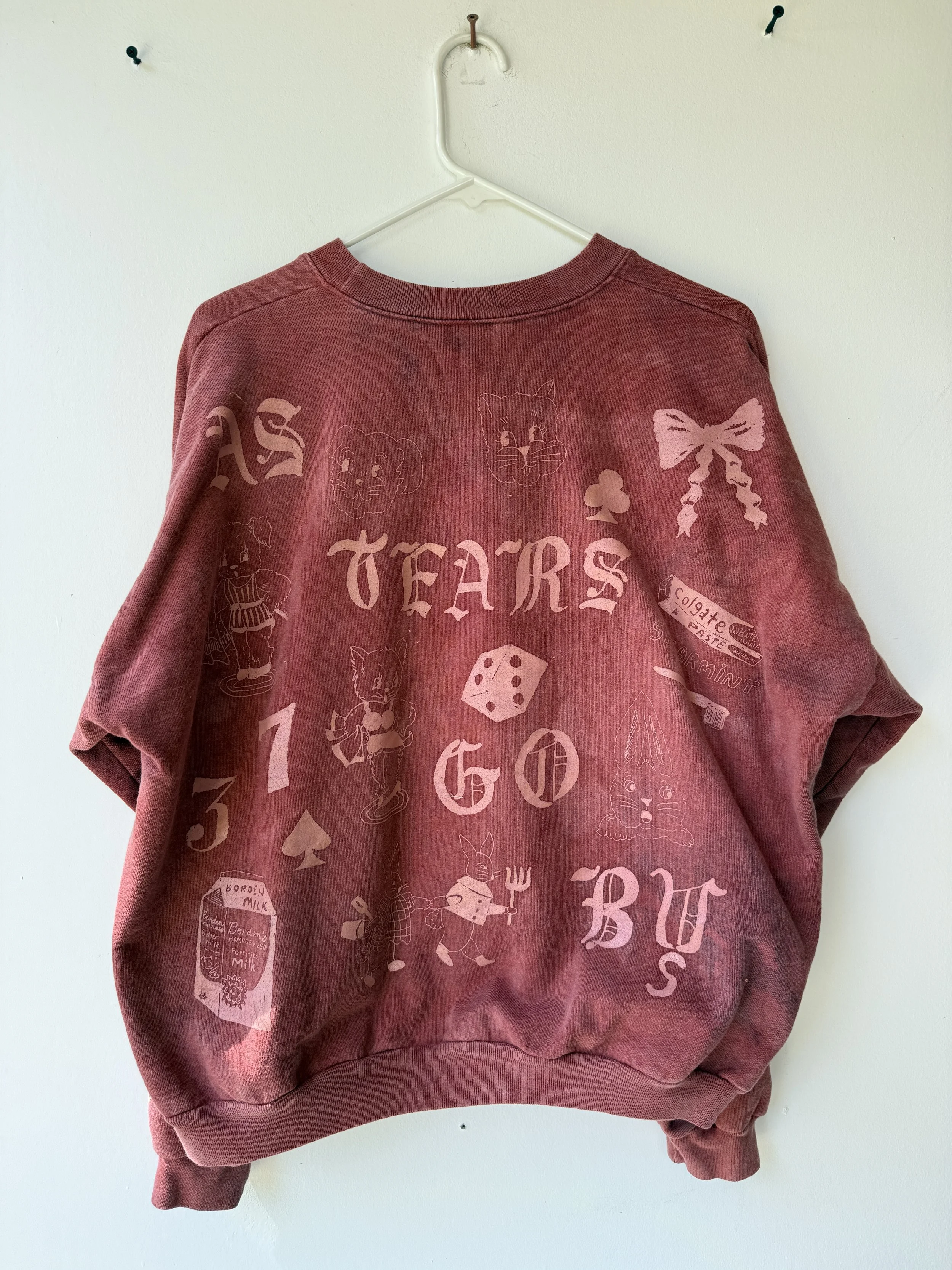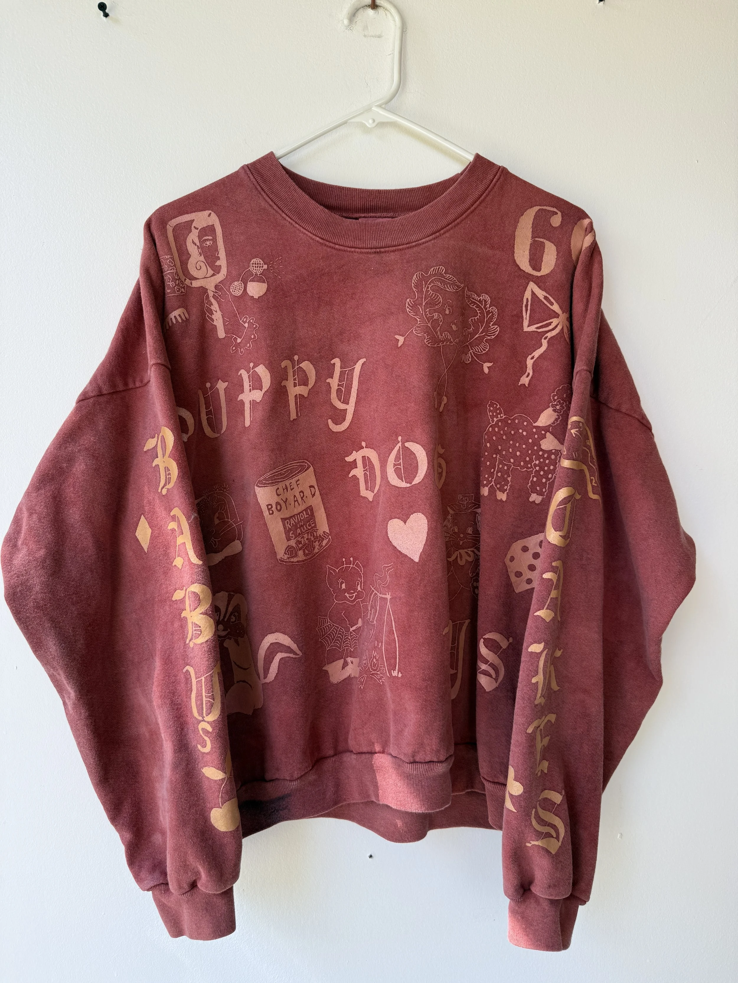 The sweatshirts are made of high quality 100% reclaimed cotton in a US factory. Hand dyed individually by us in our home kitchen. Hand screen printed imagery. Each sweatshirt is unique