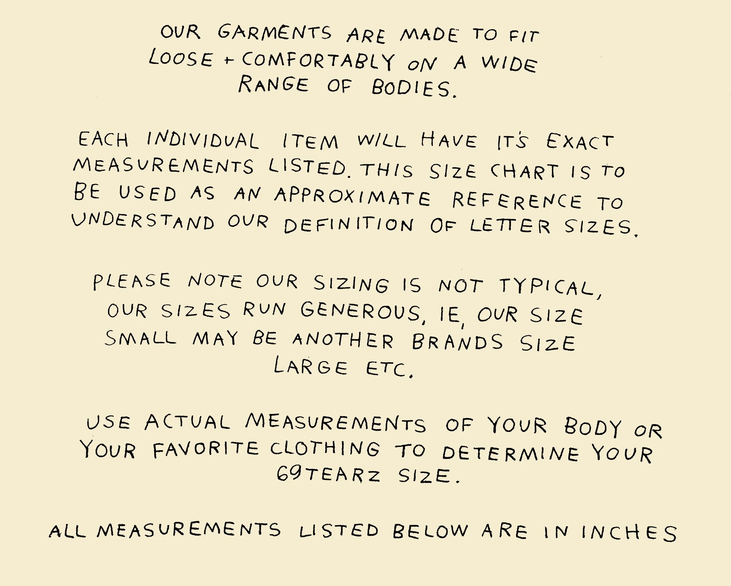 hi, on this page are the measurements for our most popular garments that we make. Any piece that we list will have the exact measurements on the actual item listing but they are typically within ±/- a half inch. We suggest checking these measurements before planning your purchase, so that you may quickly checkout and be able to make your purchase. Also to ensure you purchase the right size as we do not offer returns on our items. For any premade items such as tees and sweatshirts we add the size-chart to the item listing. For vintage items we include the measurements directly in the items listing as well. We typically only use Everybody.world blanks for our base materials but sometimes will offer others if they are found.